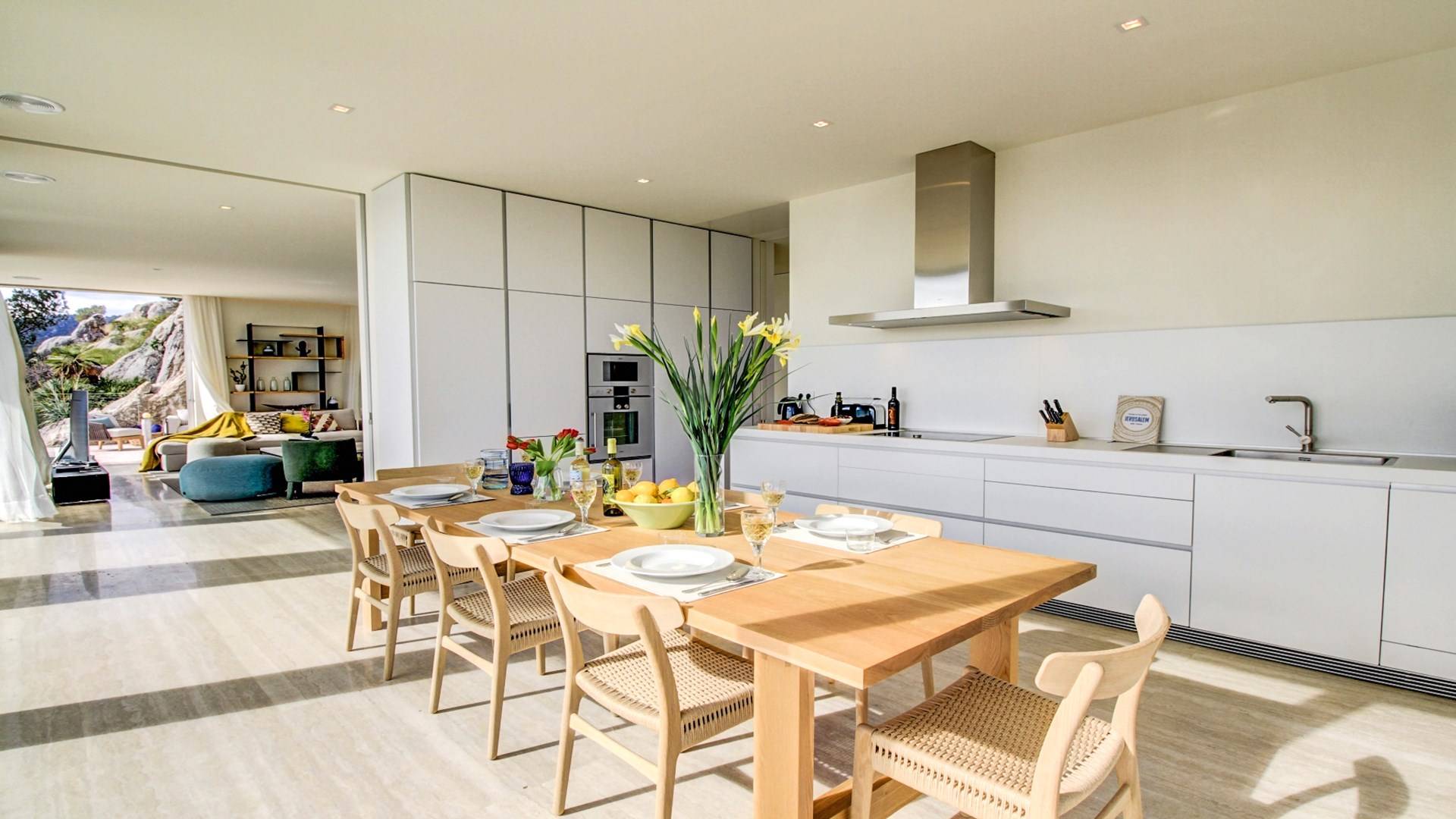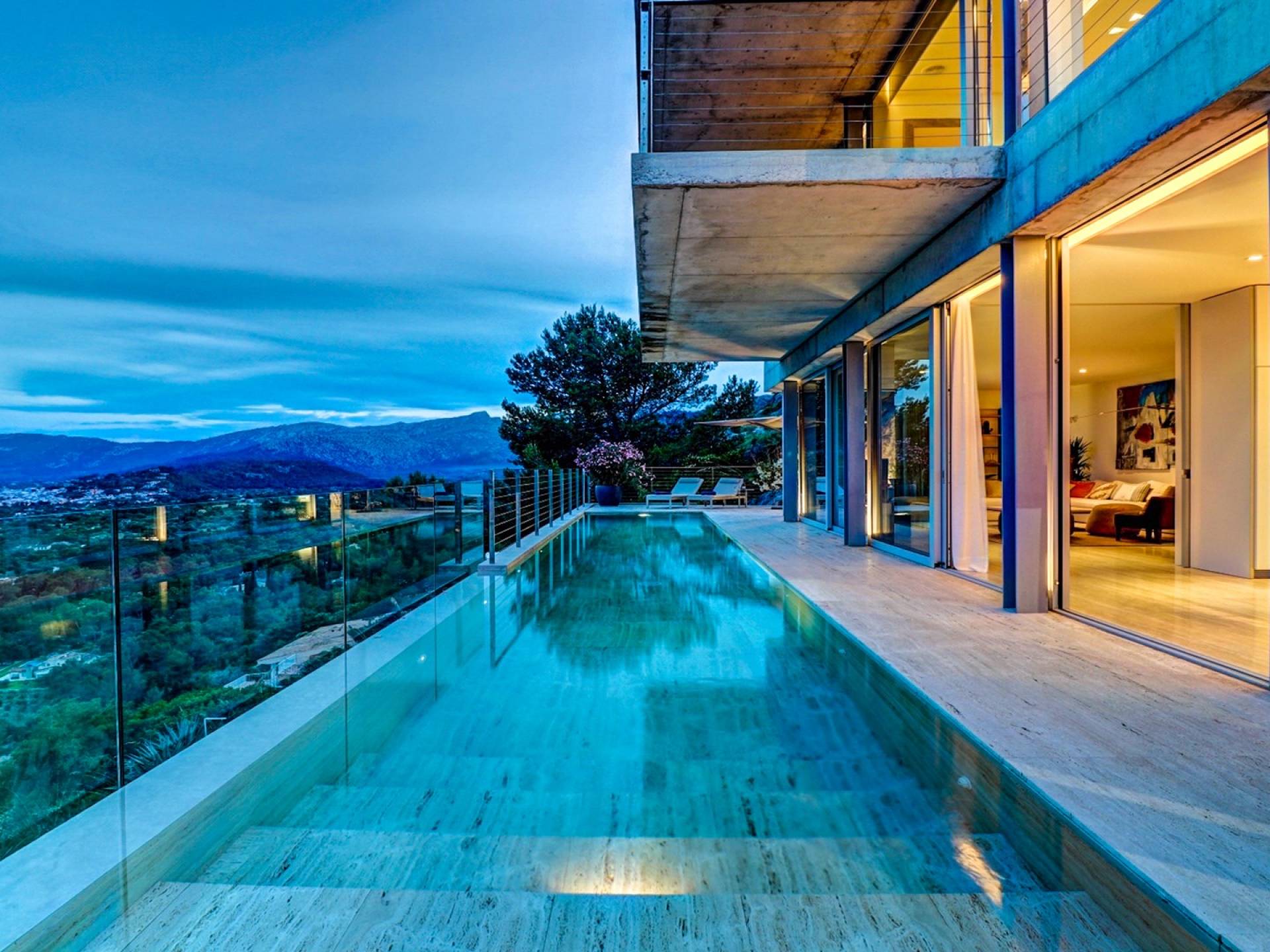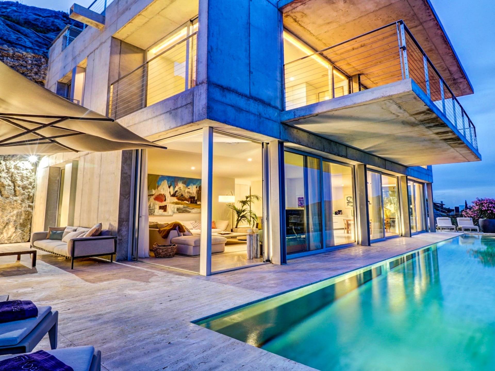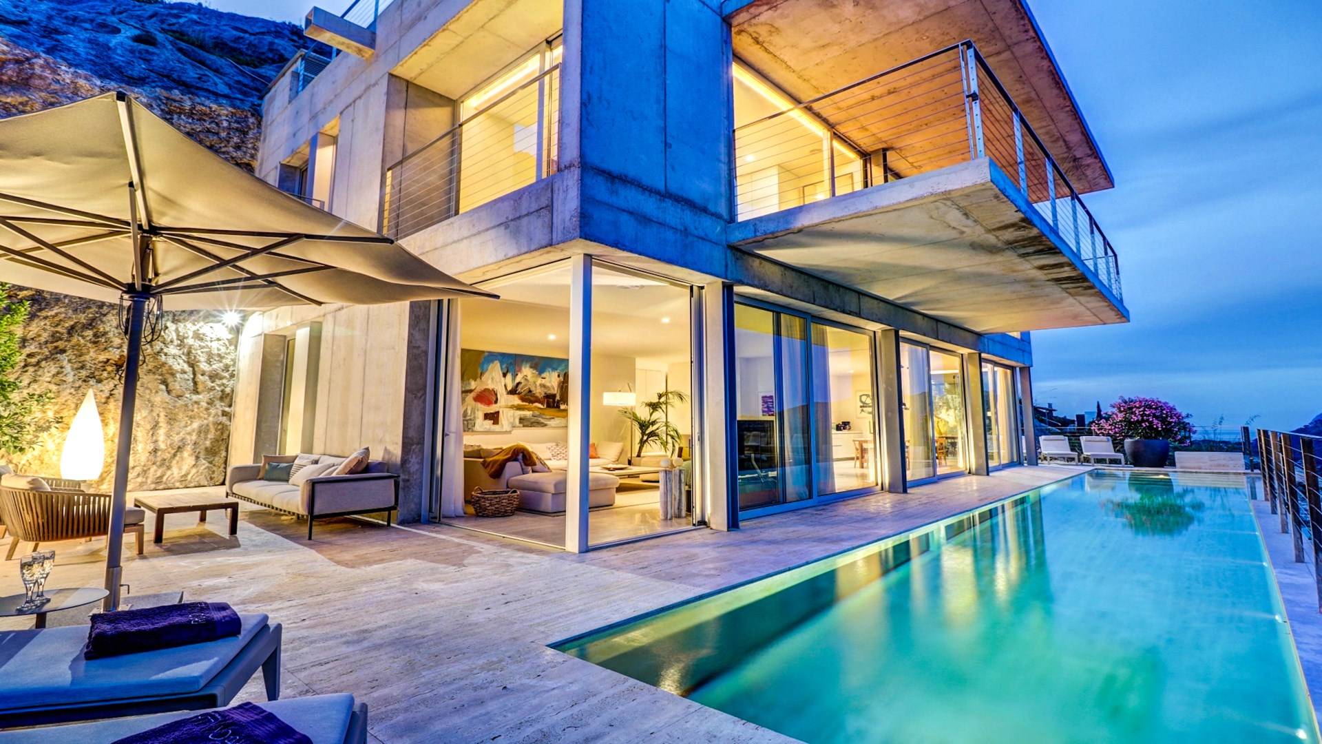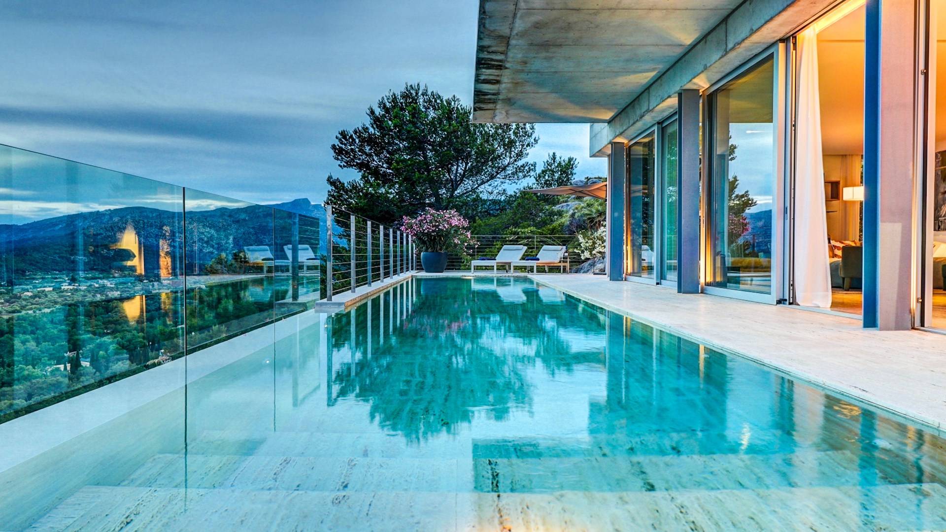 Desde aquí, un ascensor te lleva a la casa, lo que es ideal para los huéspedes con menos movilidad (el ascensor da acceso a todas las plantas de la villa). En el primer piso, la propiedad tiene una hermosa y soleada sala de estar con magníficos muebles de diseño cómodos e impresionantes obras de arte. El salón se abre a una terraza bañada por el sol y a una impresionante piscina infinita de 15,5 x 2,5 metros.