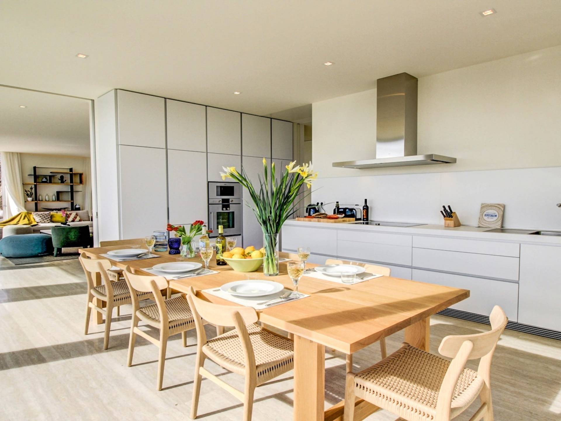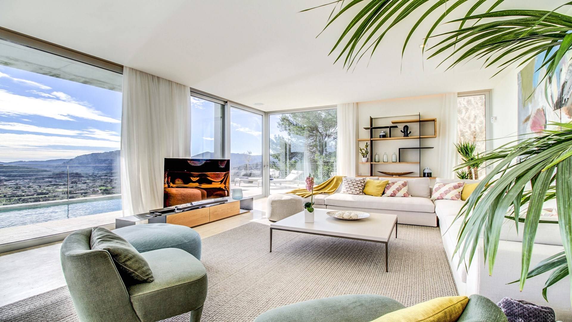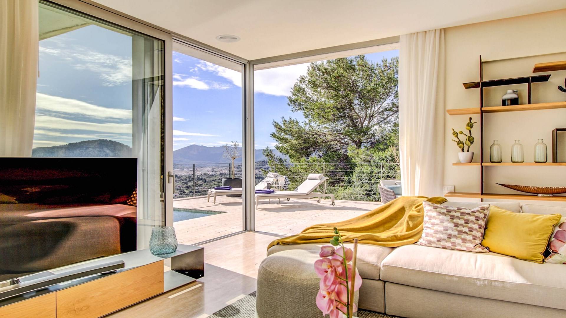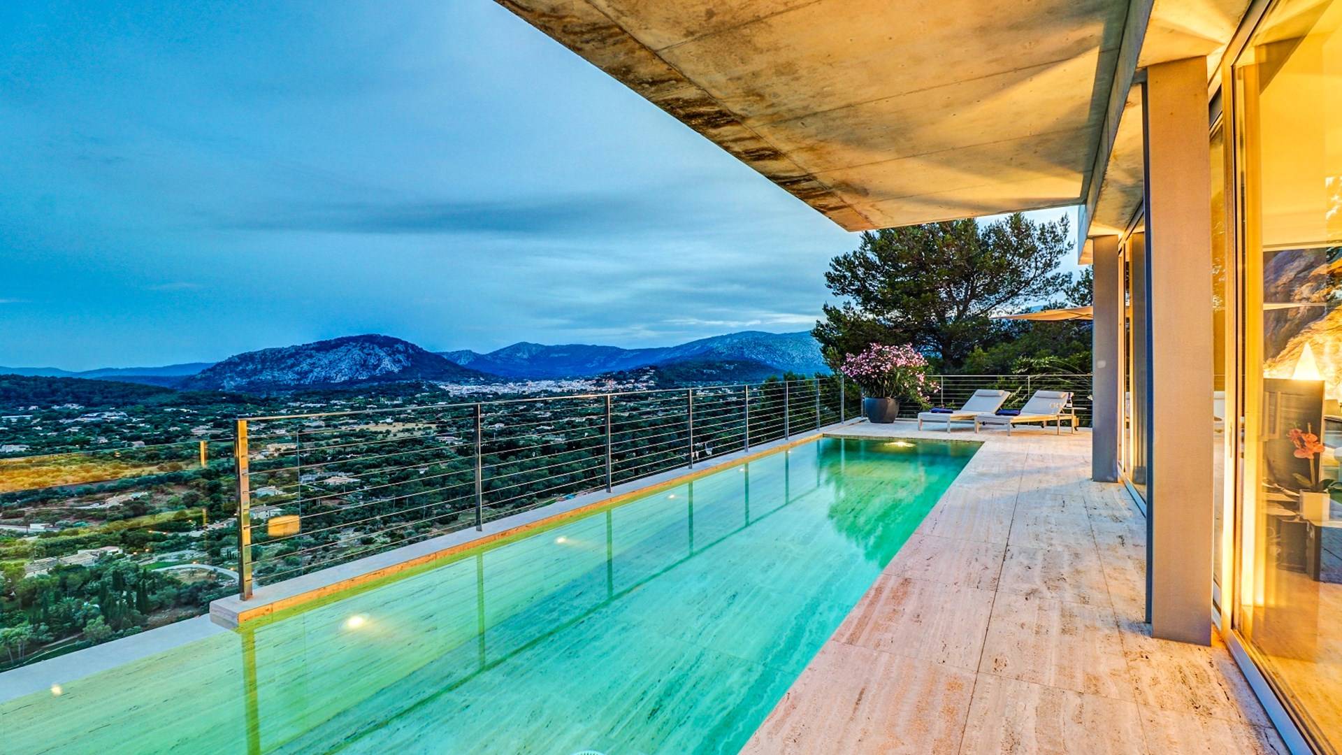 Desde aquí, un ascensor te lleva a la casa, lo que es ideal para los huéspedes con menos movilidad (el ascensor da acceso a todas las plantas de la villa). En el primer piso, la propiedad tiene una hermosa y soleada sala de estar con magníficos muebles de diseño cómodos e impresionantes obras de arte. El salón se abre a una terraza bañada por el sol y a una impresionante piscina infinita de 15,5 x 2,5 metros.