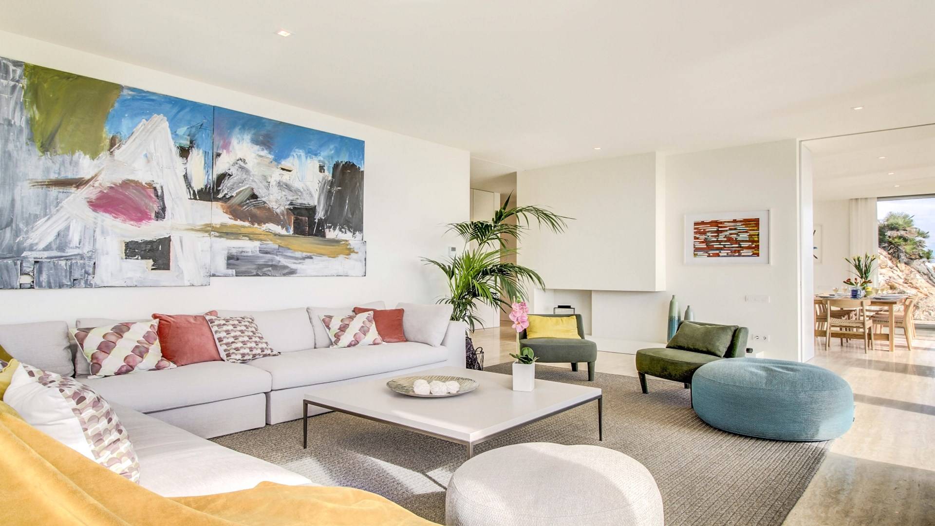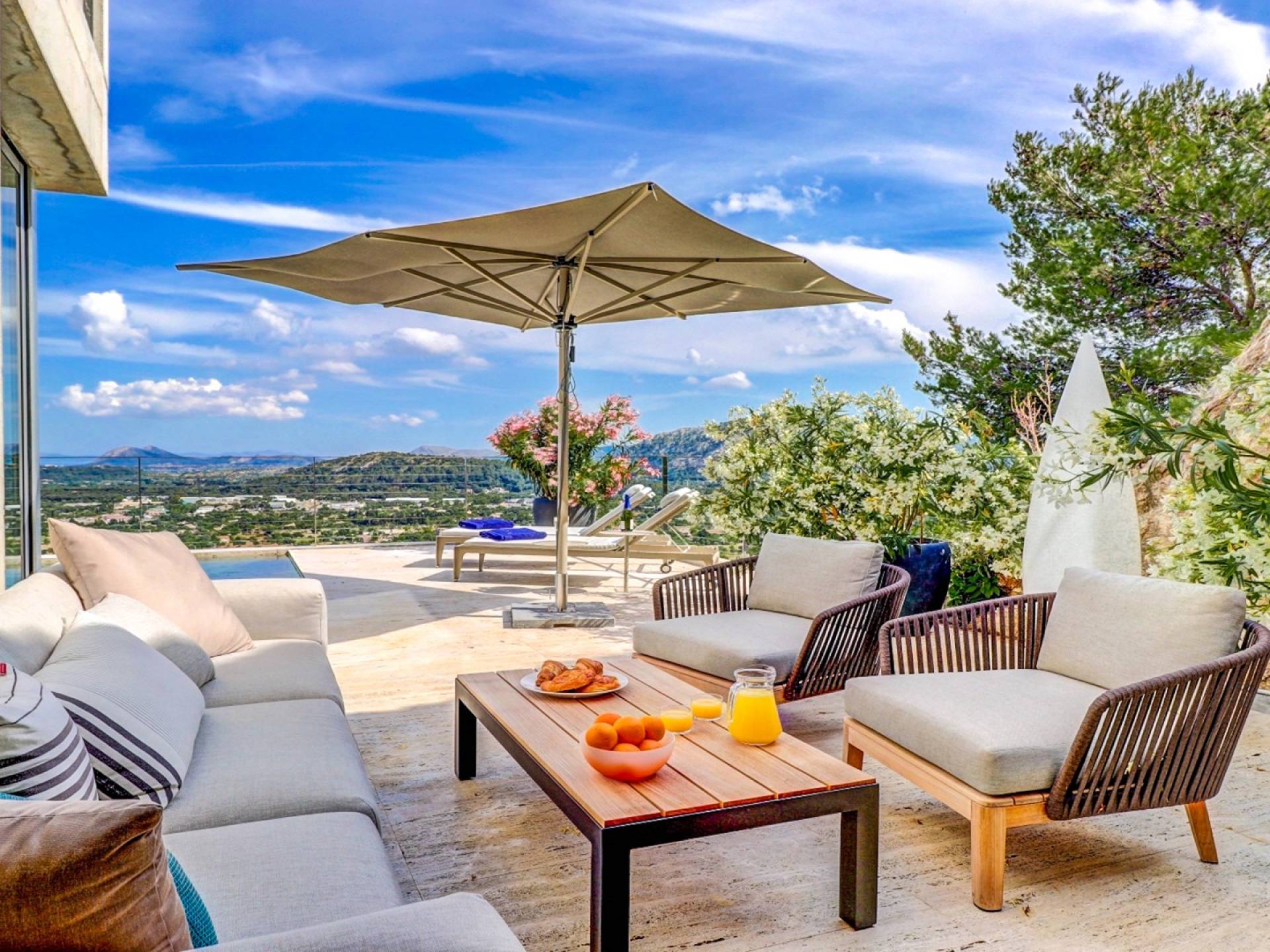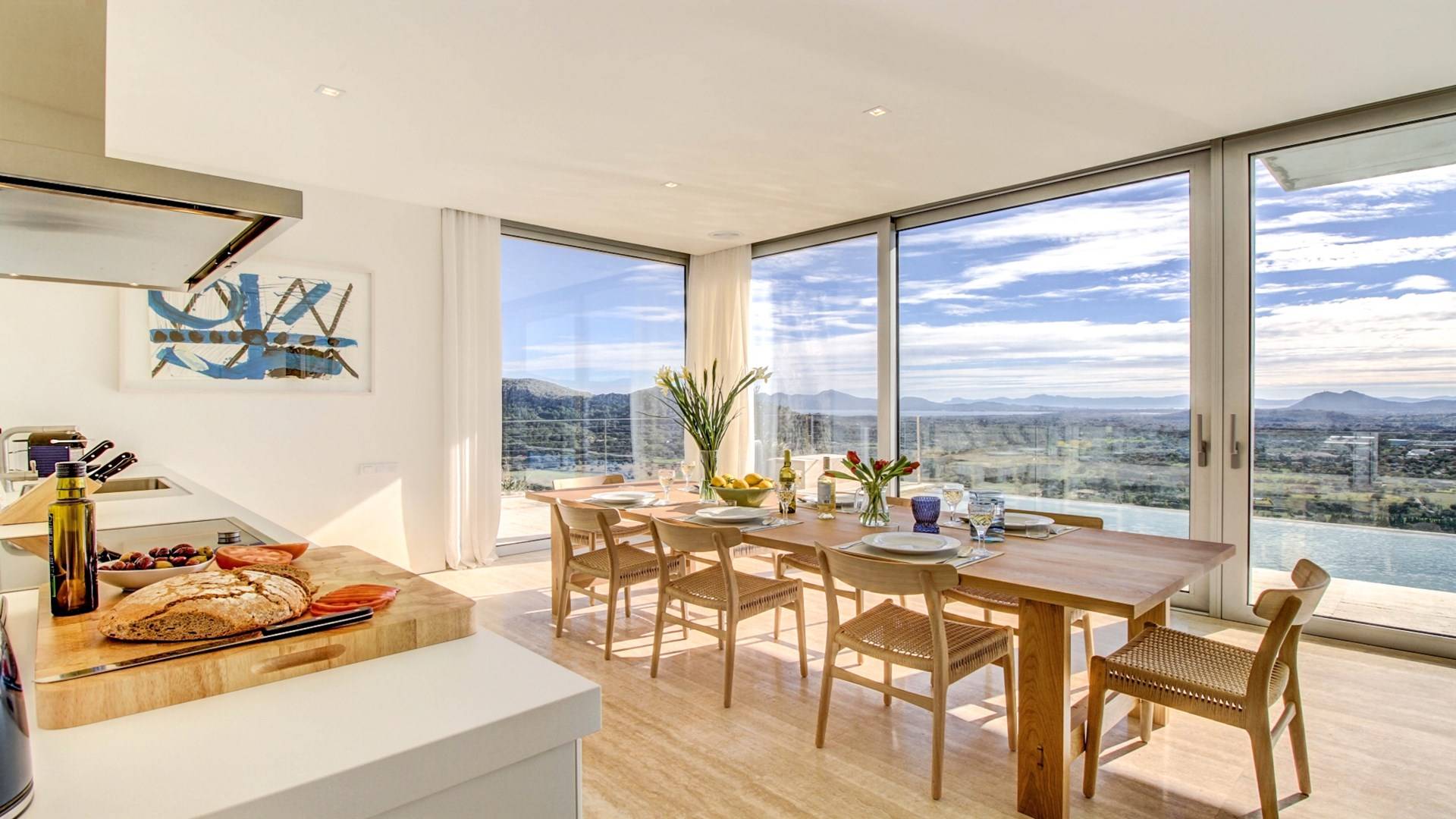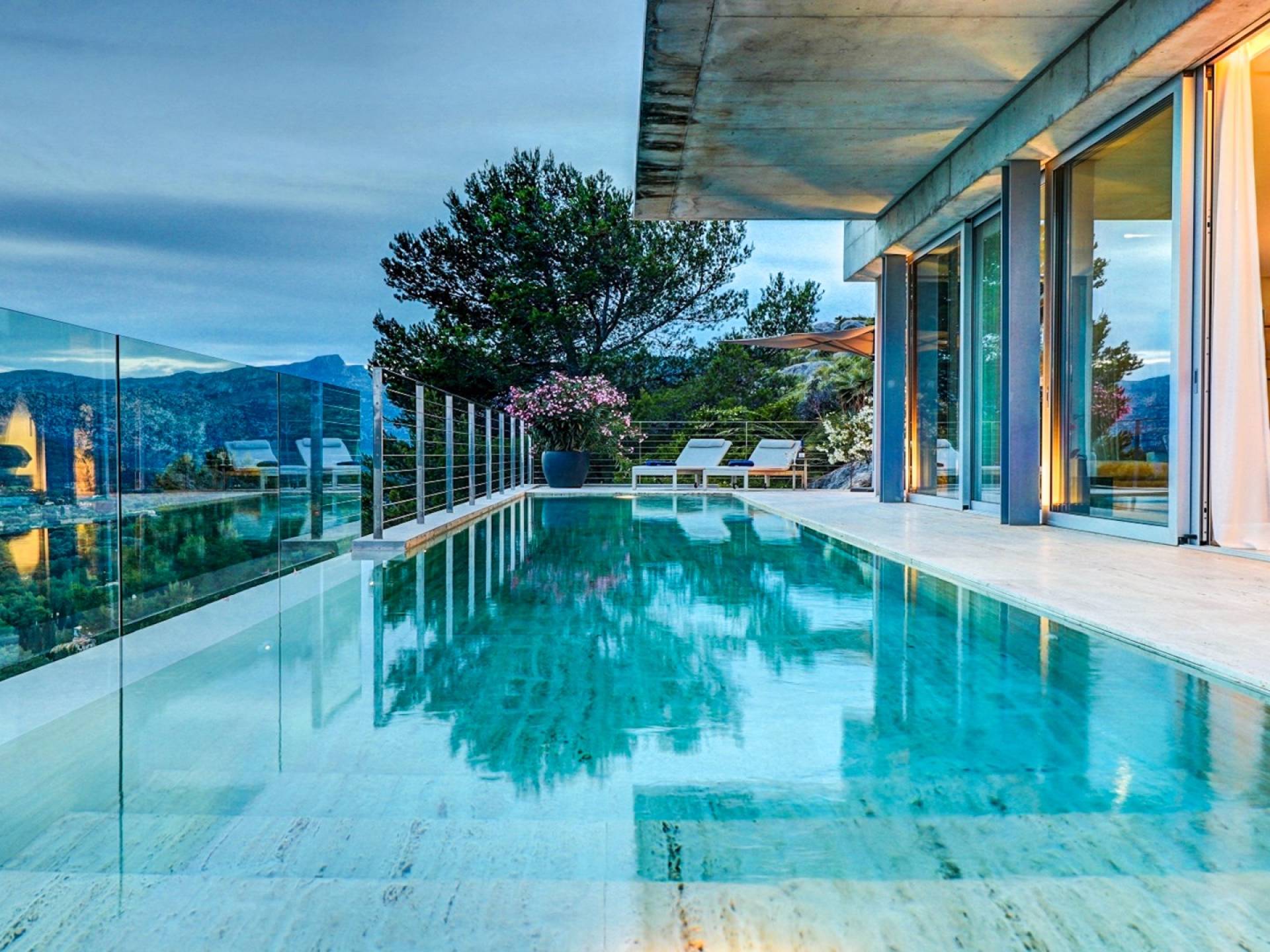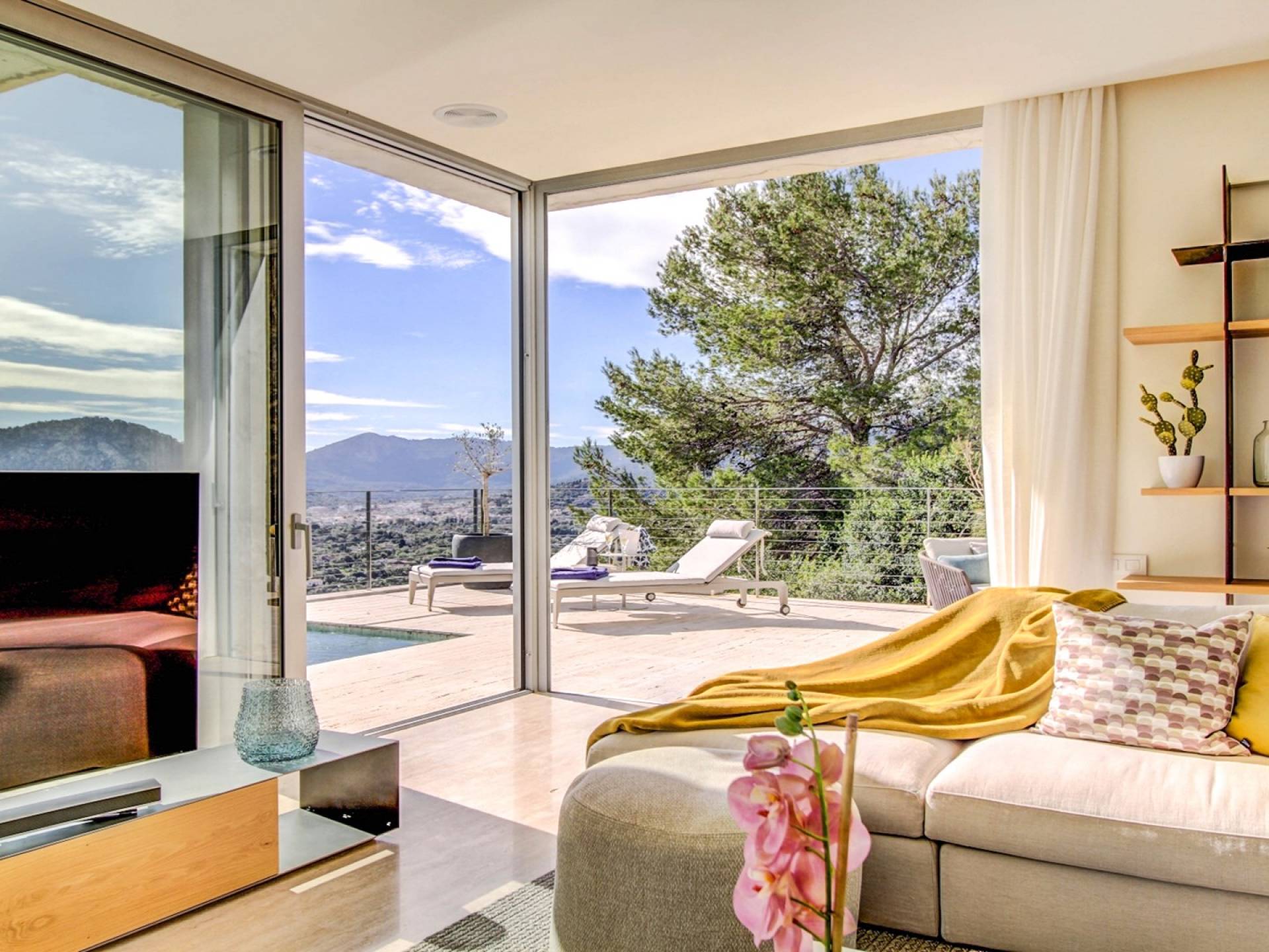Desde aquí, un ascensor te lleva a la casa, lo que es ideal para los huéspedes con menos movilidad (el ascensor da acceso a todas las plantas de la villa). En el primer piso, la propiedad tiene una hermosa y soleada sala de estar con magníficos muebles de diseño cómodos e impresionantes obras de arte. El salón se abre a una terraza bañada por el sol y a una impresionante piscina infinita de 15,5 x 2,5 metros.