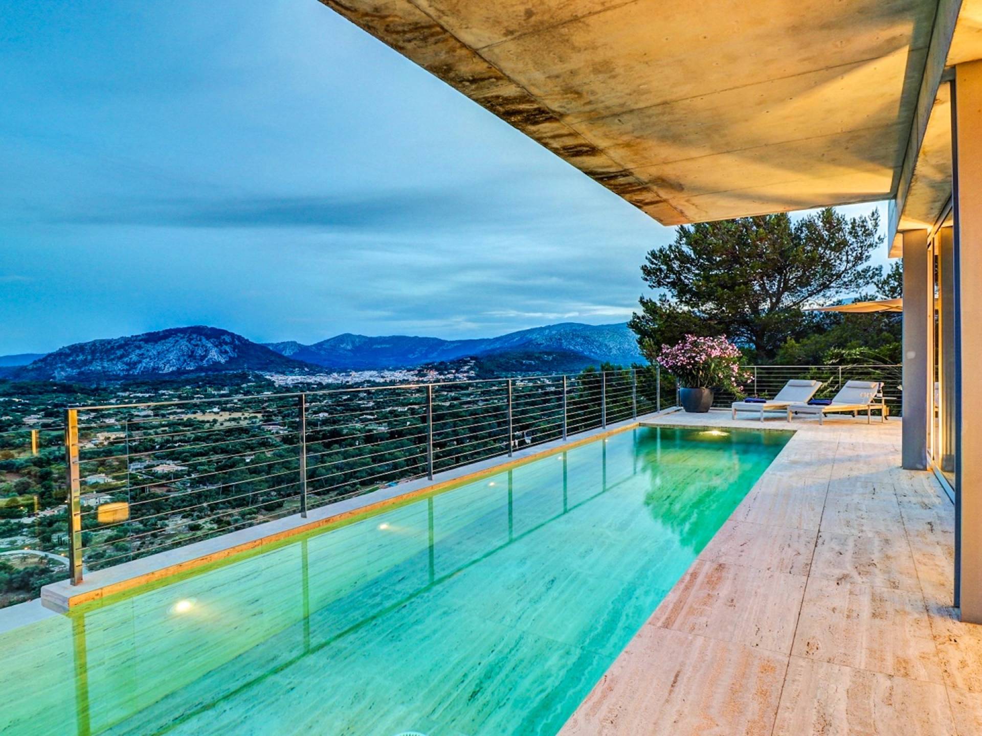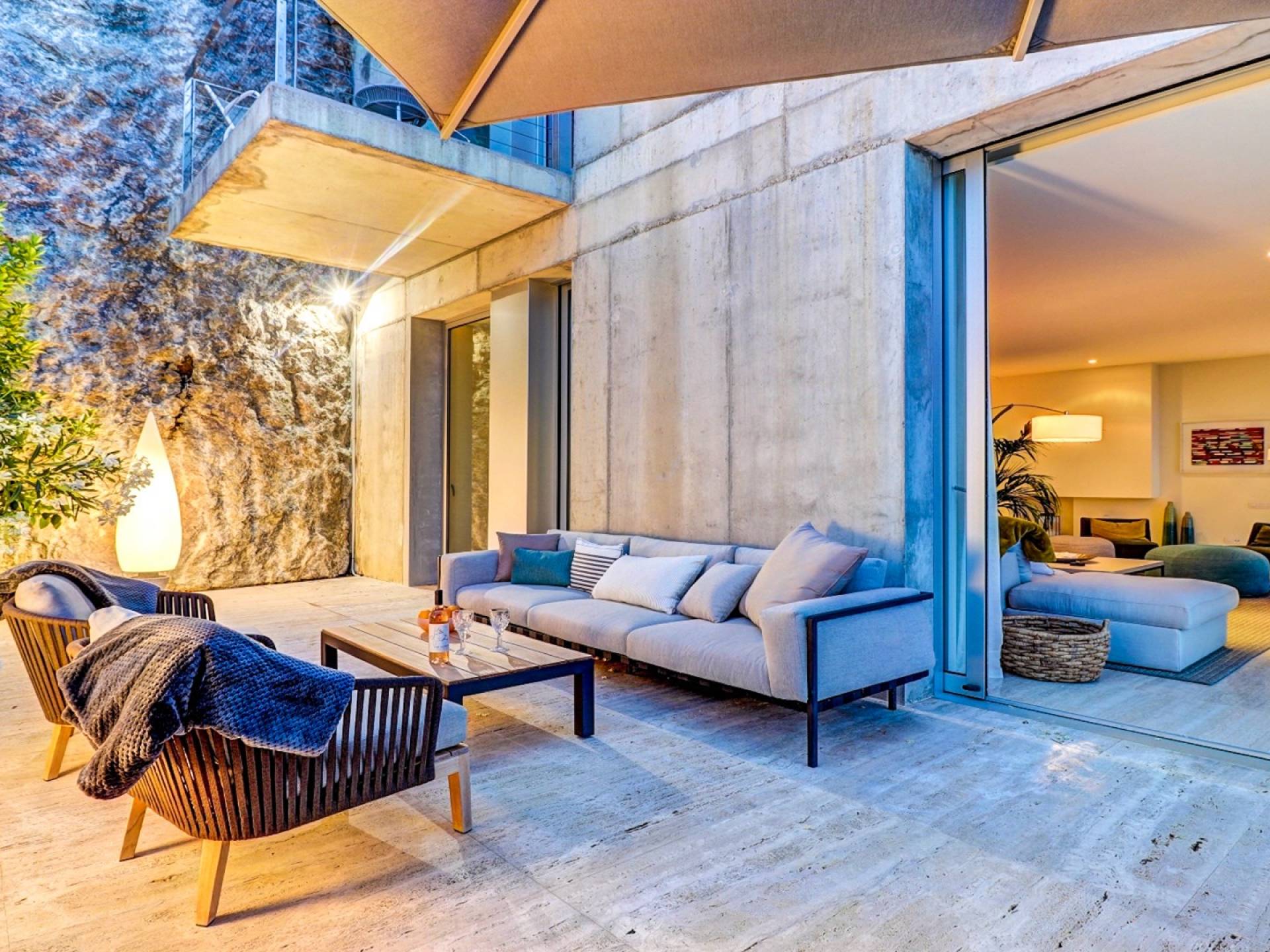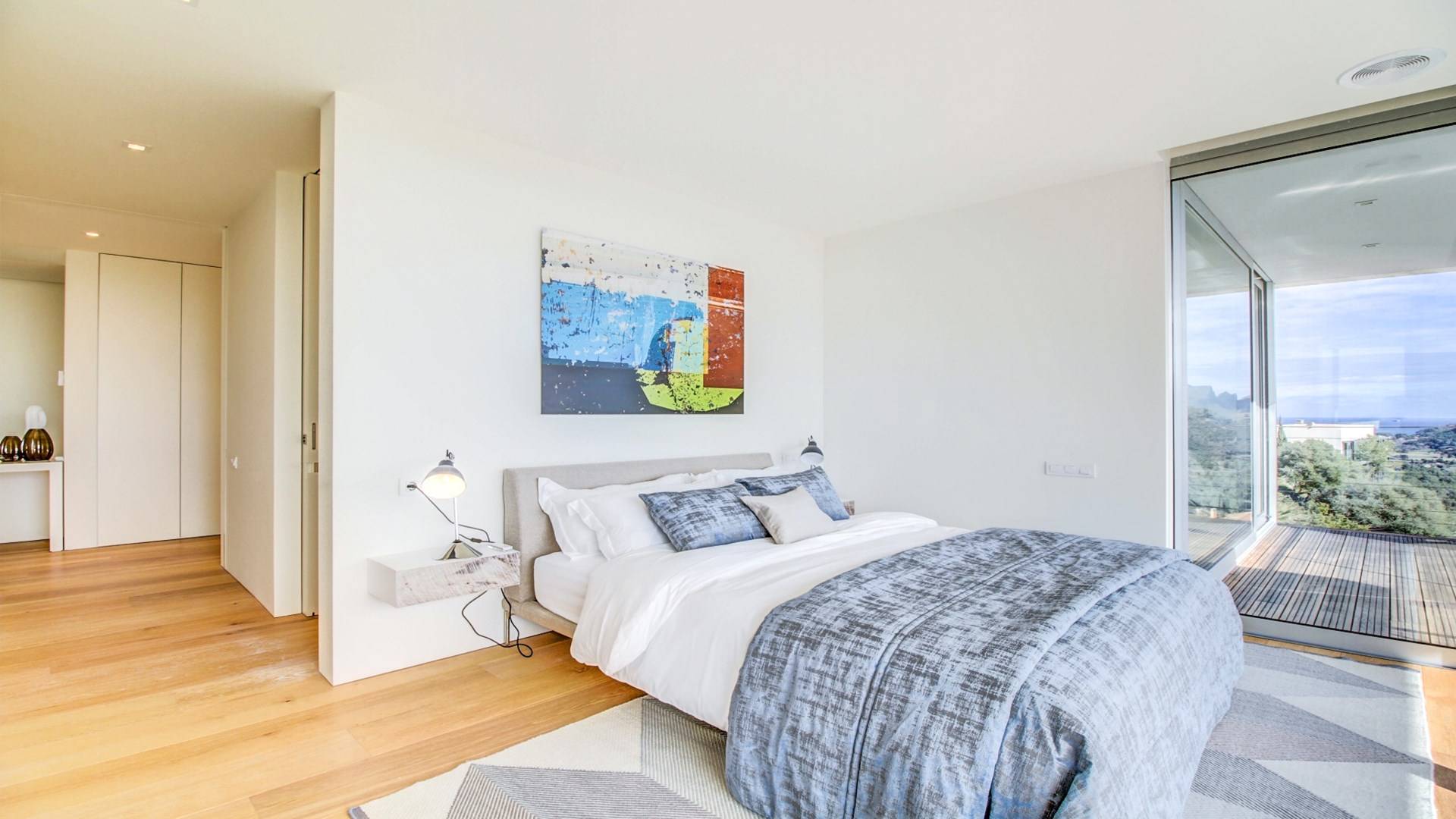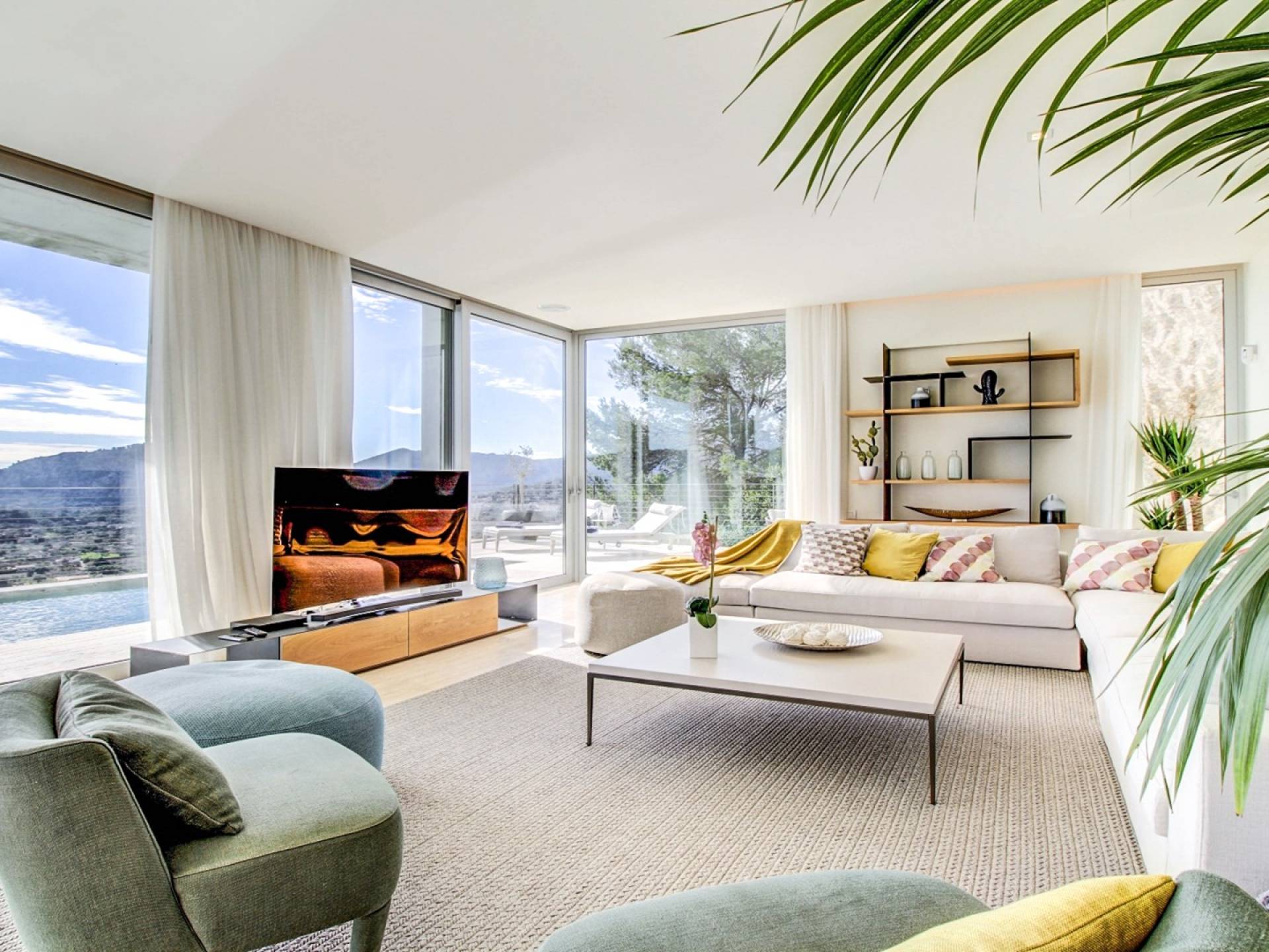 Desde aquí, un ascensor te lleva a la casa, lo que es ideal para los huéspedes con menos movilidad (el ascensor da acceso a todas las plantas de la villa). En el primer piso, la propiedad tiene una hermosa y soleada sala de estar con magníficos muebles de diseño cómodos e impresionantes obras de arte. El salón se abre a una terraza bañada por el sol y a una impresionante piscina infinita de 15,5 x 2,5 metros.