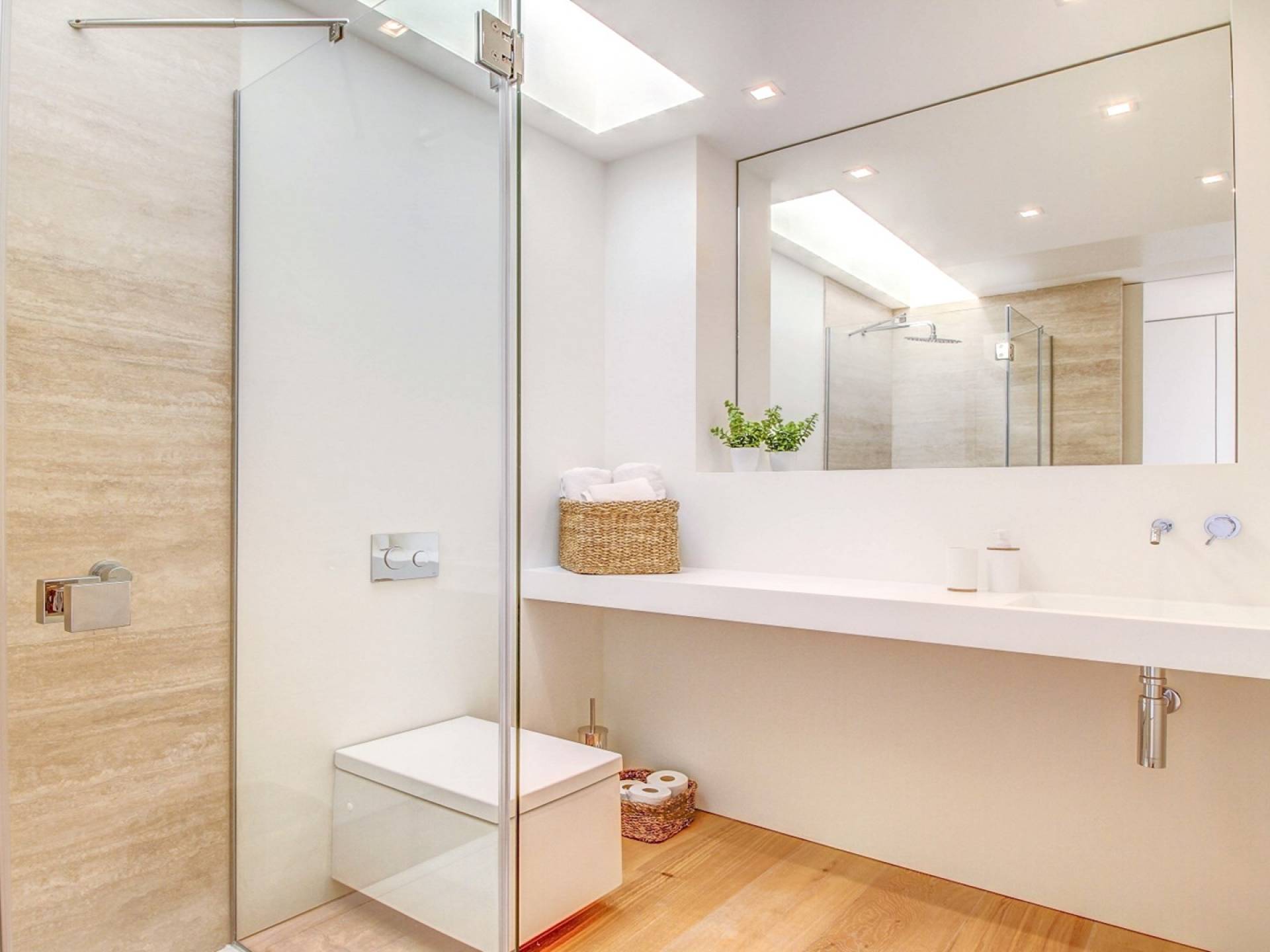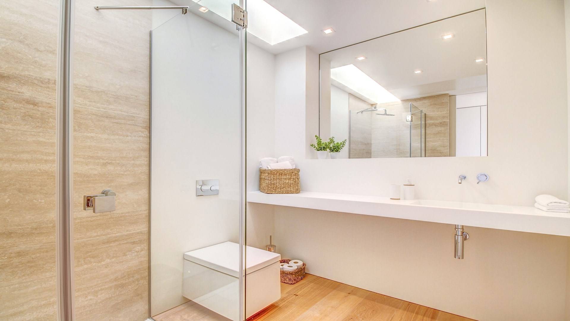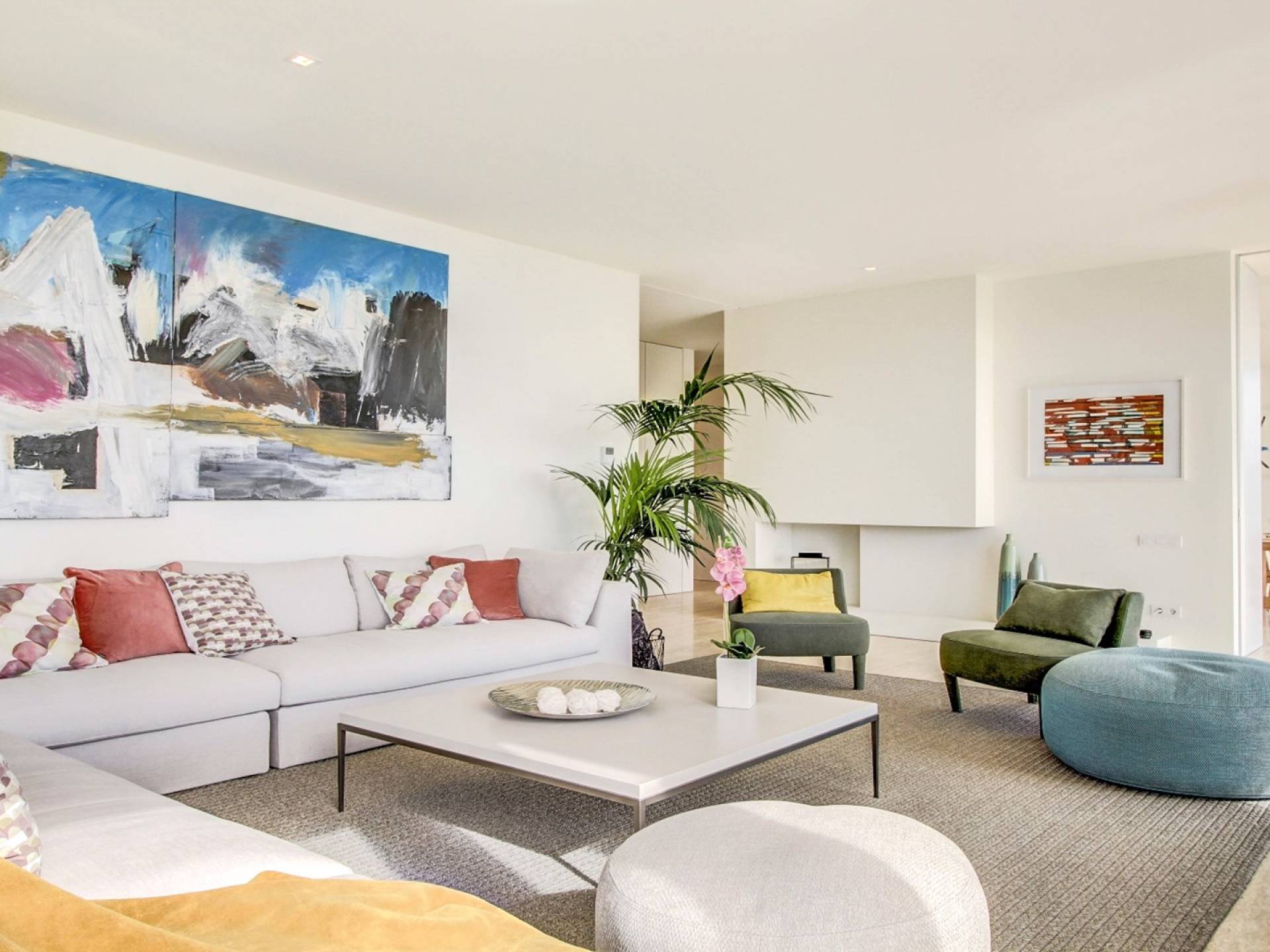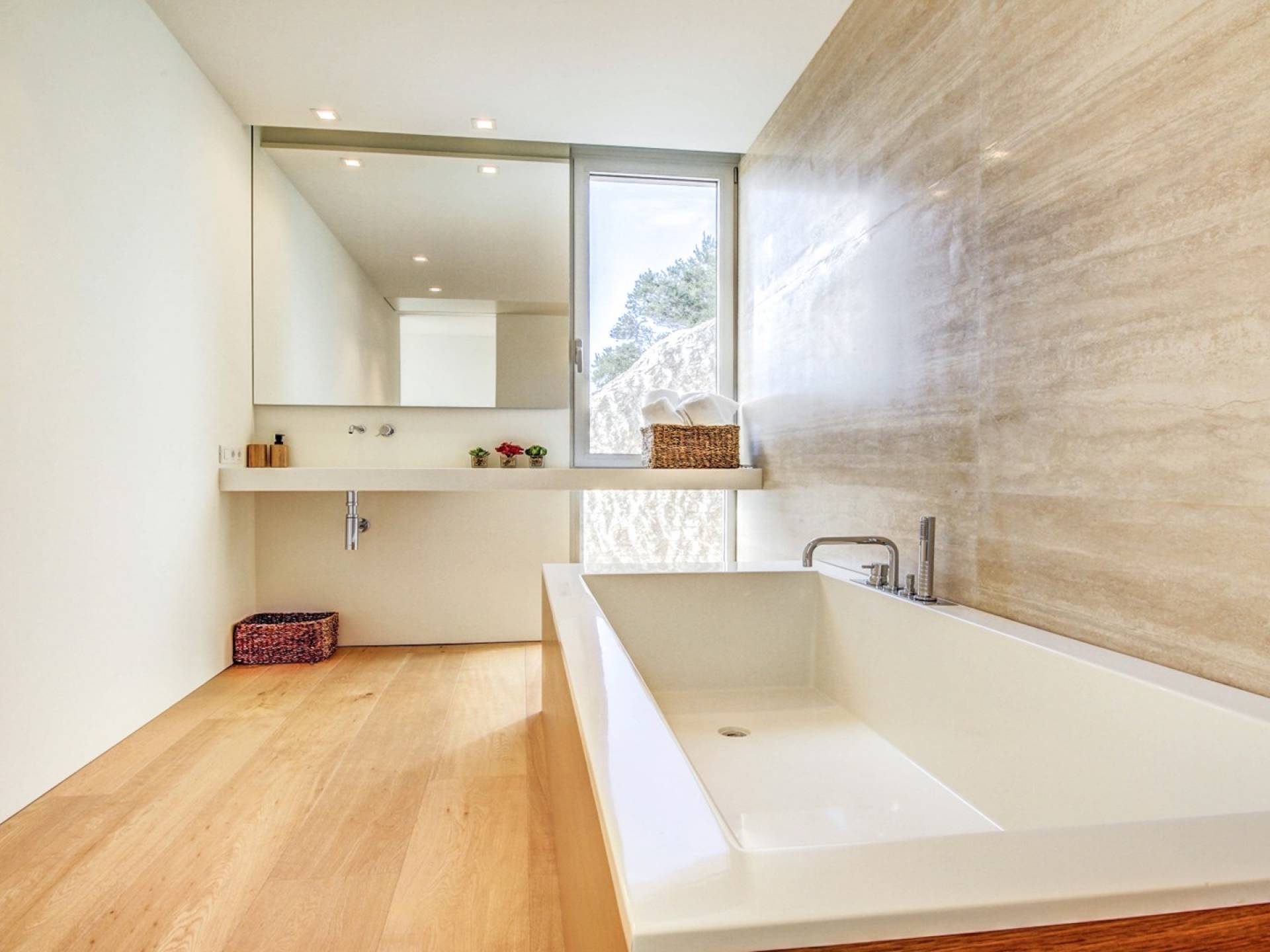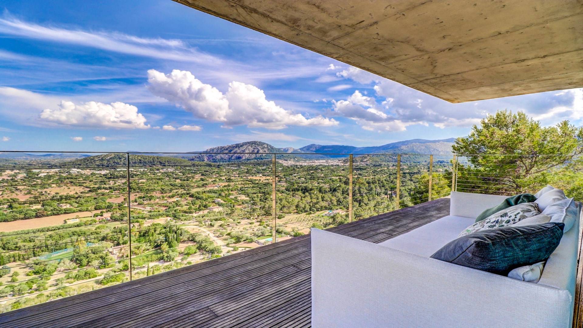 Desde aquí, un ascensor te lleva a la casa, lo que es ideal para los huéspedes con menos movilidad (el ascensor da acceso a todas las plantas de la villa). En el primer piso, la propiedad tiene una hermosa y soleada sala de estar con magníficos muebles de diseño cómodos e impresionantes obras de arte. El salón se abre a una terraza bañada por el sol y a una impresionante piscina infinita de 15,5 x 2,5 metros.