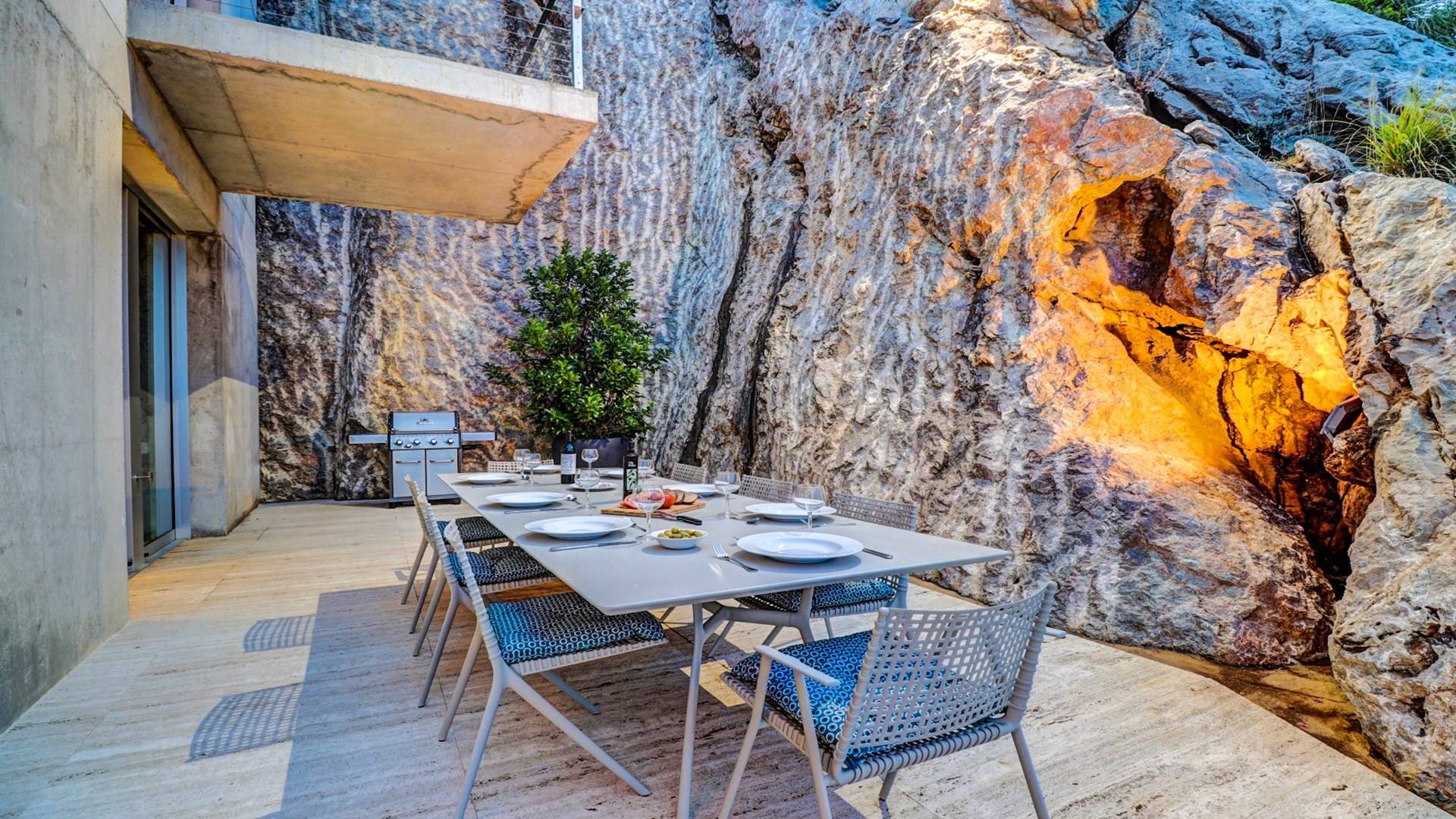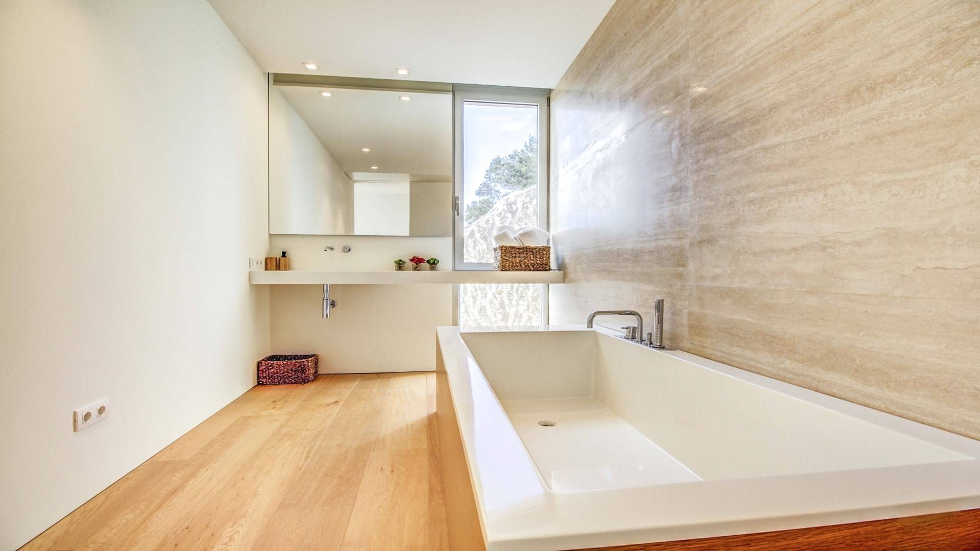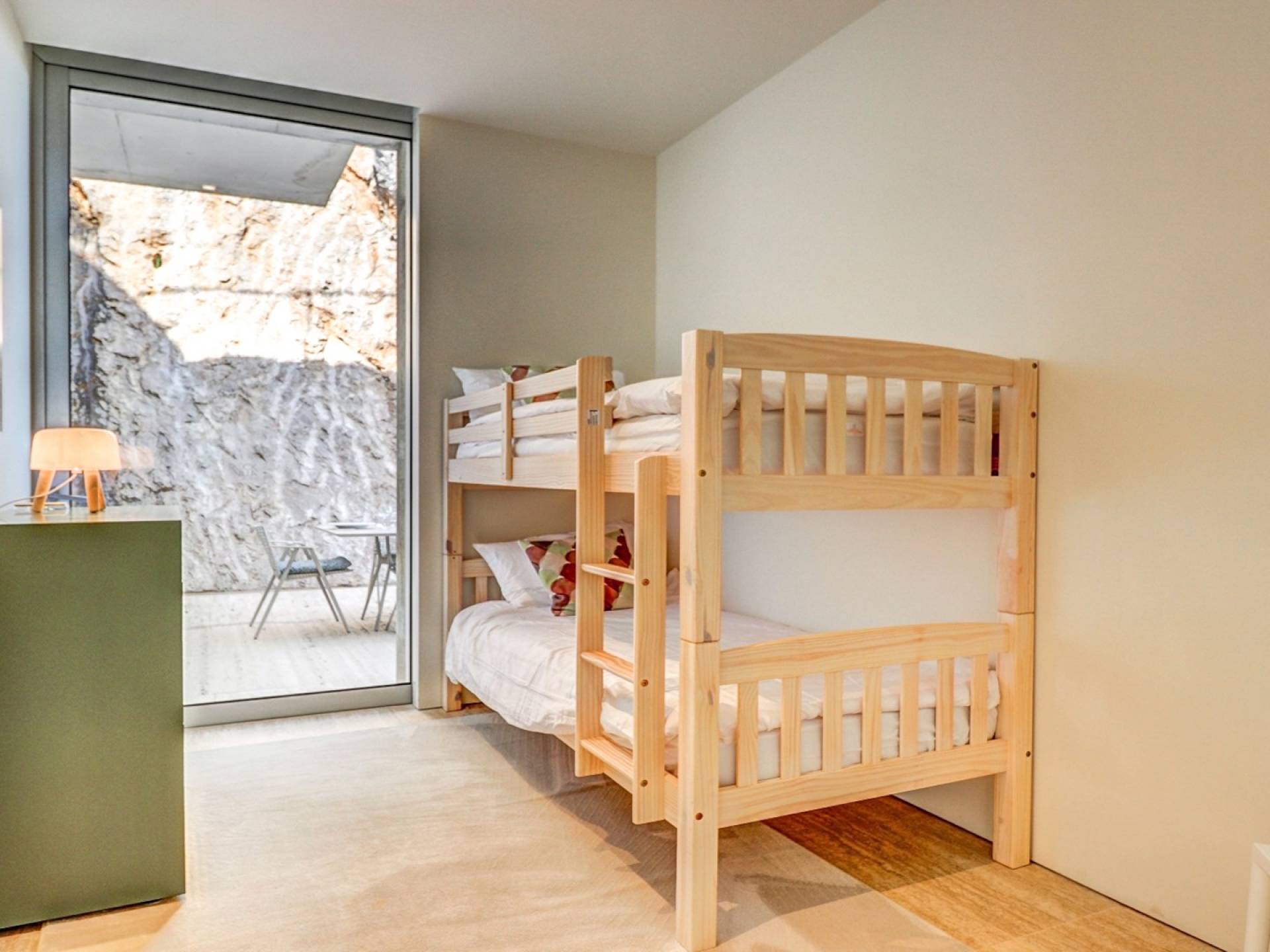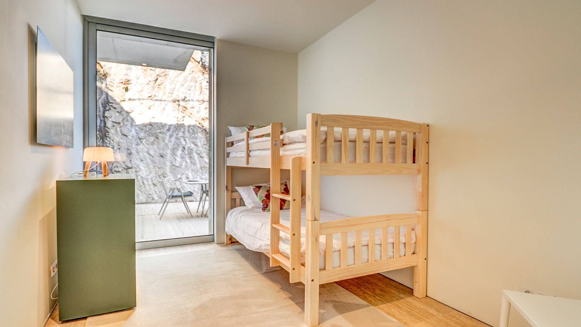 Construida en tres plantas, la villa se completó con los más altos estándares posibles en 2017. Ubicada en La Font, la villa está literalmente tallada en la roca. ¡El garaje solo podría aparecer en una película de James Bond! Villa Corazón de Piedra Mallorca tiene una gran cantidad de luz natural y vistas de 360 grados de las playas cercanas en Cala San Vincente, Puerto Pollensa y la ciudad de Pollensa. Comenzando en el nivel inferior de esta impresionante villa de vacaciones, hay un área de estacionamiento para varios autos.