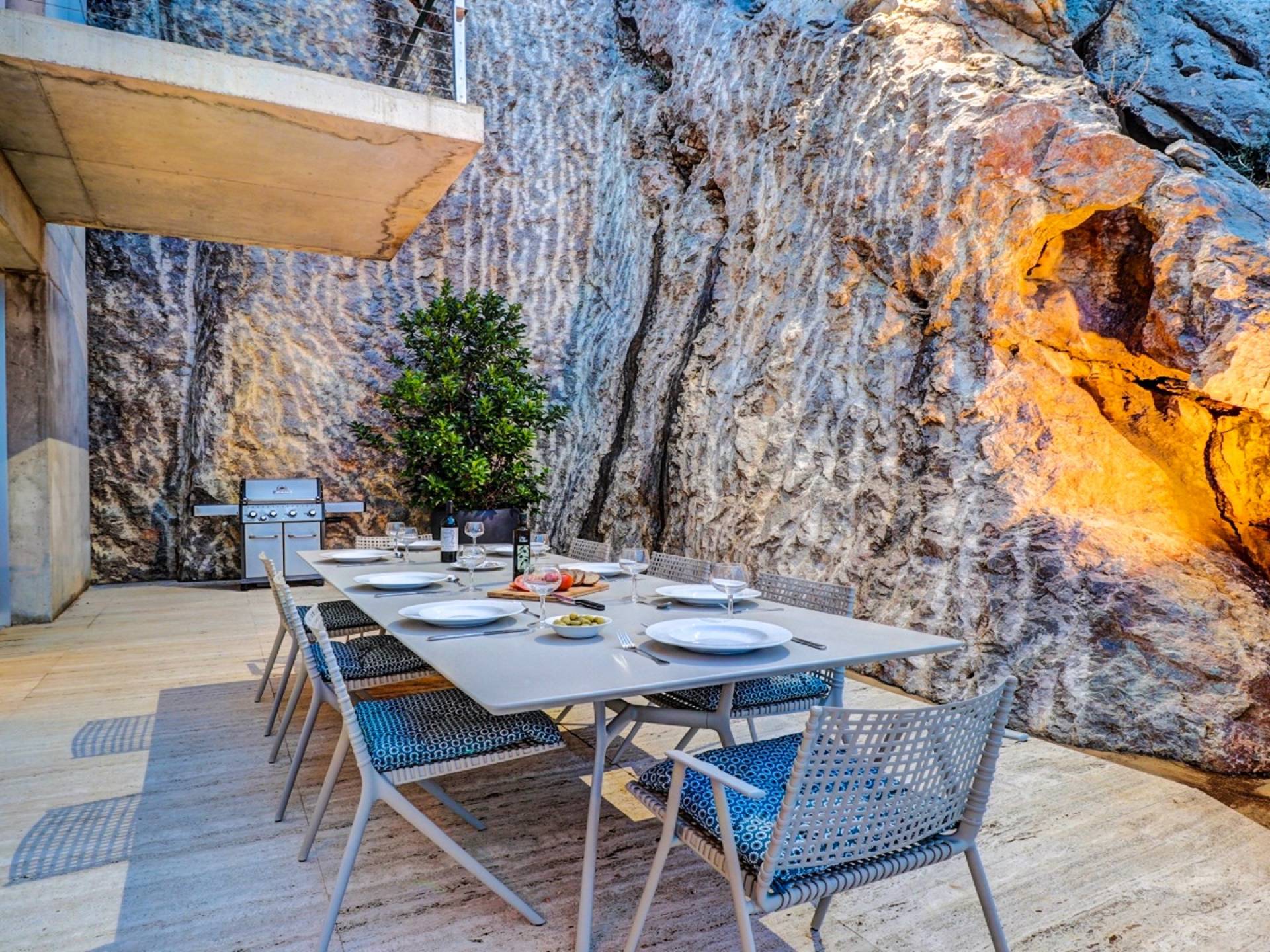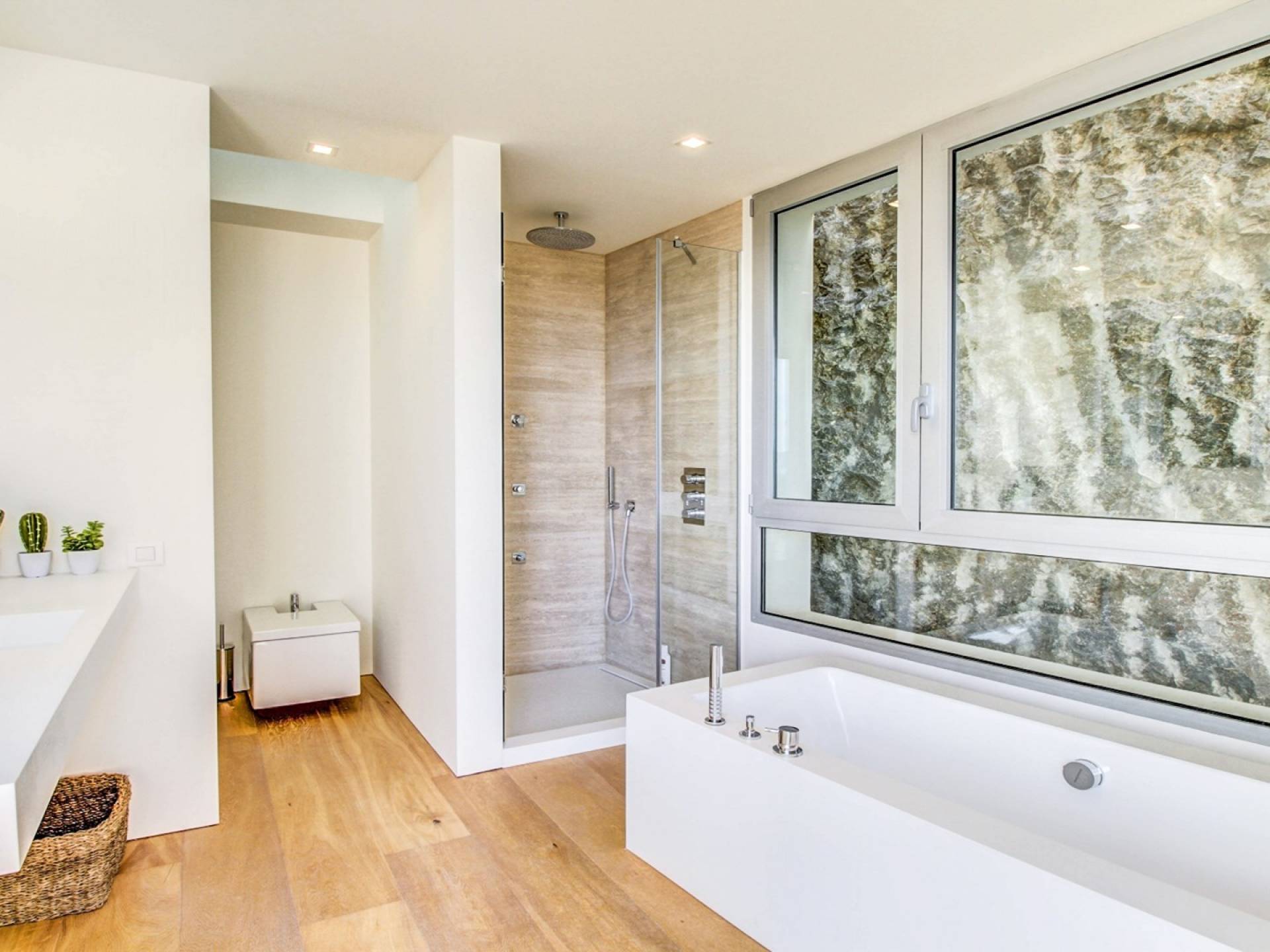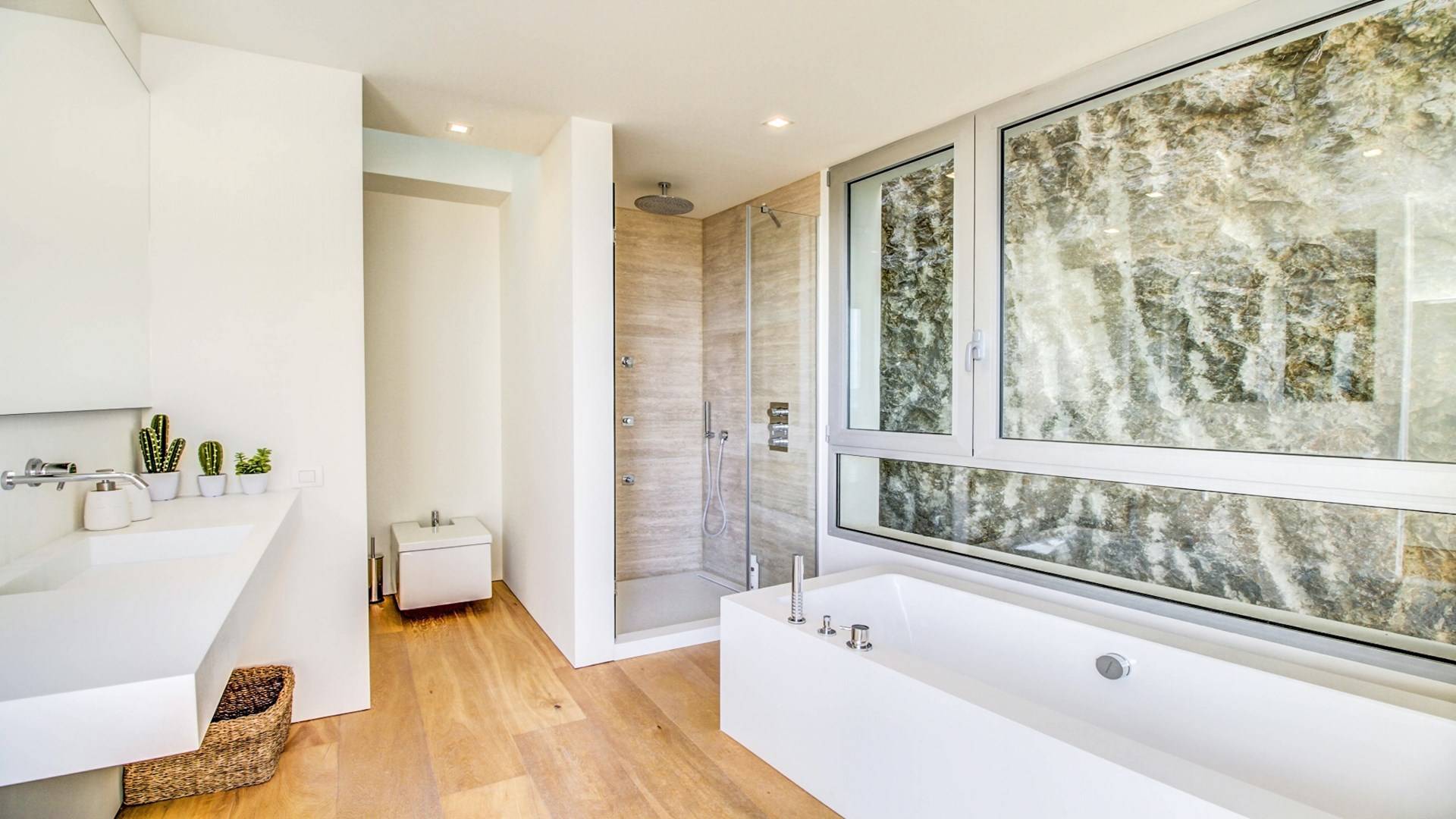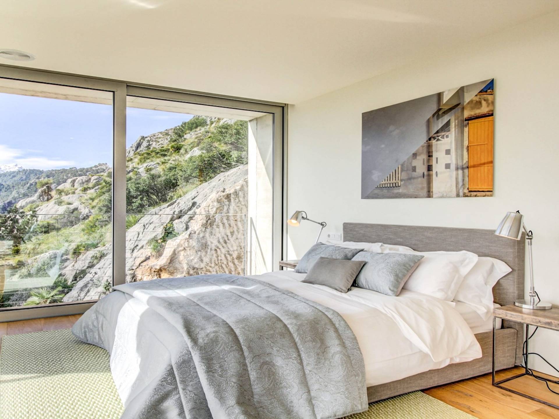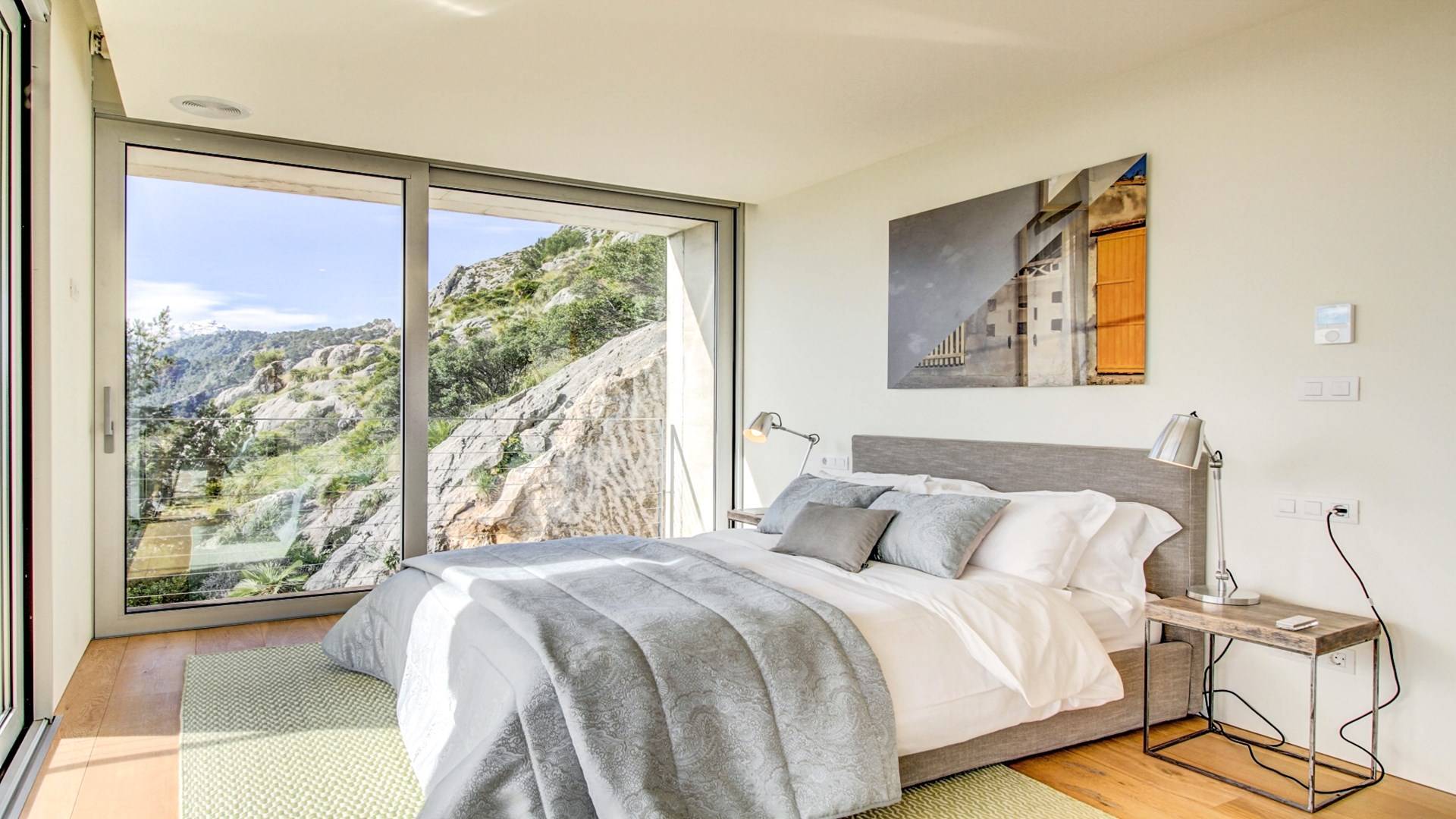 Construida en tres plantas, la villa se completó con los más altos estándares posibles en 2017. Ubicada en La Font, la villa está literalmente tallada en la roca. ¡El garaje solo podría aparecer en una película de James Bond! Villa Corazón de Piedra Mallorca tiene una gran cantidad de luz natural y vistas de 360 grados de las playas cercanas en Cala San Vincente, Puerto Pollensa y la ciudad de Pollensa. Comenzando en el nivel inferior de esta impresionante villa de vacaciones, hay un área de estacionamiento para varios autos.