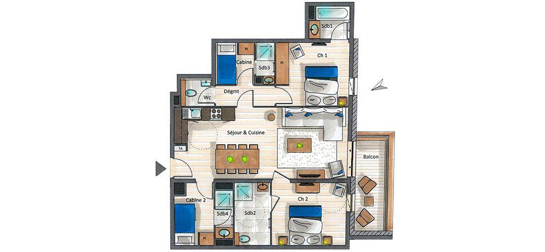 El apartamento A01, ubicado en el 1er piso de Residence Le C, con una superficie de 91 m², es perfecto para recibir a 8 personas con un máximo de 6 adultos. Este apartamento cuenta con dos dormitorios con camas dobles y camarotes de dos dormitorios con literas, ideal para niños. Cada dormitorio tiene su propio baño en suite, uno es adecuado para personas con movilidad reducida. La sala de estar con TV tiene también un comedor, una cocina totalmente equipada y un balcón. Durante tus vacaciones, podrás beneficiarte de una plaza de aparcamiento en el parking privado, guardaesquís y acceso wifi.
