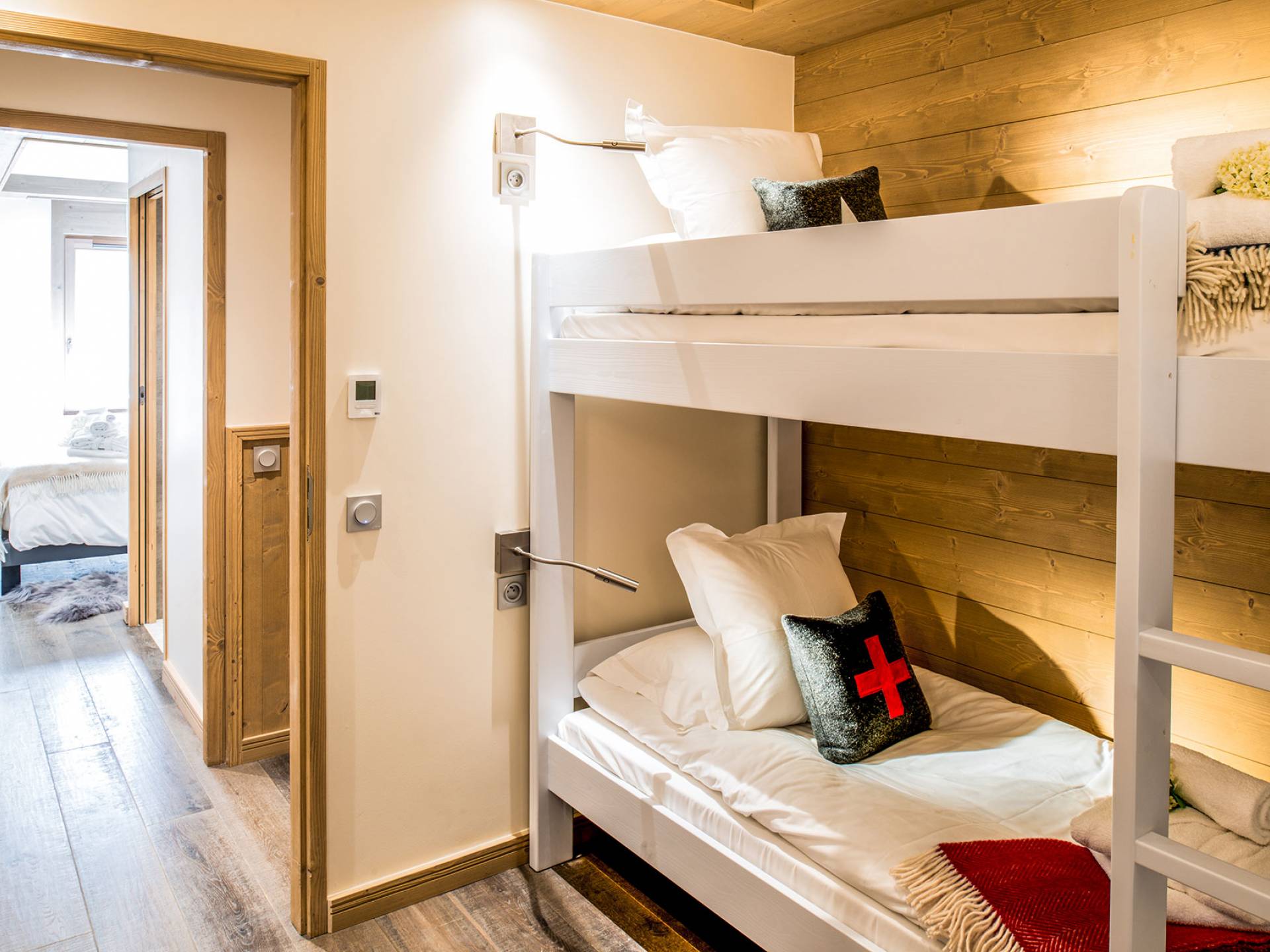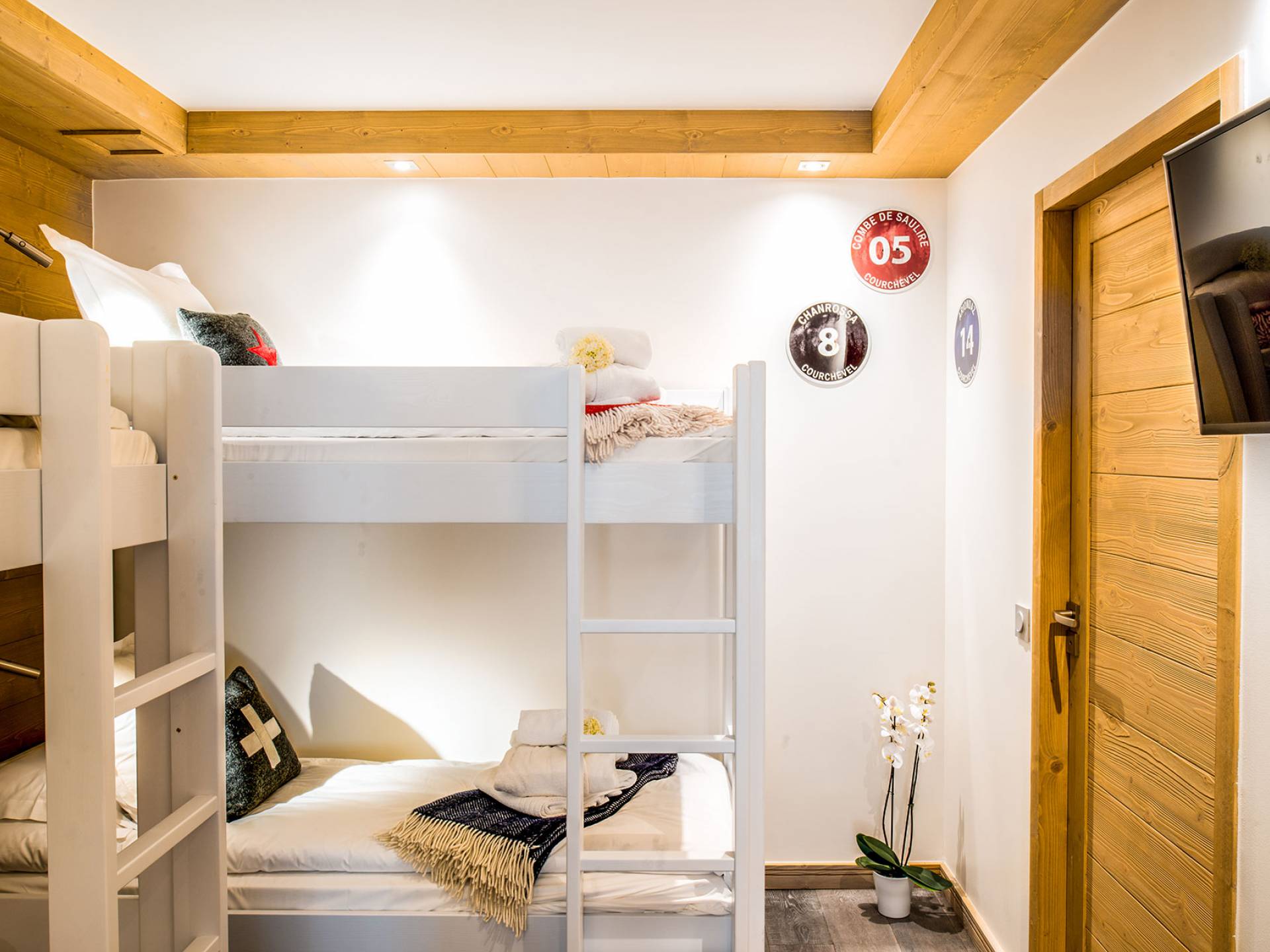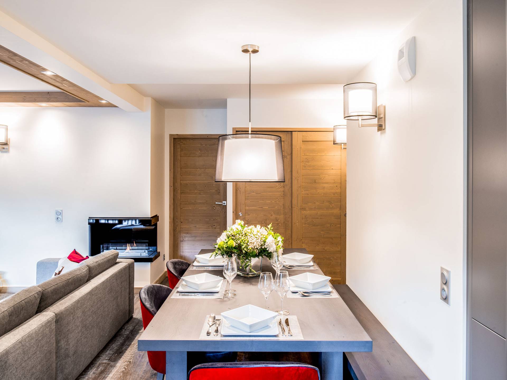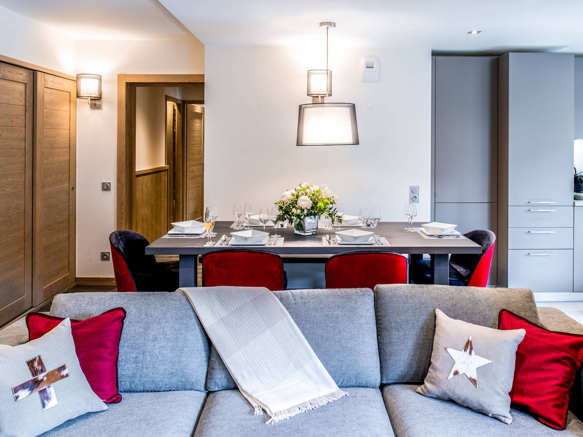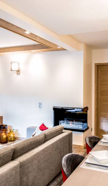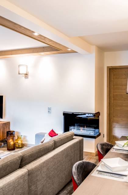 Cada apartamento ofrece espacios amplios, luminosos y acogedores para que se sienta como en casa. Y para no estropear nada, también tiene acceso a los servicios de alta gama que ofrece la residencia vecina "Le C", como el Bistrot Le C, una zona de bienestar privada y una sala de esquí. El apartamento D11, ubicado en el 4 ° piso de la Residence Mammoth Lodge Courchevel 1650, con una superficie de 82 m2, es perfecto para recibir a 8 personas. Este apartamento tiene dos dormitorios con camas dobles, un dormitorio como dormitorio con dos literas y tres baños. La sala de estar con TV y quemador de etanol tiene también una cocina totalmente equipada, un comedor y una terraza con vista al pico Saulire. Durante sus vacaciones, puede beneficiarse de una plaza de aparcamiento en el aparcamiento privado, un guardaesquís y acceso a Wi-Fi.