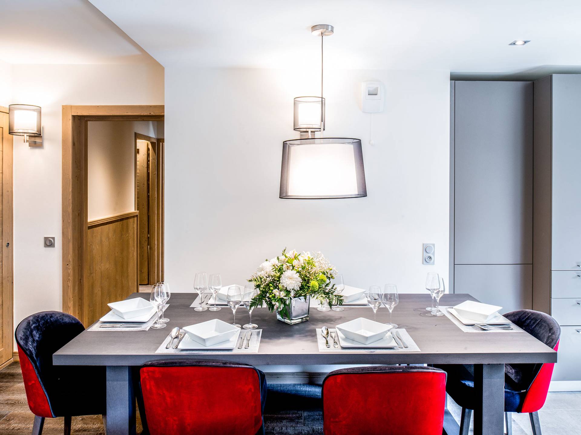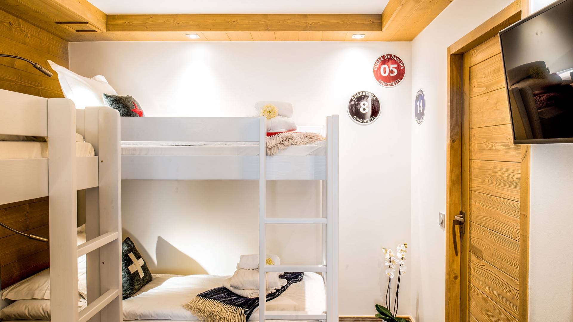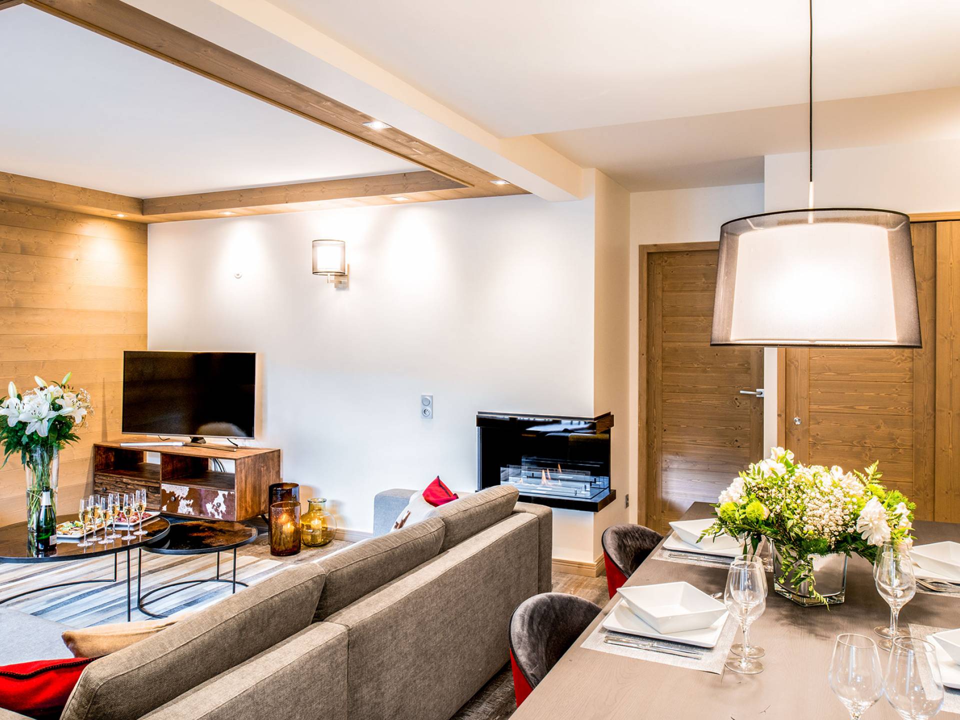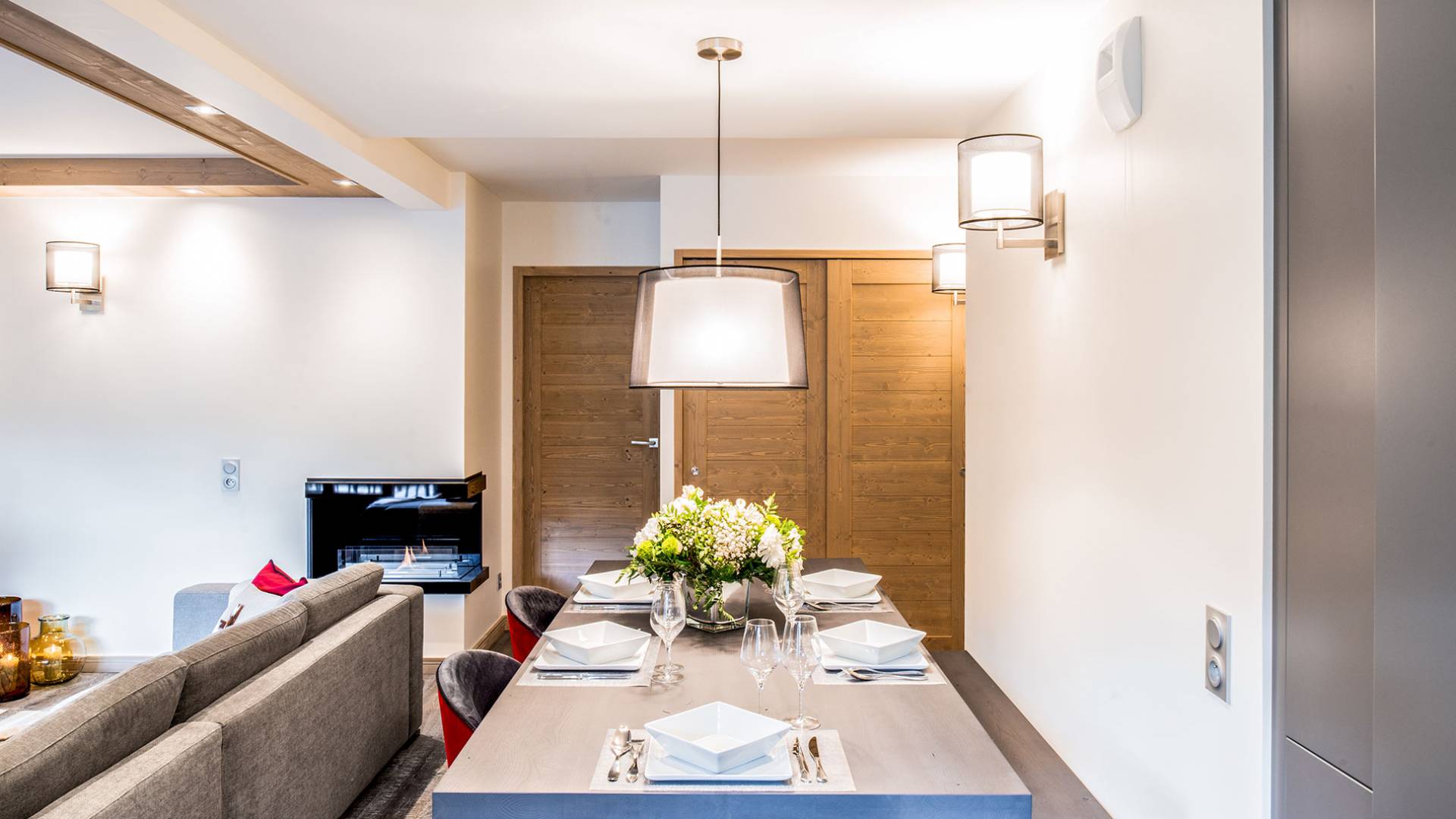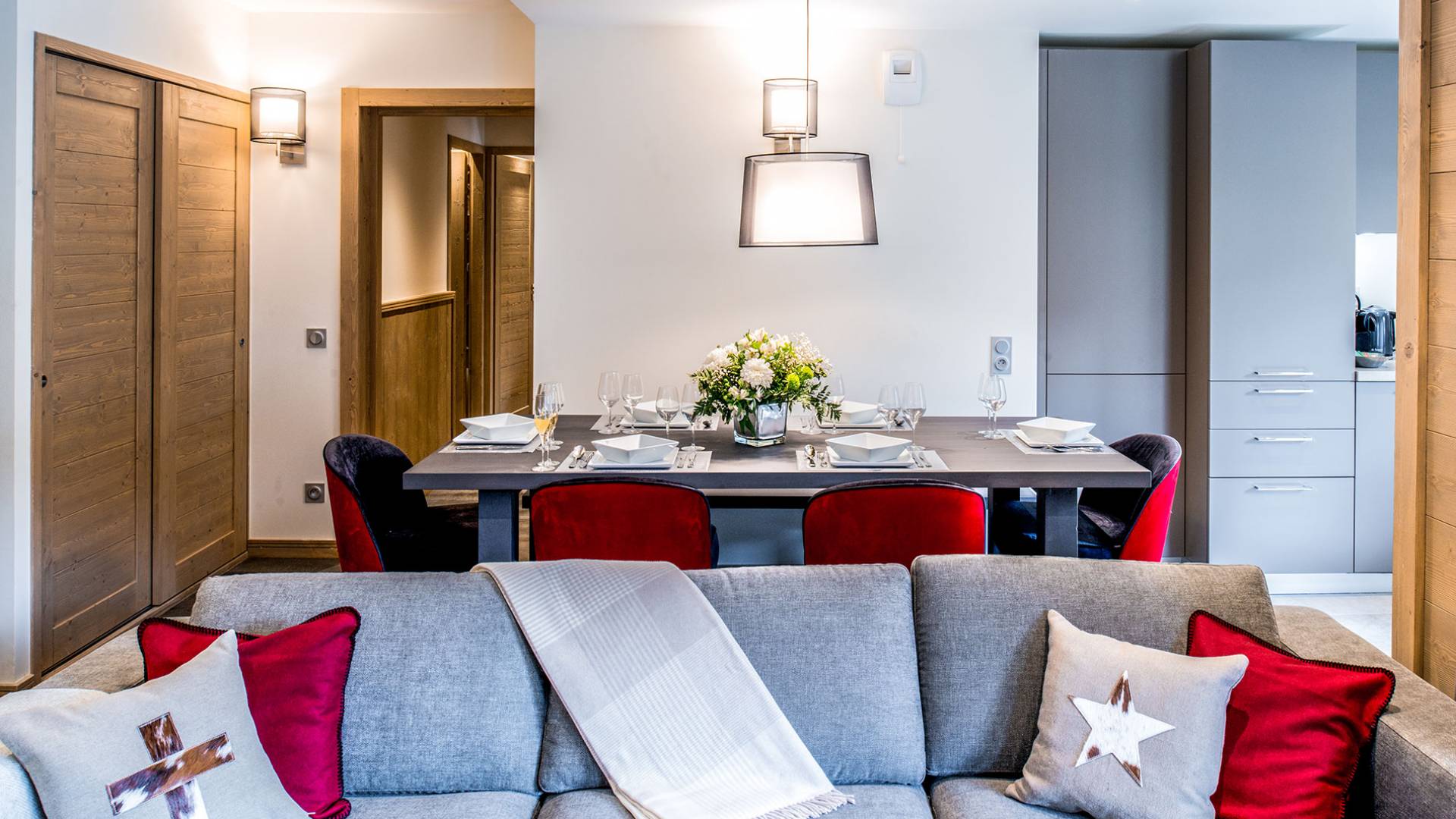 Cada apartamento ofrece espacios amplios, luminosos y acogedores para que se sienta como en casa. Y para no estropear nada, también tiene acceso a los servicios de alta gama que ofrece la residencia vecina "Le C", como el Bistrot Le C, una zona de bienestar privada y una sala de esquí. El apartamento D11, ubicado en el 4 ° piso de la Residence Mammoth Lodge Courchevel 1650, con una superficie de 82 m2, es perfecto para recibir a 8 personas. Este apartamento tiene dos dormitorios con camas dobles, un dormitorio como dormitorio con dos literas y tres baños. La sala de estar con TV y quemador de etanol tiene también una cocina totalmente equipada, un comedor y una terraza con vista al pico Saulire. Durante sus vacaciones, puede beneficiarse de una plaza de aparcamiento en el aparcamiento privado, un guardaesquís y acceso a Wi-Fi.