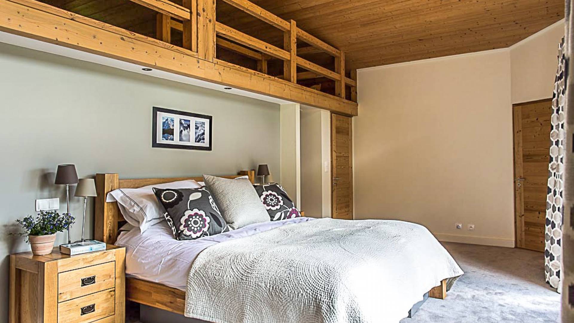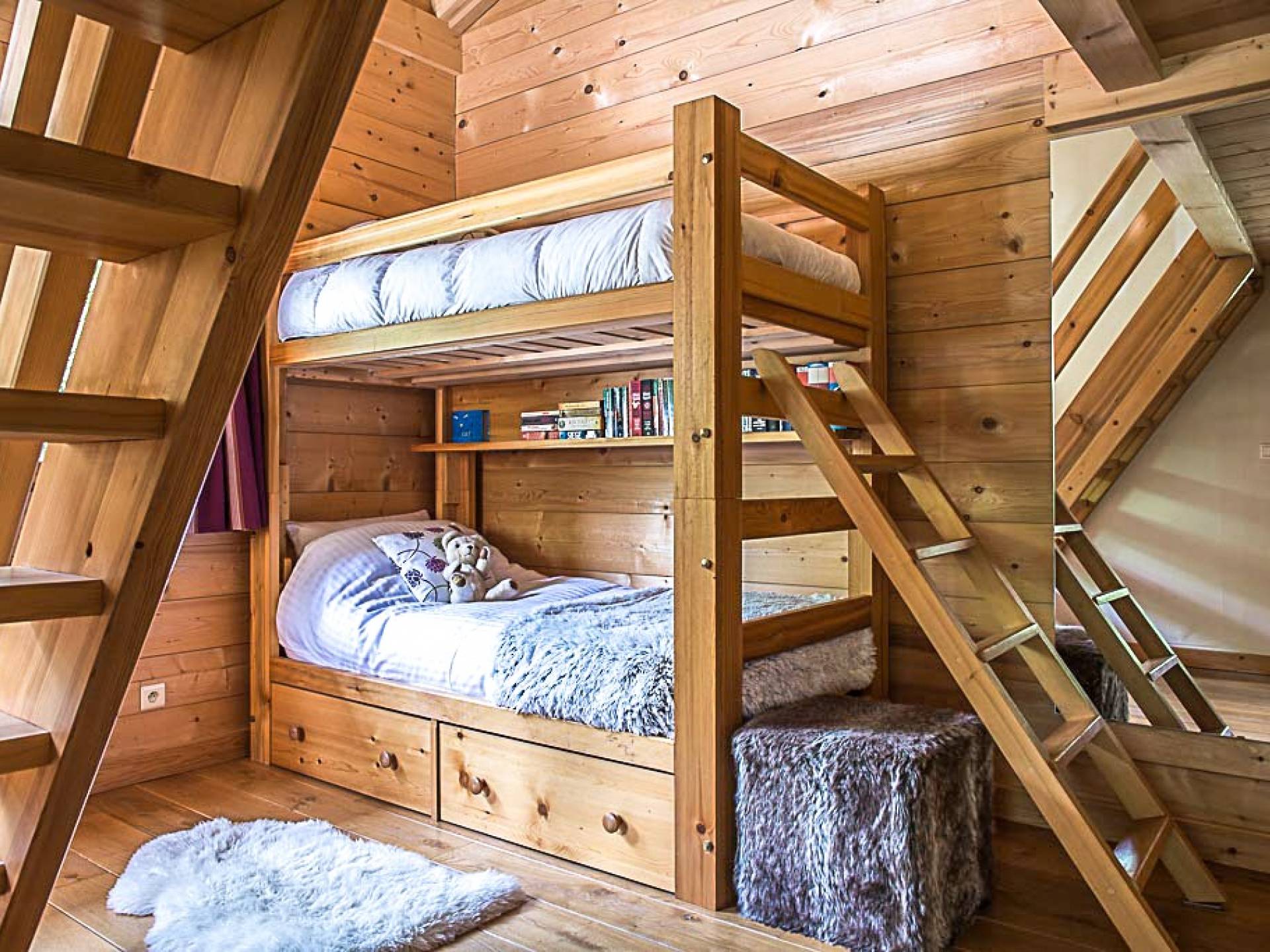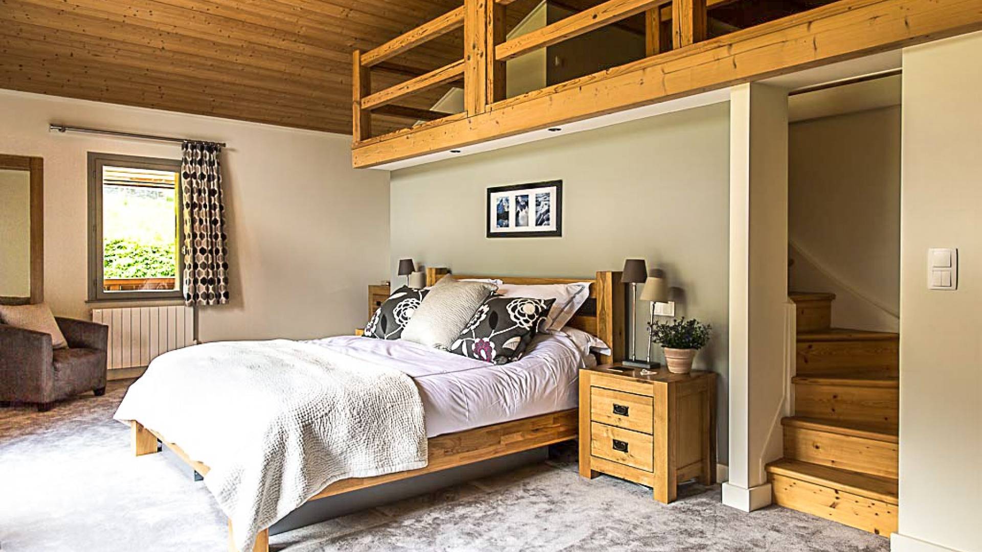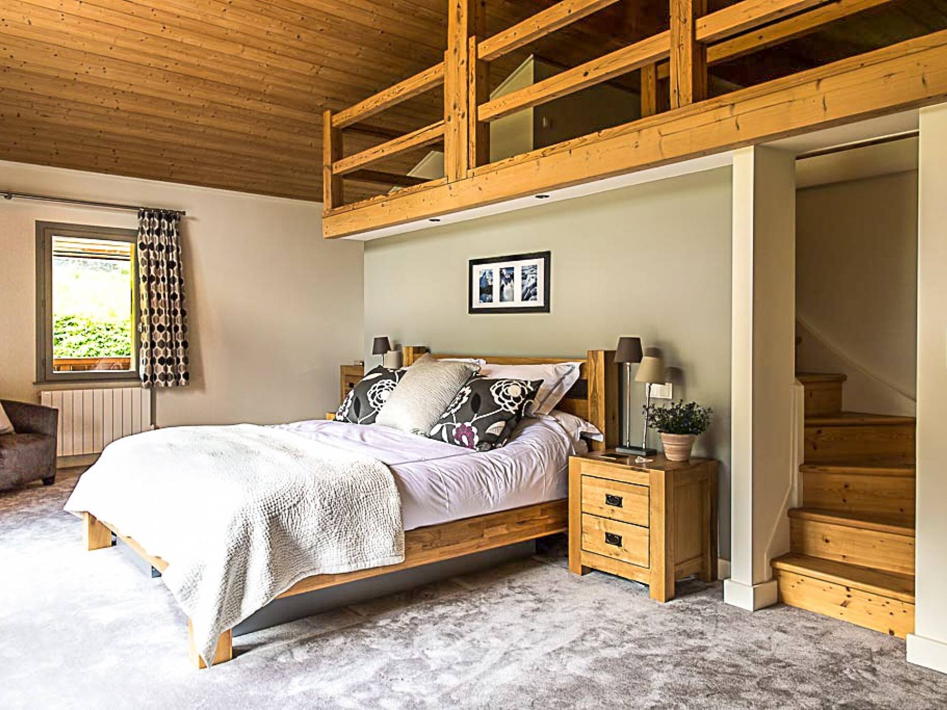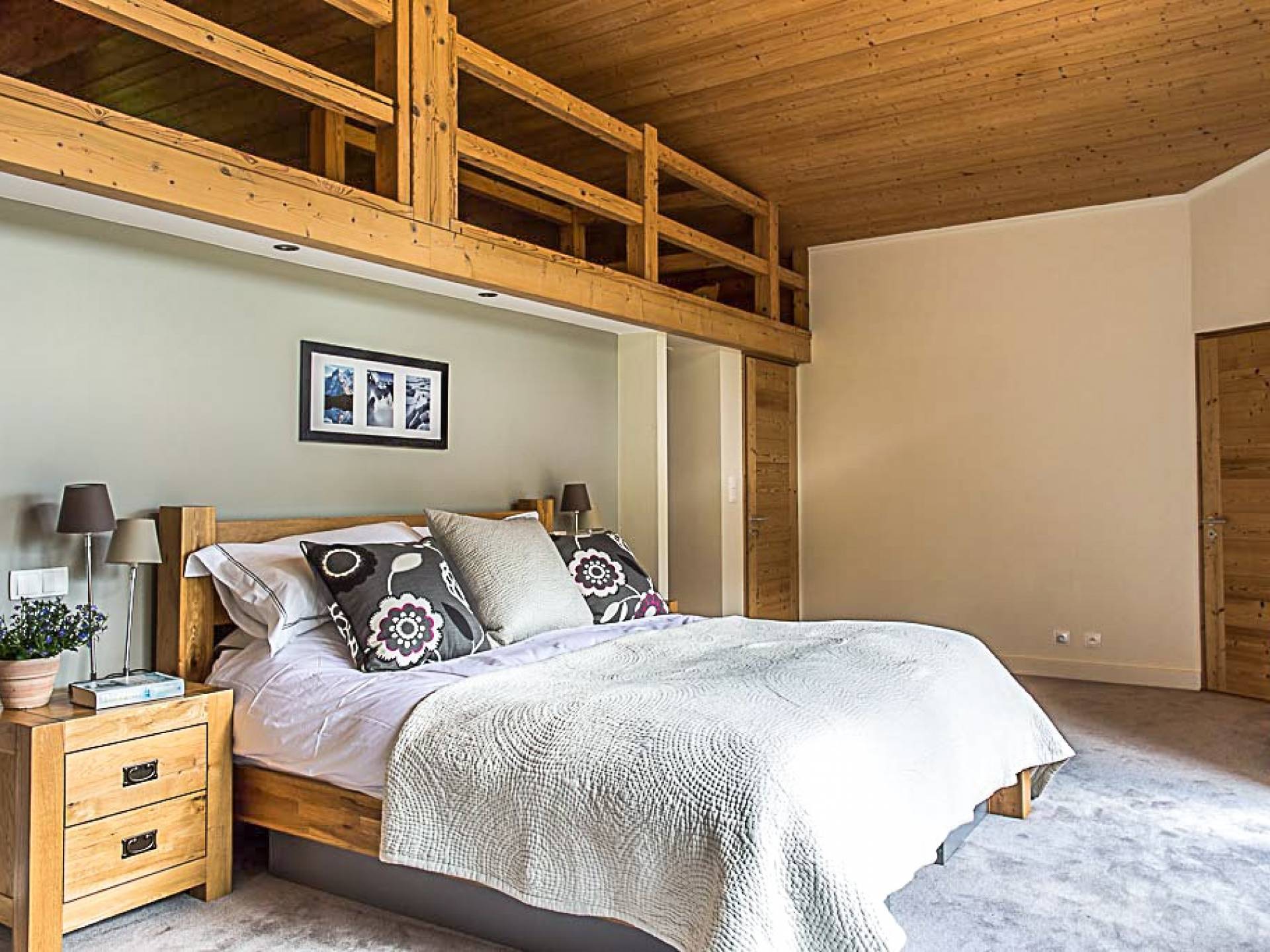 En la planta baja, hay un dormitorio, con baño y ducha, una sala de cine bien equipada, la sala de esquí y botas, y lavandería. El primer piso tiene un gran dormitorio con literas en suite, con un entrepiso que tiene dos camas individuales. Esto se encuentra detrás del área de TV de planta abierta, salón con chimenea, gran comedor con cocina de planta abierta con isla central y despensa separada, todos abiertos a una gran terraza y áreas exteriores. El piso superior contiene: la suite principal con vestidor y un entrepiso adicional que ofrece espacio adicional para dormir para 3 personas "debajo de los aleros", por lo que se puede usar como una suite familiar con algo de privacidad. Otro dormitorio doble que también tiene baño y otro dormitorio que se puede utilizar como doble o individual, también en suite.