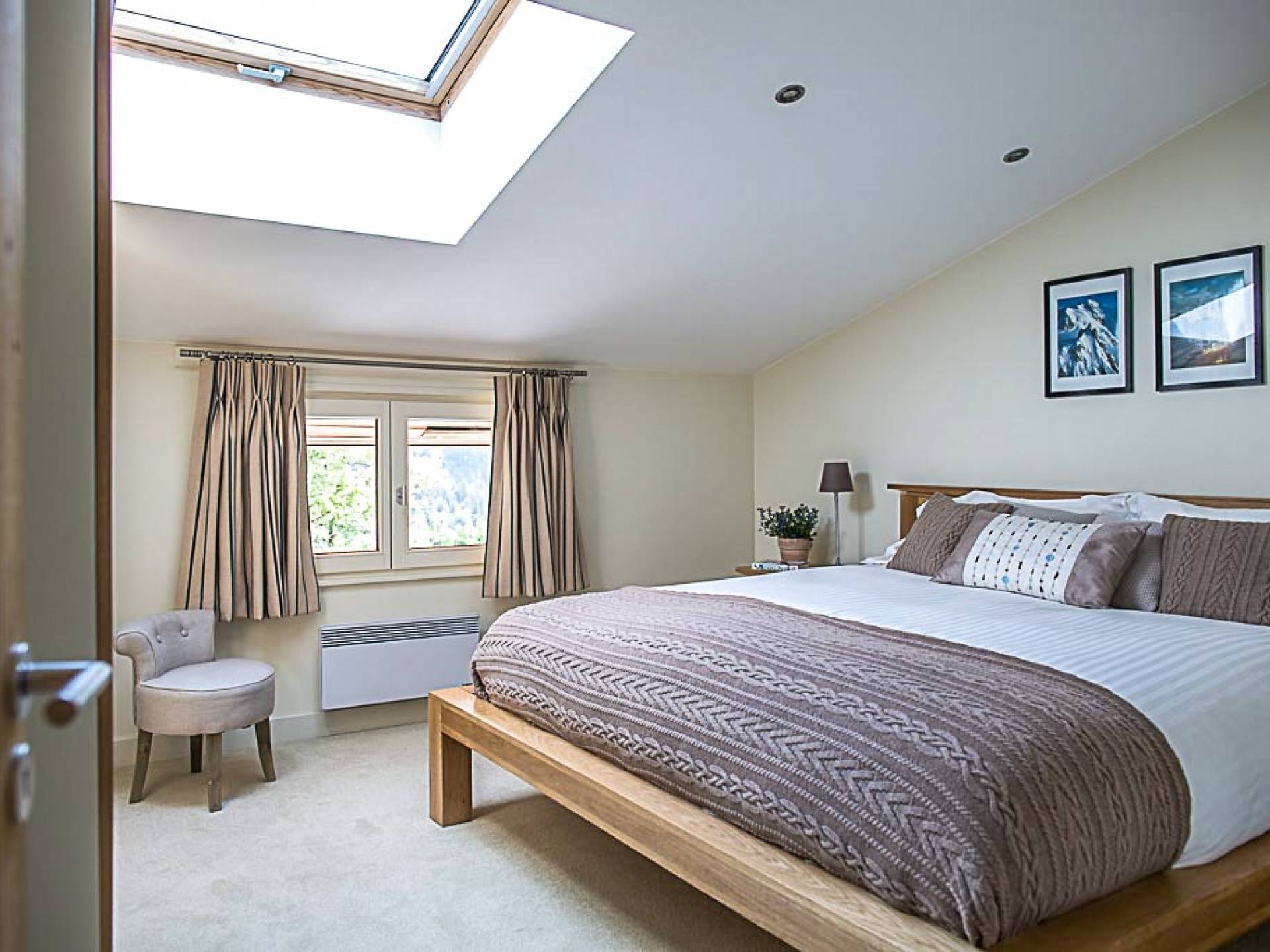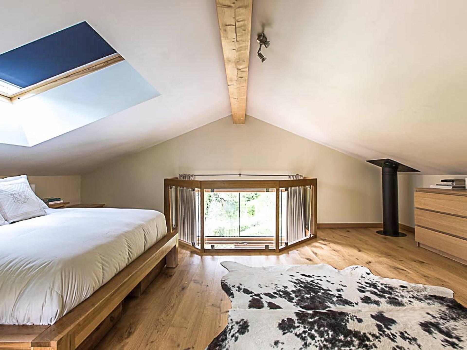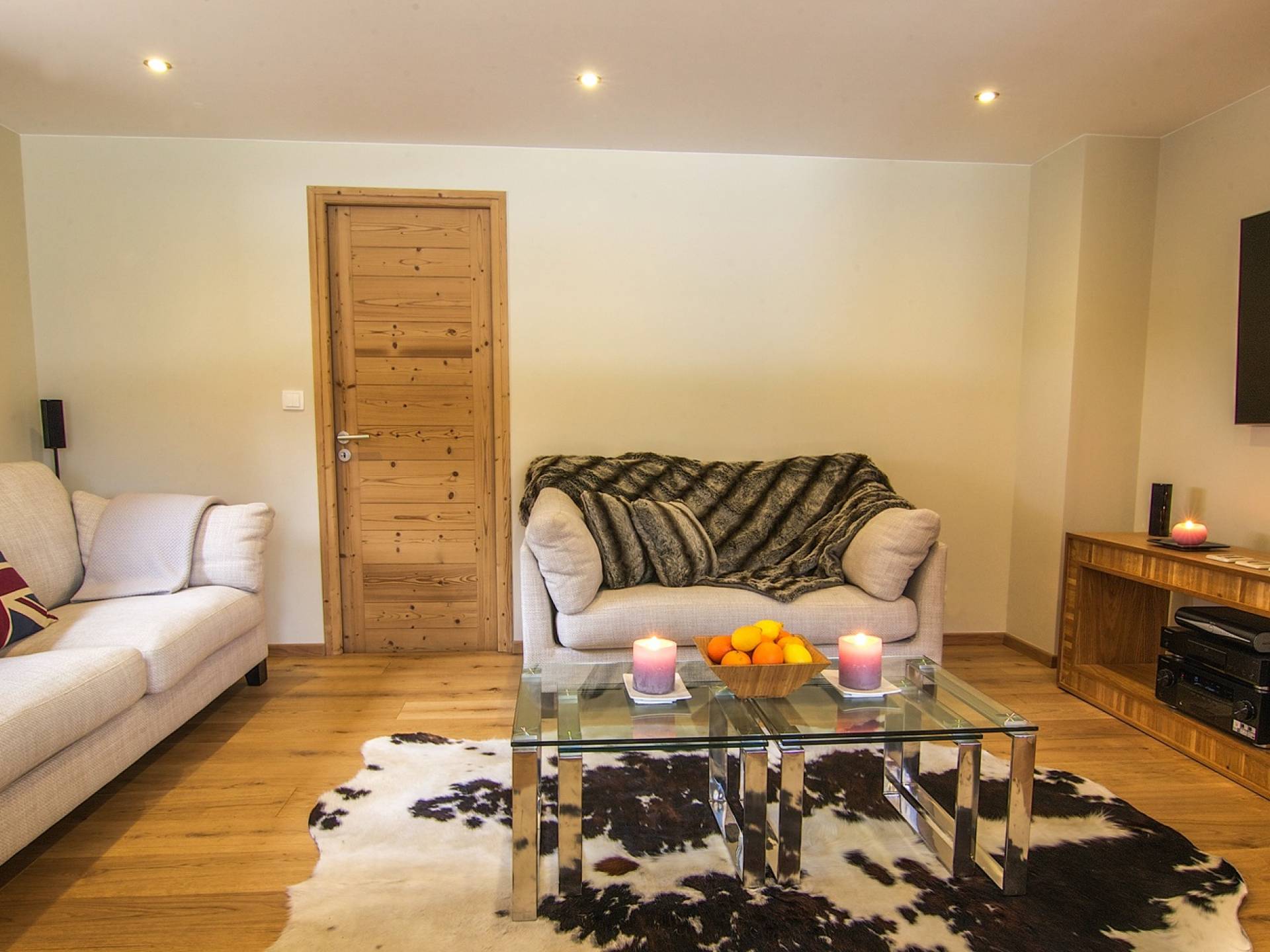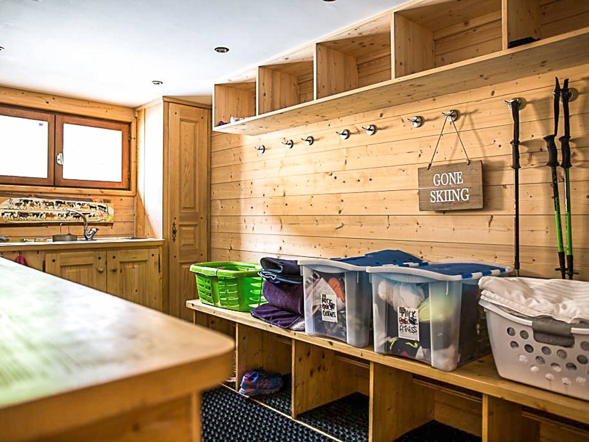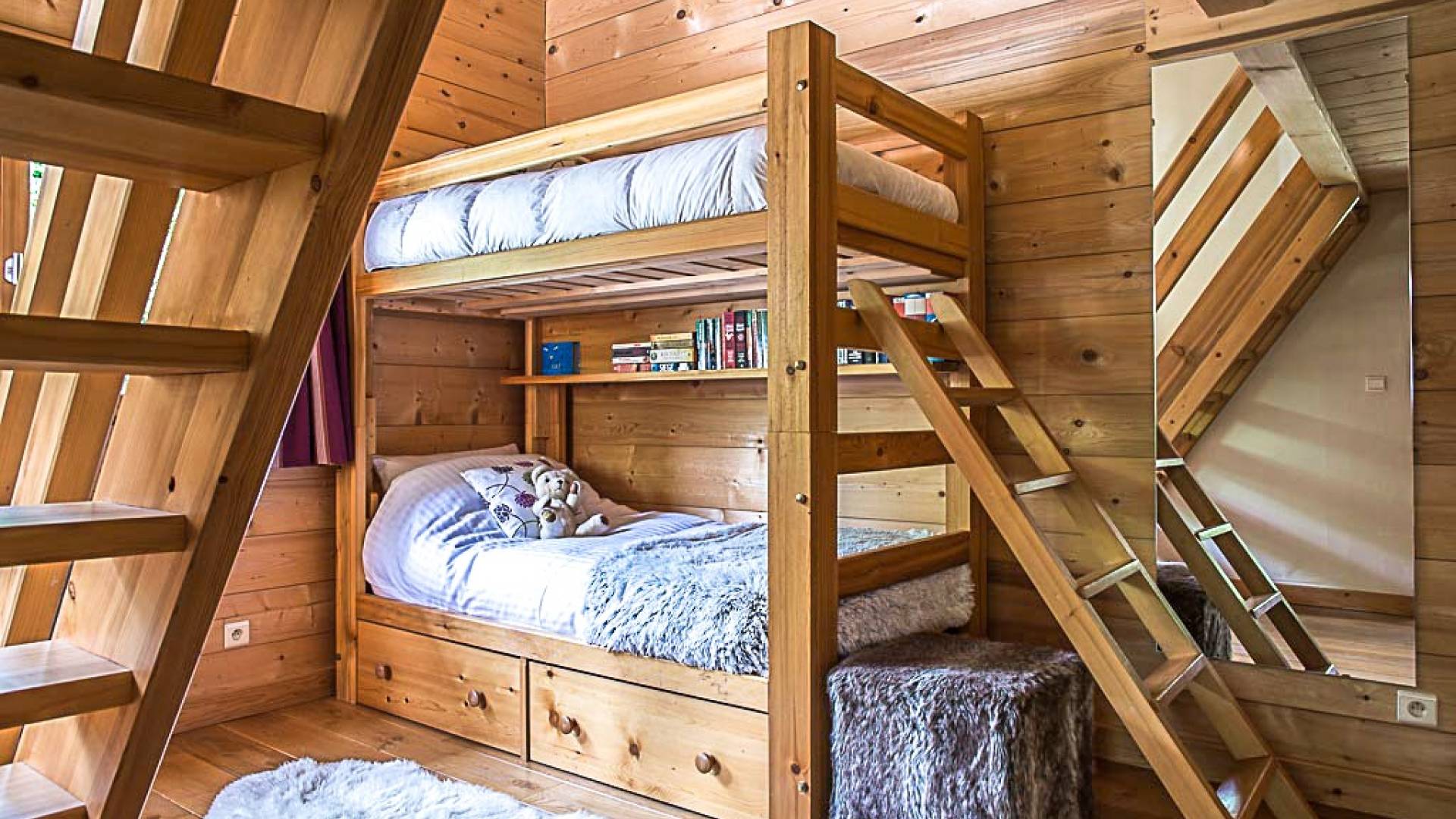 En la planta baja, hay un dormitorio, con baño y ducha, una sala de cine bien equipada, la sala de esquí y botas, y lavandería. El primer piso tiene un gran dormitorio con literas en suite, con un entrepiso que tiene dos camas individuales. Esto se encuentra detrás del área de TV de planta abierta, salón con chimenea, gran comedor con cocina de planta abierta con isla central y despensa separada, todos abiertos a una gran terraza y áreas exteriores. El piso superior contiene: la suite principal con vestidor y un entrepiso adicional que ofrece espacio adicional para dormir para 3 personas "debajo de los aleros", por lo que se puede usar como una suite familiar con algo de privacidad. Otro dormitorio doble que también tiene baño y otro dormitorio que se puede utilizar como doble o individual, también en suite.