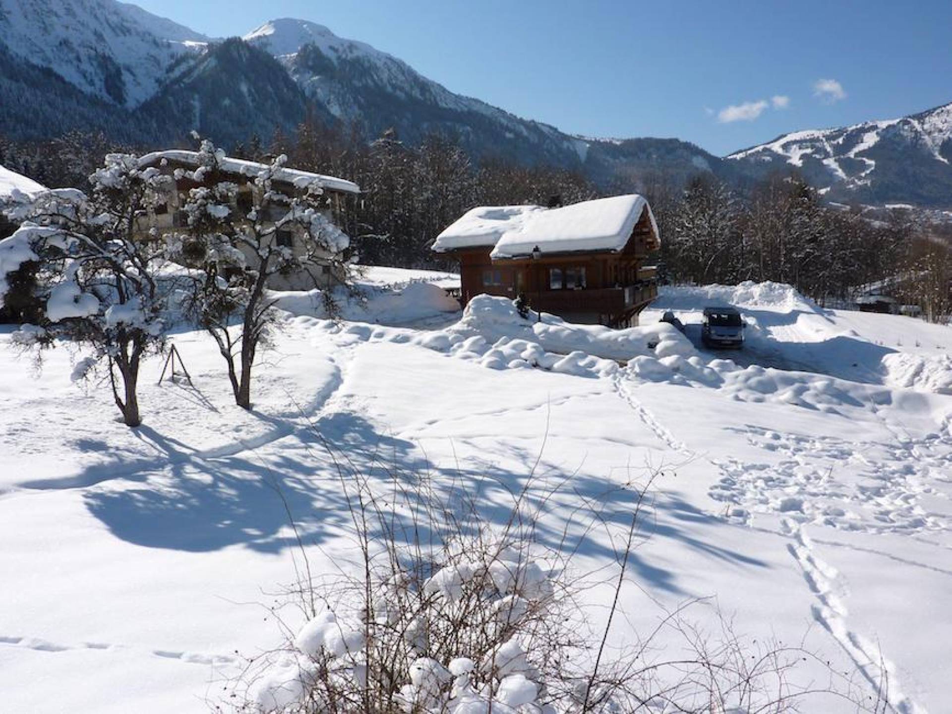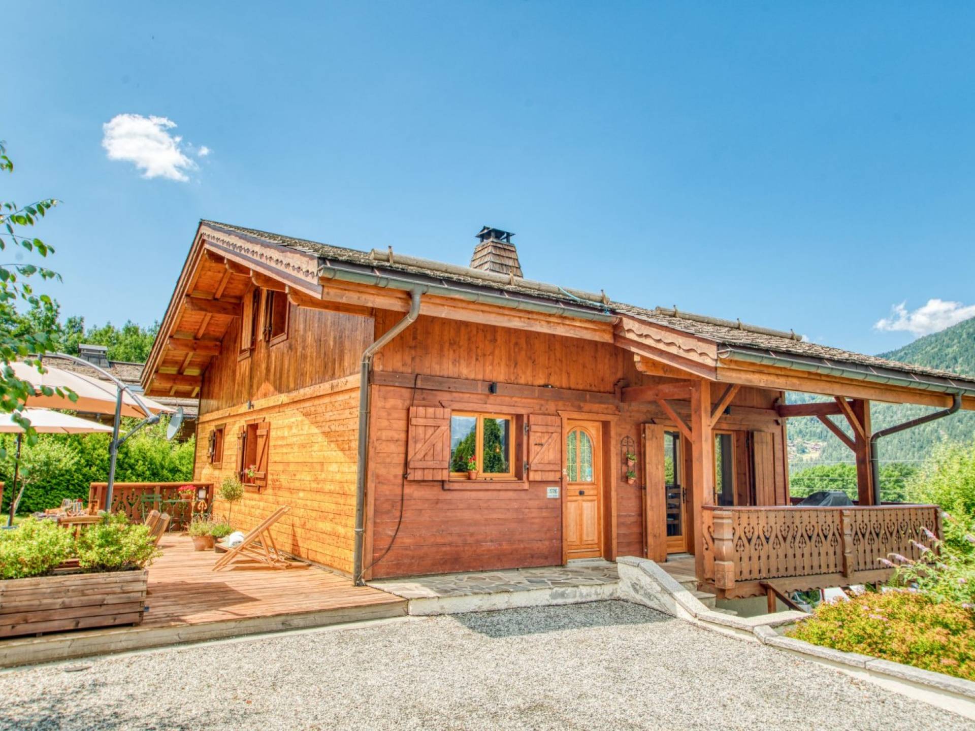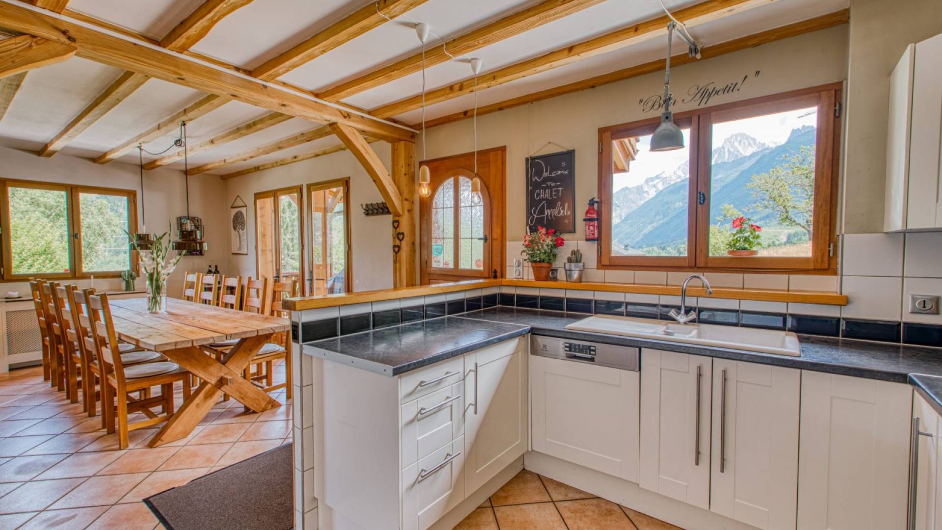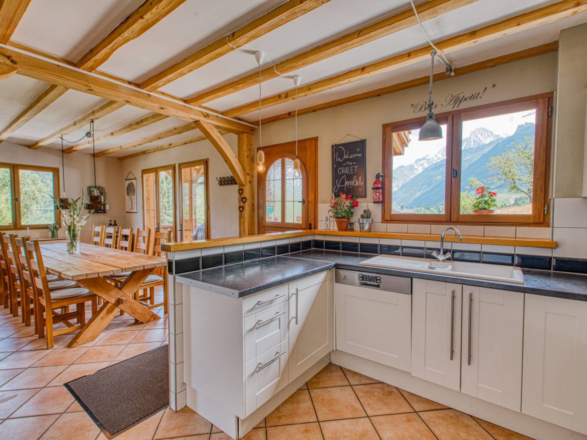 Cocina moderna de planta abierta con encimera de gas Smeg y horno doble, microondas, lavavajillas, lavadora, frigorífico con congelador grande, cafetera. Casillero de esquí externo seguro. Sala de botas de esquí interior climatizada. Zona de terraza orientada al sur con bañera de hidromasaje con vistas al macizo del Mont Blanc, grandes jardines, en una calle sin salida. Amplio estacionamiento para invitados fuera de la carretera para más de 7 vehículos en 2 entradas privadas.