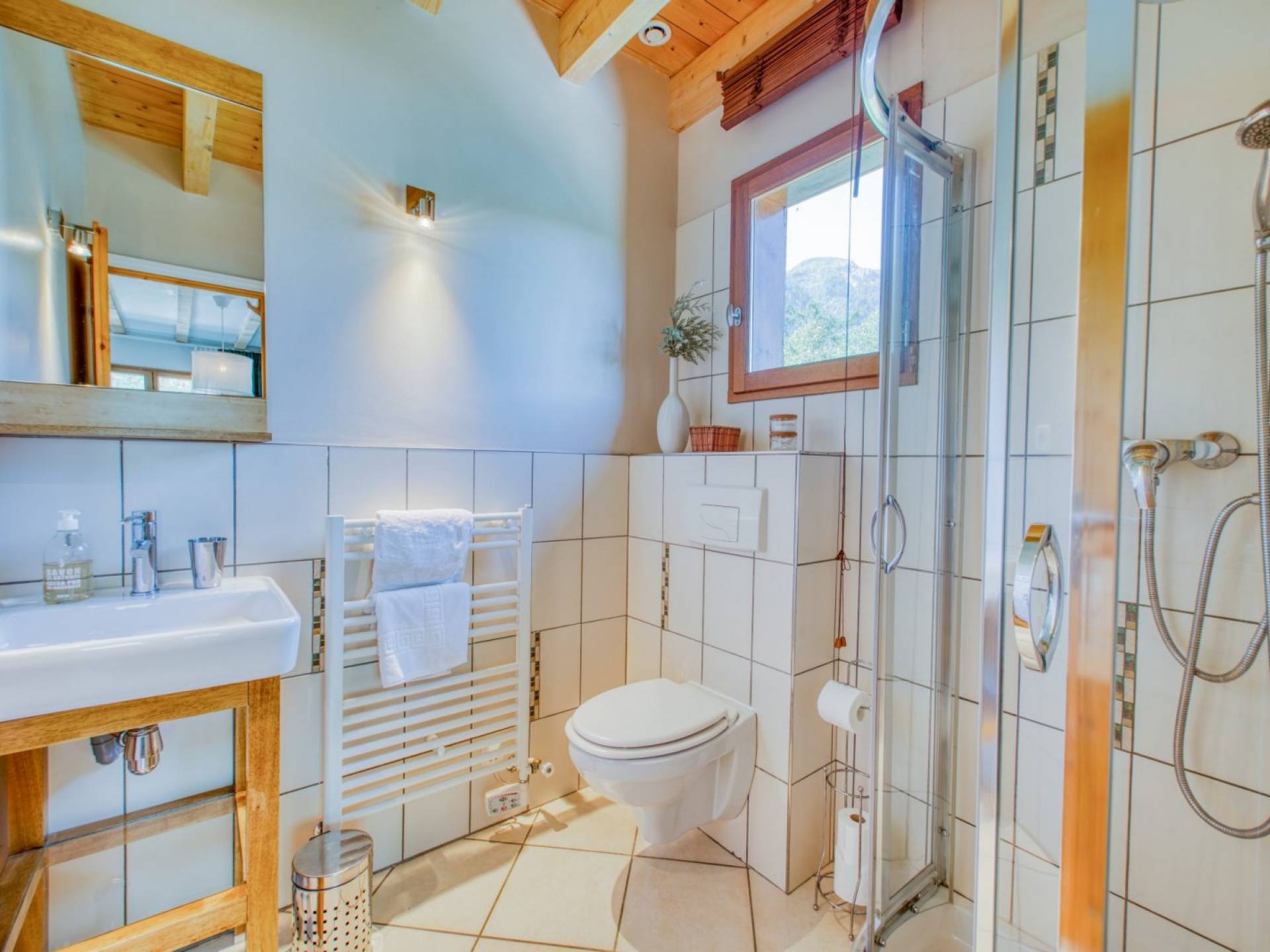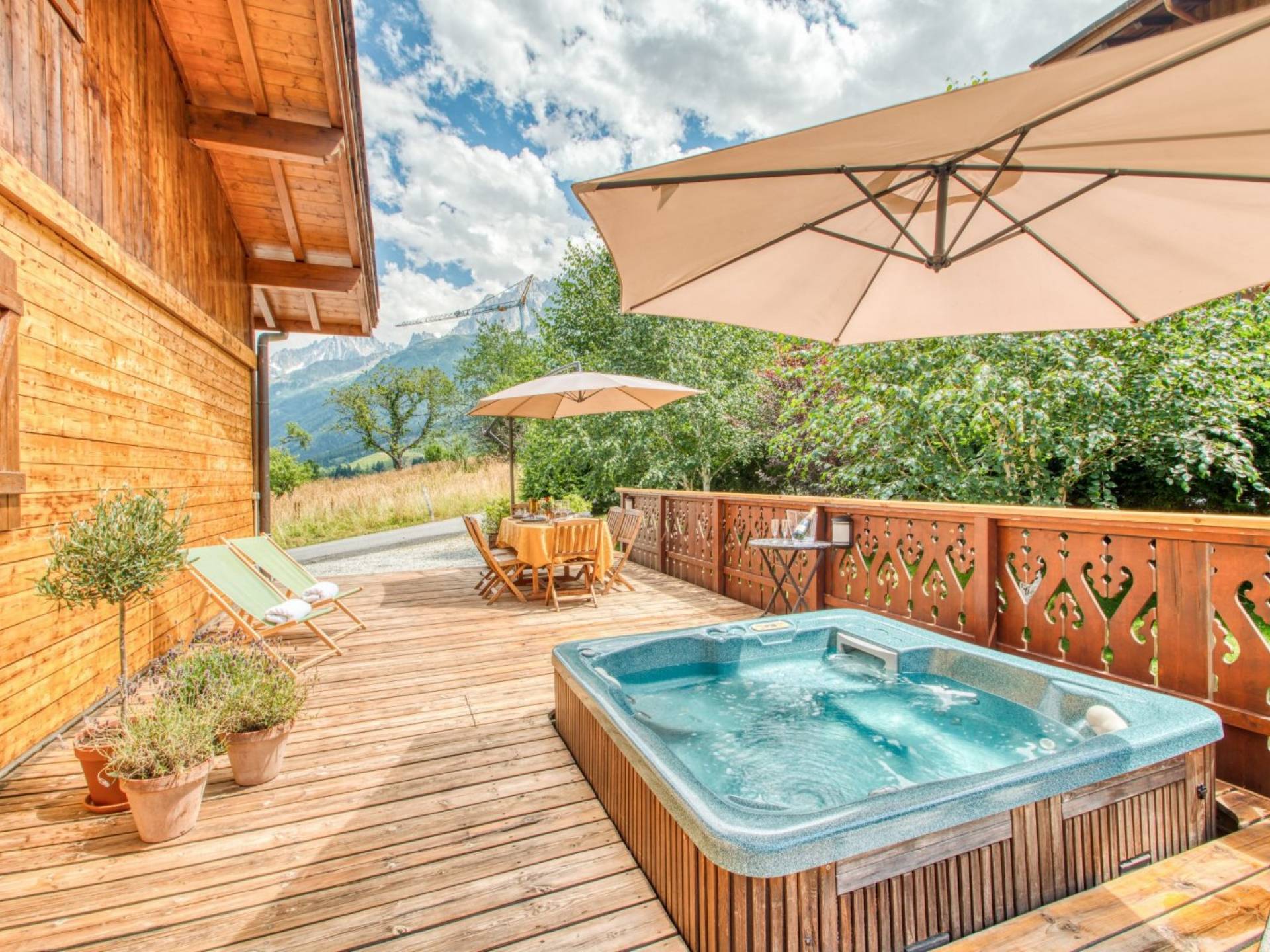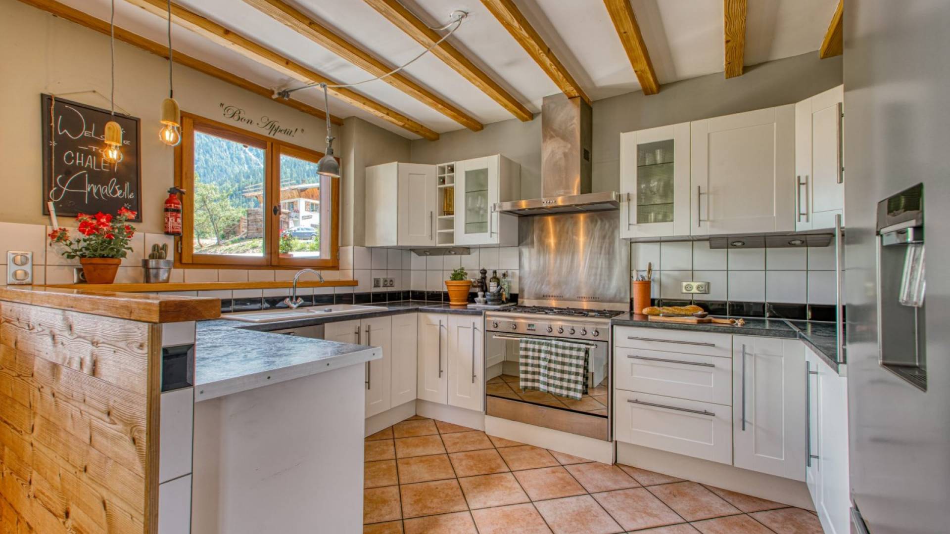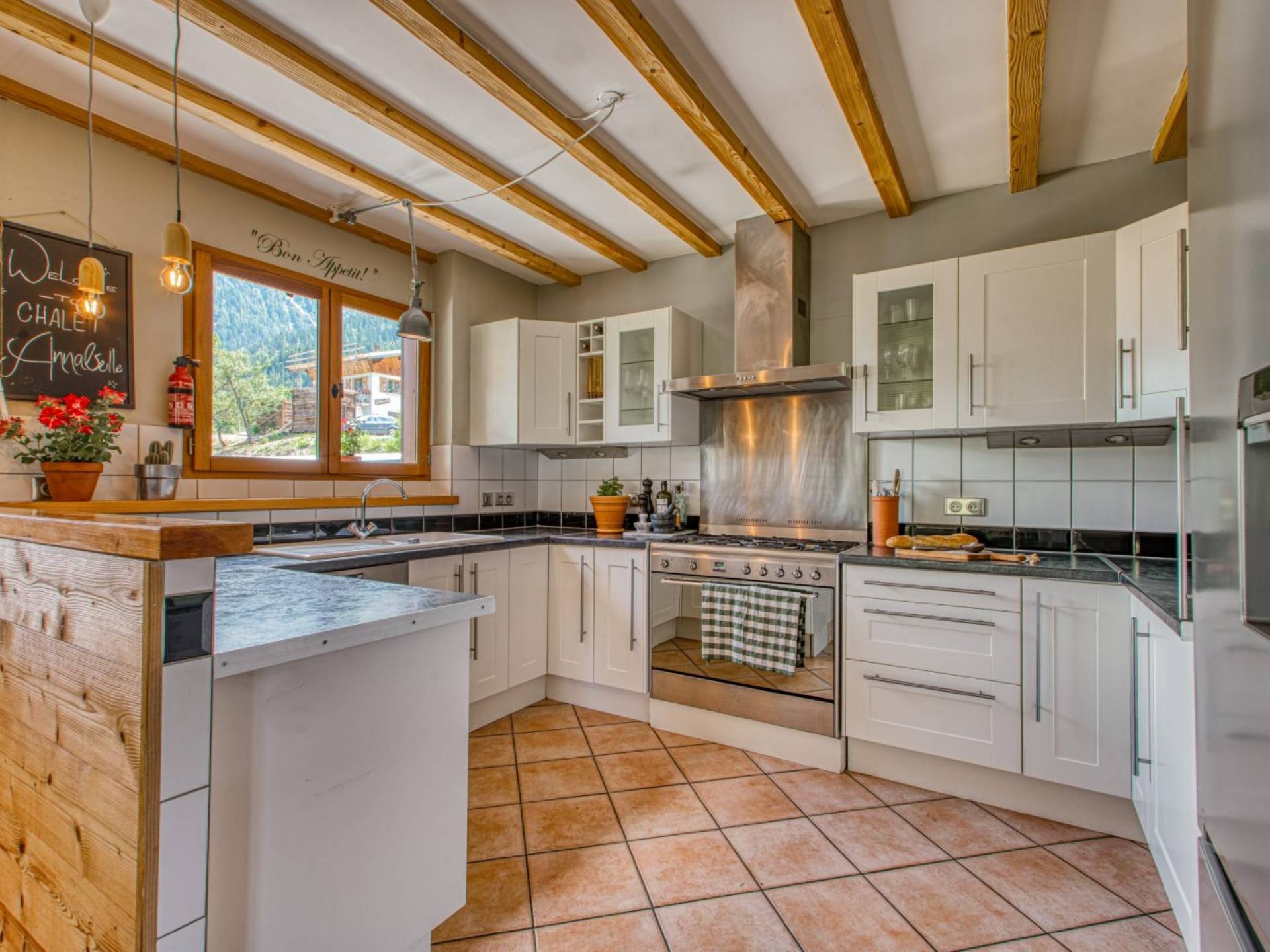Cocina moderna de planta abierta con encimera de gas Smeg y horno doble, microondas, lavavajillas, lavadora, frigorífico con congelador grande, cafetera. Casillero de esquí externo seguro. Sala de botas de esquí interior climatizada. Zona de terraza orientada al sur con bañera de hidromasaje con vistas al macizo del Mont Blanc, grandes jardines, en una calle sin salida. Amplio estacionamiento para invitados fuera de la carretera para más de 7 vehículos en 2 entradas privadas.