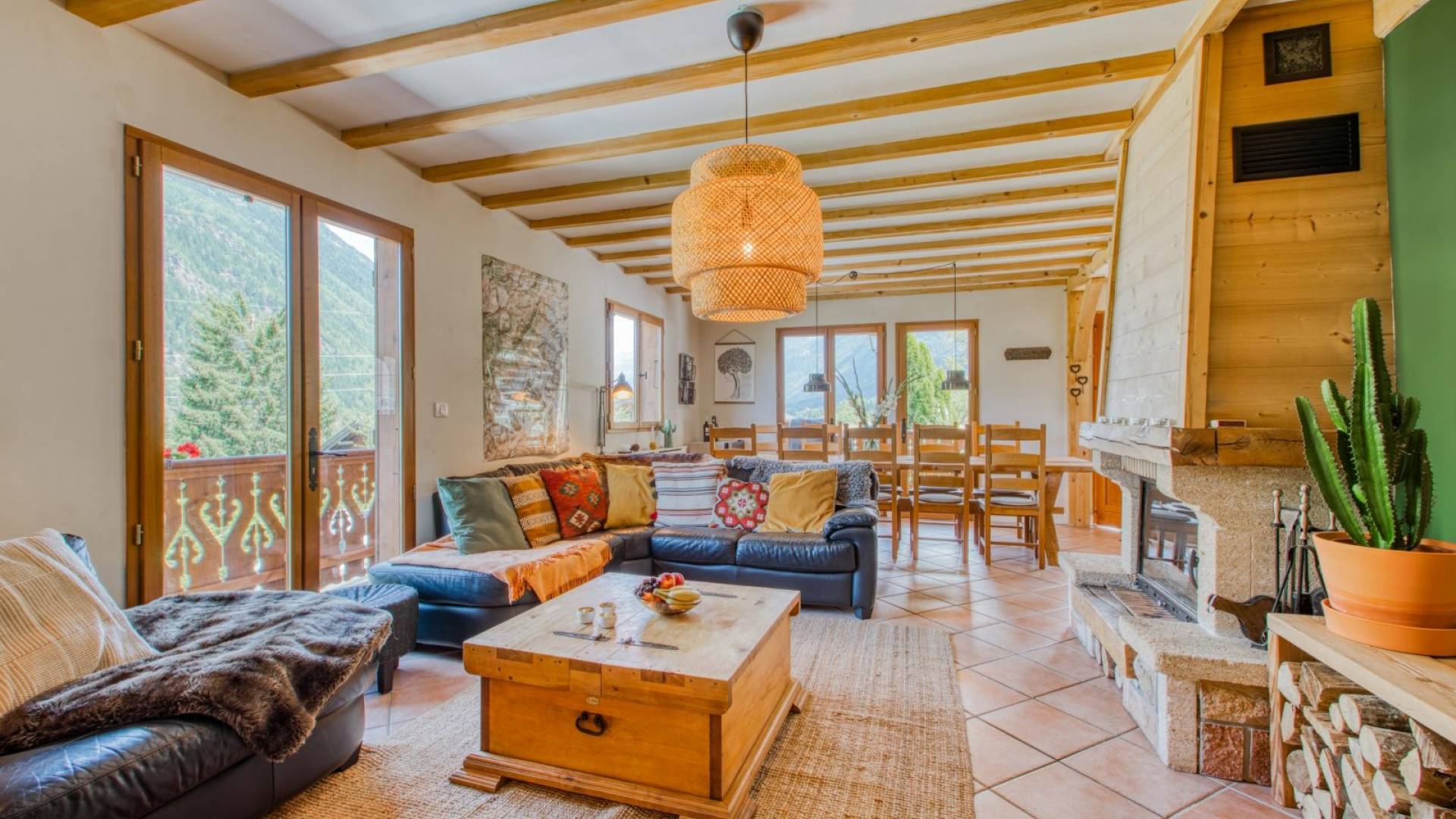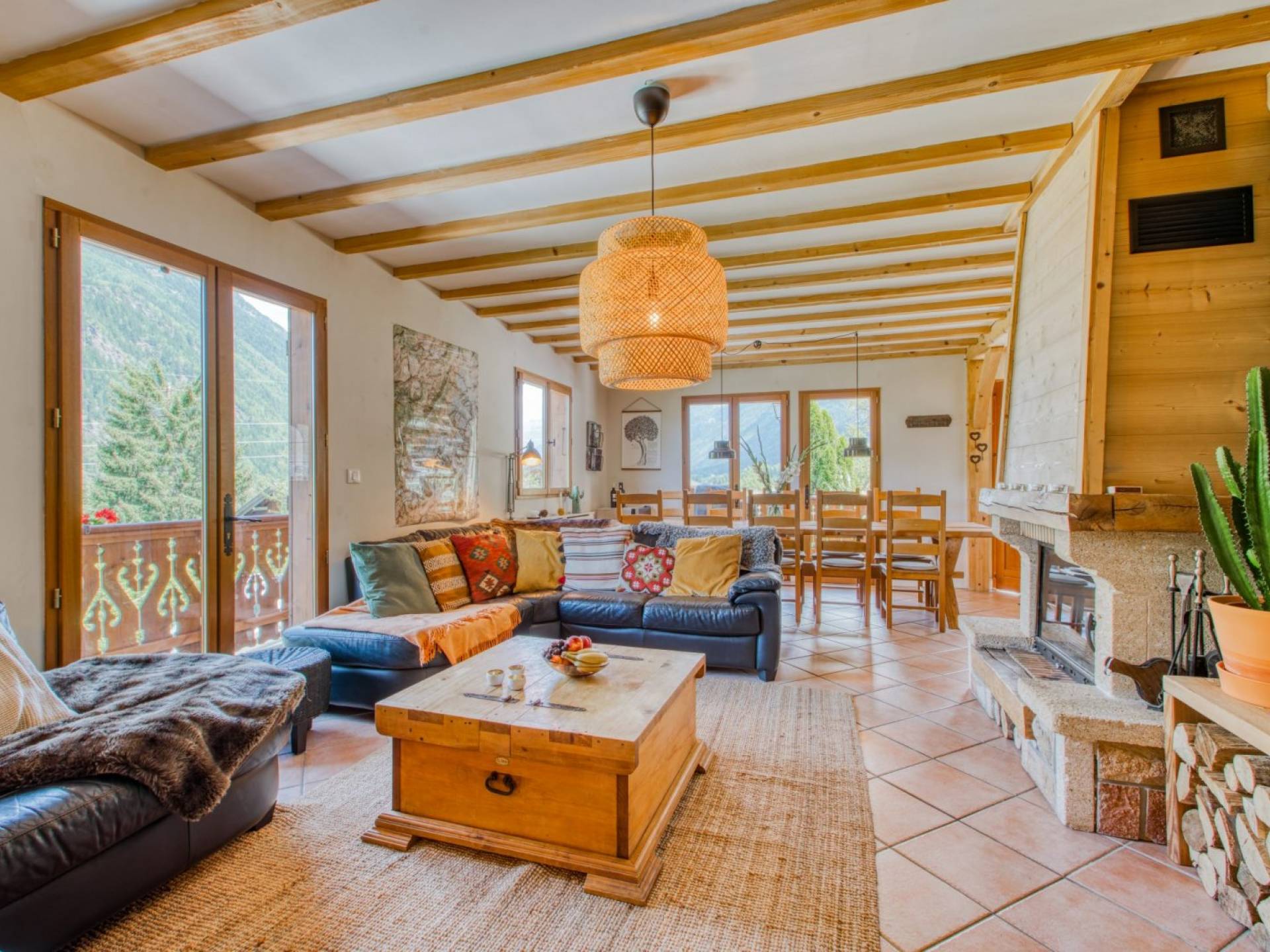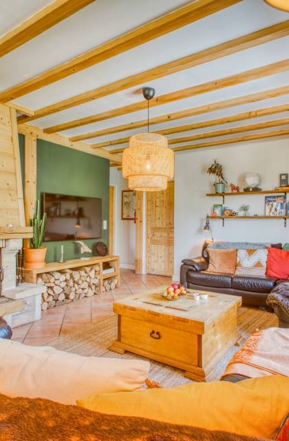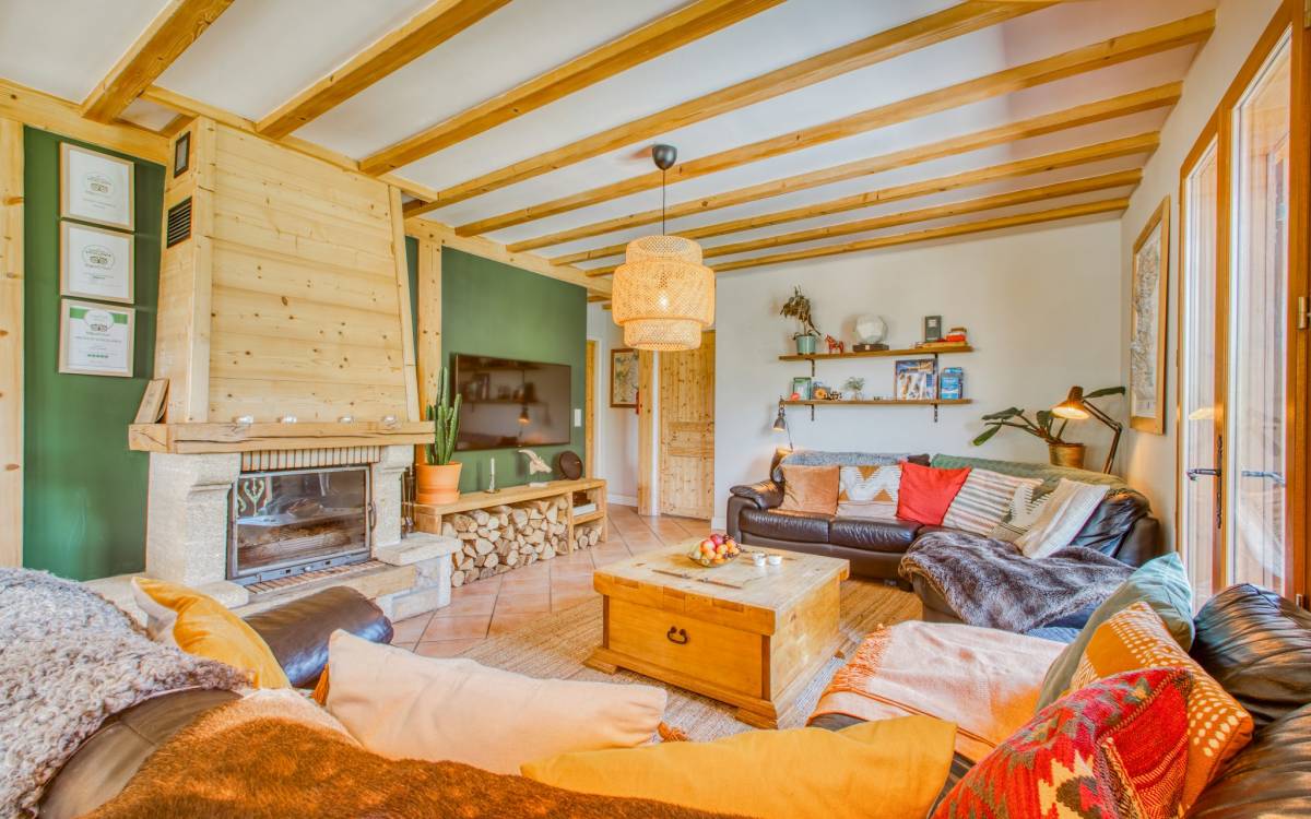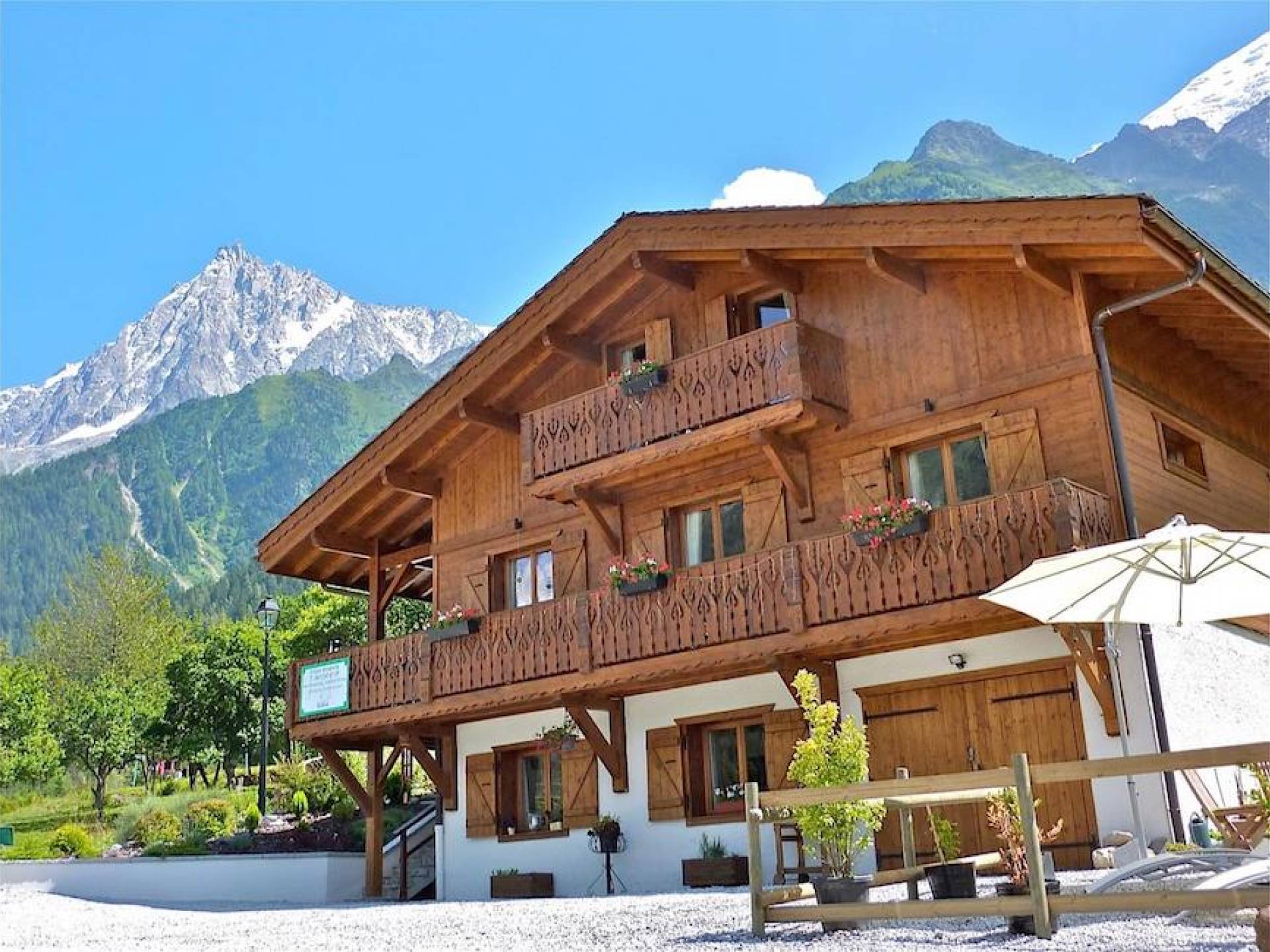 El alojamiento para invitados se distribuye en tres plantas con una amplia zona común, cocina abierta, salón y comedor. Las grandes ventanas del patio, los balcones y la terraza ofrecen vistas espectaculares de todo el macizo del Mont Blanc que se extiende a través del valle de Chamonix Mont-Blanc desde Les Houches hasta Le Tour, con vistas a Le Brévent, Les Grand Montets y la impresionante Aiguille du Midi. El chalet tiene capacidad para 12 huéspedes adultos cómodamente, más dependiendo de la dinámica del grupo.