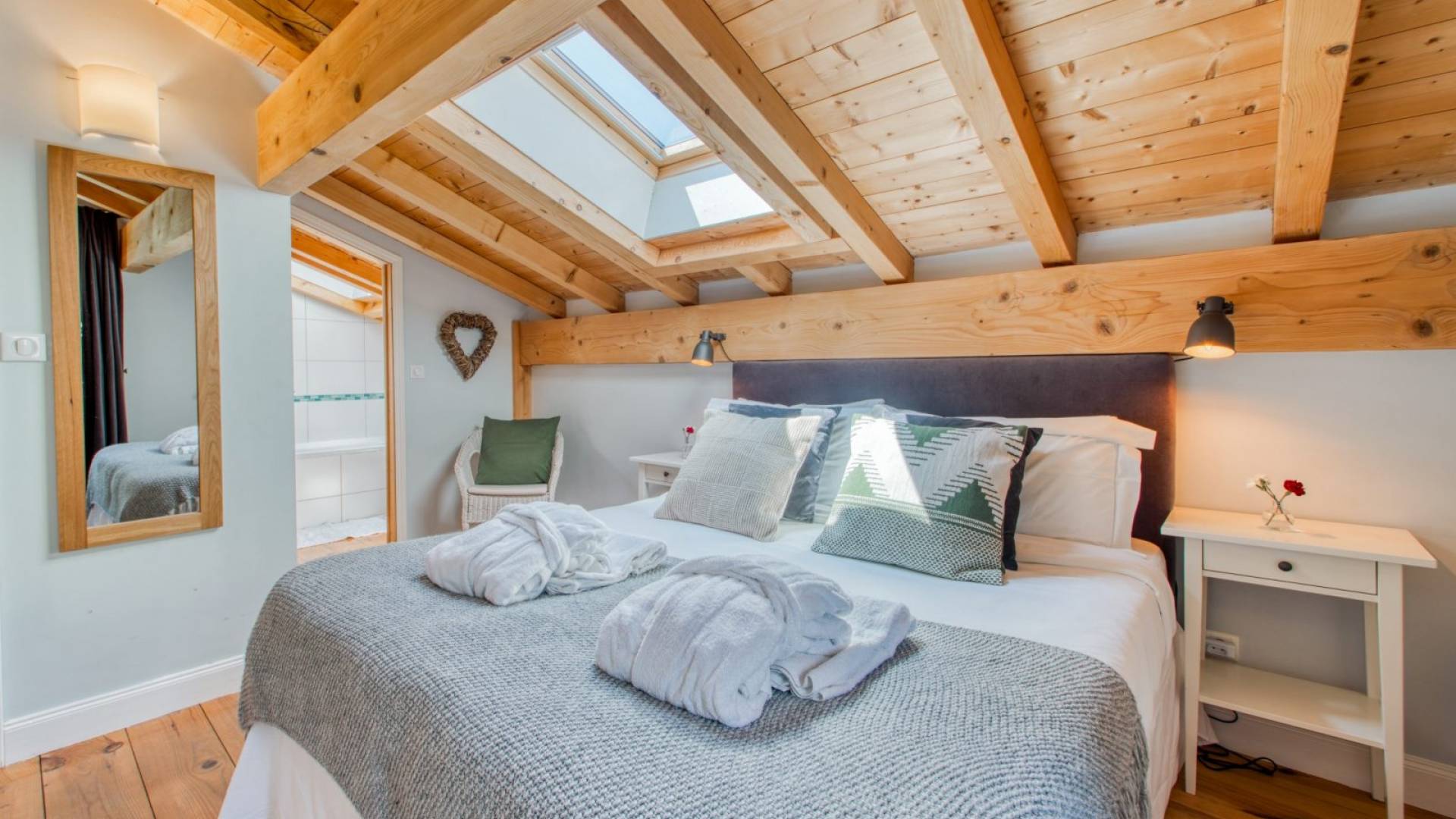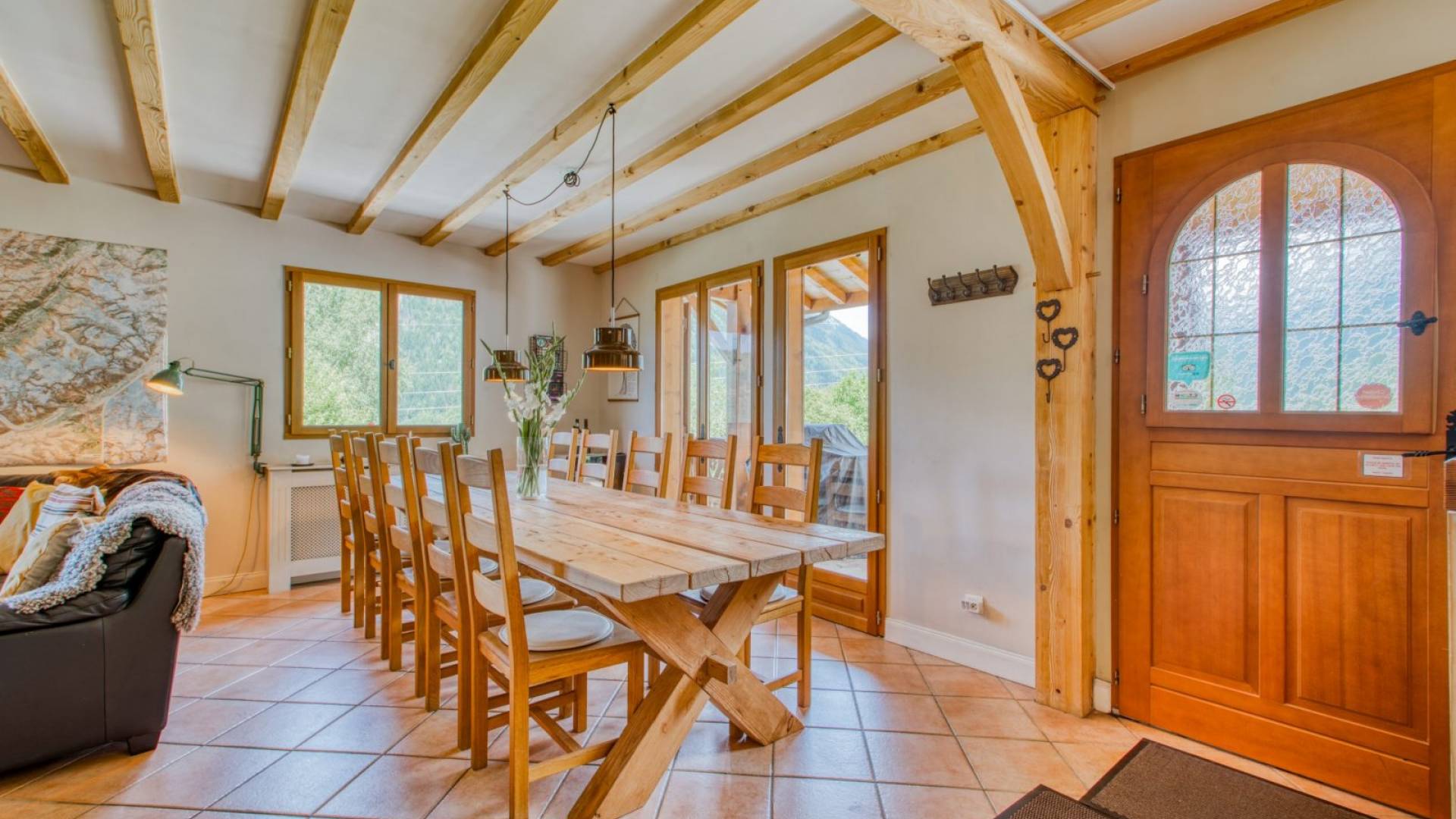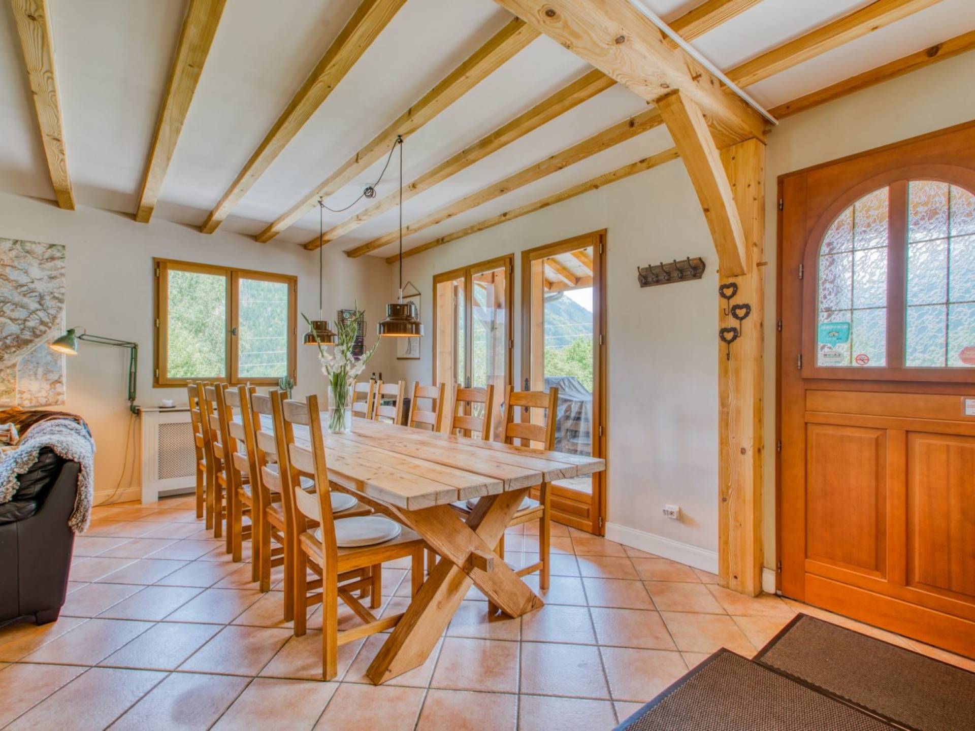 El alojamiento para invitados se distribuye en tres plantas con una amplia zona común, cocina abierta, salón y comedor. Las grandes ventanas del patio, los balcones y la terraza ofrecen vistas espectaculares de todo el macizo del Mont Blanc que se extiende a través del valle de Chamonix Mont-Blanc desde Les Houches hasta Le Tour, con vistas a Le Brévent, Les Grand Montets y la impresionante Aiguille du Midi. El chalet tiene capacidad para 12 huéspedes adultos cómodamente, más dependiendo de la dinámica del grupo.