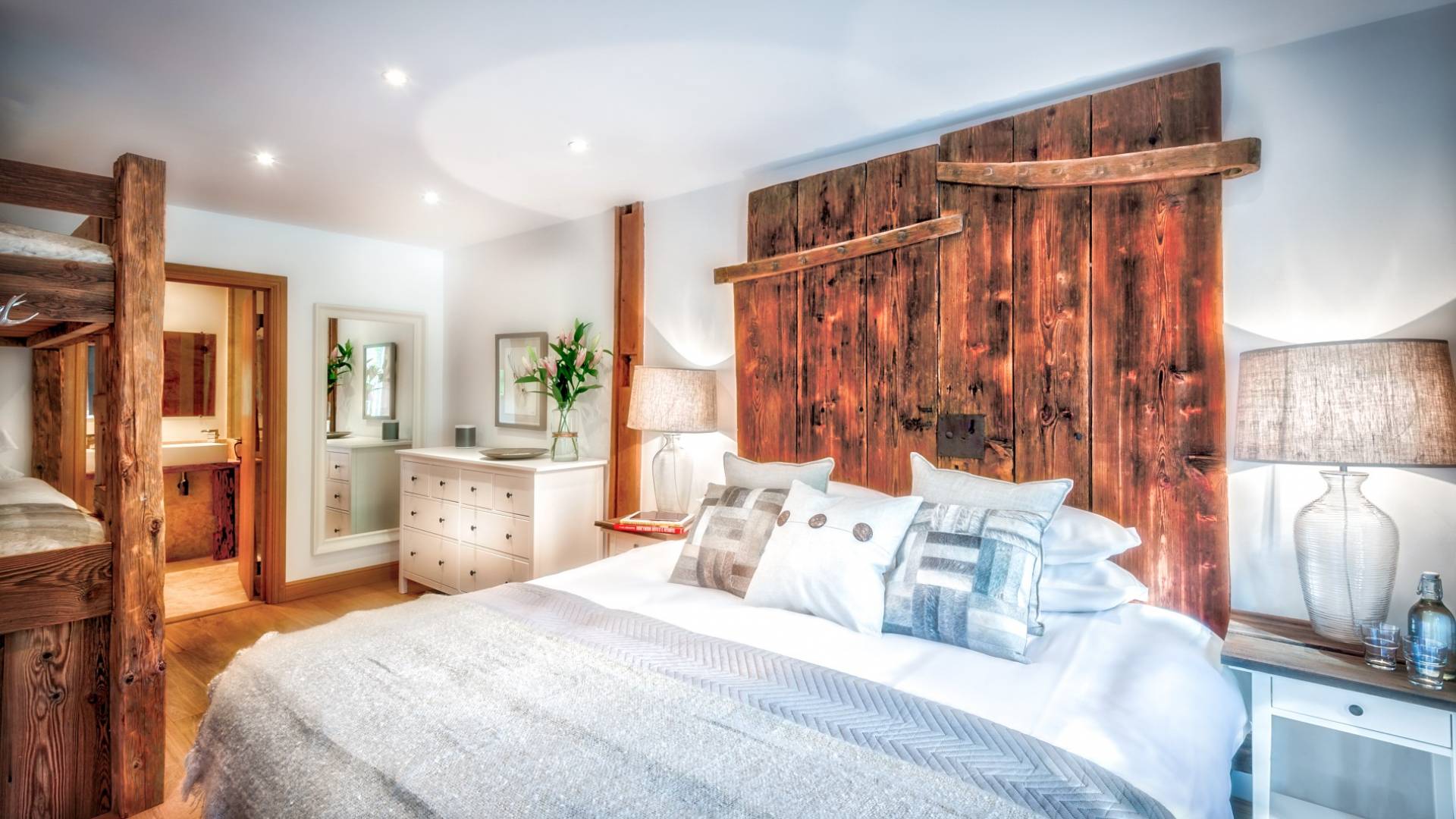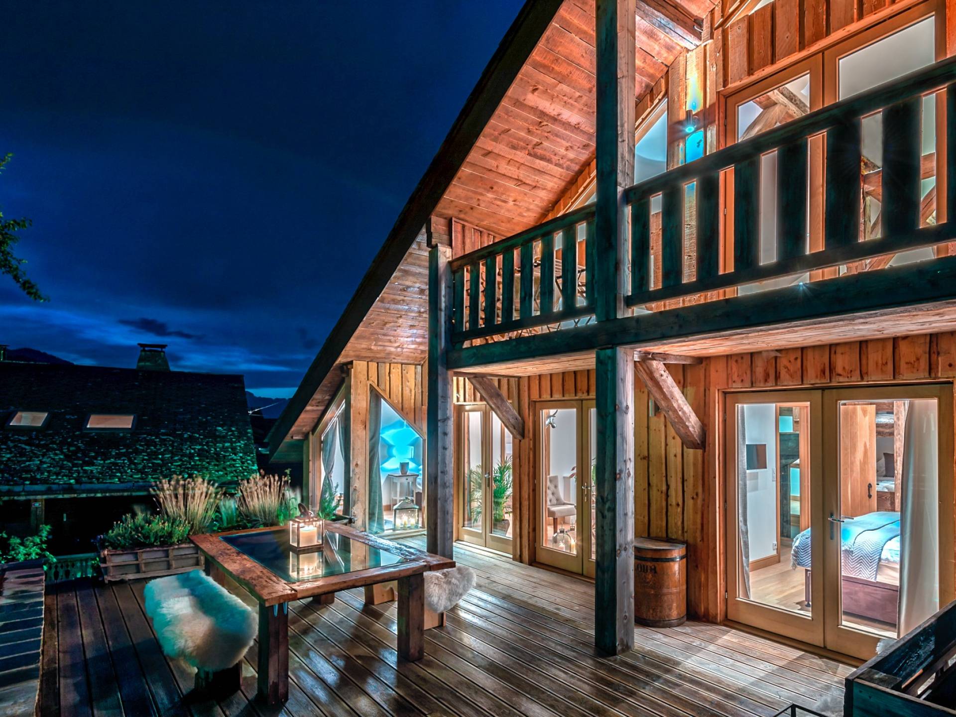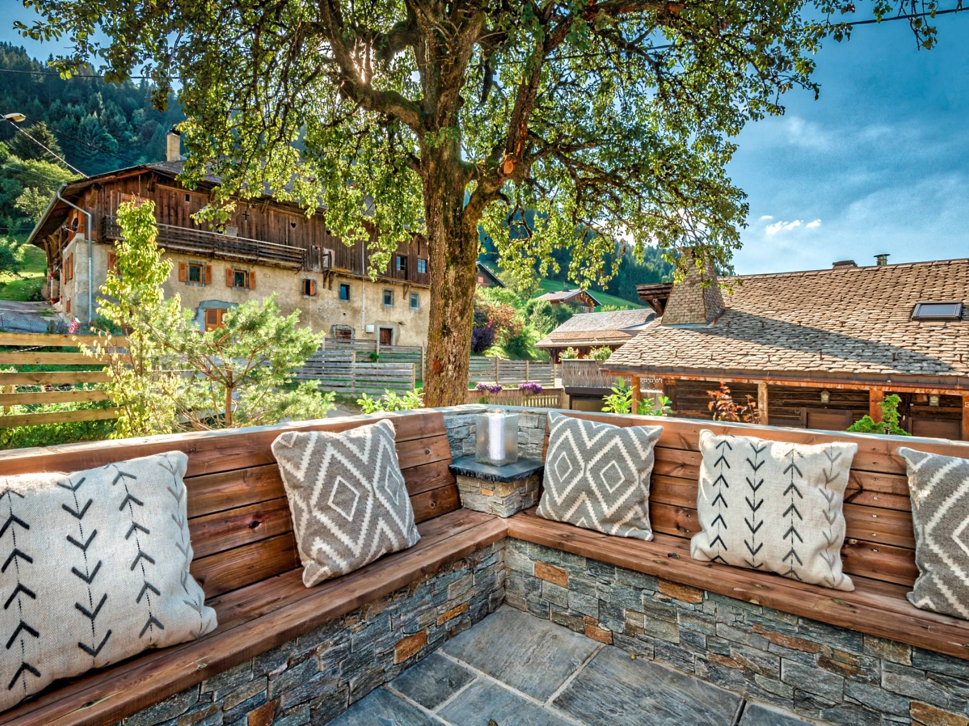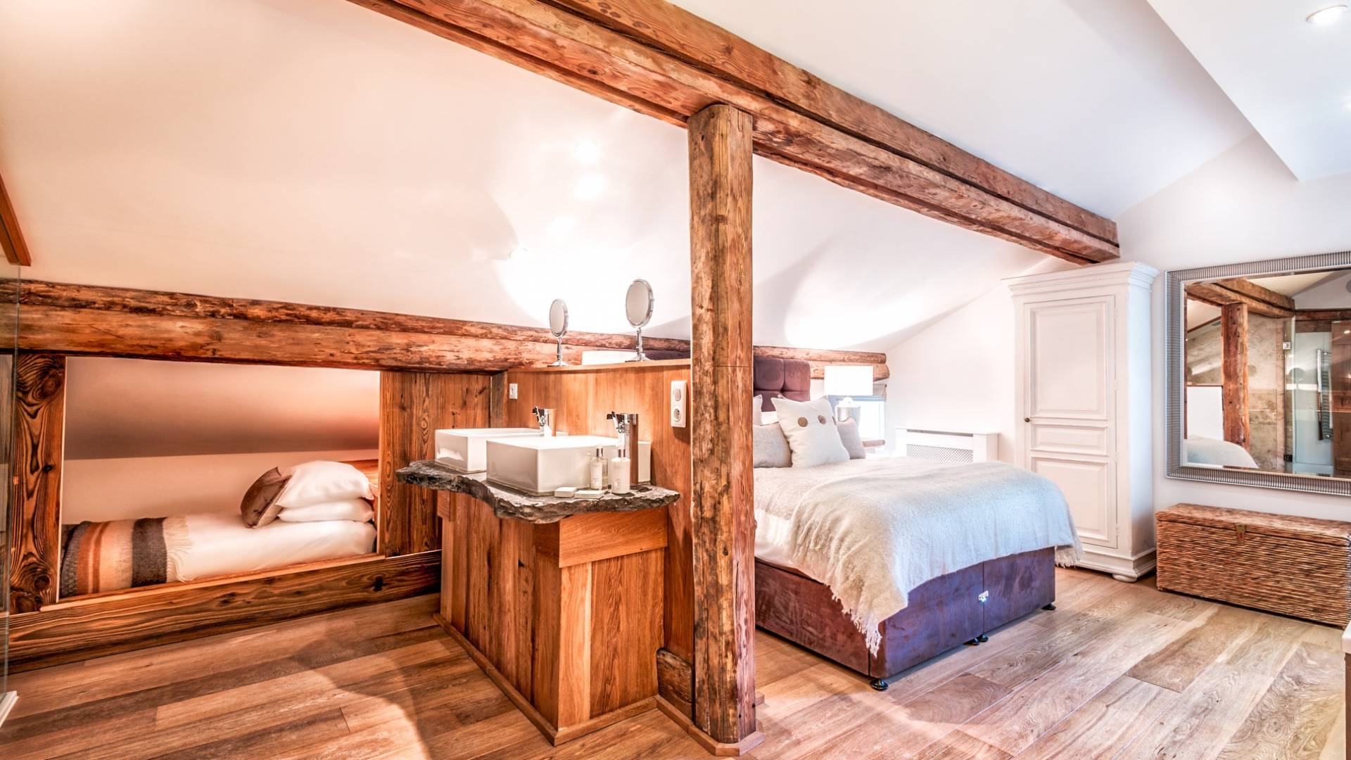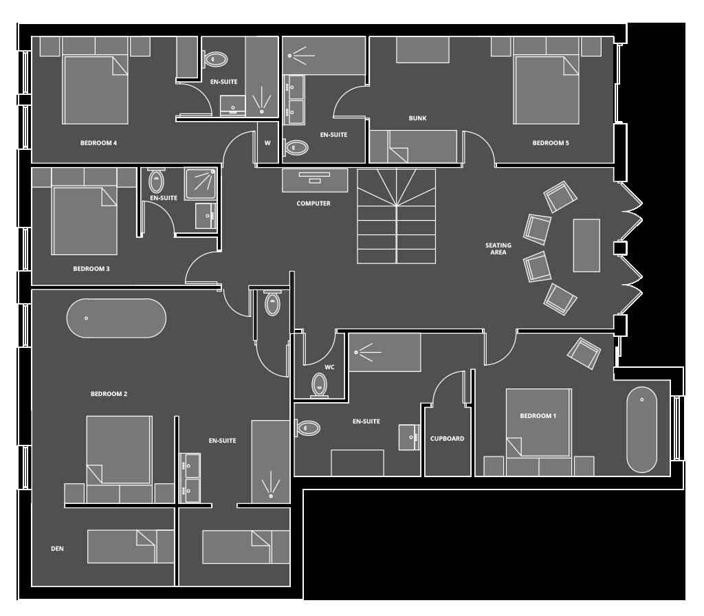 El nivel medio consta de cinco amplias habitaciones con baño que ofrecen el máximo confort con lujosos colchones y sábanas de algodón egipcio. En cada baño, encontrará artículos de tocador de lujo The White Company©, secadores de pelo profesionales y planchas para el cabello. También se proporcionan batas suaves, pantuflas y toallas mullidas. Este nivel tiene una zona de descanso adicional, que da acceso directo al jardín orientado al sur y a la gran terraza. La cubierta ha sido diseñada con la última experiencia de entretenimiento en mente y es una característica verdaderamente única en Morzine. Los huéspedes pueden disfrutar del aspecto soleado durante todo el día y la noche desde la gran bañera de hidromasaje, con una bebida fría en la mano del bar al aire libre. Las tumbonas brindan la experiencia de descanso perfecta, mientras que la hoguera hecha a medida y los sofás circundantes le permiten disfrutar de las estrellas de la montaña y las noches frescas hasta bien entrada la noche. Se puede disfrutar de una cena en el jardín en invierno y verano con la opción de una barbacoa o una pizza al horno de piedra del horno de pizza servida por su chef en la gran mesa de comedor.