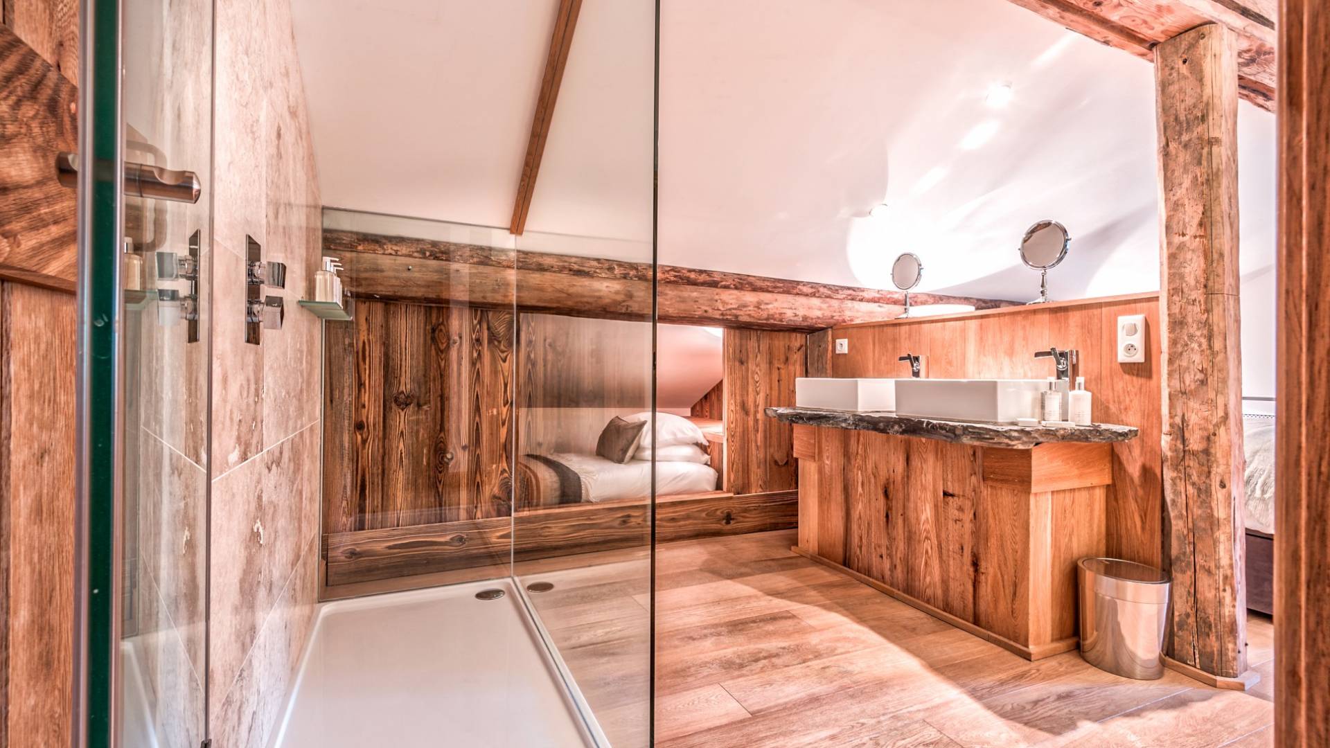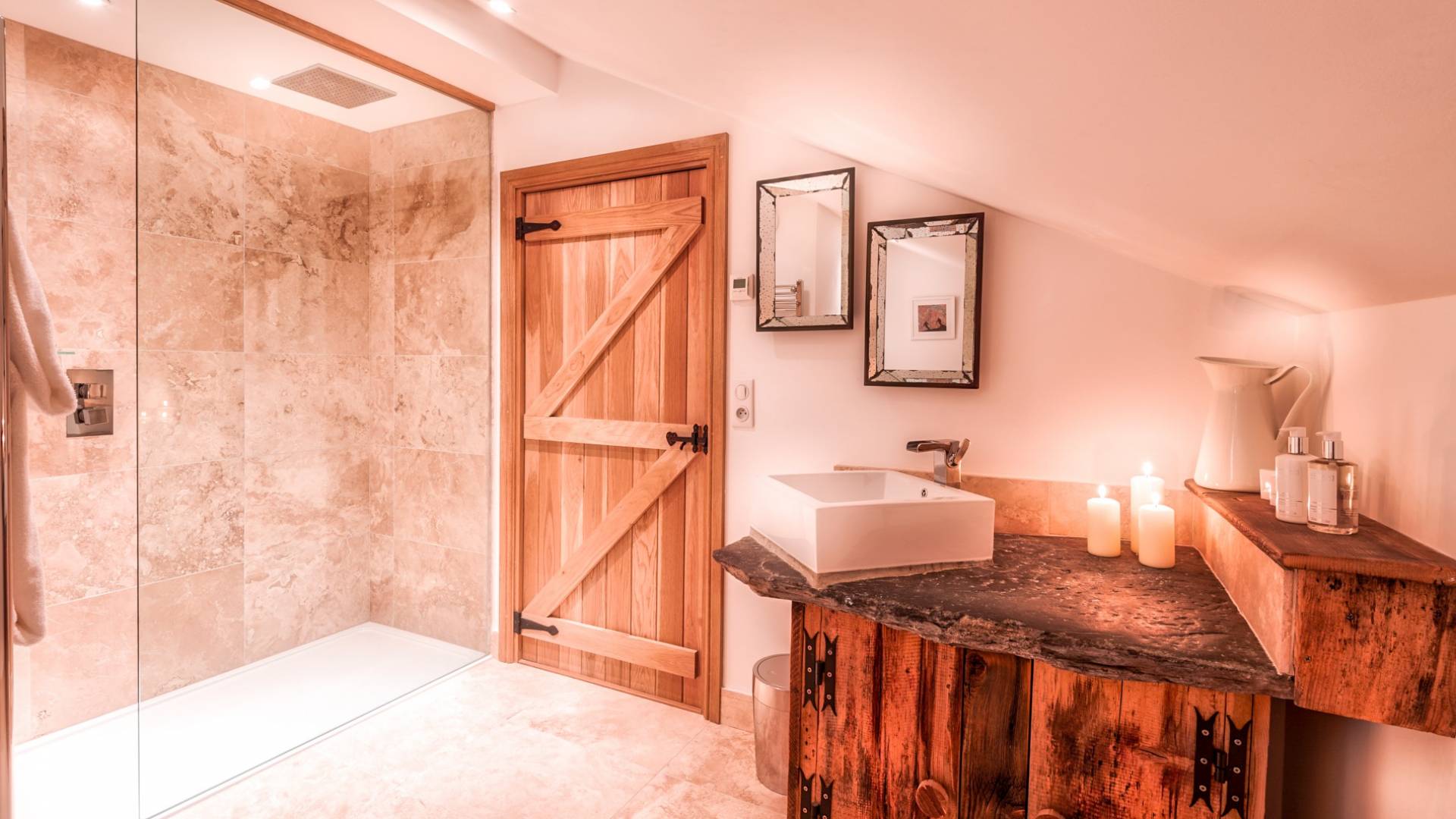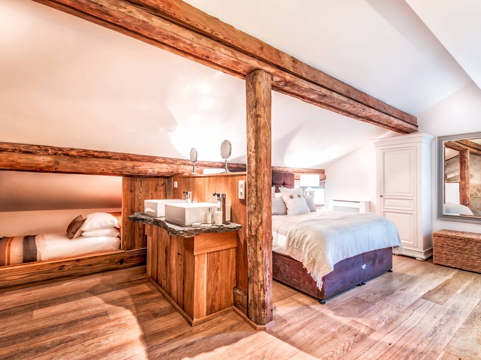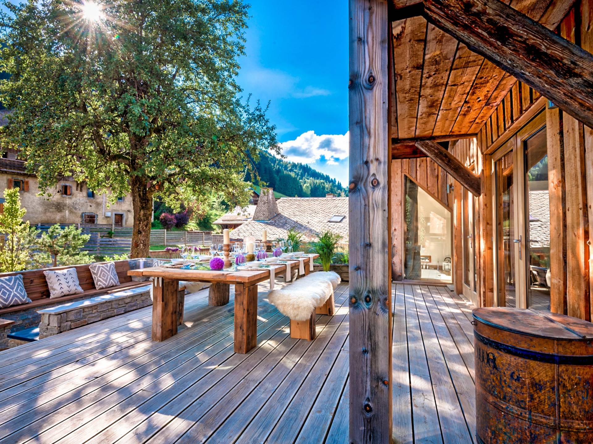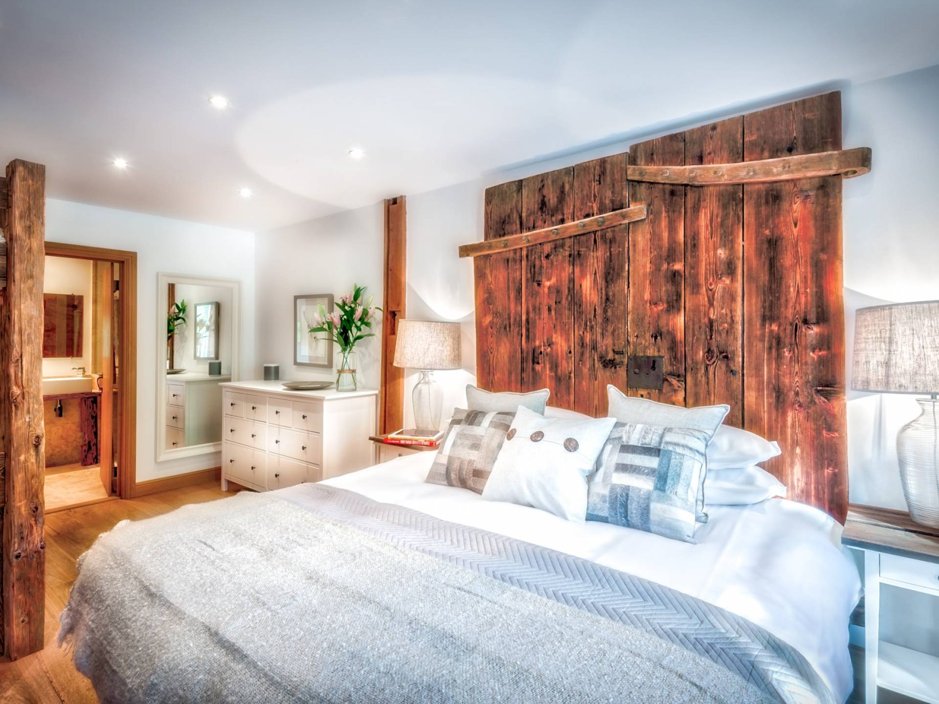 El nivel medio consta de cinco amplias habitaciones con baño que ofrecen el máximo confort con lujosos colchones y sábanas de algodón egipcio. En cada baño, encontrará artículos de tocador de lujo The White Company©, secadores de pelo profesionales y planchas para el cabello. También se proporcionan batas suaves, pantuflas y toallas mullidas. Este nivel tiene una zona de descanso adicional, que da acceso directo al jardín orientado al sur y a la gran terraza. La cubierta ha sido diseñada con la última experiencia de entretenimiento en mente y es una característica verdaderamente única en Morzine. Los huéspedes pueden disfrutar del aspecto soleado durante todo el día y la noche desde la gran bañera de hidromasaje, con una bebida fría en la mano del bar al aire libre. Las tumbonas brindan la experiencia de descanso perfecta, mientras que la hoguera hecha a medida y los sofás circundantes le permiten disfrutar de las estrellas de la montaña y las noches frescas hasta bien entrada la noche. Se puede disfrutar de una cena en el jardín en invierno y verano con la opción de una barbacoa o una pizza al horno de piedra del horno de pizza servida por su chef en la gran mesa de comedor.