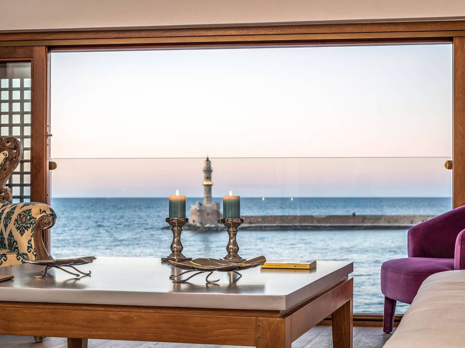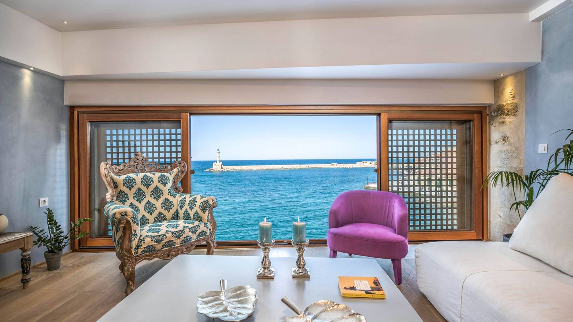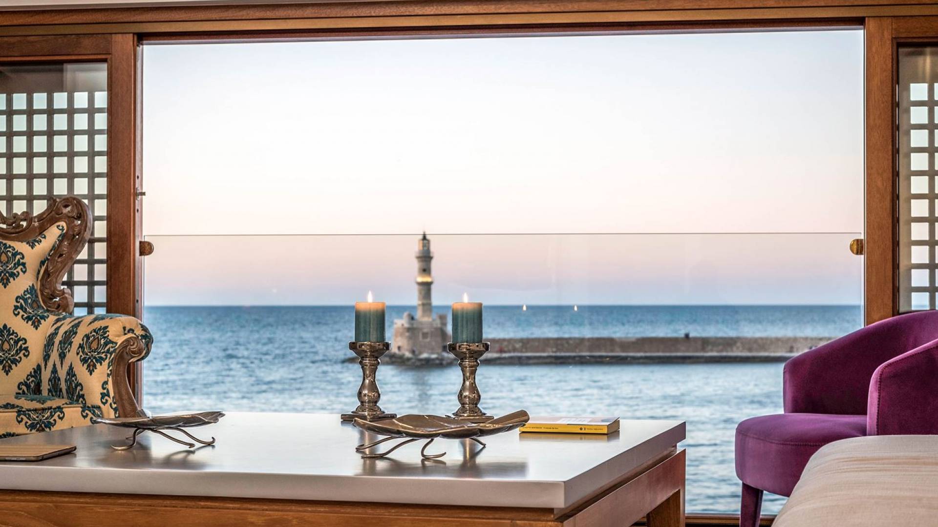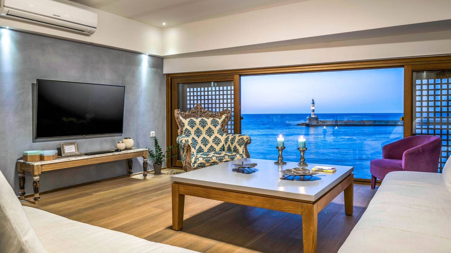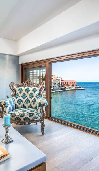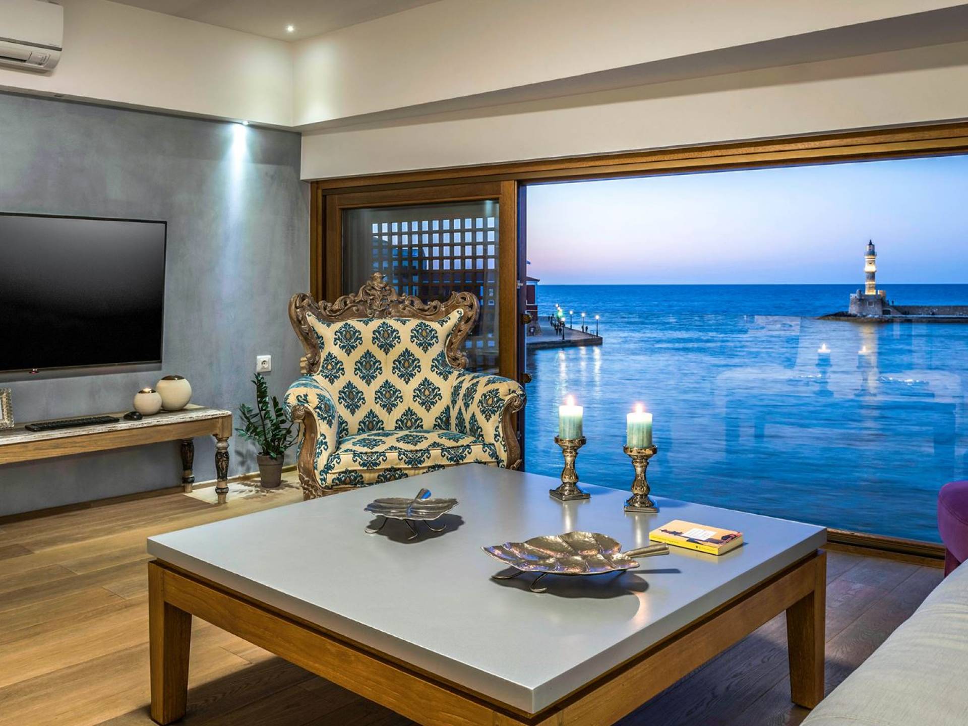 Consta de 4 elegantes y lujosas suites, todas con vistas espectaculares del faro egipcio y el antiguo puerto veneciano de Chania. Todas las suites están amuebladas con muebles especialmente diseñados y decoradas con artículos únicos. Ubicada en el tercer piso, esta suite de 90 m² consta de 2 habitaciones dobles, una amplia sala de estar y 2 baños. Las enormes ventanas ofrecen fantásticas vistas sobre el Puerto Viejo. Esta Suite puede acomodar hasta 4 personas.