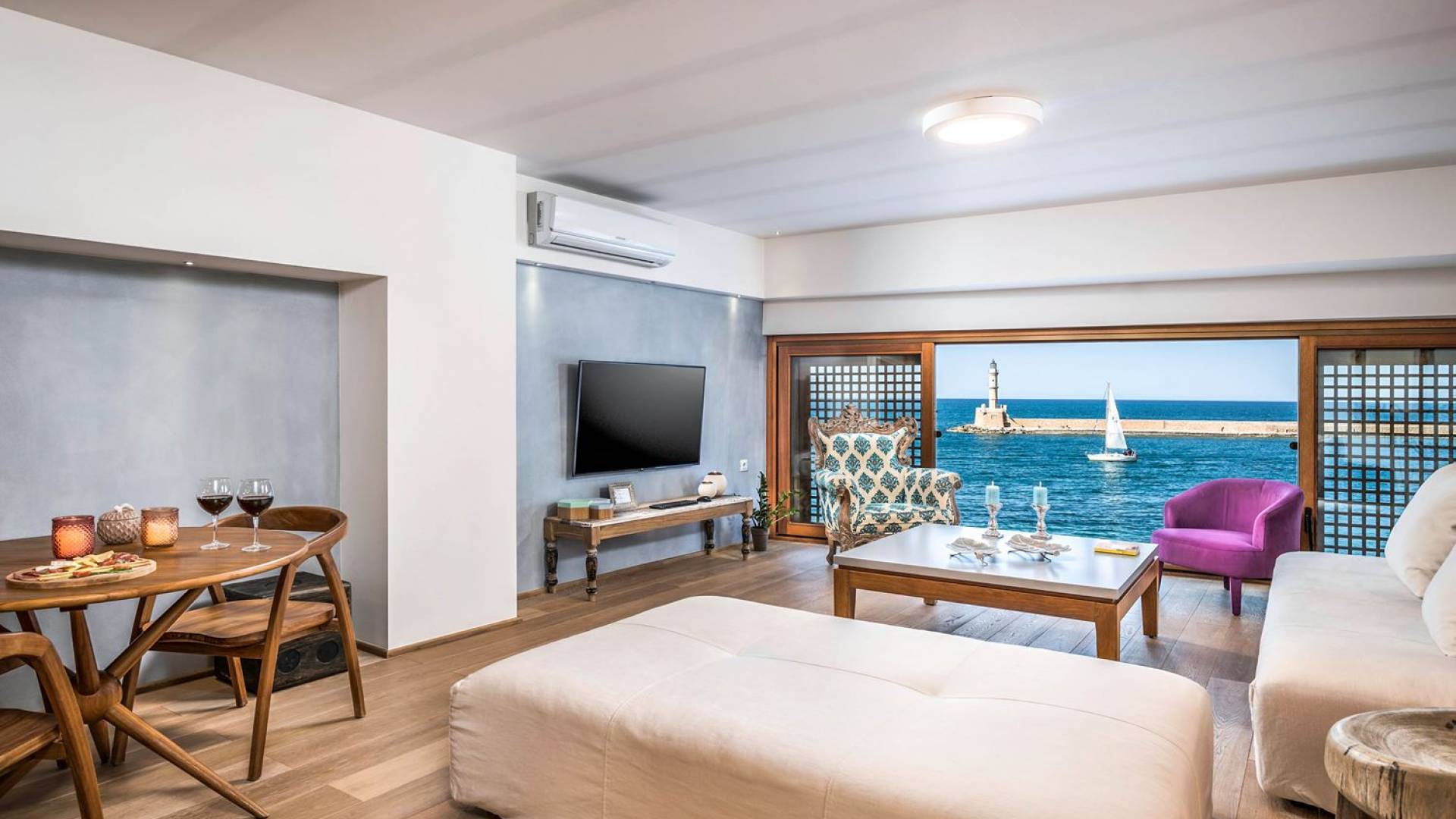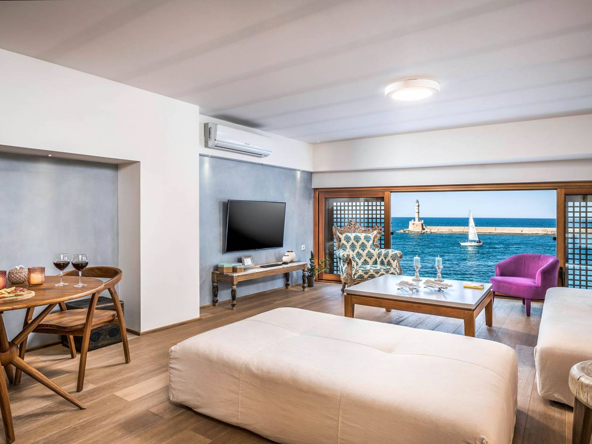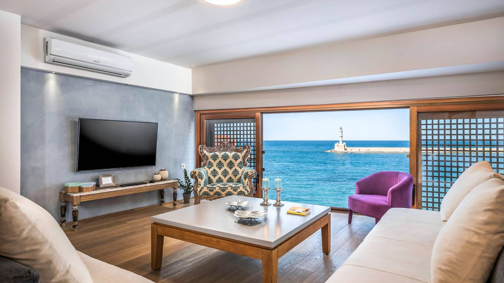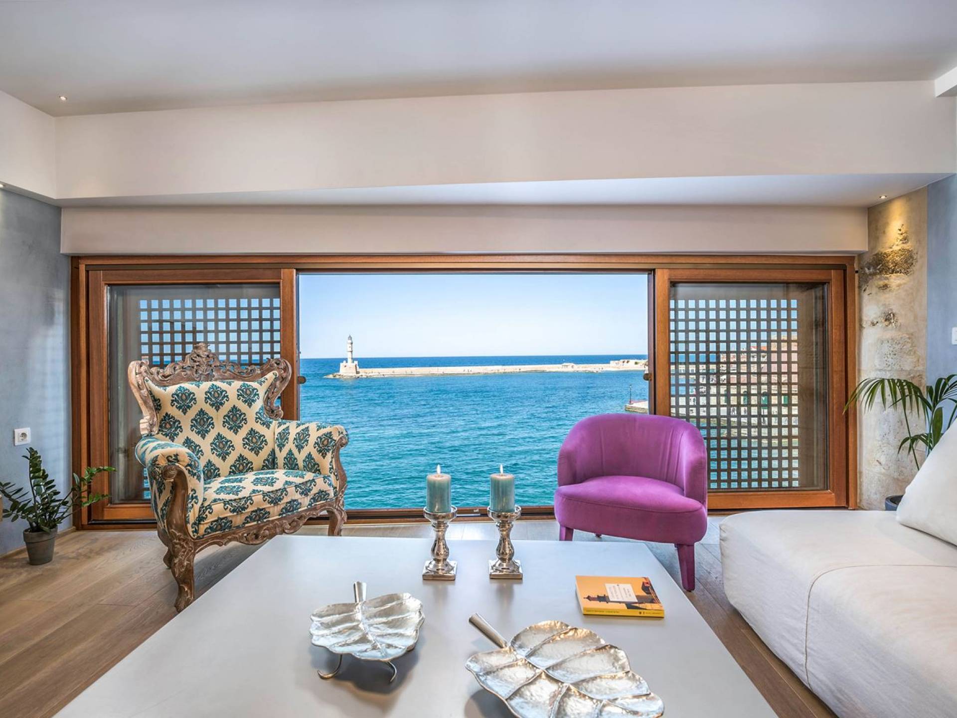 Consta de 4 elegantes y lujosas suites, todas con vistas espectaculares del faro egipcio y el antiguo puerto veneciano de Chania. Todas las suites están amuebladas con muebles especialmente diseñados y decoradas con artículos únicos. Ubicada en el tercer piso, esta suite de 90 m² consta de 2 habitaciones dobles, una amplia sala de estar y 2 baños. Las enormes ventanas ofrecen fantásticas vistas sobre el Puerto Viejo. Esta Suite puede acomodar hasta 4 personas.