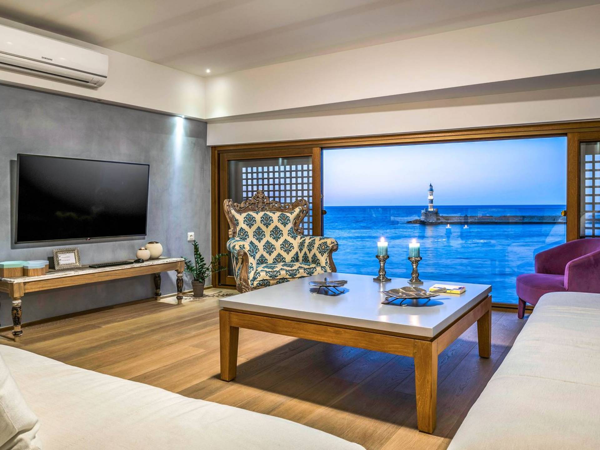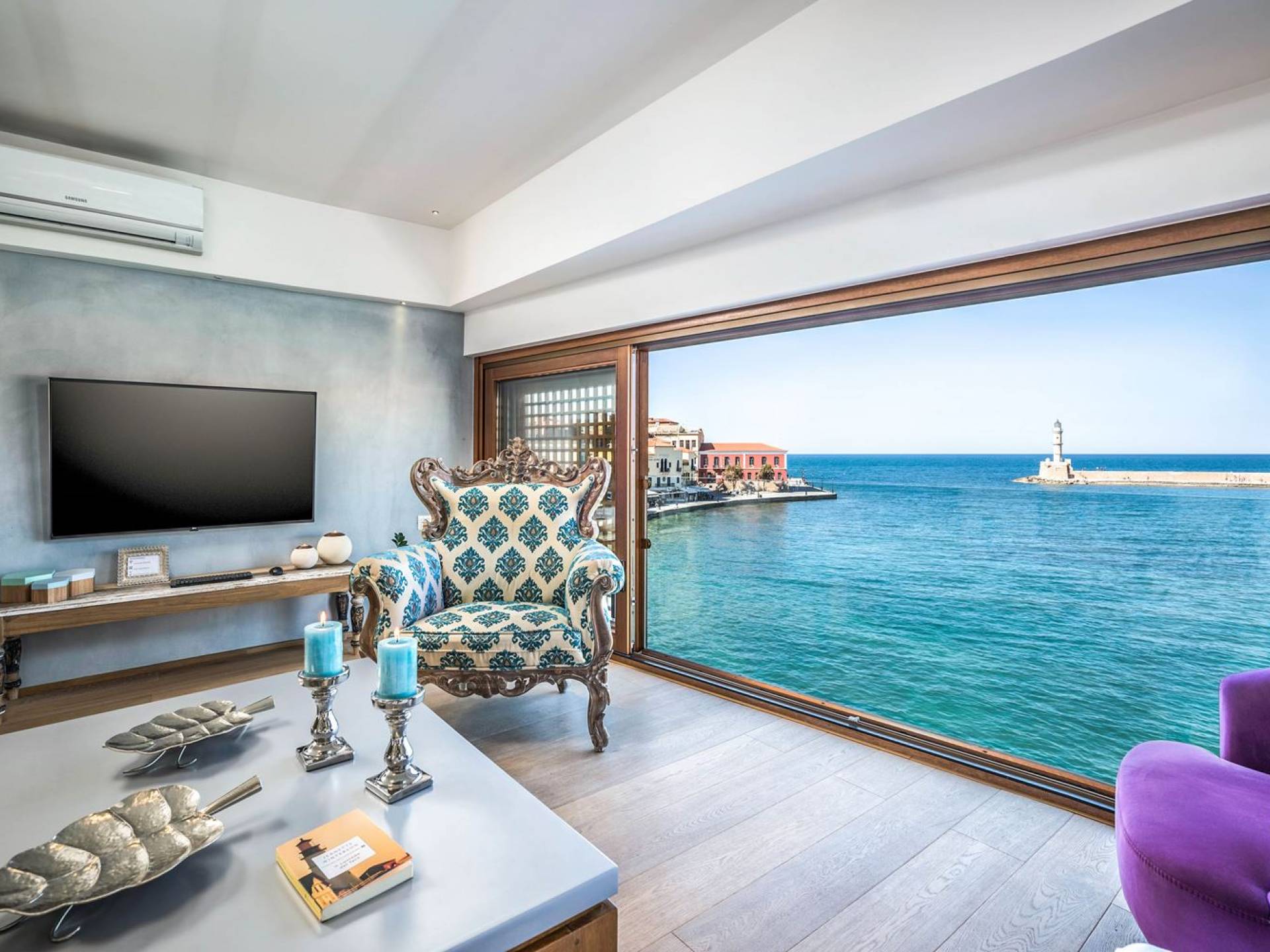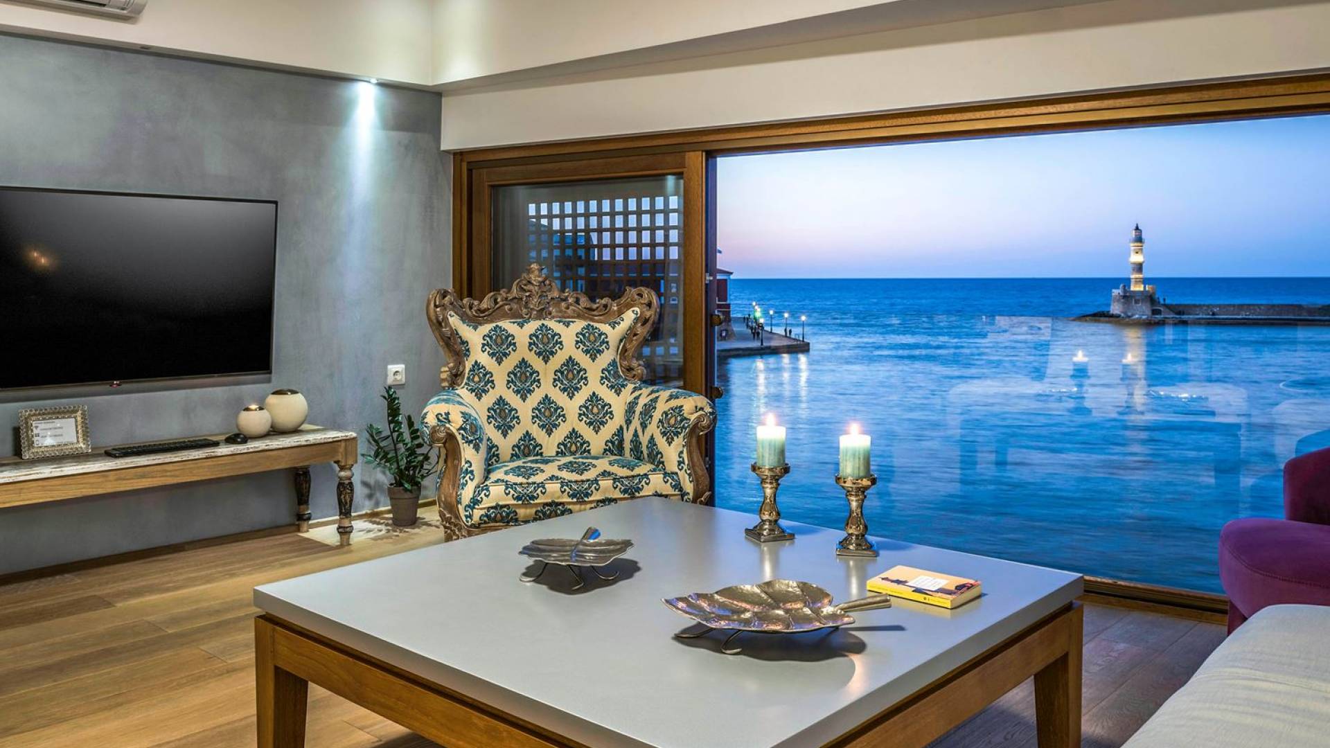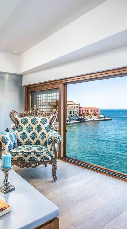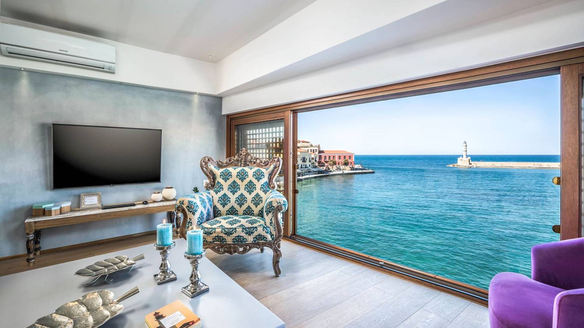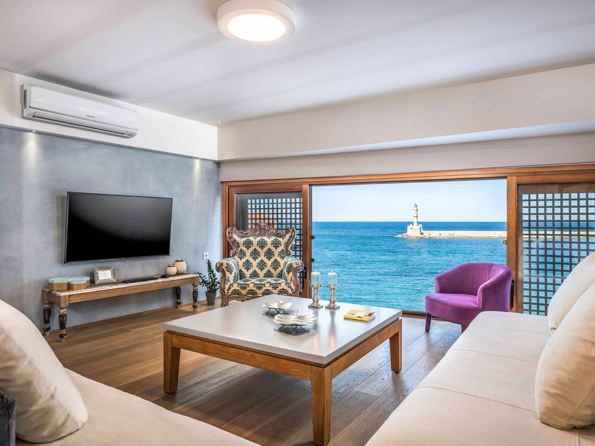 Consta de 4 elegantes y lujosas suites, todas con vistas espectaculares del faro egipcio y el antiguo puerto veneciano de Chania. Todas las suites están amuebladas con muebles especialmente diseñados y decoradas con artículos únicos. Ubicada en el tercer piso, esta suite de 90 m² consta de 2 habitaciones dobles, una amplia sala de estar y 2 baños. Las enormes ventanas ofrecen fantásticas vistas sobre el Puerto Viejo. Esta Suite puede acomodar hasta 4 personas.