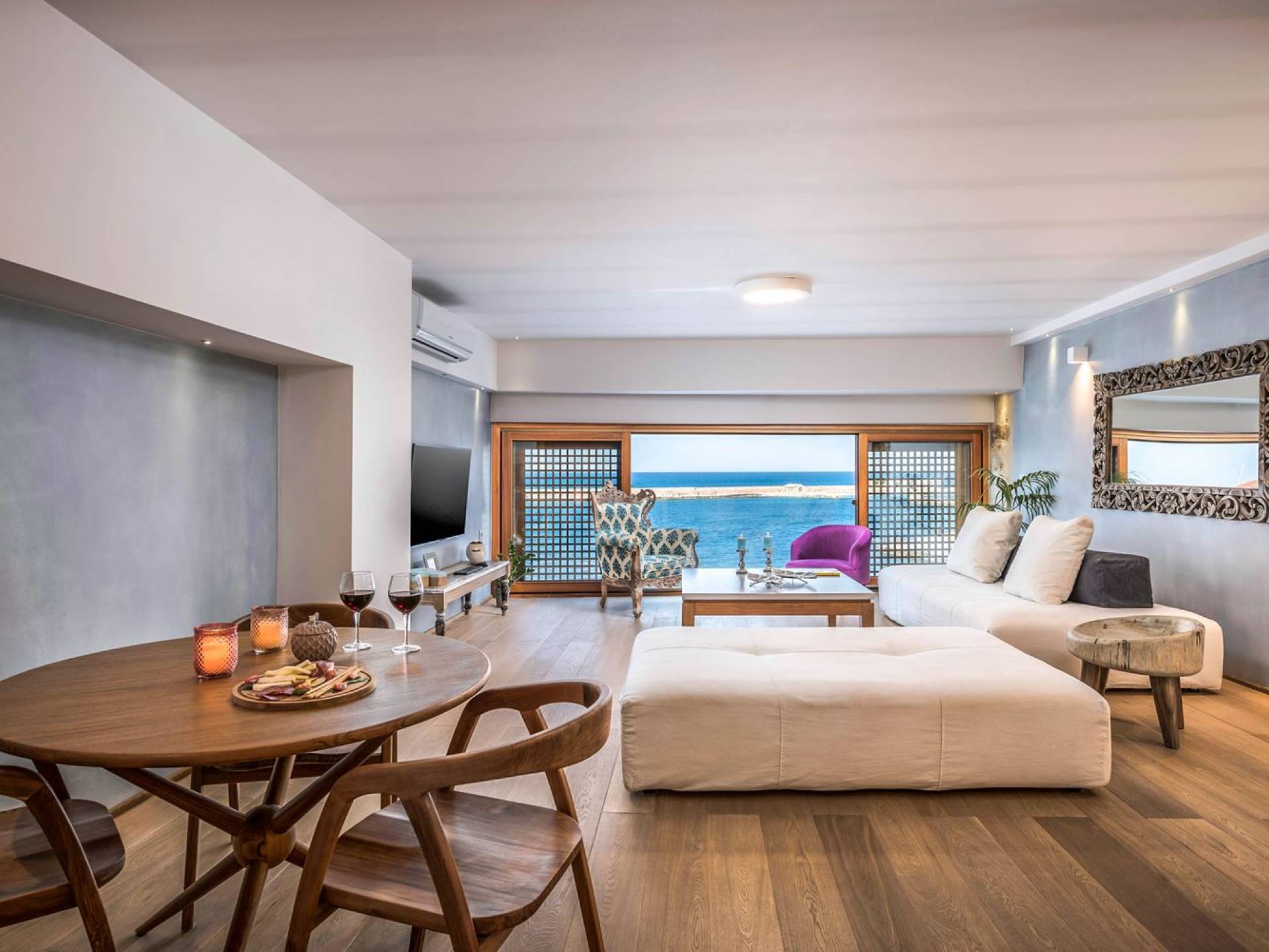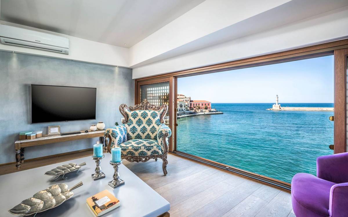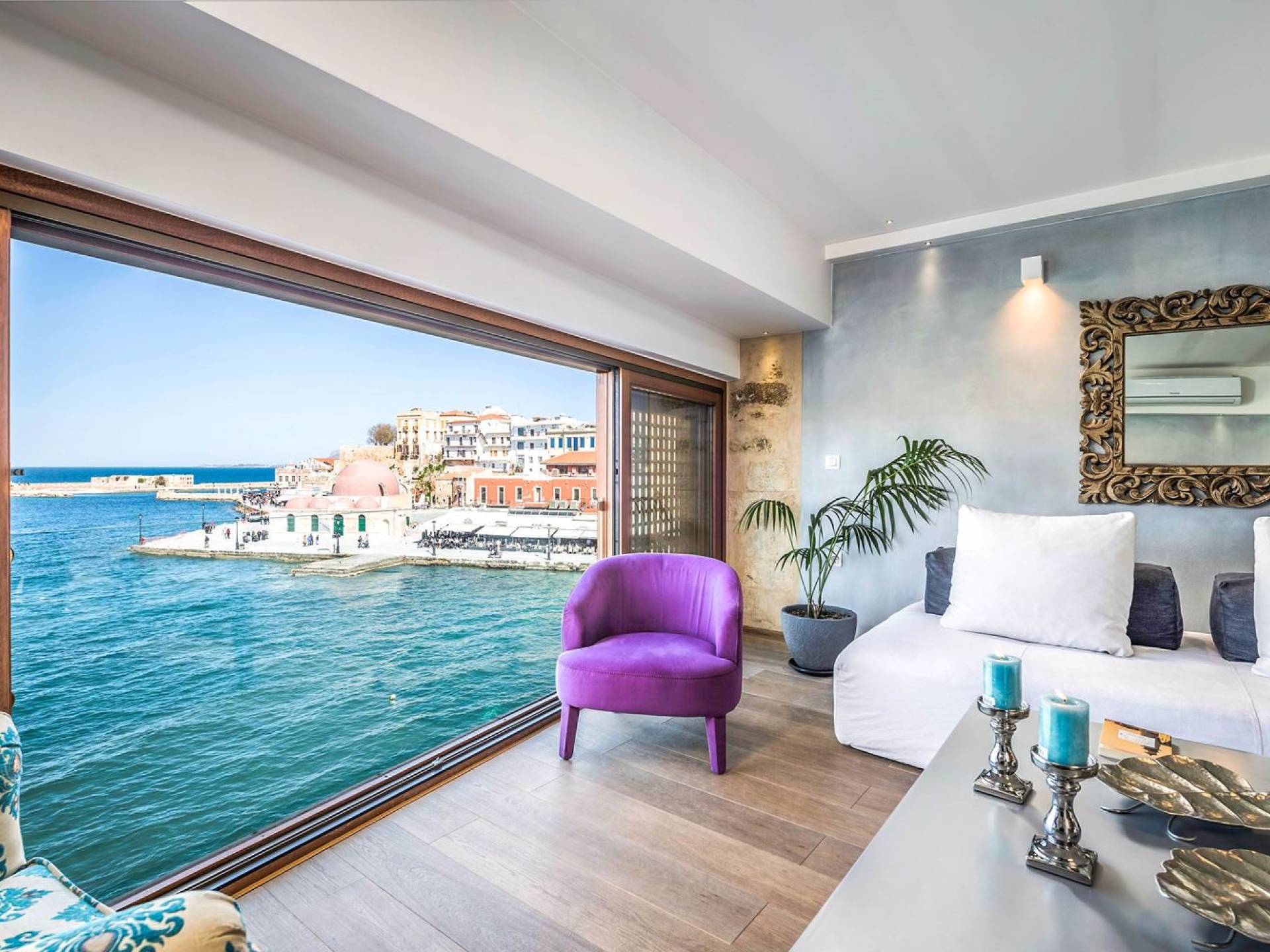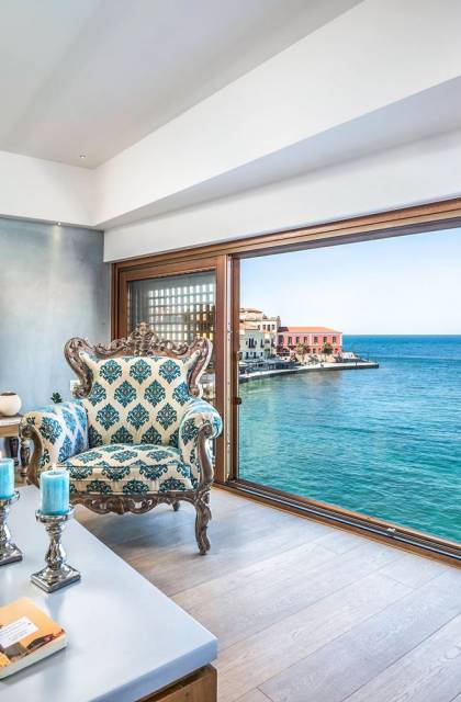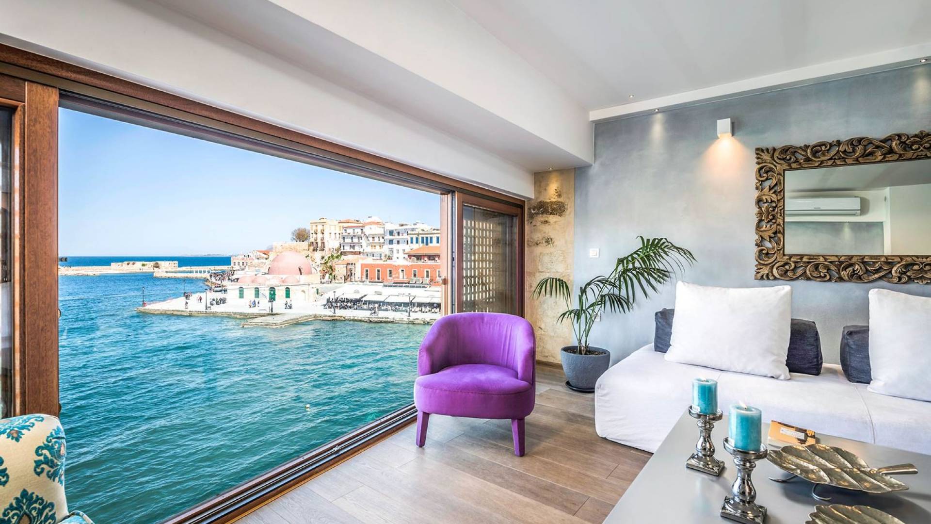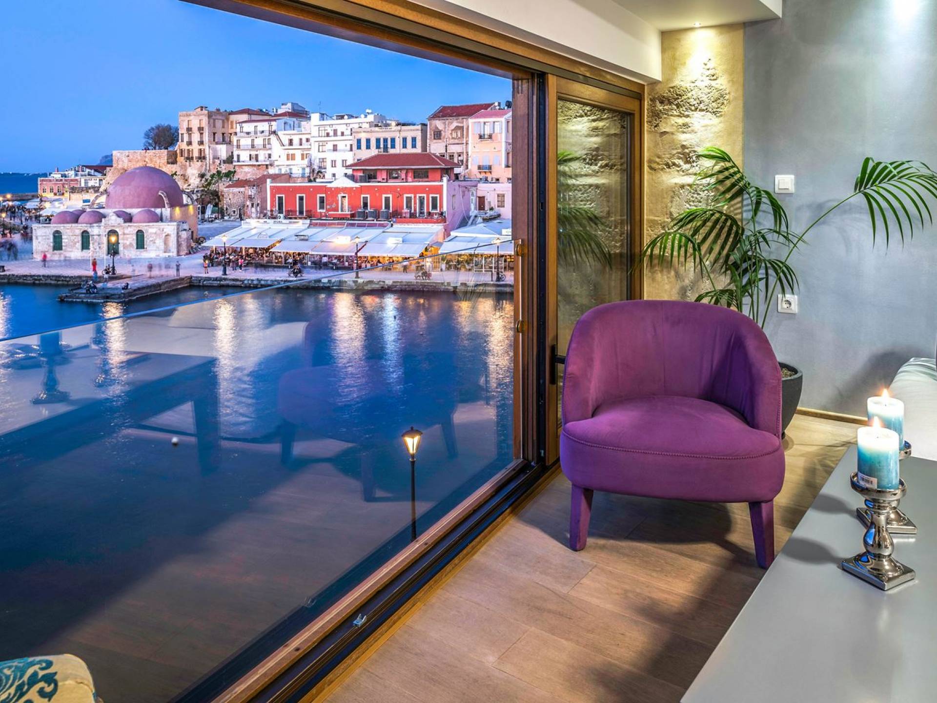 Consta de 4 elegantes y lujosas suites, todas con vistas espectaculares del faro egipcio y el antiguo puerto veneciano de Chania. Todas las suites están amuebladas con muebles especialmente diseñados y decoradas con artículos únicos. Ubicada en el tercer piso, esta suite de 90 m² consta de 2 habitaciones dobles, una amplia sala de estar y 2 baños. Las enormes ventanas ofrecen fantásticas vistas sobre el Puerto Viejo. Esta Suite puede acomodar hasta 4 personas.