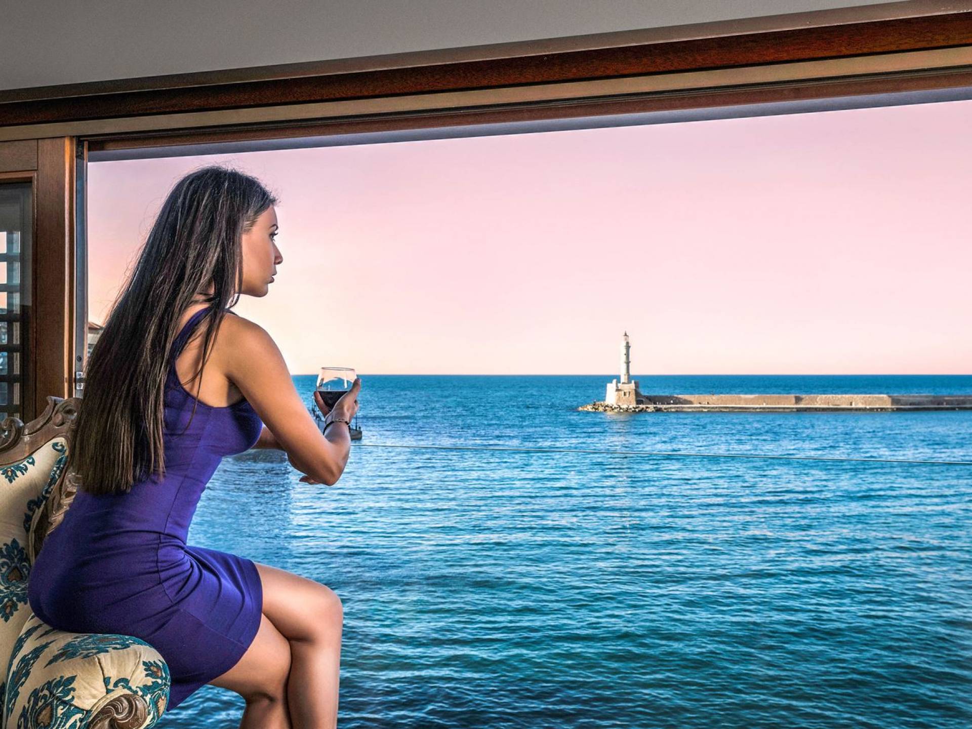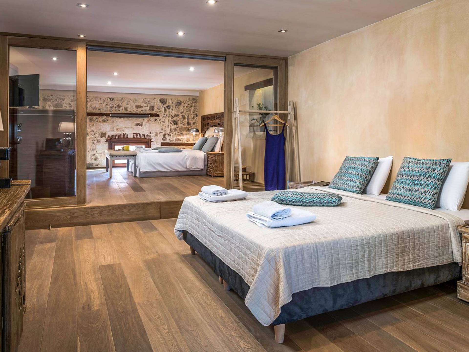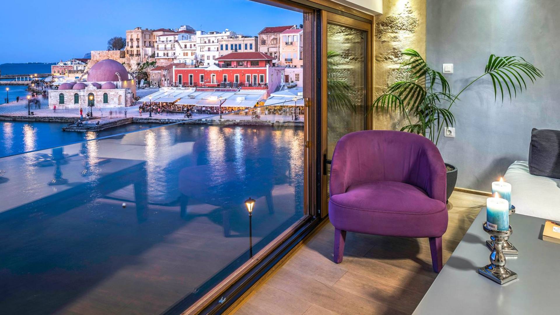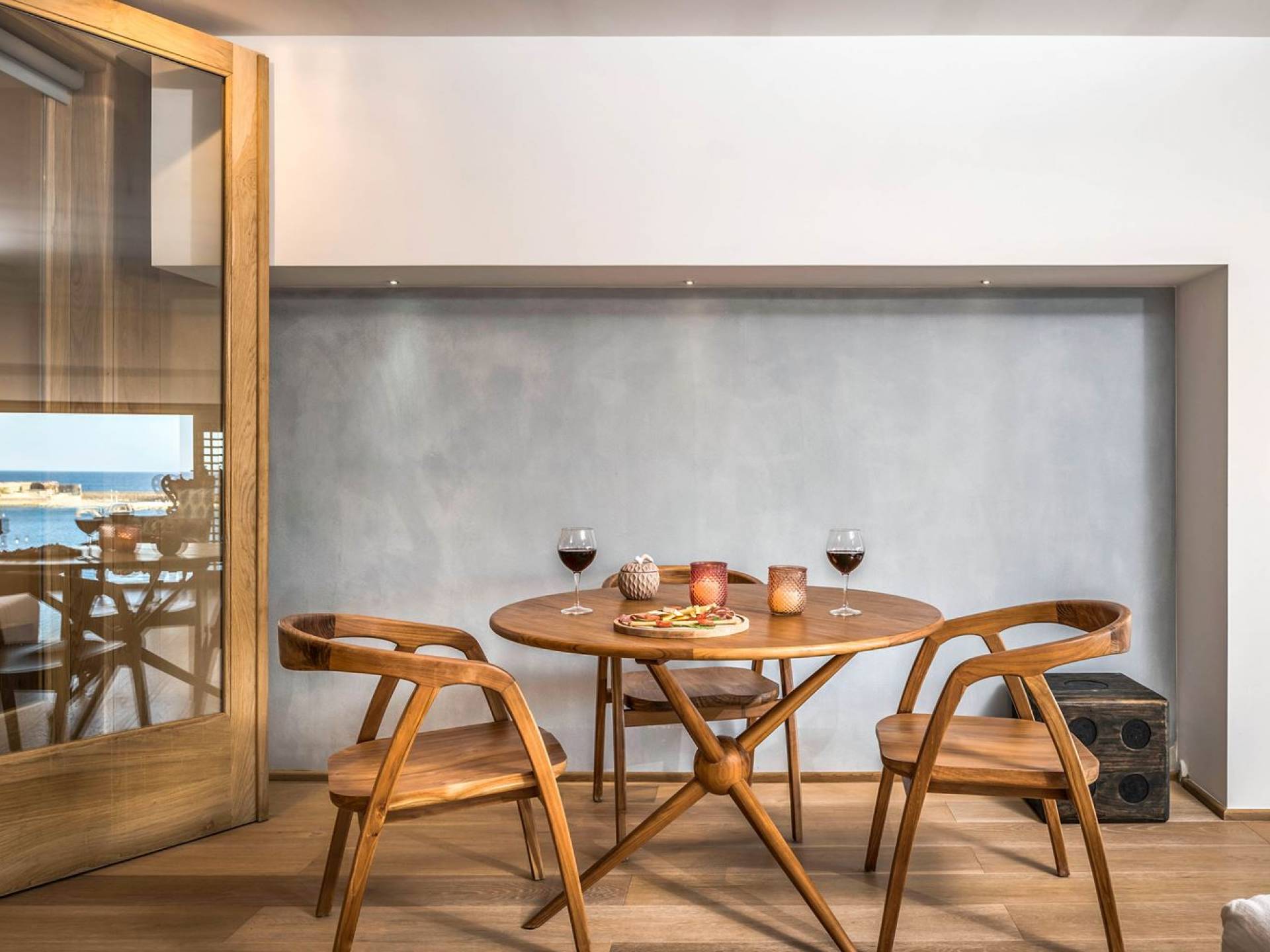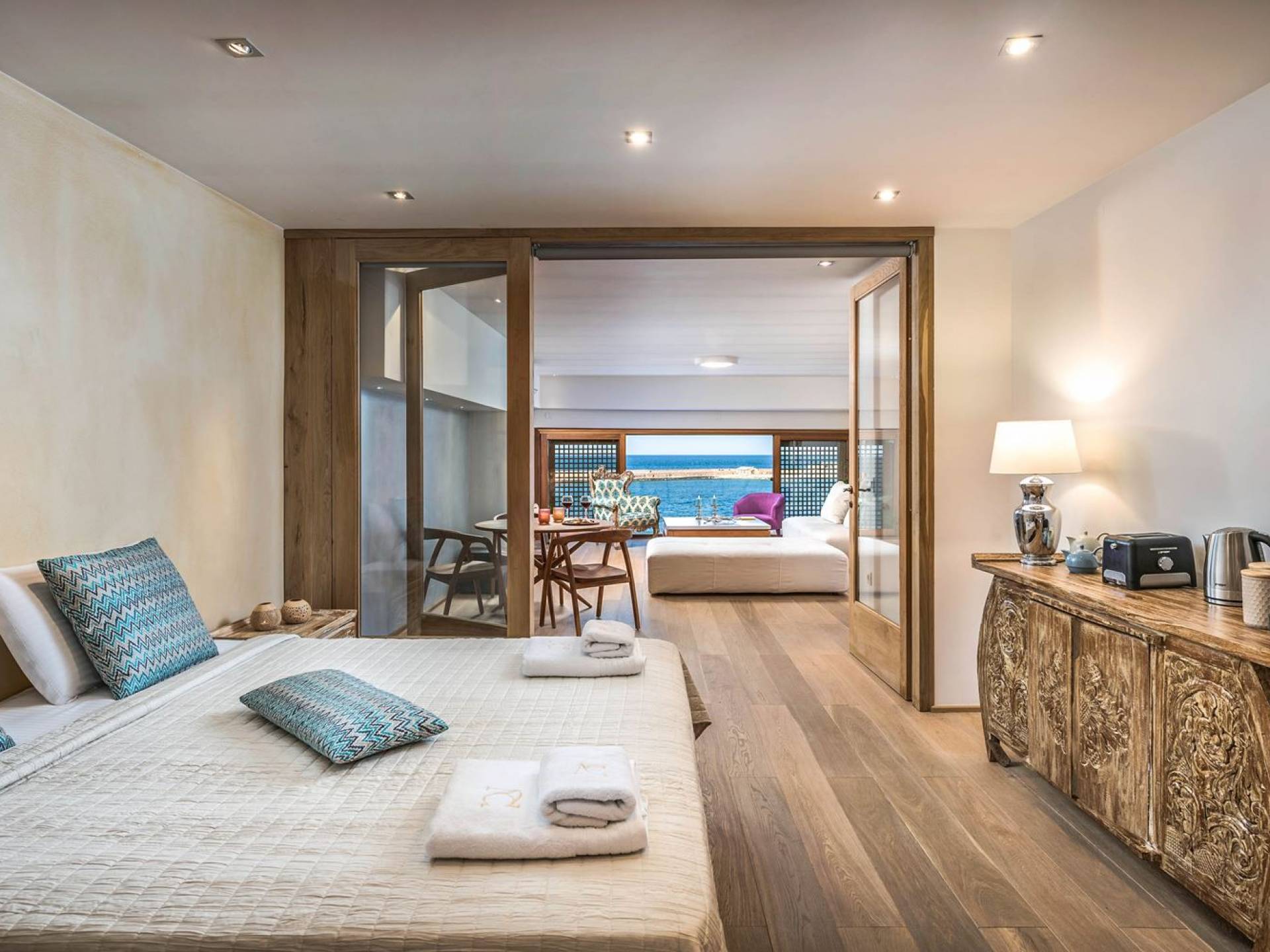 Consta de 4 elegantes y lujosas suites, todas con vistas espectaculares del faro egipcio y el antiguo puerto veneciano de Chania. Todas las suites están amuebladas con muebles especialmente diseñados y decoradas con artículos únicos. Ubicada en el tercer piso, esta suite de 90 m² consta de 2 habitaciones dobles, una amplia sala de estar y 2 baños. Las enormes ventanas ofrecen fantásticas vistas sobre el Puerto Viejo. Esta Suite puede acomodar hasta 4 personas.