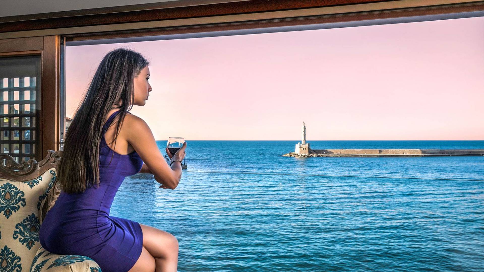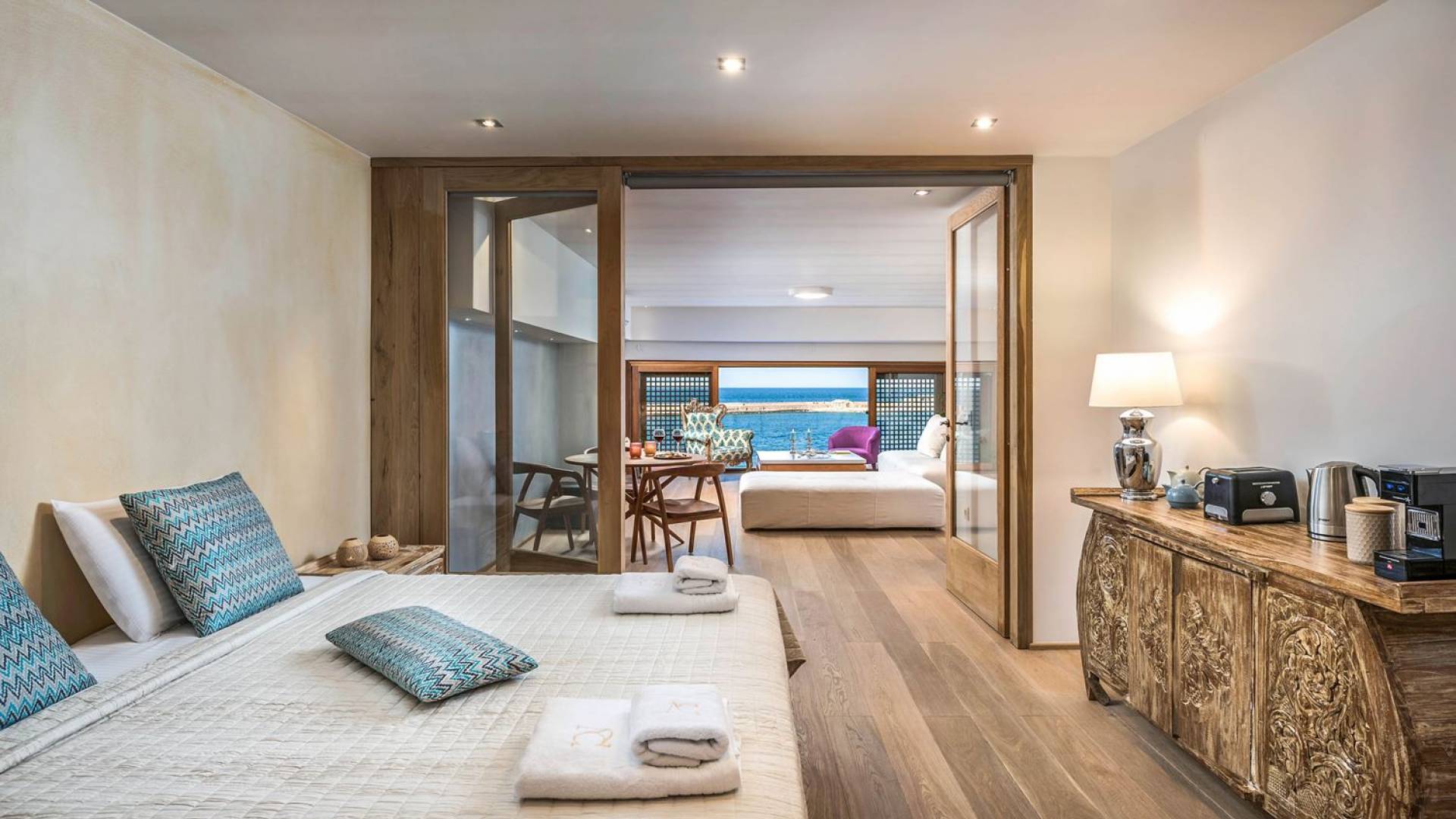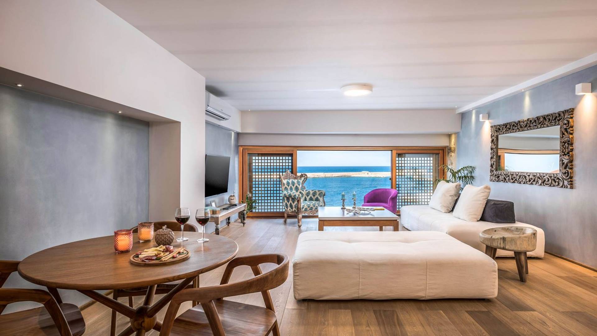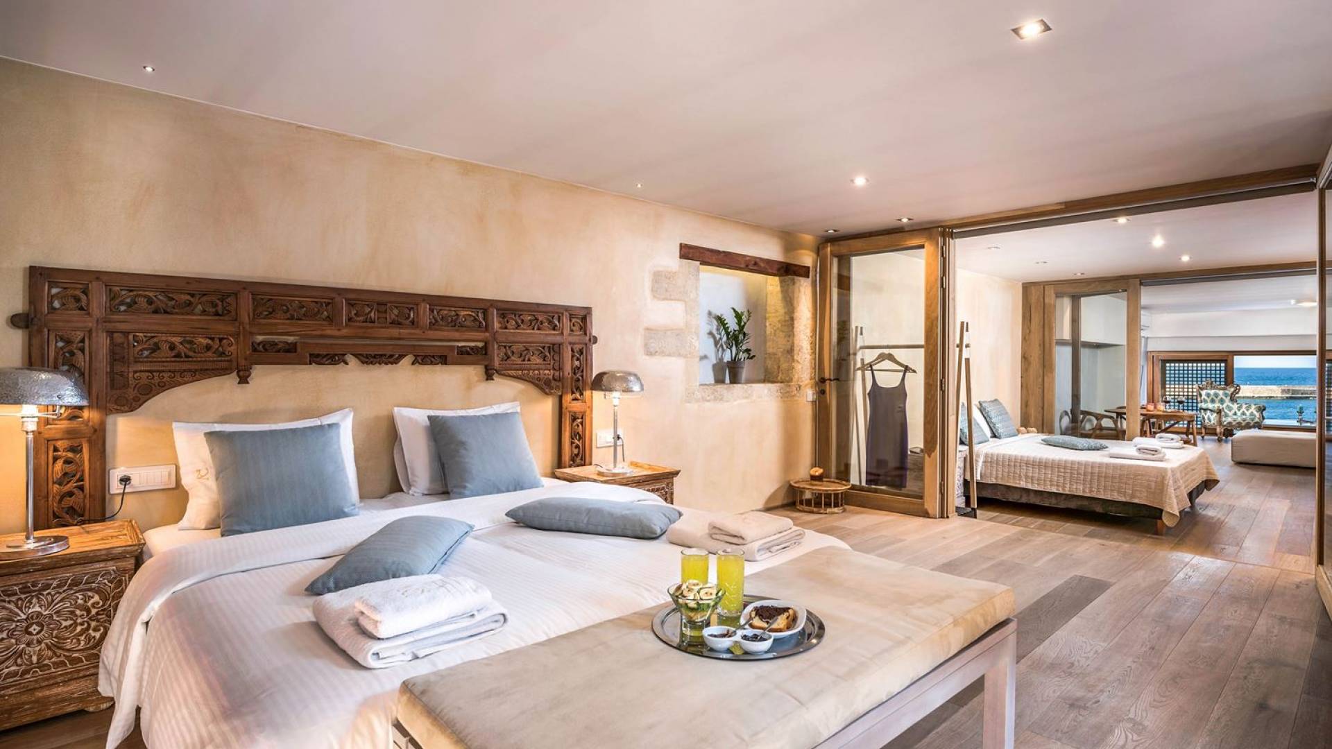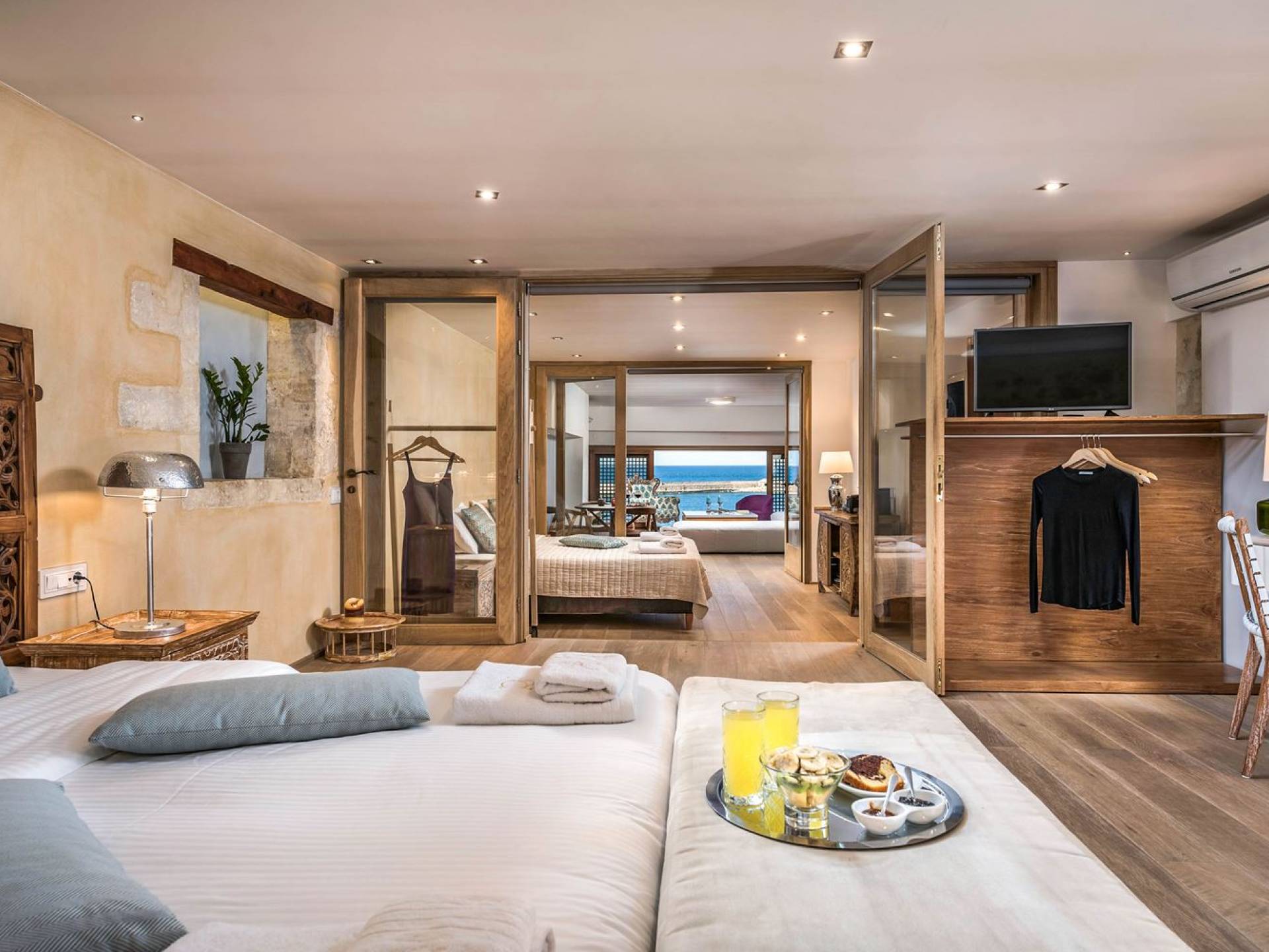 Consta de 4 elegantes y lujosas suites, todas con vistas espectaculares del faro egipcio y el antiguo puerto veneciano de Chania. Todas las suites están amuebladas con muebles especialmente diseñados y decoradas con artículos únicos. Ubicada en el tercer piso, esta suite de 90 m² consta de 2 habitaciones dobles, una amplia sala de estar y 2 baños. Las enormes ventanas ofrecen fantásticas vistas sobre el Puerto Viejo. Esta Suite puede acomodar hasta 4 personas.