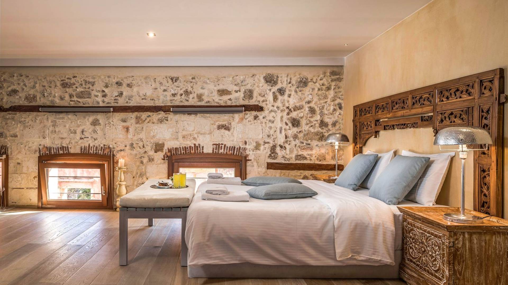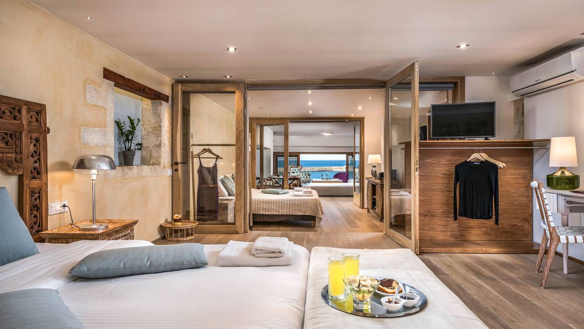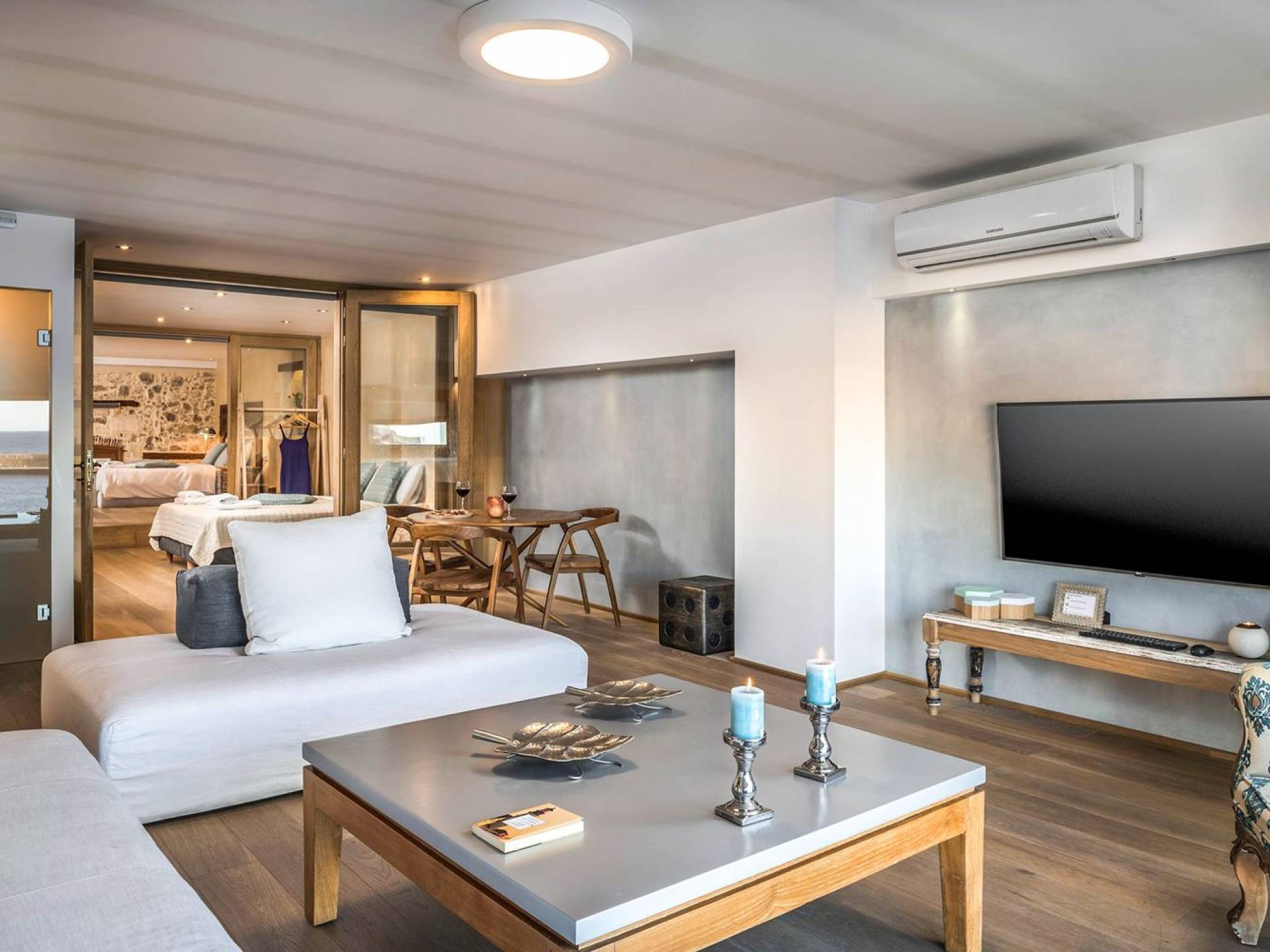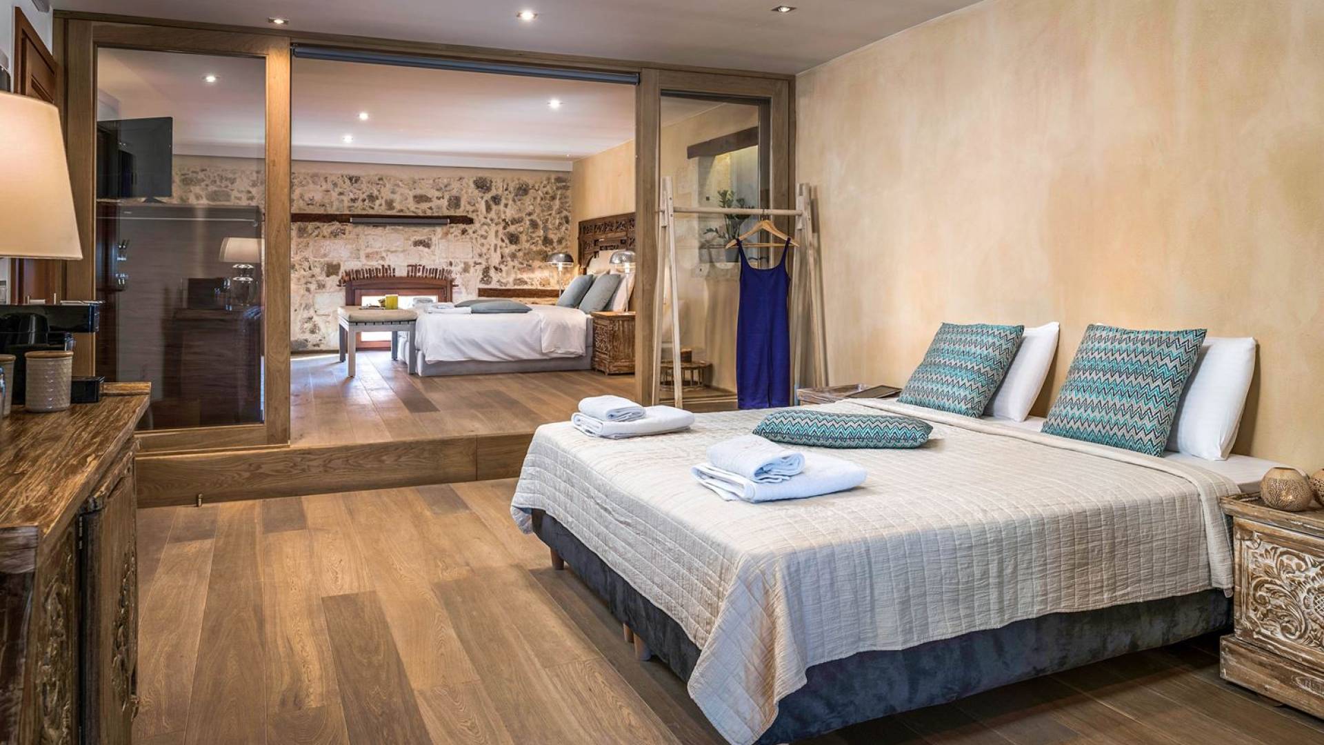 Consta de 4 elegantes y lujosas suites, todas con vistas espectaculares del faro egipcio y el antiguo puerto veneciano de Chania. Todas las suites están amuebladas con muebles especialmente diseñados y decoradas con artículos únicos. Ubicada en el tercer piso, esta suite de 90 m² consta de 2 habitaciones dobles, una amplia sala de estar y 2 baños. Las enormes ventanas ofrecen fantásticas vistas sobre el Puerto Viejo. Esta Suite puede acomodar hasta 4 personas.