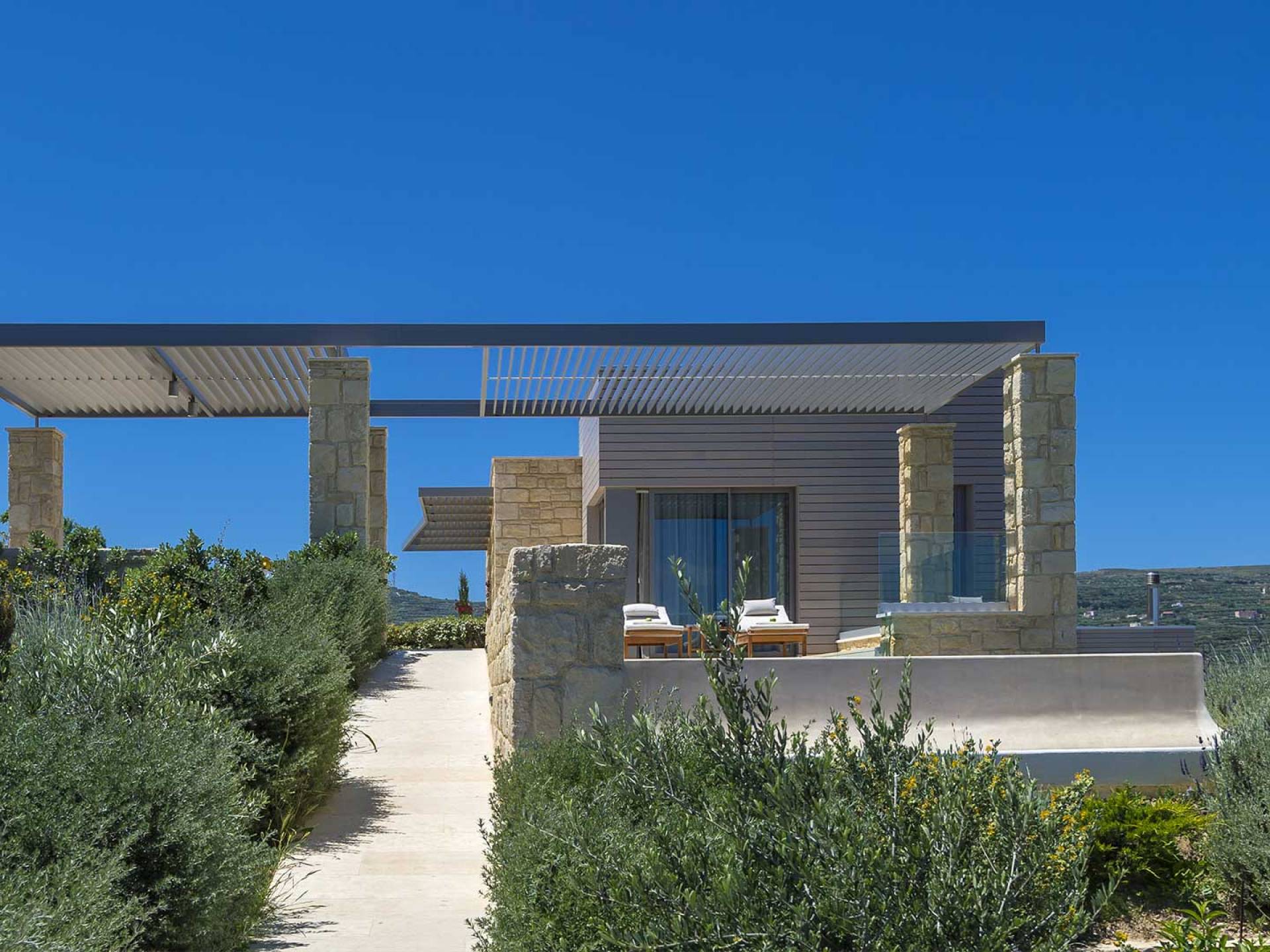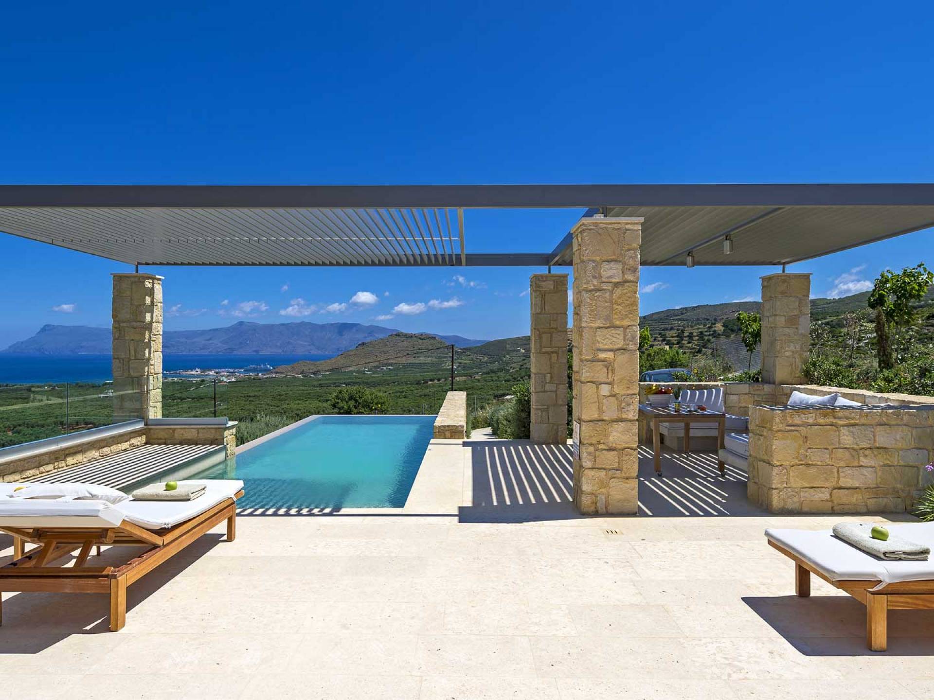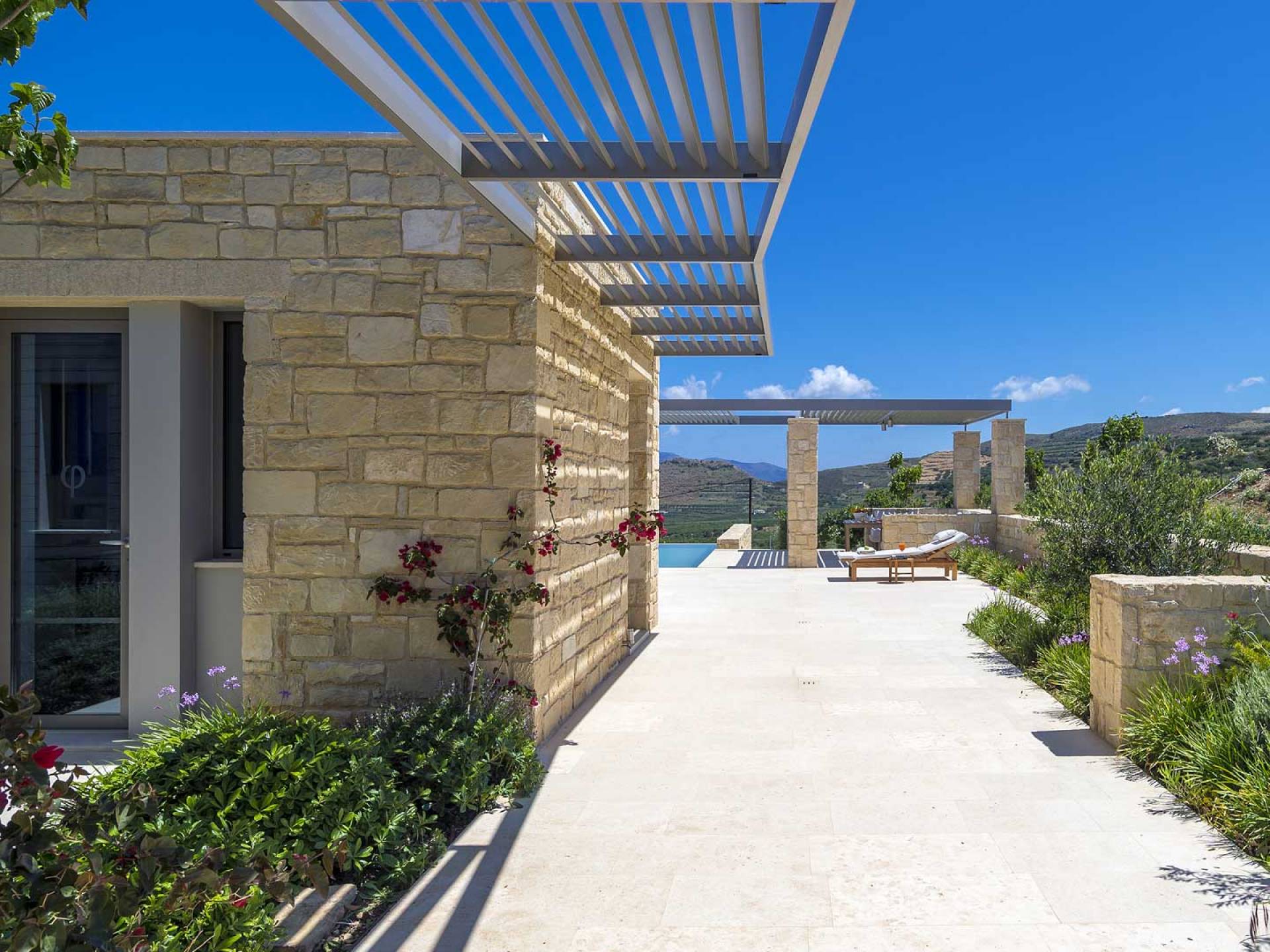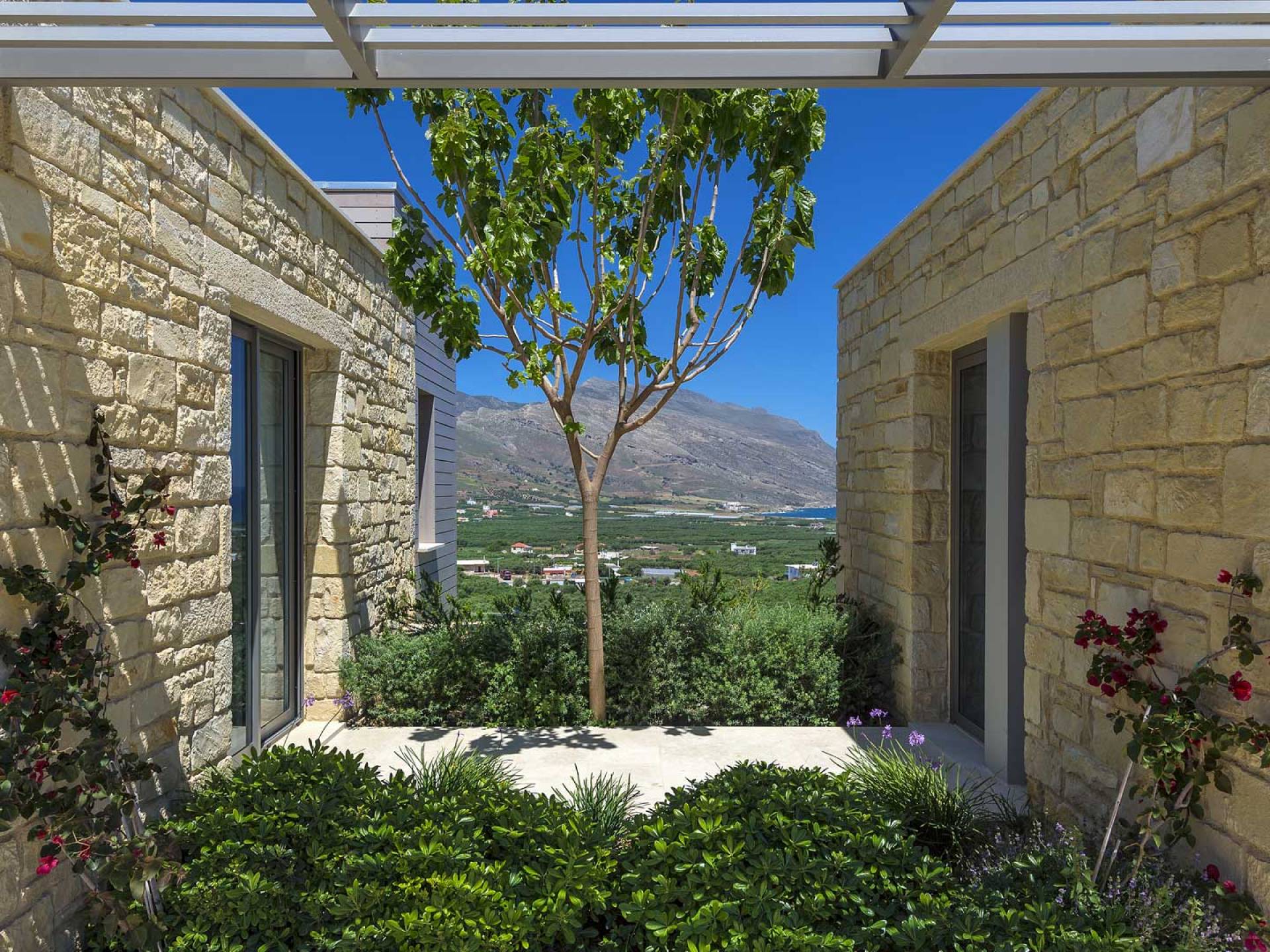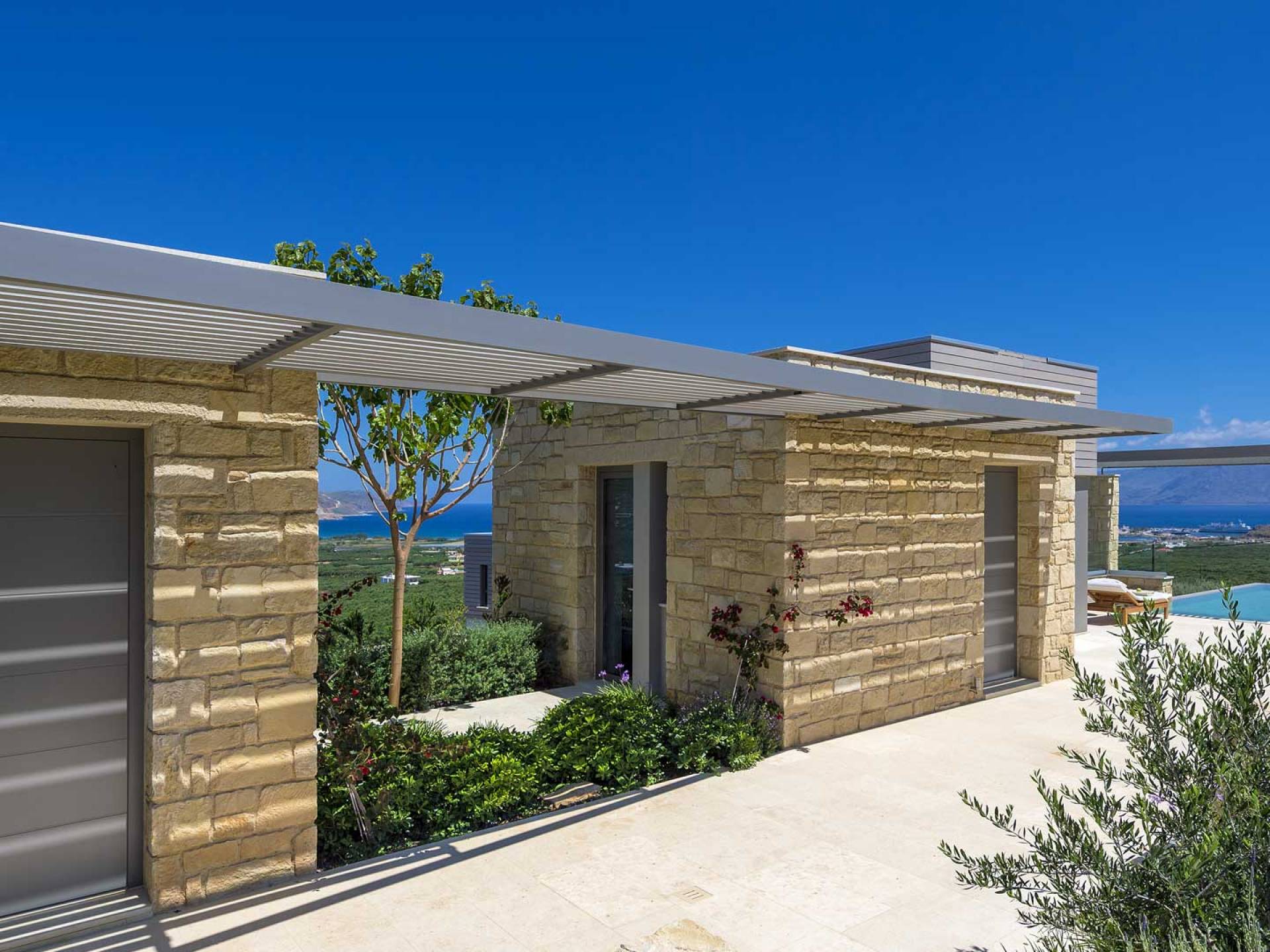 Las grandes ventanas dejan entrar la luz y brindan increíbles vistas de la bahía de Kissamos y de los jardines paisajísticos de la villa. Arbustos, flores y árboles endémicos se complementan con muros de piedra tradicionales que se mezclan con el entorno natural para agregar a su sinfonía. La piscina privada de borde infinito domina los olivares hacia el mar Egeo y es una vista que será una imagen inolvidable de un marco que encierra todo el encanto del Mediterráneo. El concepto innovador de una fachada triangular separa las áreas de estar y dormitorio en dos edificios que se comunican a través de una pasarela, lo que garantiza aún más privacidad.