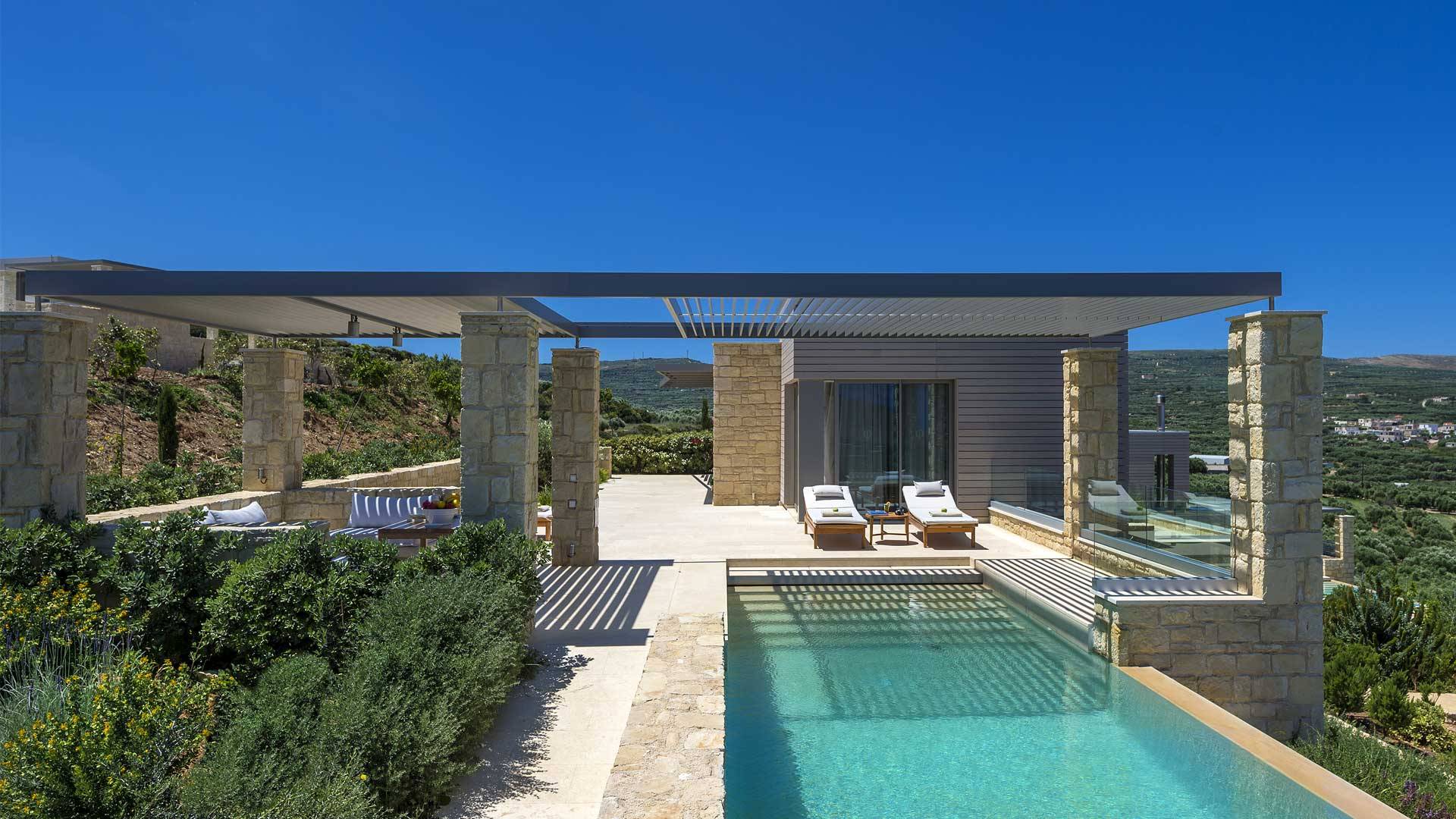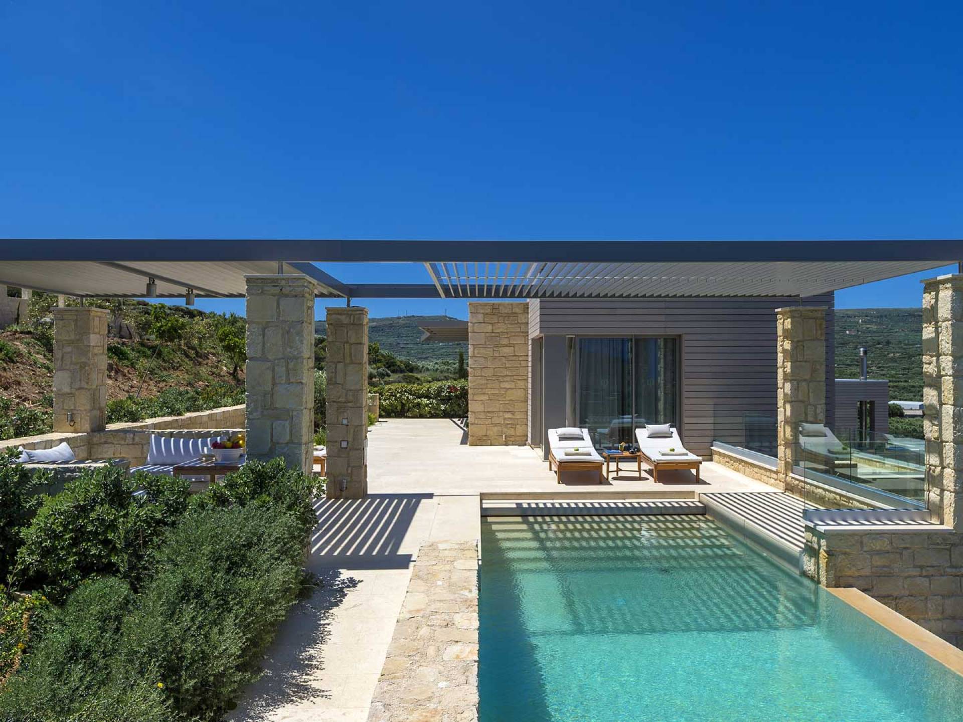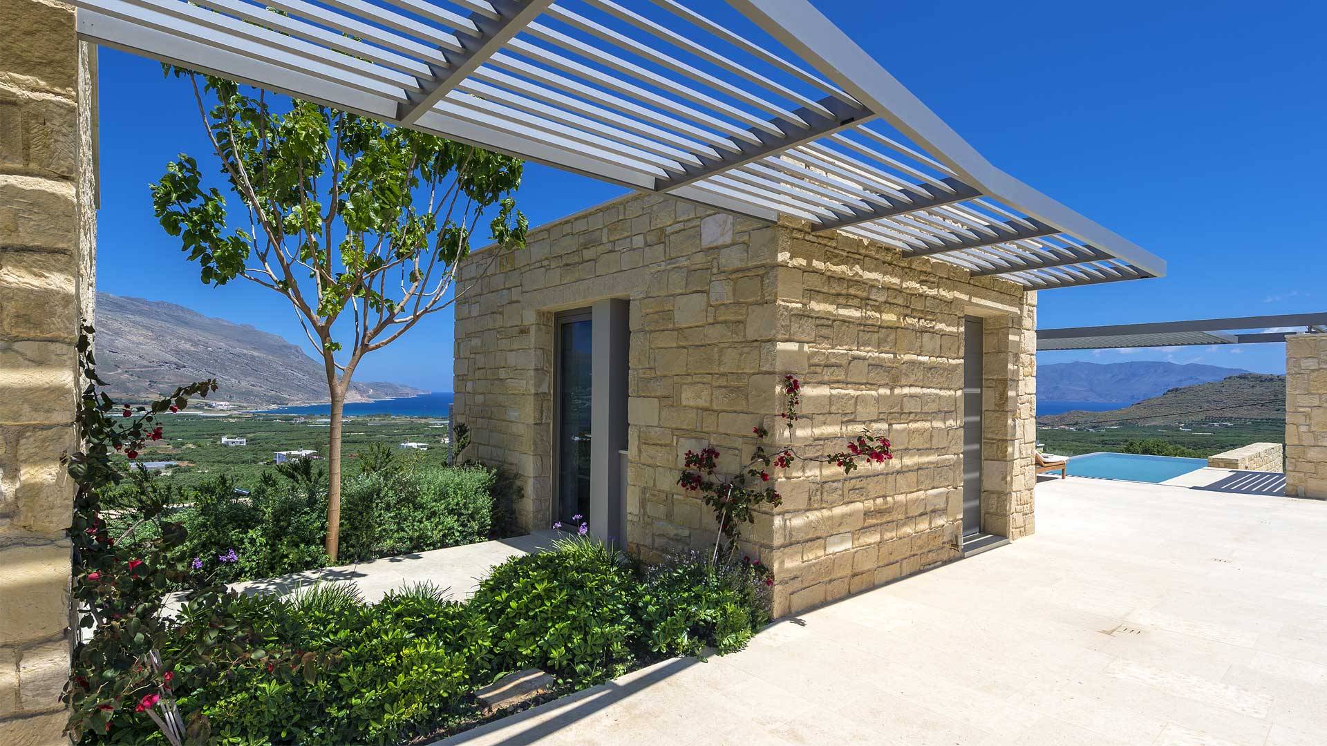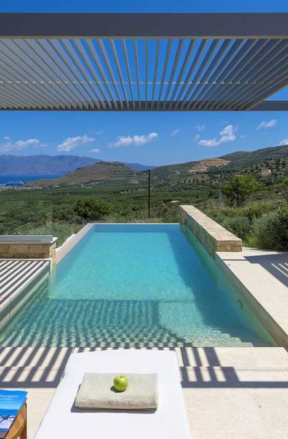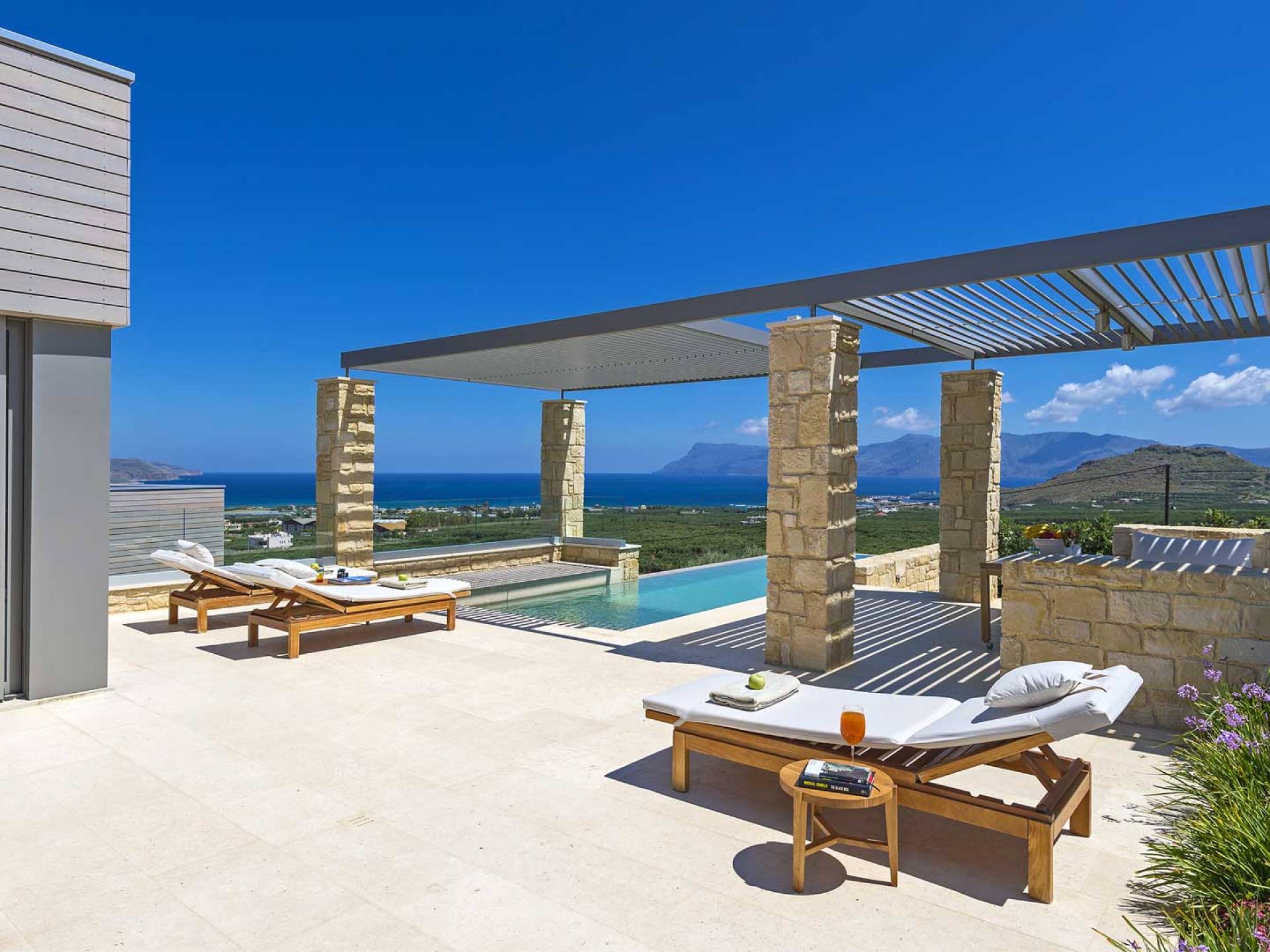 Las grandes ventanas dejan entrar la luz y brindan increíbles vistas de la bahía de Kissamos y de los jardines paisajísticos de la villa. Arbustos, flores y árboles endémicos se complementan con muros de piedra tradicionales que se mezclan con el entorno natural para agregar a su sinfonía. La piscina privada de borde infinito domina los olivares hacia el mar Egeo y es una vista que será una imagen inolvidable de un marco que encierra todo el encanto del Mediterráneo. El concepto innovador de una fachada triangular separa las áreas de estar y dormitorio en dos edificios que se comunican a través de una pasarela, lo que garantiza aún más privacidad.