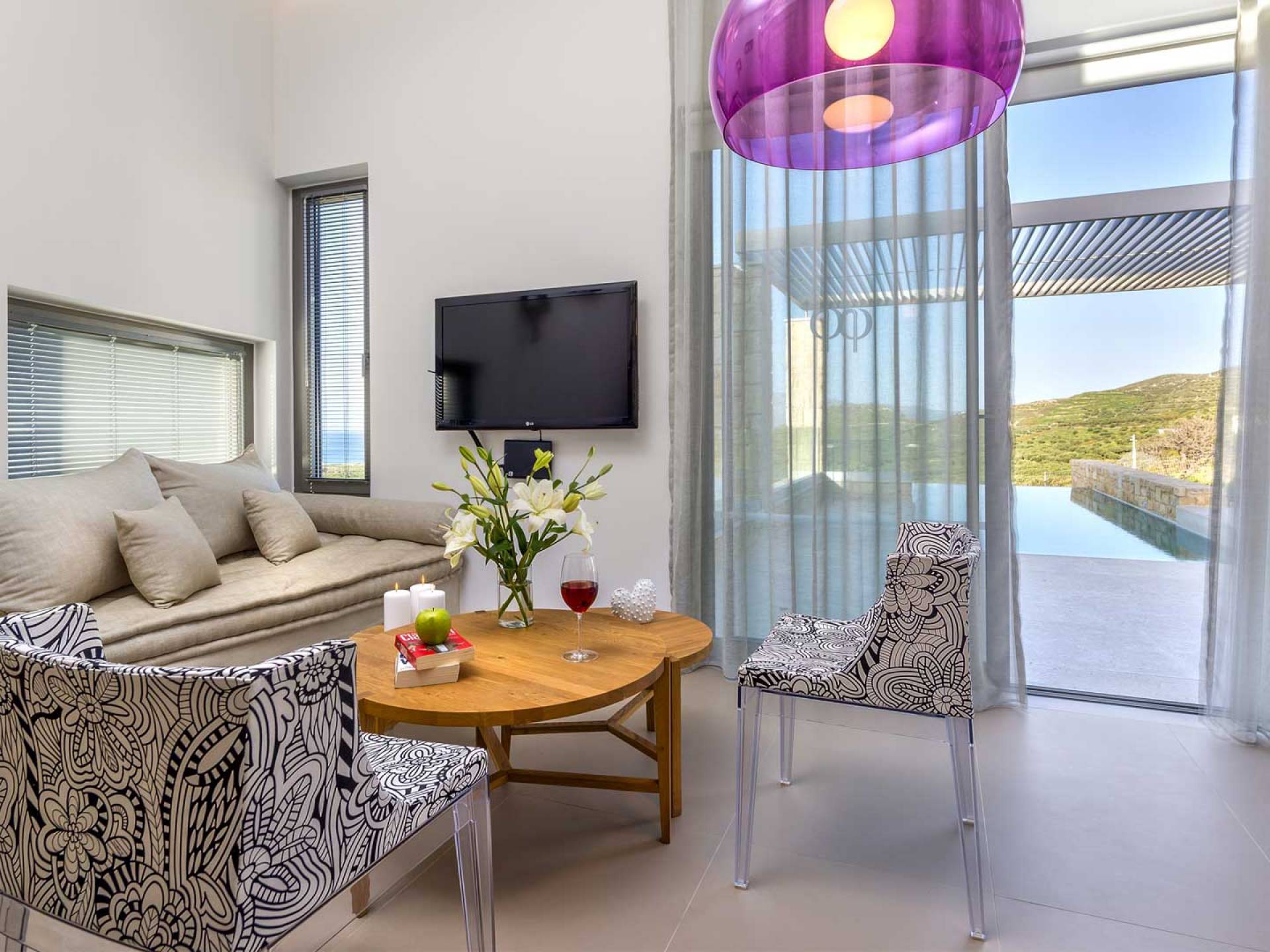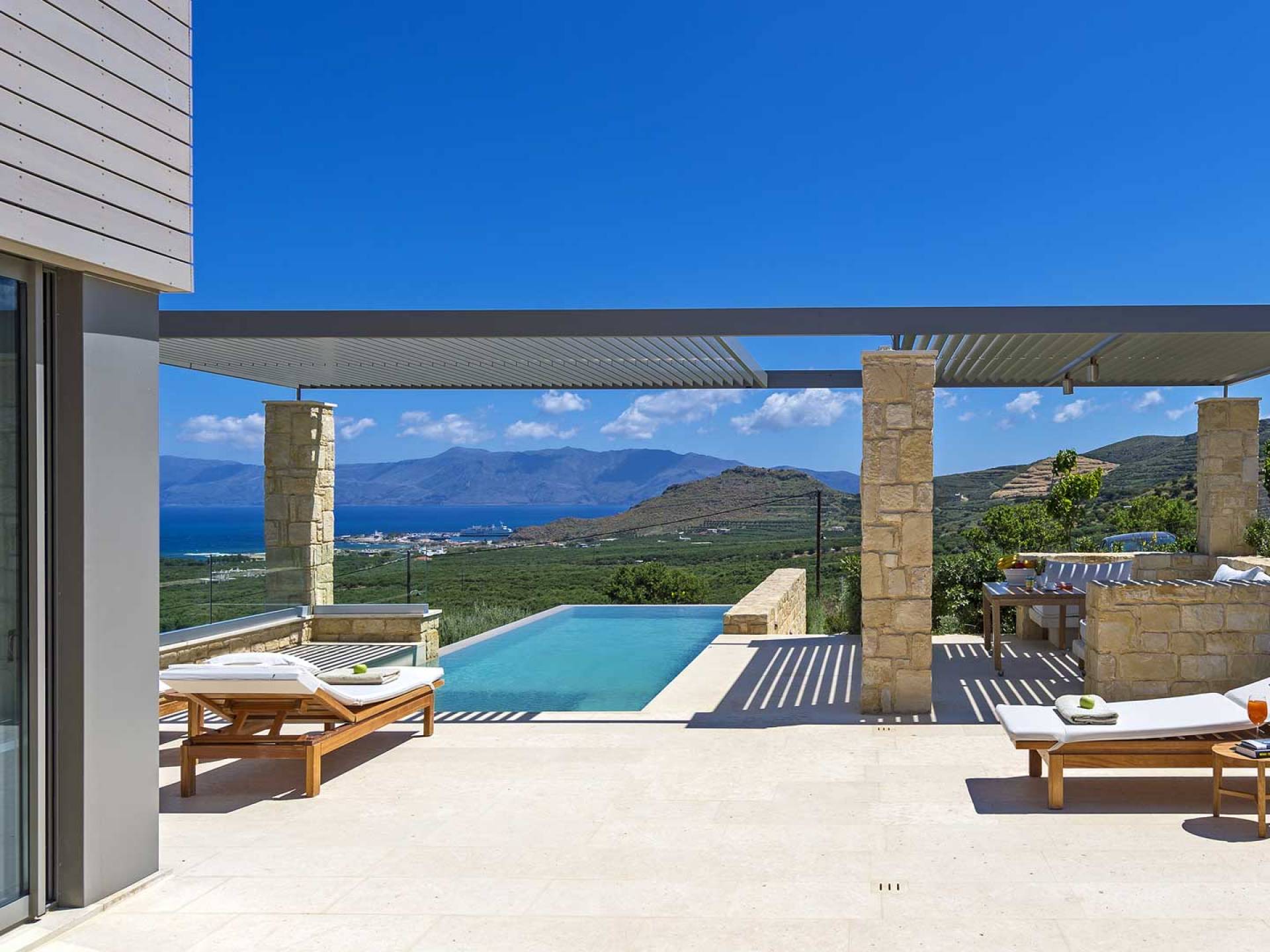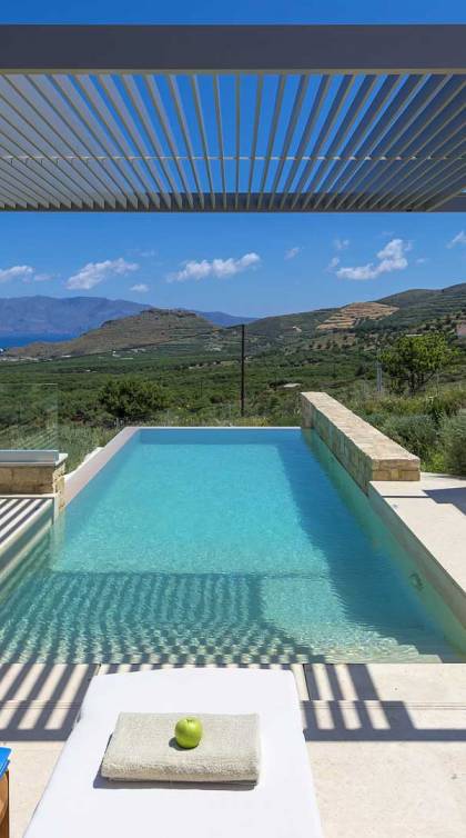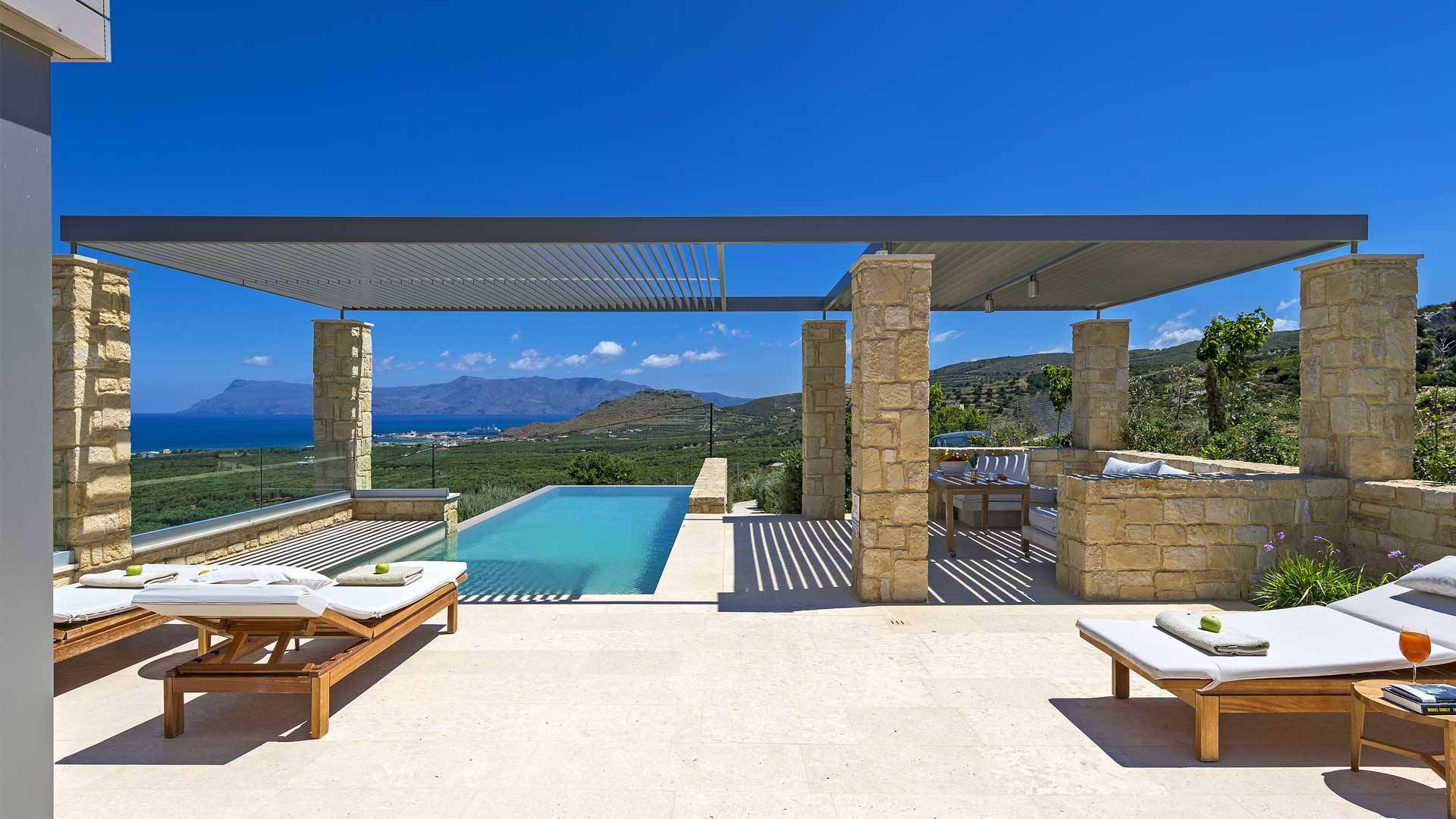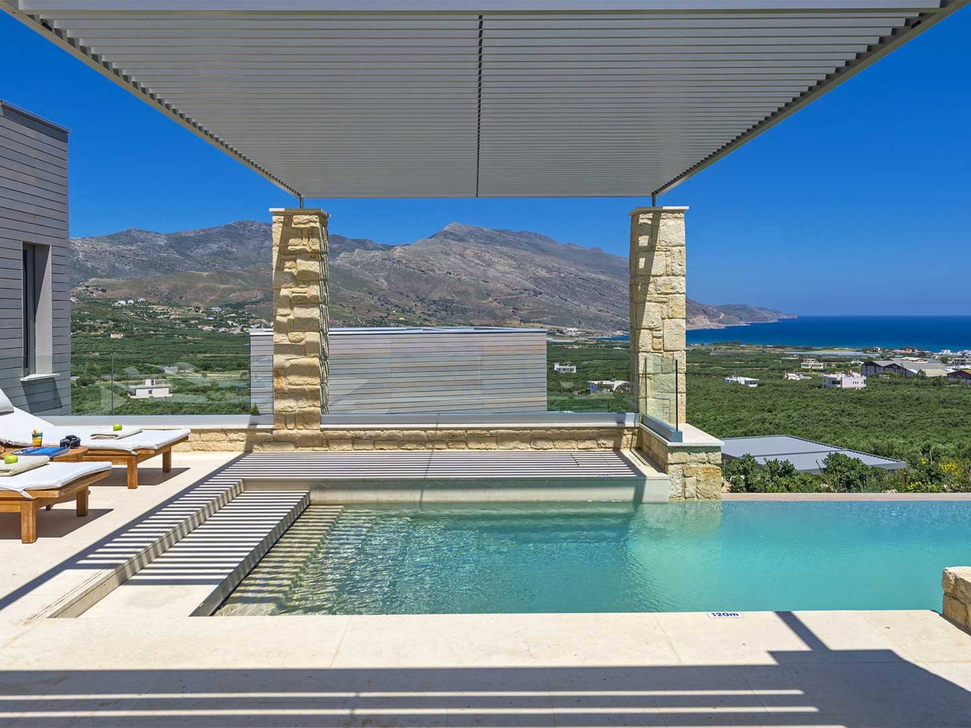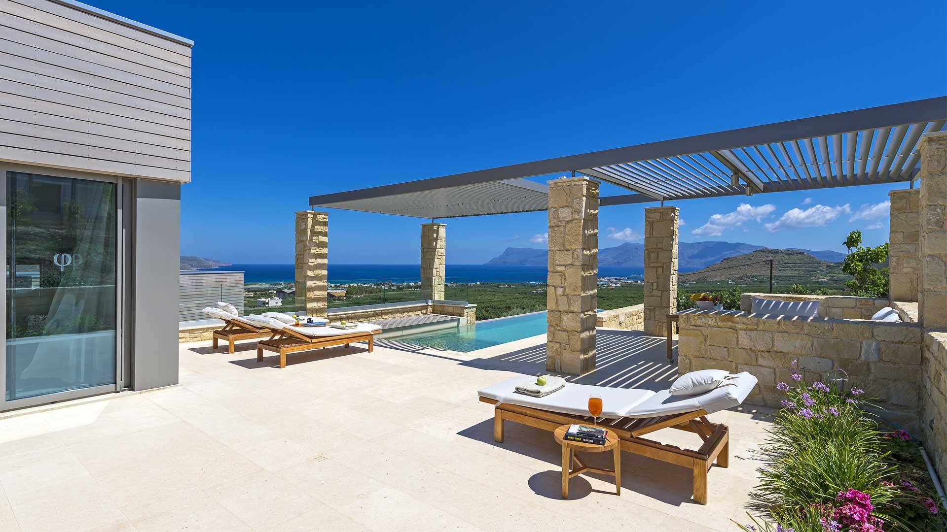 Las grandes ventanas dejan entrar la luz y brindan increíbles vistas de la bahía de Kissamos y de los jardines paisajísticos de la villa. Arbustos, flores y árboles endémicos se complementan con muros de piedra tradicionales que se mezclan con el entorno natural para agregar a su sinfonía. La piscina privada de borde infinito domina los olivares hacia el mar Egeo y es una vista que será una imagen inolvidable de un marco que encierra todo el encanto del Mediterráneo. El concepto innovador de una fachada triangular separa las áreas de estar y dormitorio en dos edificios que se comunican a través de una pasarela, lo que garantiza aún más privacidad.