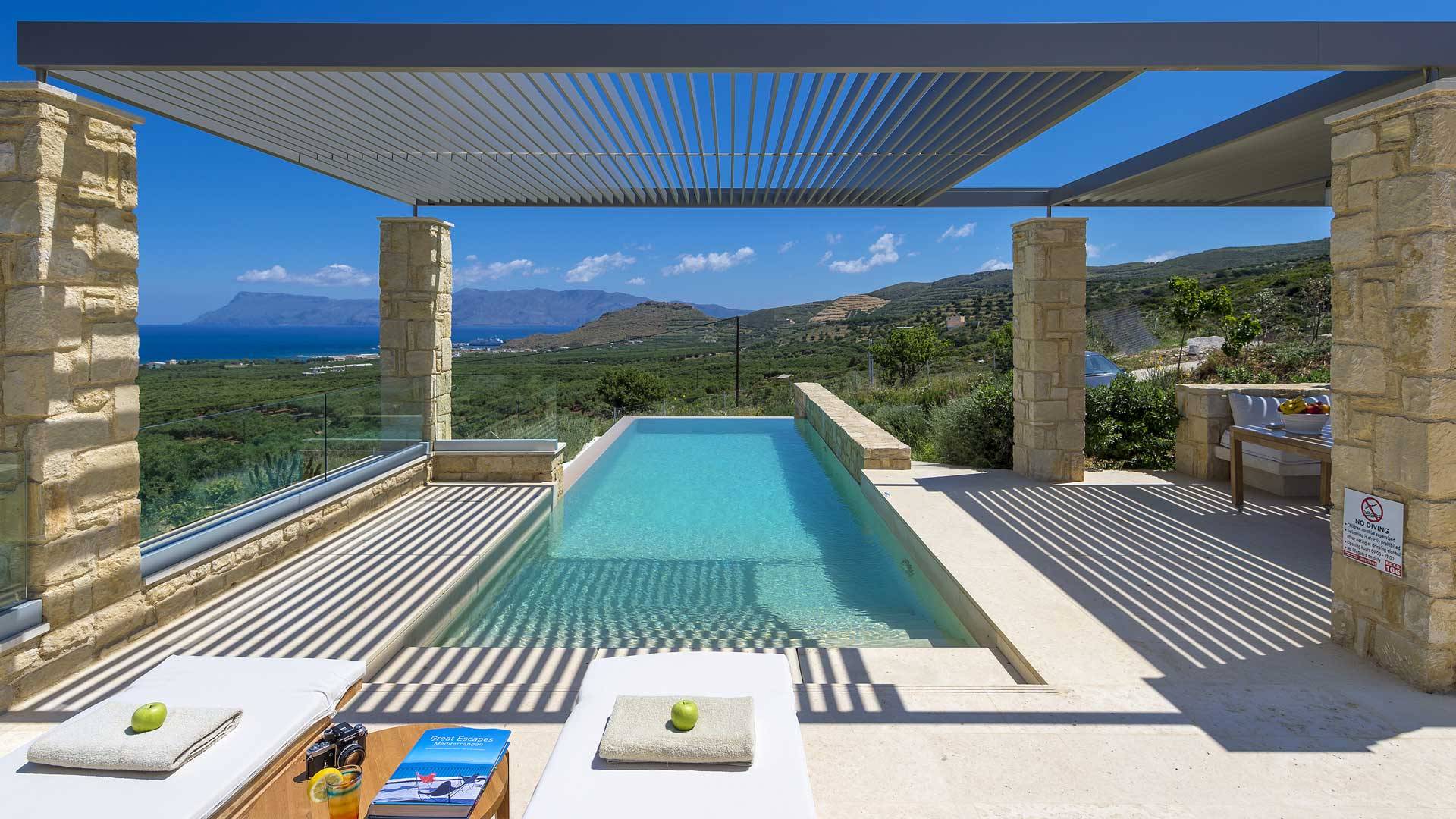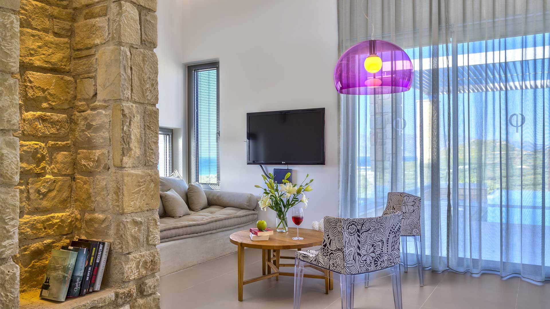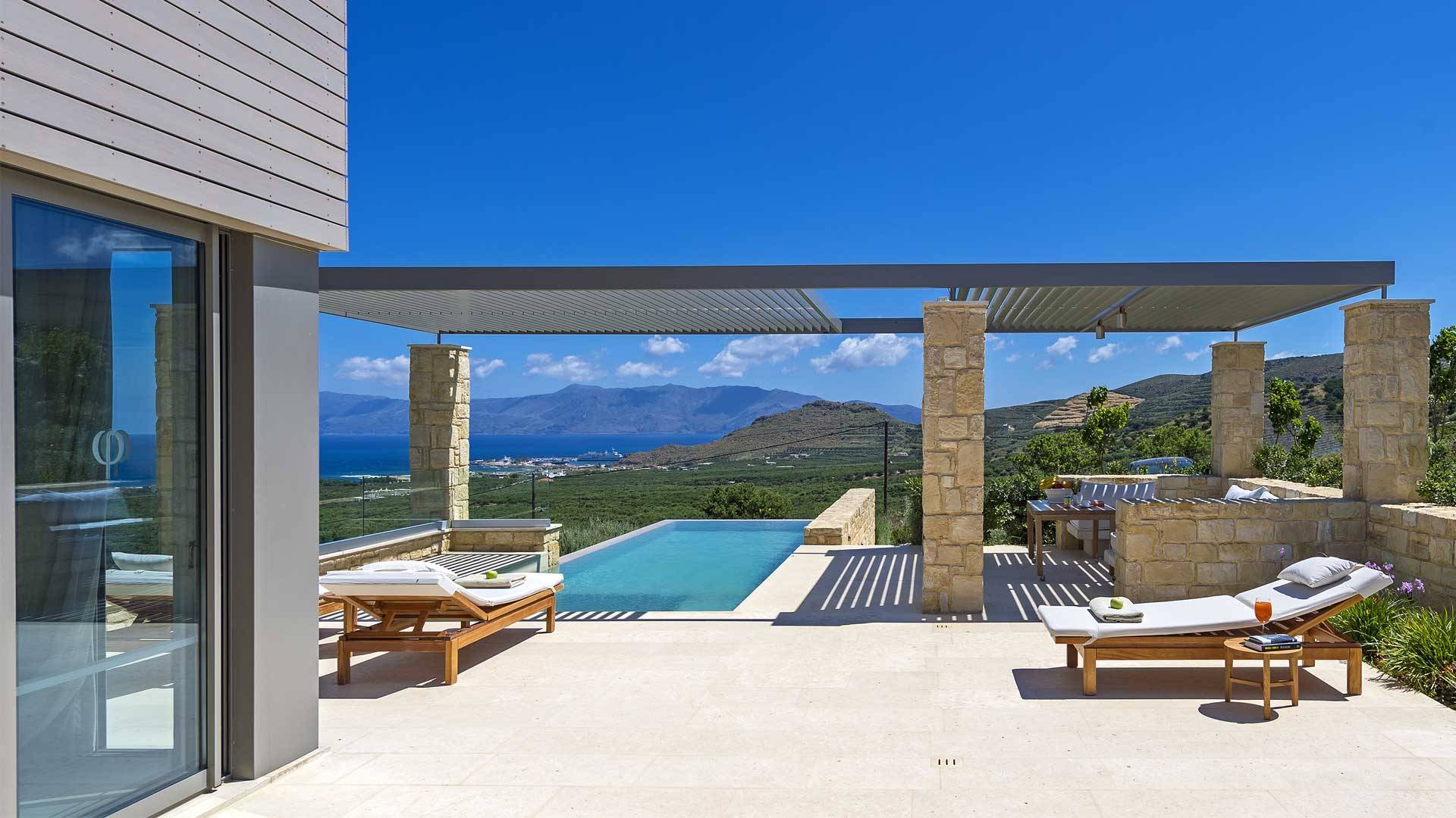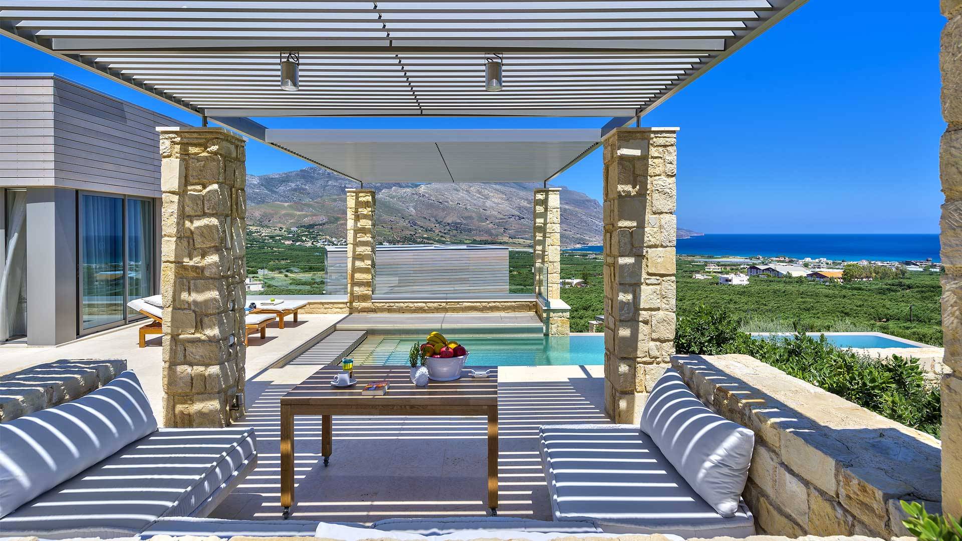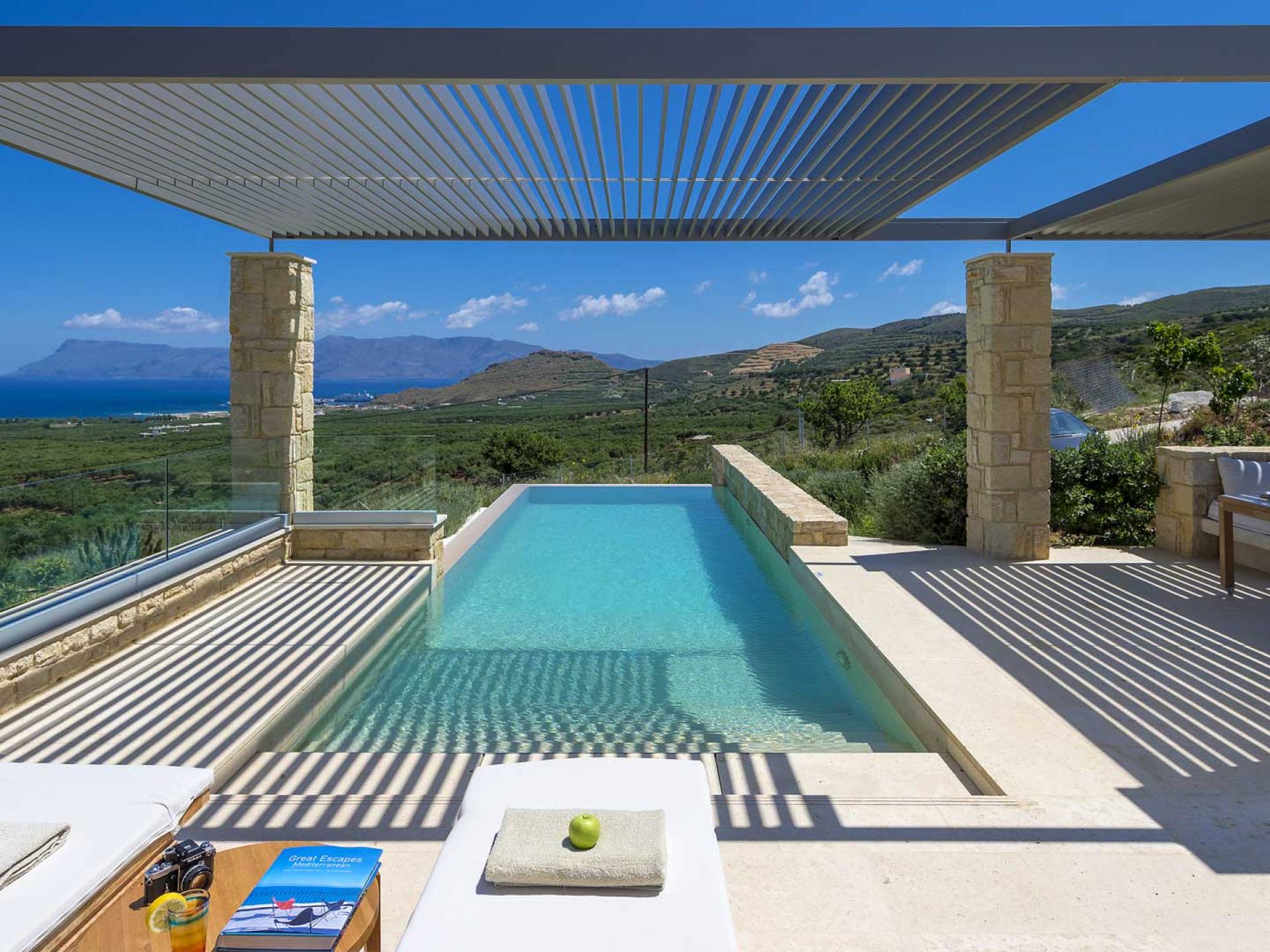 Las grandes ventanas dejan entrar la luz y brindan increíbles vistas de la bahía de Kissamos y de los jardines paisajísticos de la villa. Arbustos, flores y árboles endémicos se complementan con muros de piedra tradicionales que se mezclan con el entorno natural para agregar a su sinfonía. La piscina privada de borde infinito domina los olivares hacia el mar Egeo y es una vista que será una imagen inolvidable de un marco que encierra todo el encanto del Mediterráneo. El concepto innovador de una fachada triangular separa las áreas de estar y dormitorio en dos edificios que se comunican a través de una pasarela, lo que garantiza aún más privacidad.