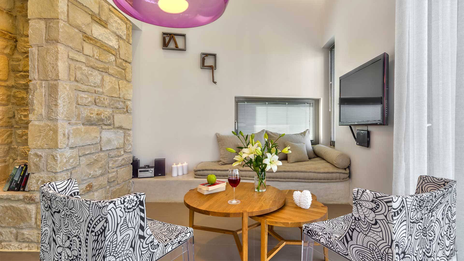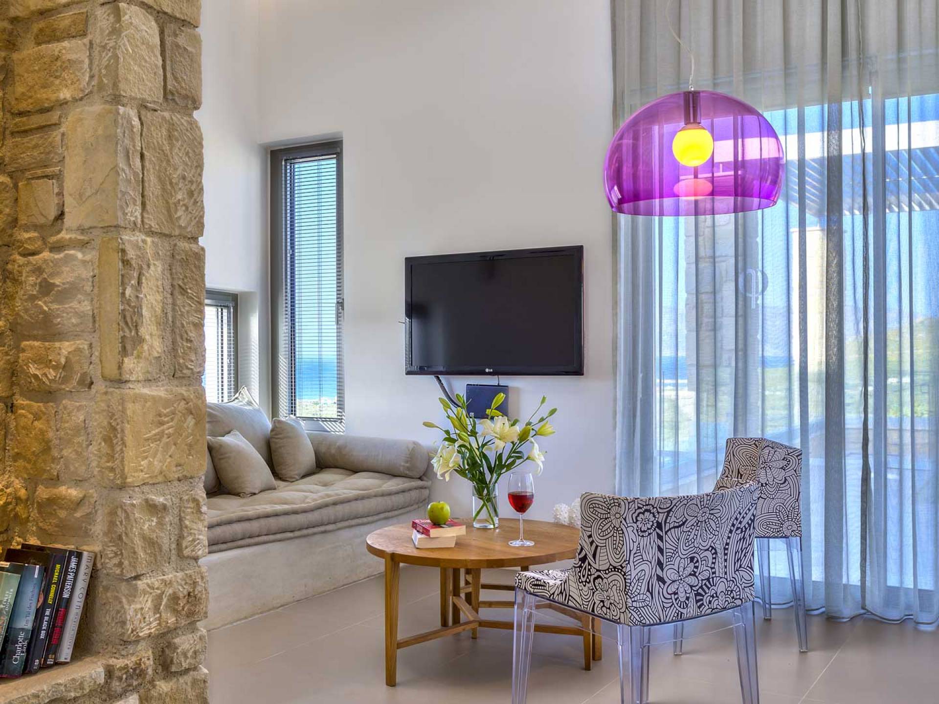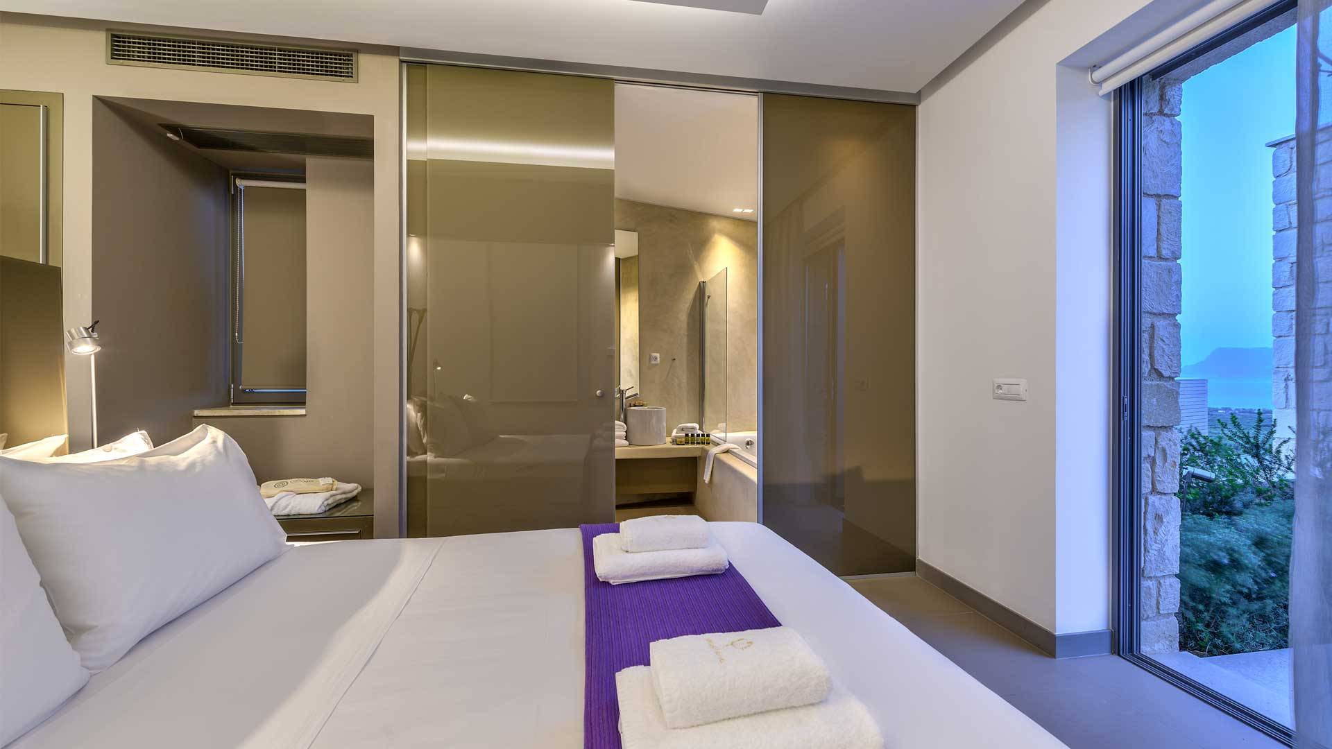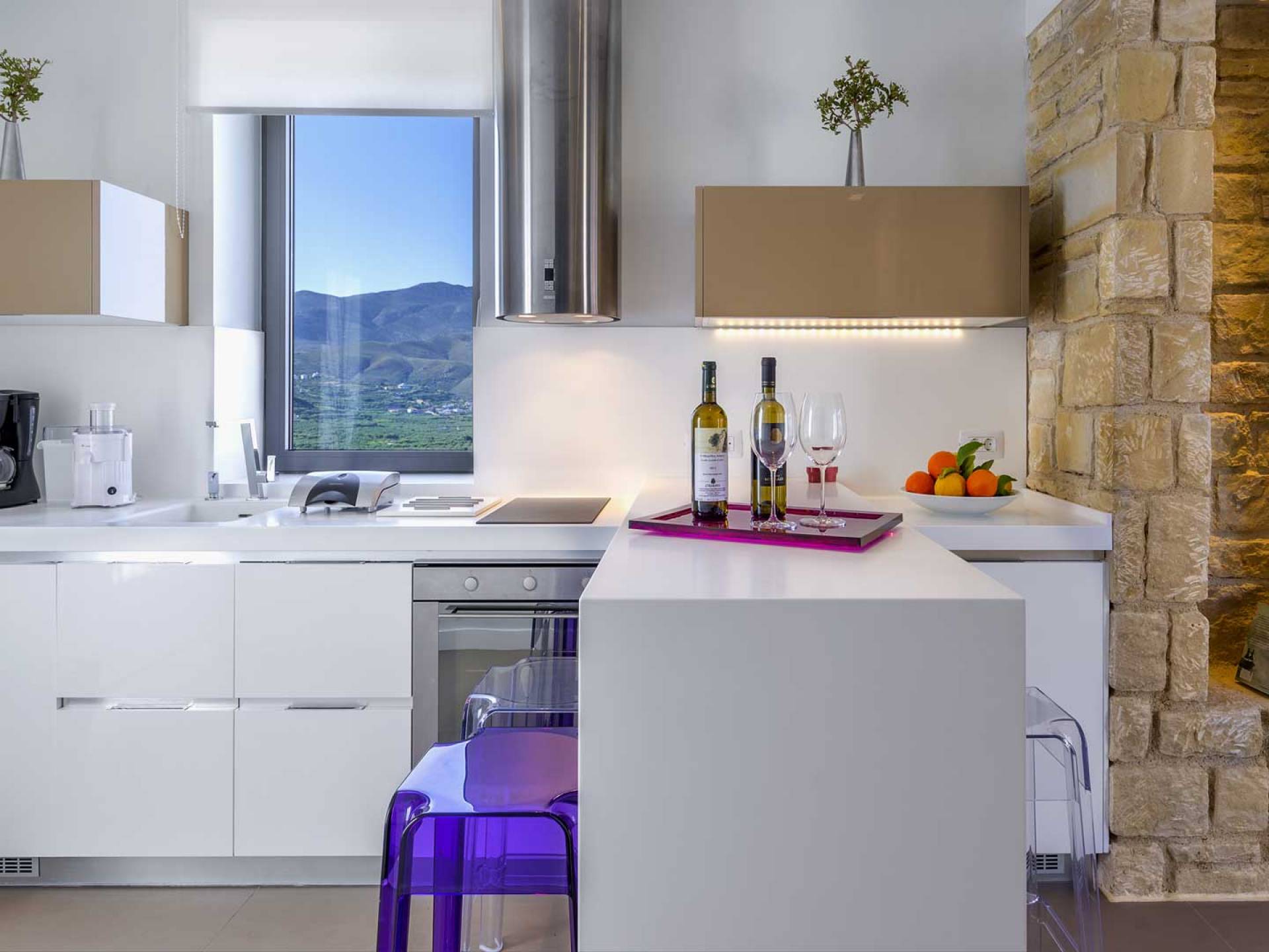 Las grandes ventanas dejan entrar la luz y brindan increíbles vistas de la bahía de Kissamos y de los jardines paisajísticos de la villa. Arbustos, flores y árboles endémicos se complementan con muros de piedra tradicionales que se mezclan con el entorno natural para agregar a su sinfonía. La piscina privada de borde infinito domina los olivares hacia el mar Egeo y es una vista que será una imagen inolvidable de un marco que encierra todo el encanto del Mediterráneo. El concepto innovador de una fachada triangular separa las áreas de estar y dormitorio en dos edificios que se comunican a través de una pasarela, lo que garantiza aún más privacidad.