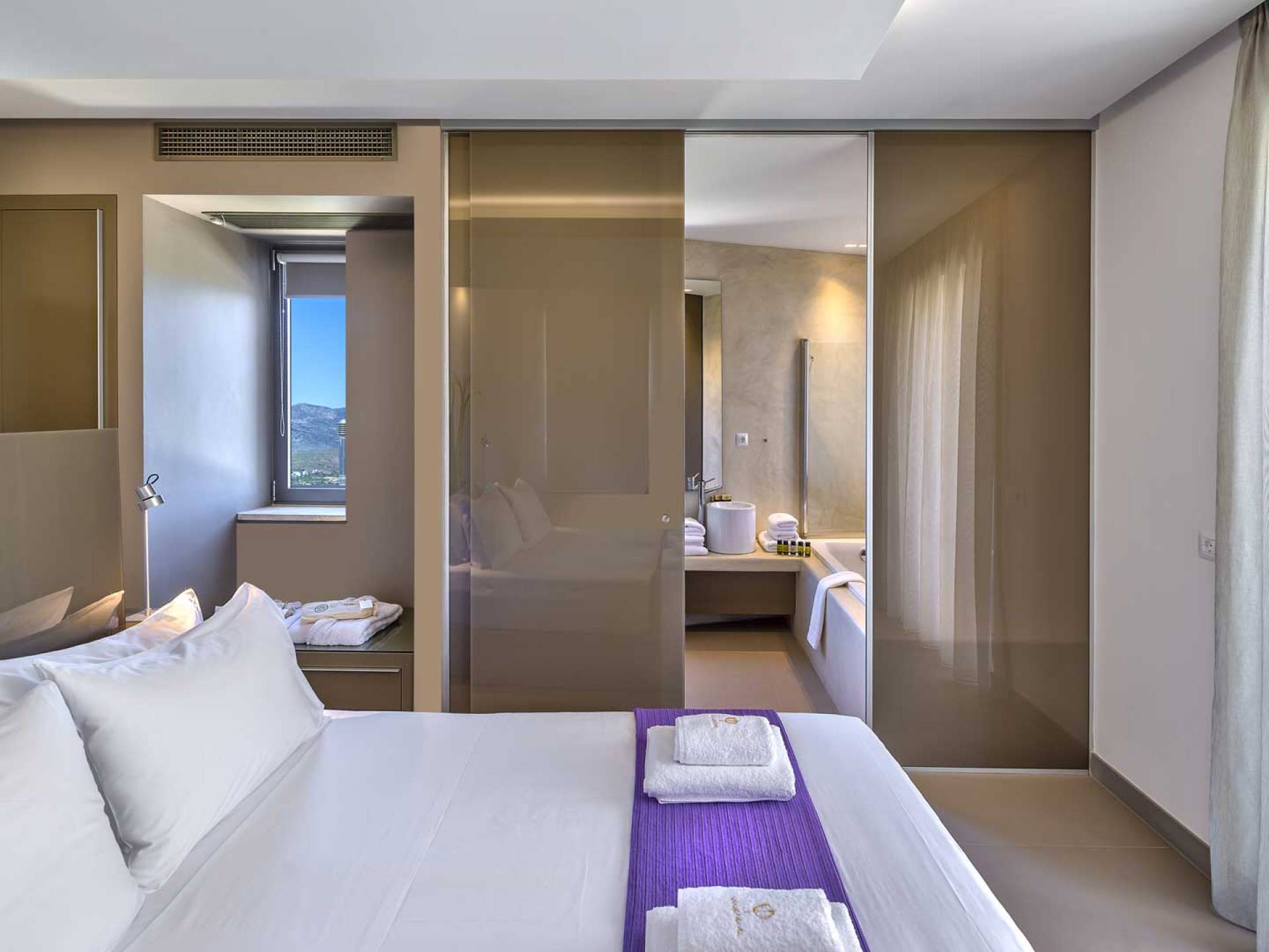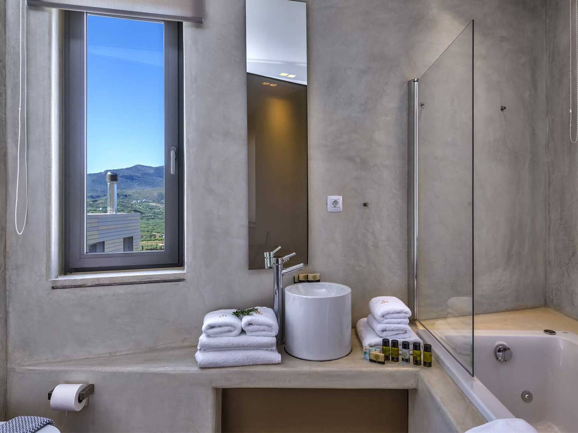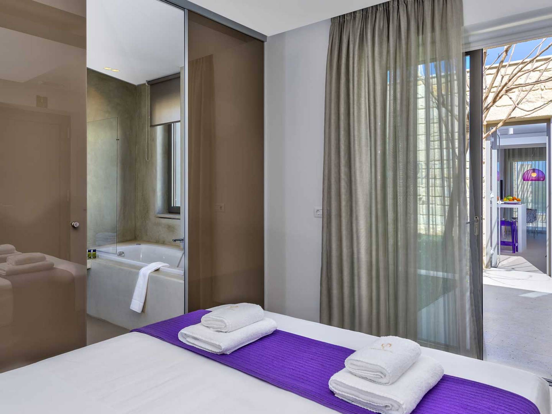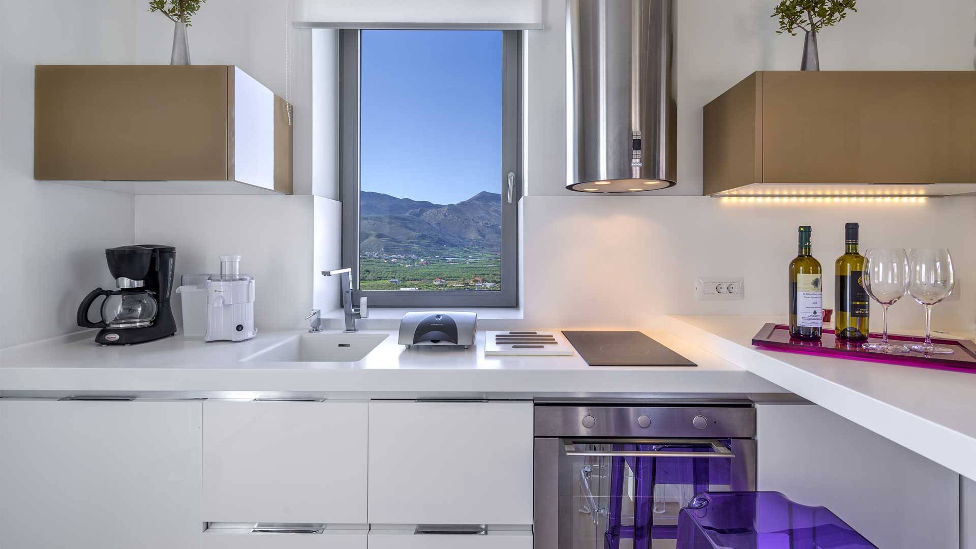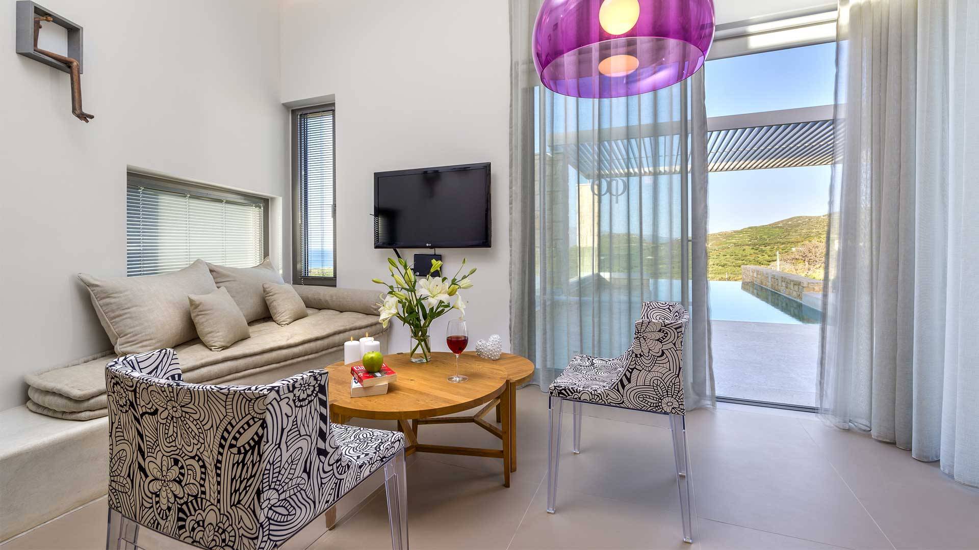 Las grandes ventanas dejan entrar la luz y brindan increíbles vistas de la bahía de Kissamos y de los jardines paisajísticos de la villa. Arbustos, flores y árboles endémicos se complementan con muros de piedra tradicionales que se mezclan con el entorno natural para agregar a su sinfonía. La piscina privada de borde infinito domina los olivares hacia el mar Egeo y es una vista que será una imagen inolvidable de un marco que encierra todo el encanto del Mediterráneo. El concepto innovador de una fachada triangular separa las áreas de estar y dormitorio en dos edificios que se comunican a través de una pasarela, lo que garantiza aún más privacidad.