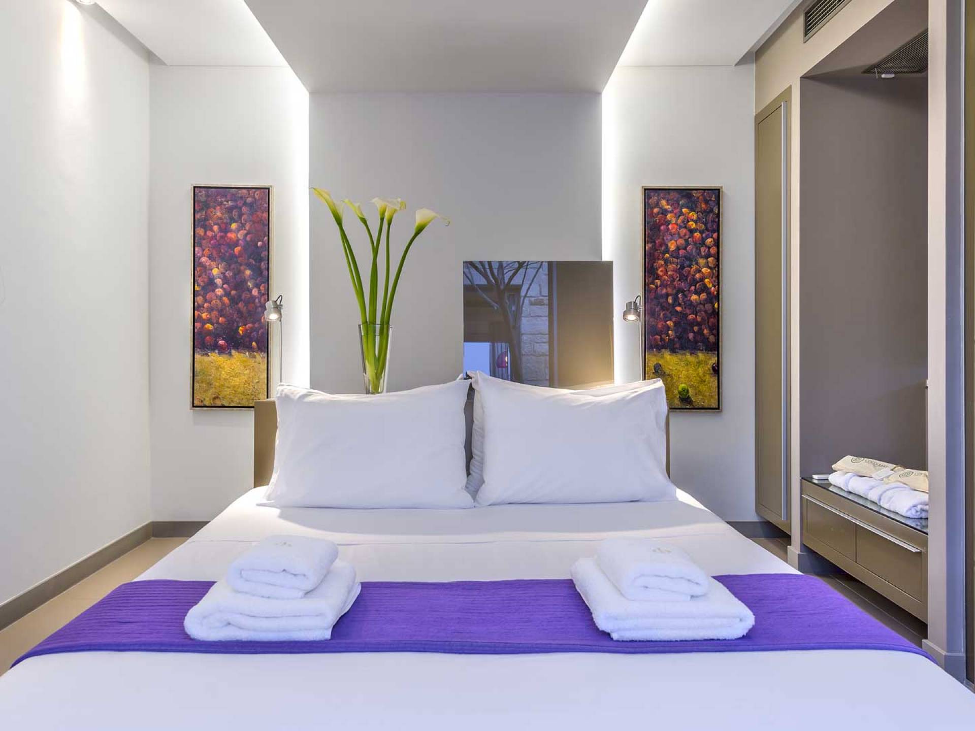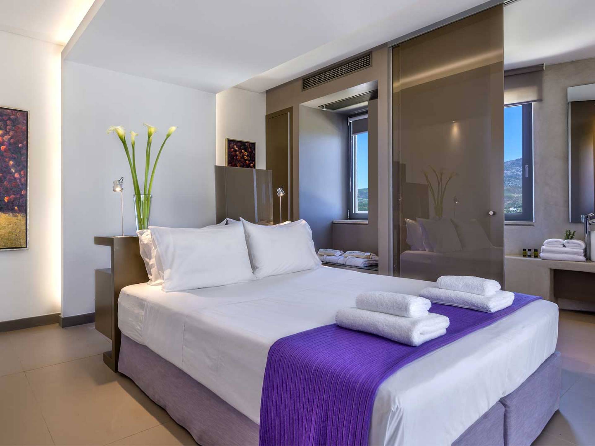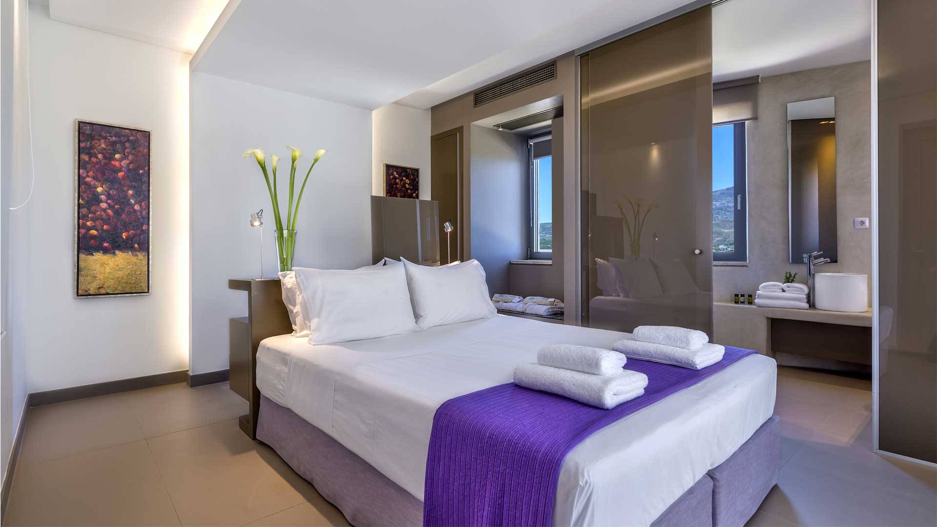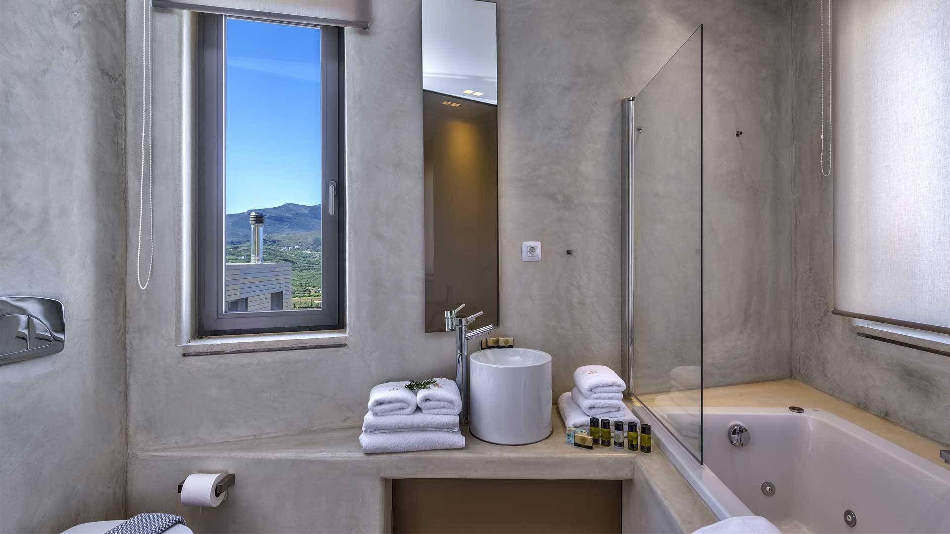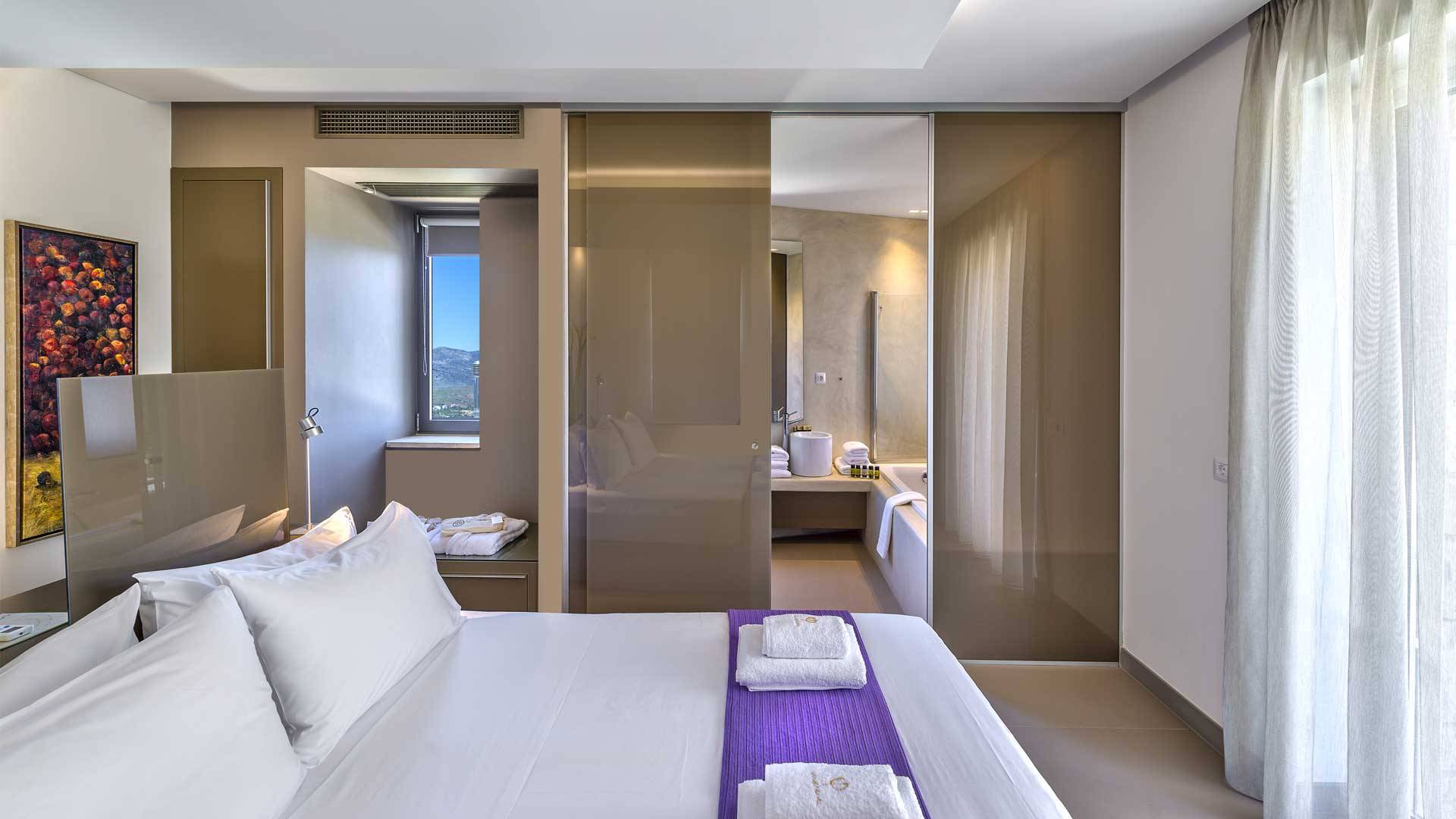 Las grandes ventanas dejan entrar la luz y brindan increíbles vistas de la bahía de Kissamos y de los jardines paisajísticos de la villa. Arbustos, flores y árboles endémicos se complementan con muros de piedra tradicionales que se mezclan con el entorno natural para agregar a su sinfonía. La piscina privada de borde infinito domina los olivares hacia el mar Egeo y es una vista que será una imagen inolvidable de un marco que encierra todo el encanto del Mediterráneo. El concepto innovador de una fachada triangular separa las áreas de estar y dormitorio en dos edificios que se comunican a través de una pasarela, lo que garantiza aún más privacidad.