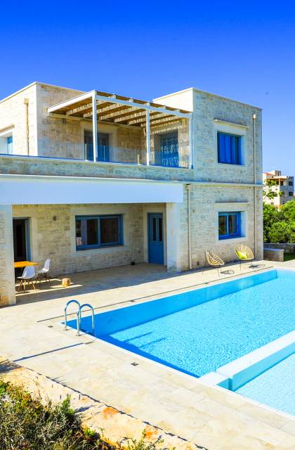 El interior de la villa está decorado con obras de arte de famosos pintores griegos. Su diseño inteligente impresiona a los huéspedes y la vida de lujo que enfatiza la calidad y la comodidad. La planta baja se compone de una cocina espaciosa, luminosa y totalmente equipada, una acogedora sala de estar con chimenea y un gran baño. Uno de los cuatro dormitorios también se encuentra en este piso, proporcionando excelentes vistas, mientras que los otros tres dormitorios se encuentran en el segundo piso, ofreciendo una vista alegre de la hermosa bahía de Souda y las famosas Montañas Blancas, desde la magnífica terraza. Cada dormitorio está completamente amueblado y tiene su propio armario. Se puede colocar una cuna adicional en dos de los dormitorios bajo petición. El segundo piso también consta de dos baños más con una práctica lavadora.