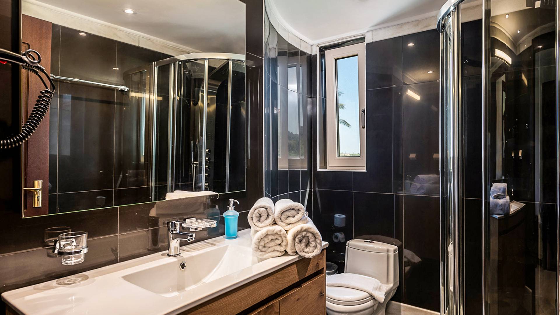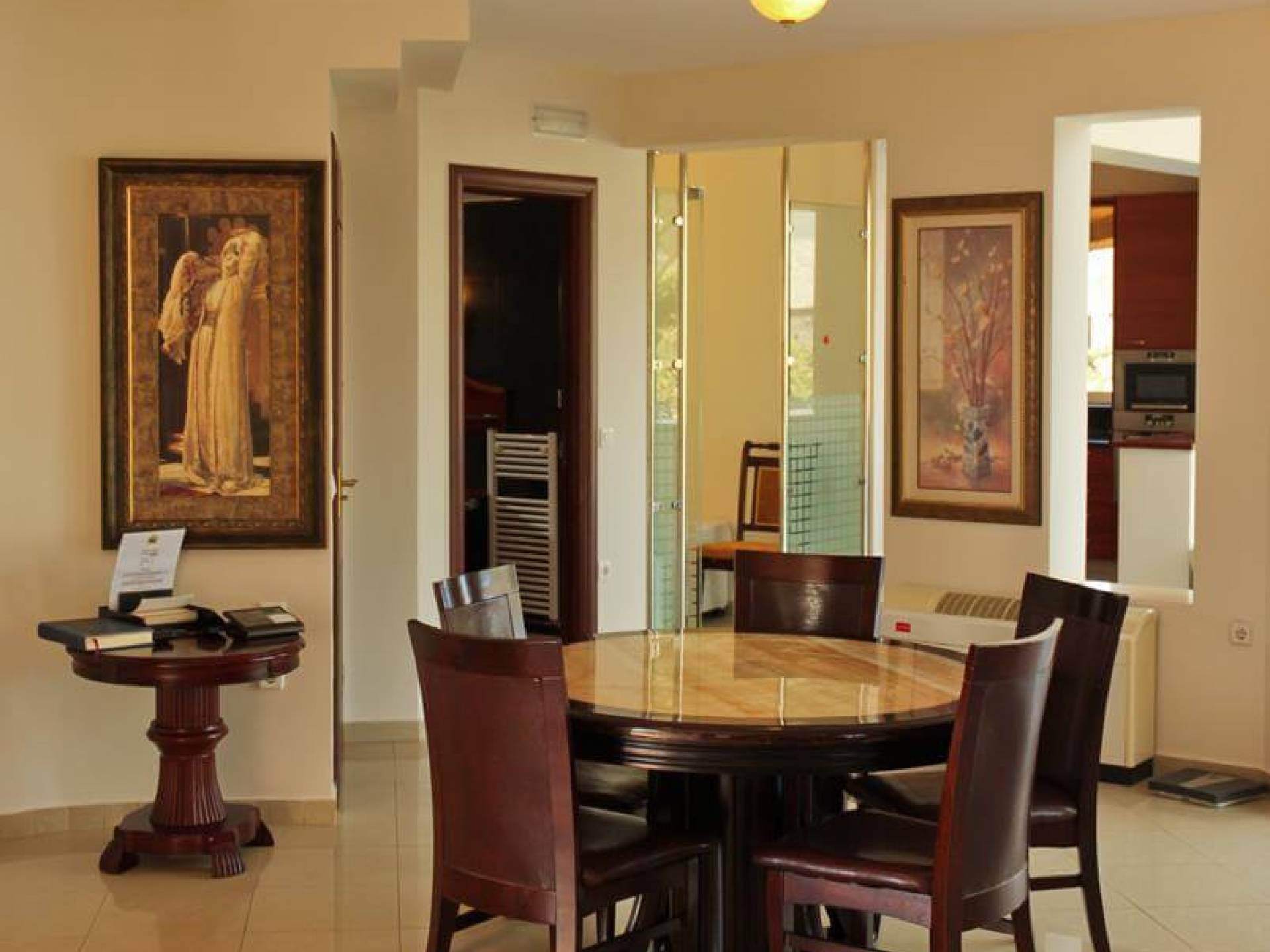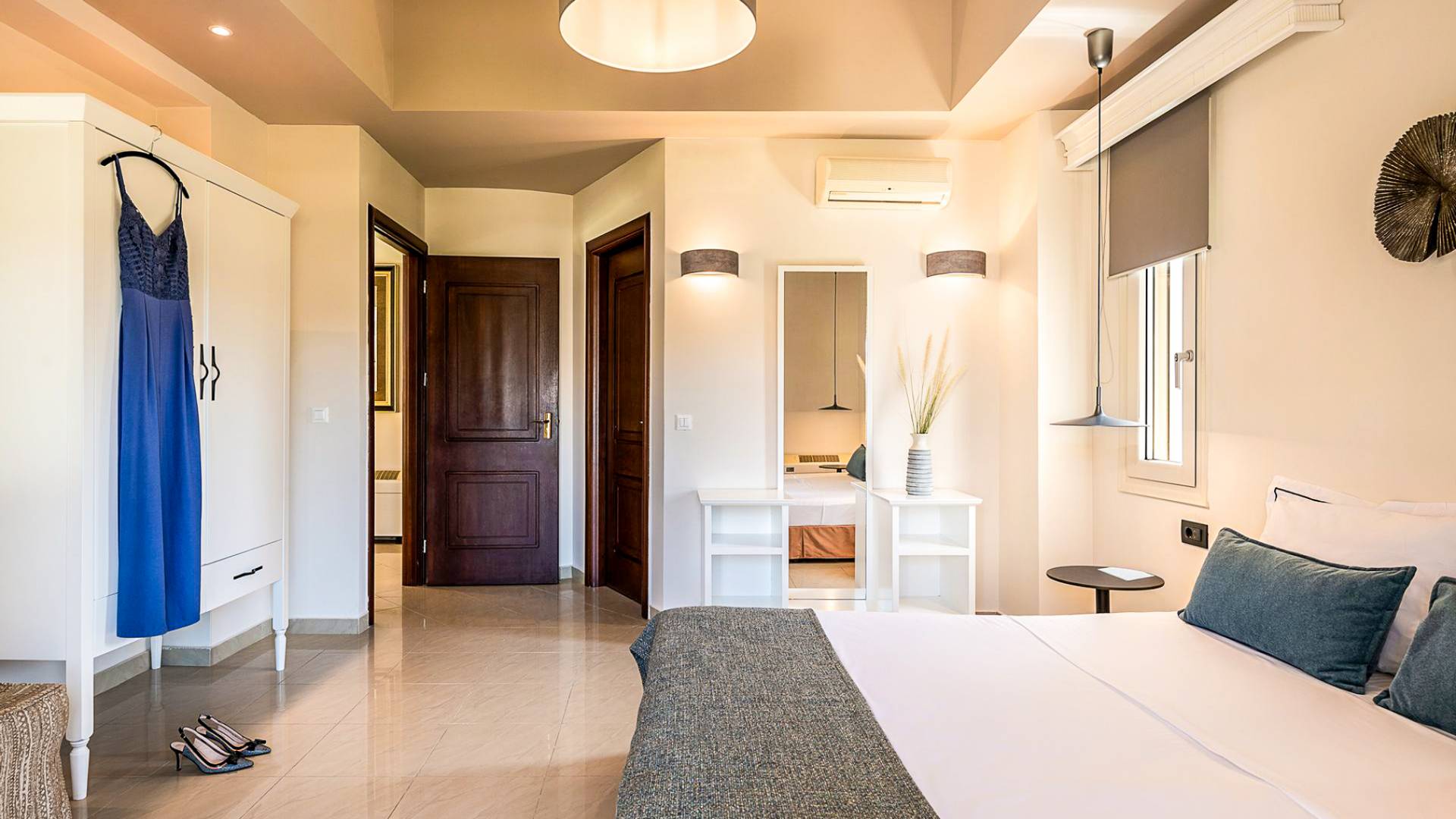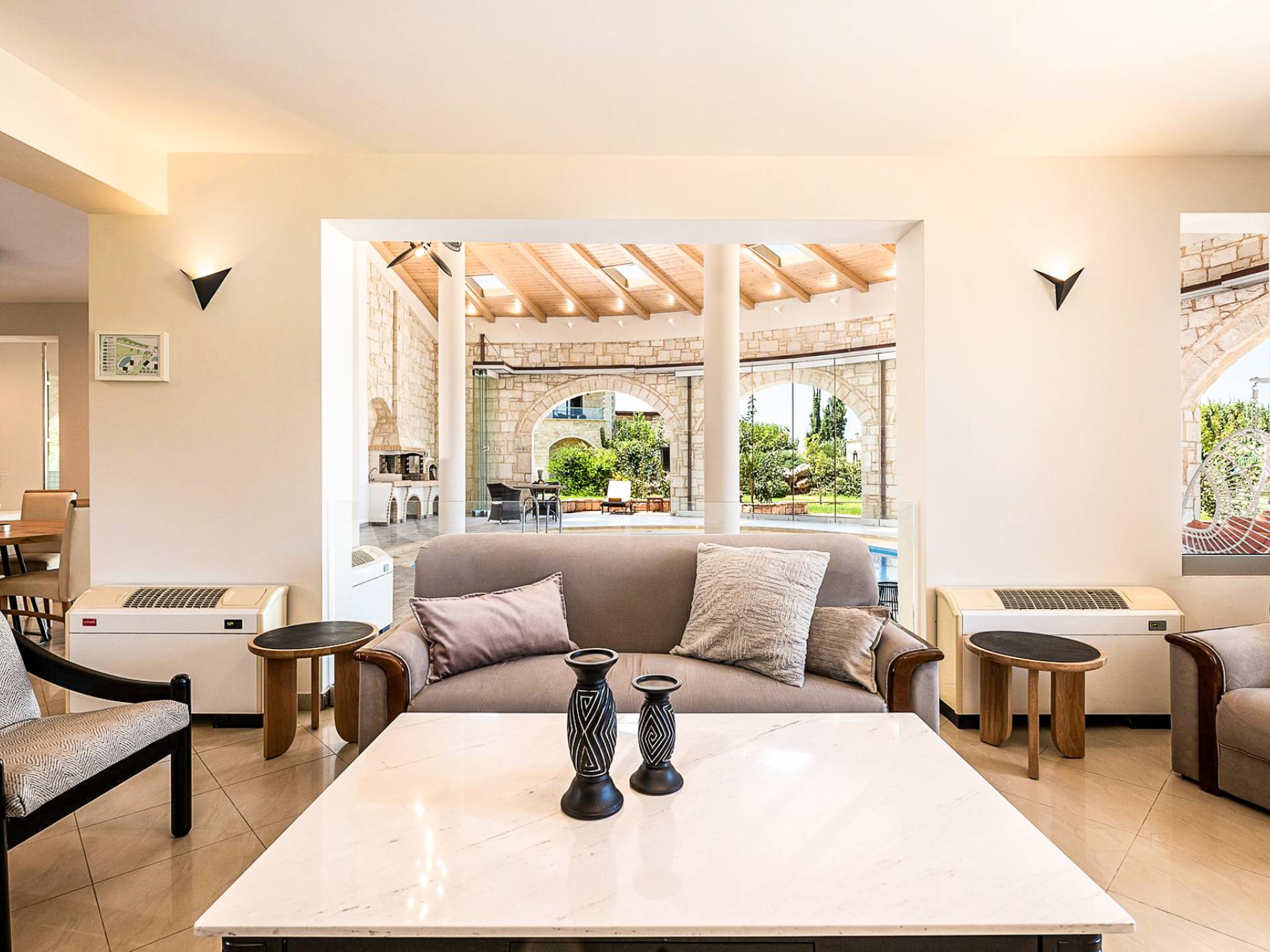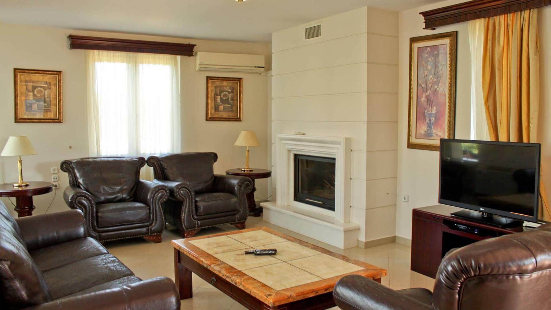 En la planta baja, hay una cómoda y lujosa sala de estar y comedor con chimenea y barbacoa que está conectada con una piscina interior privada que brinda privacidad y elegante confort. Un dormitorio individual con un aseo más se encuentra en la planta baja. También hay un aseo y una habitación adicional con dos camas individuales. En el primer piso, hay tres habitaciones dobles con baños en suite, cabinas con jacuzzi y grandes balcones con vistas a exuberantes jardines. Todas las habitaciones ofrecen TV de pantalla plana de 32 pulgadas, aire acondicionado, muebles de jardín, tumbonas y sombrillas, y calefacción central, lo que hace que la villa sea adecuada para alojarse en cualquier época del año.