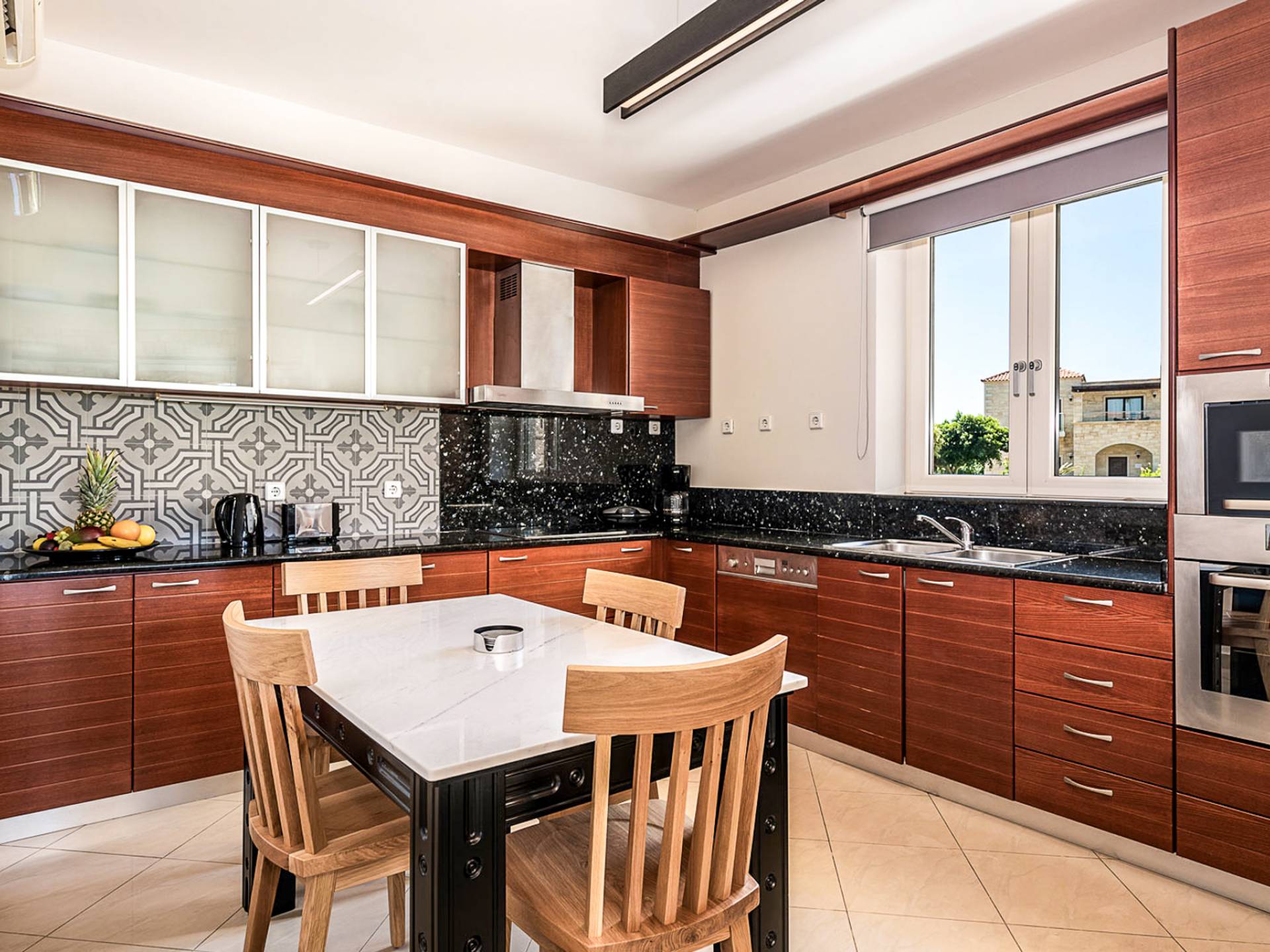 También dispone de TV de plasma, reproductor de DVD, teléfono, acceso gratuito a Internet Wi-Fi y caja de seguridad, así como una cocina totalmente equipada con todos los electrodomésticos modernos, como nevera / congelador, horno / vitrocerámica, microondas, lavavajillas y caldera. , tostadora, cafetera de filtro, plancha y tabla de planchar. Una lavadora se proporciona en cada habitación de cada villa. Cada Villa tiene también su propio estacionamiento privado.
