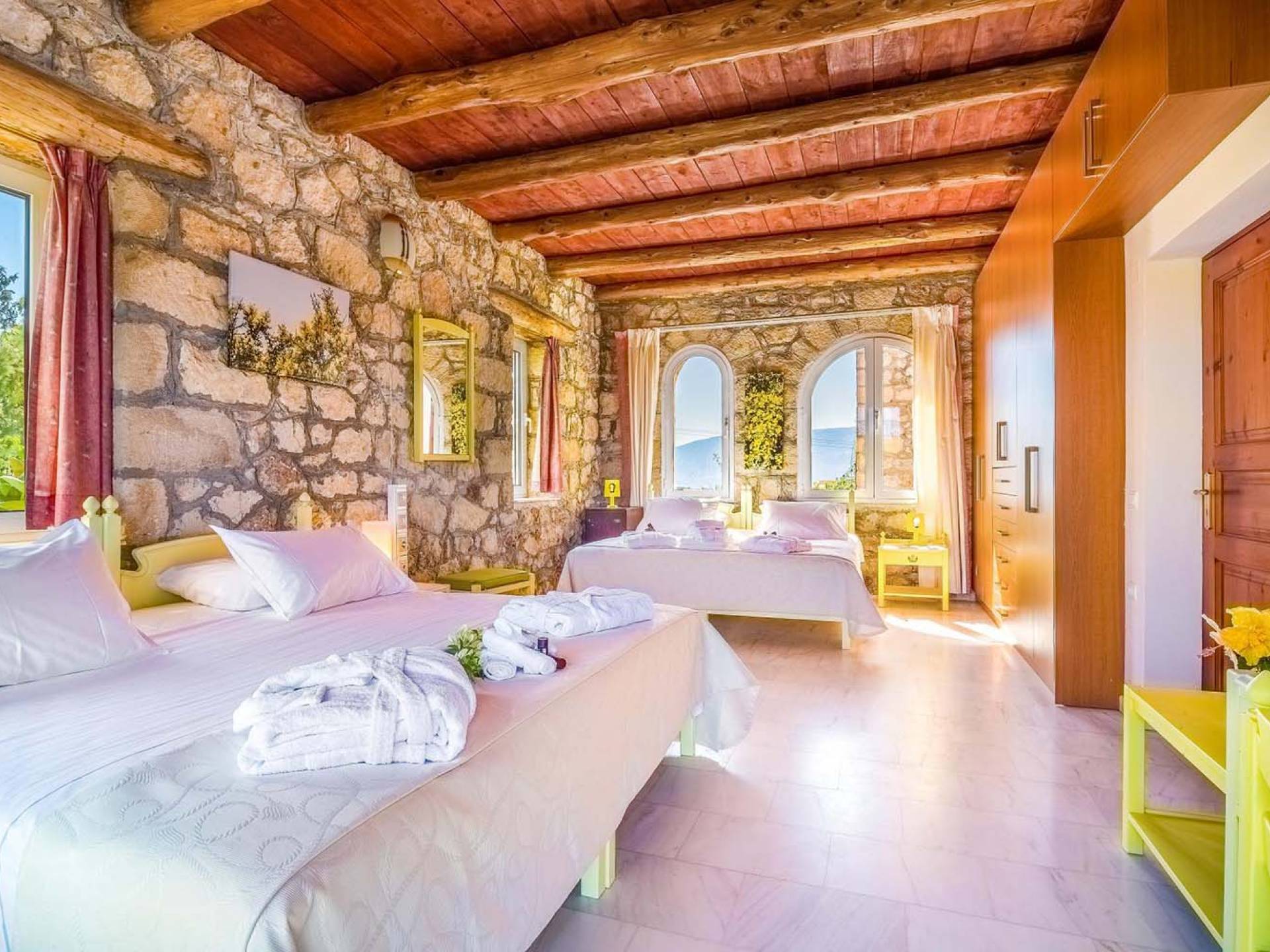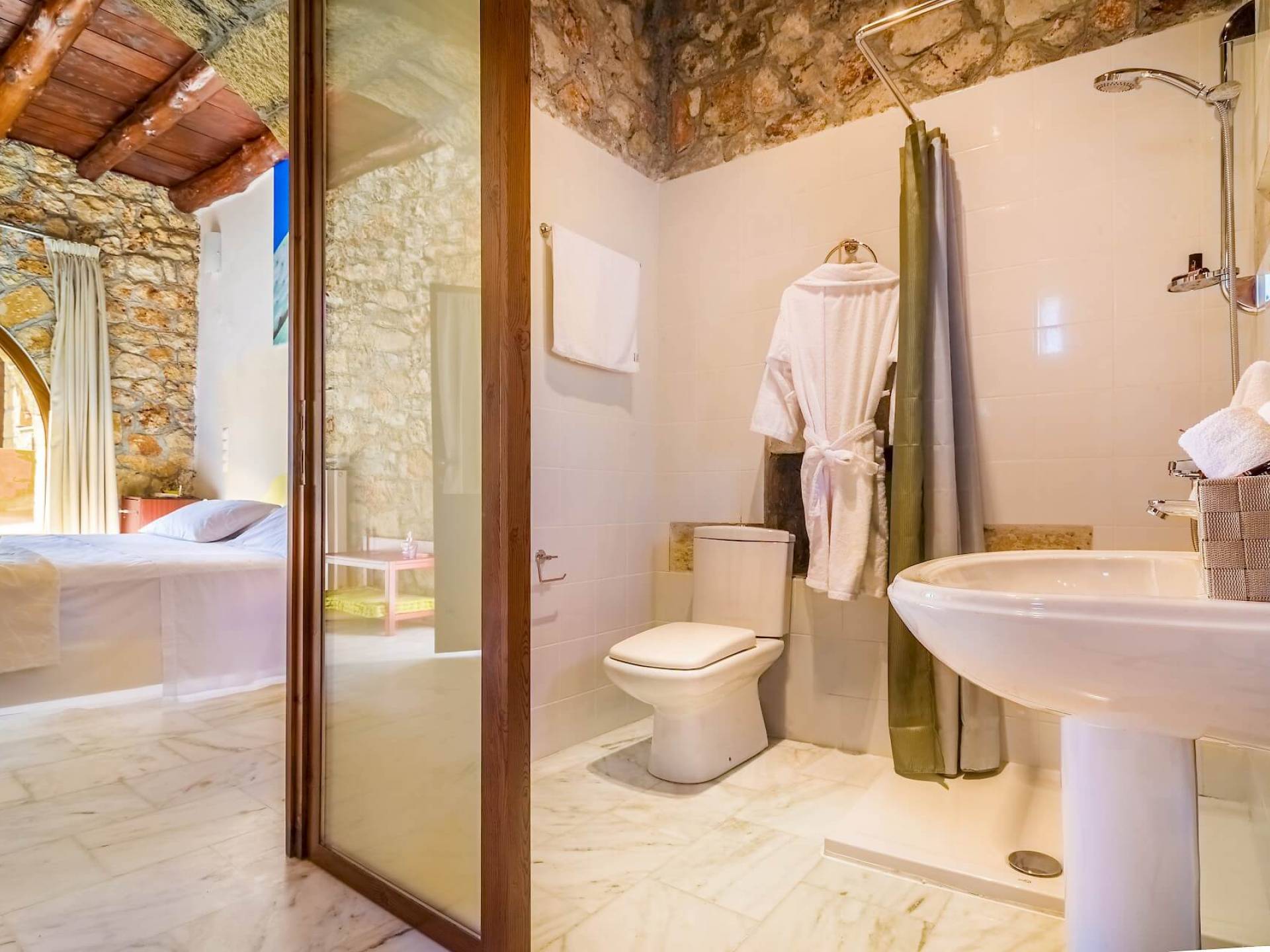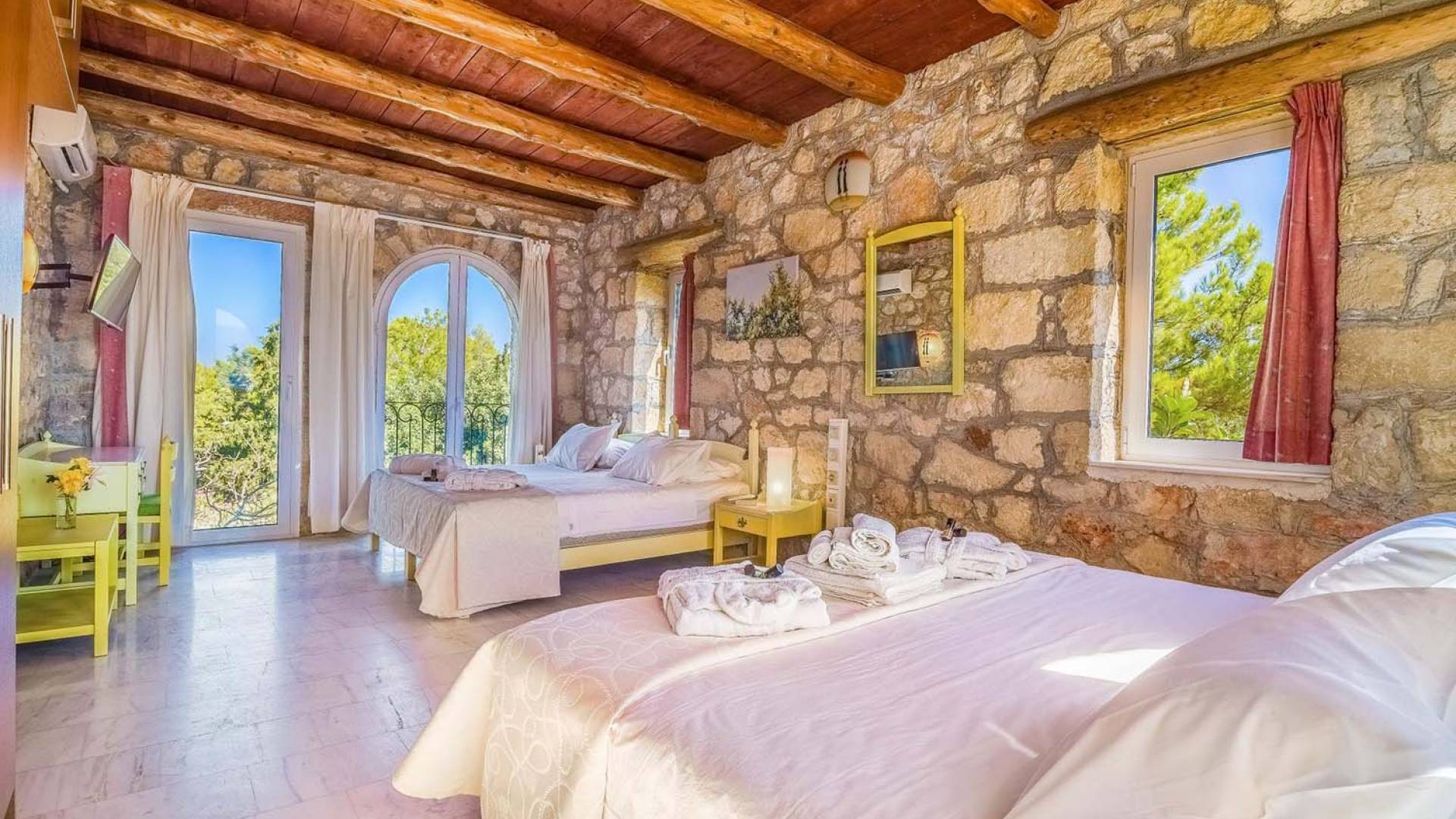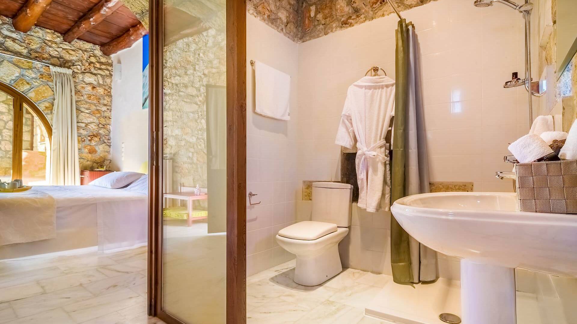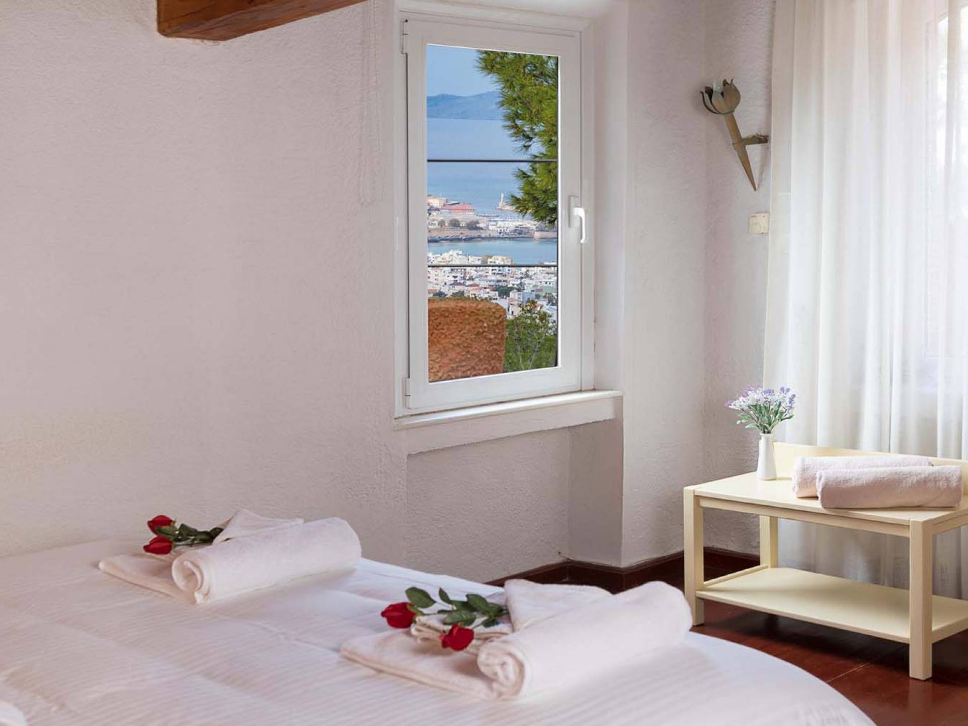 Castle Villa Chania se divide en 2 alas, con dos escaleras que conducen a los pisos superiores. A su derecha, encontrará dos dormitorios (uno con 2 camas tamaño king que se pueden convertir en 4 individuales) y un dormitorio principal con una cama tamaño queen que conduce a un hermoso balcón con vista al puerto veneciano de Chania. Estos dos dormitorios comparten un gran baño con bañera. En el otro ala a su izquierda, encontrará un dormitorio principal con baño en suite con cama de matrimonio. Esta habitación te lleva a la terraza principal, la vista desde allí es impresionante. En el tercer piso, hay una sala de galería que es una sala de espacio abierto, tiene un sofá cama y un pequeño balcón.