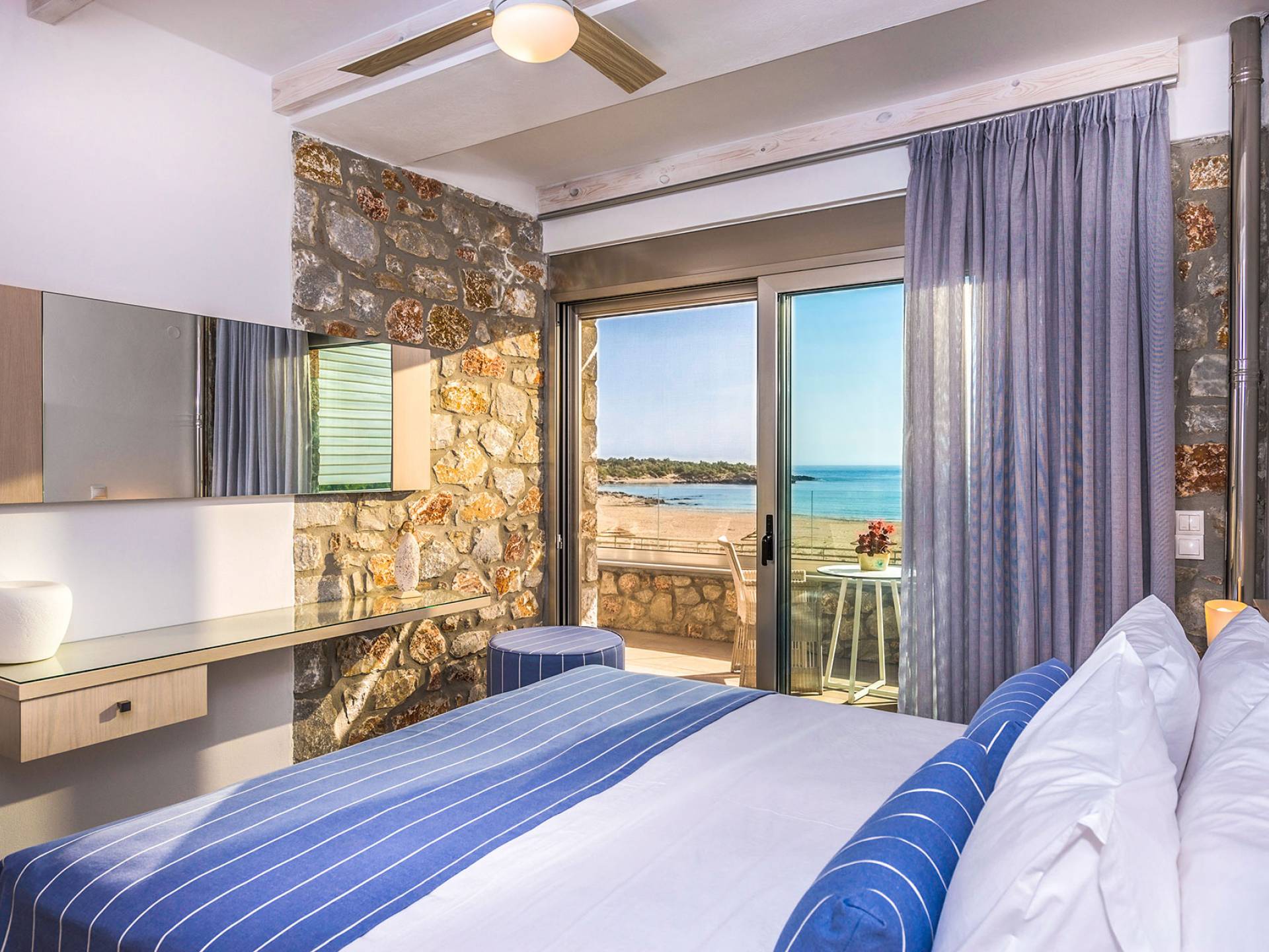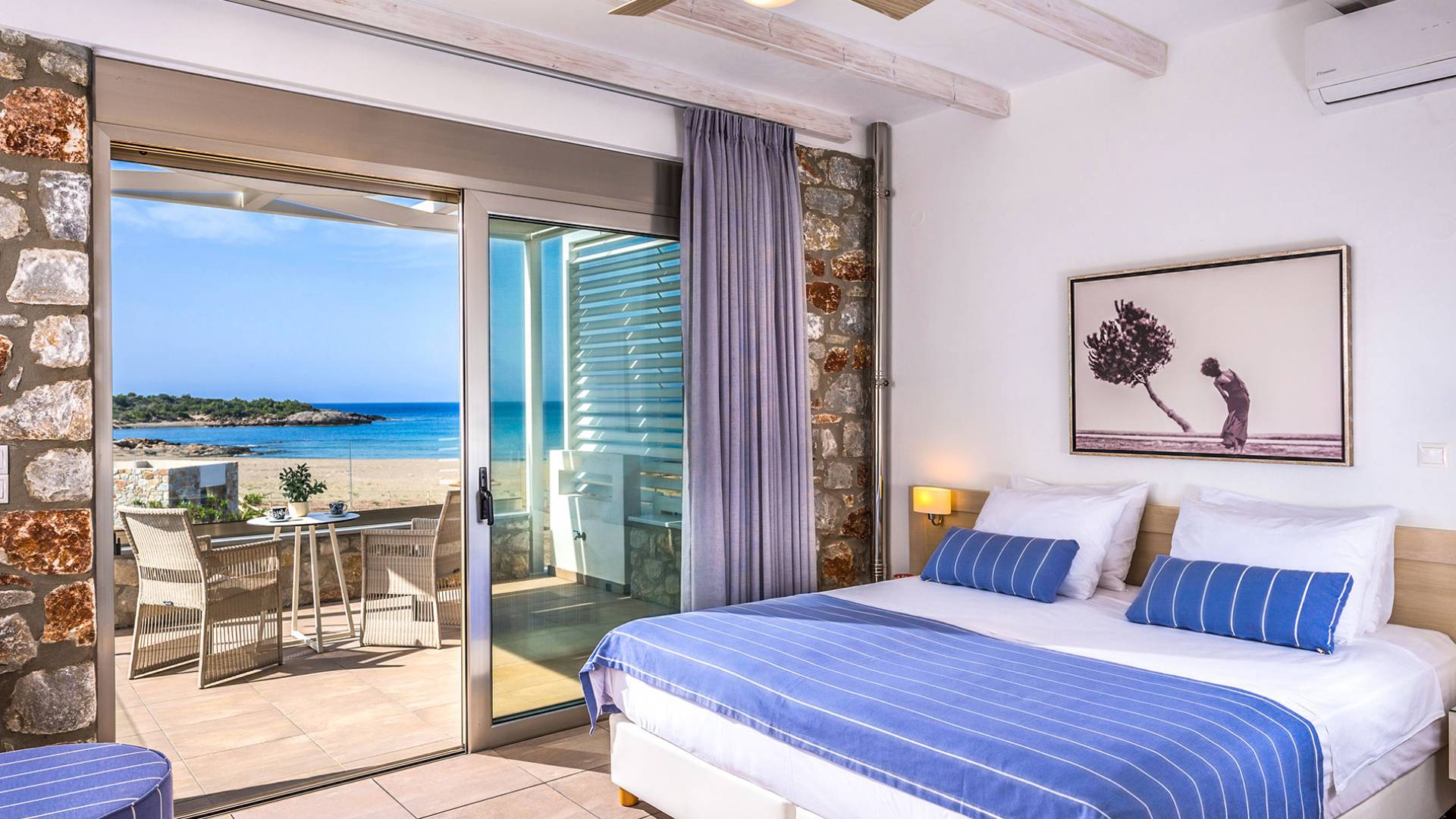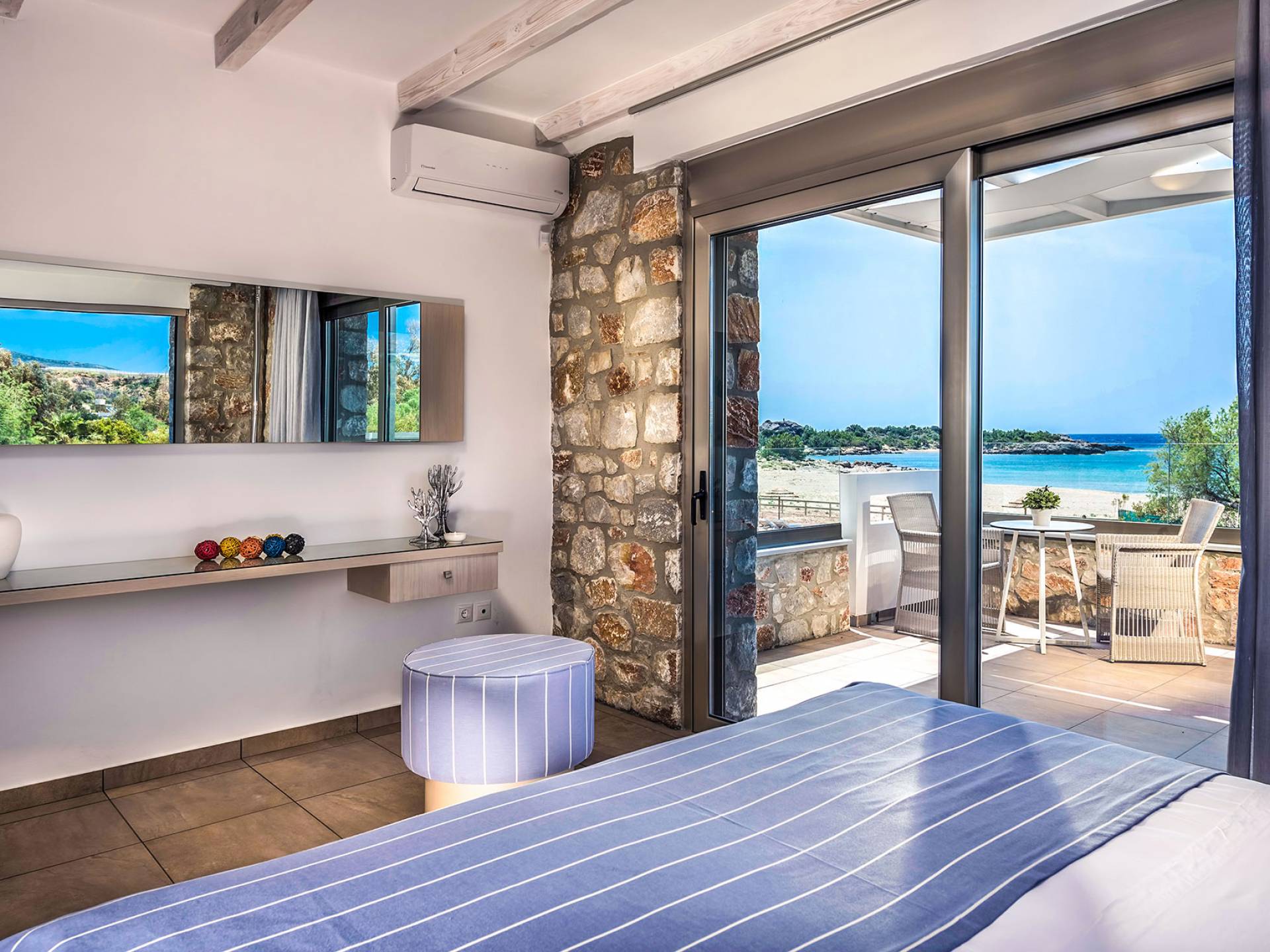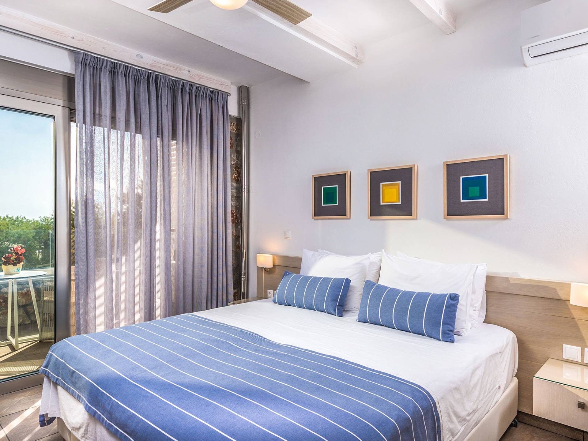 Pasando al piso superior, Kedros Villa Chania tiene una elegante habitación doble, decorada en tonos pastel azules con un amplio espacio de guardarropas. El dormitorio tiene un baño en suite, diseñado en líneas limpias con azulejos color arena, muebles contemporáneos y accesorios modernos. Por último, pero no menos importante, el dormitorio se beneficia de una terraza privada con majestuosas vistas a la playa donde podrá disfrutar de todos los cambios de color del horizonte, desde el atardecer hasta el amanecer. Kedros Villa Chania está equipada con un ventilador de techo en el dormitorio y dos unidades de aire acondicionado. Estos se pueden utilizar tanto para refrigeración como para calefacción. Durante el invierno, los huéspedes también pueden utilizar la estufa de pellets en el salón principal que calienta tanto el dormitorio como la planta baja.