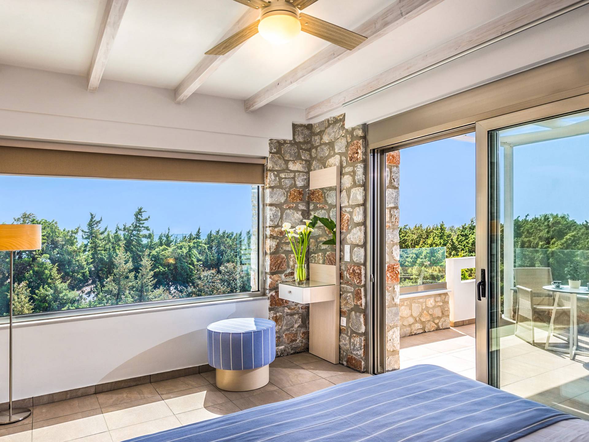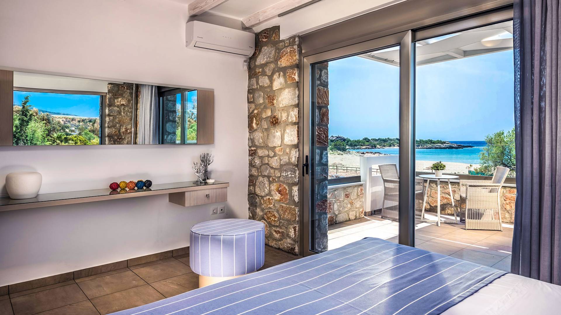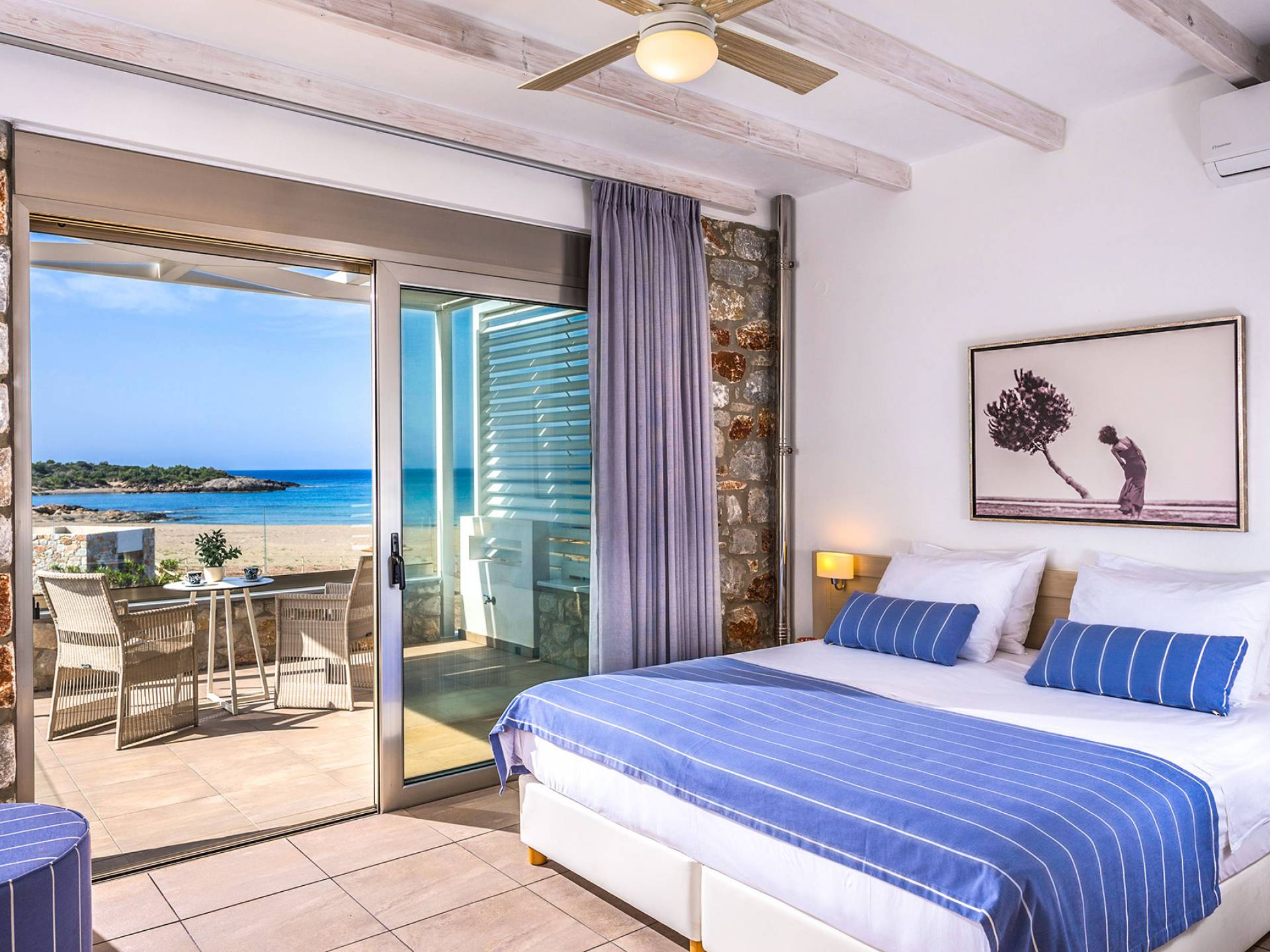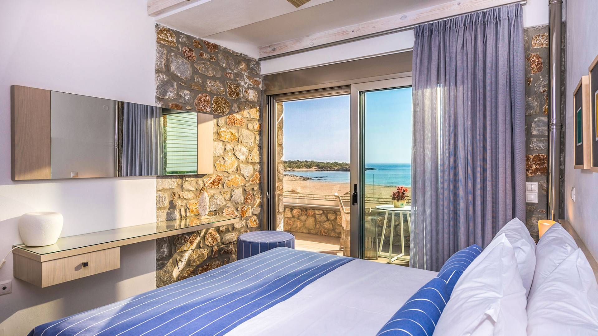 Pasando al piso superior, Kedros Villa Chania tiene una elegante habitación doble, decorada en tonos pastel azules con un amplio espacio de guardarropas. El dormitorio tiene un baño en suite, diseñado en líneas limpias con azulejos color arena, muebles contemporáneos y accesorios modernos. Por último, pero no menos importante, el dormitorio se beneficia de una terraza privada con majestuosas vistas a la playa donde podrá disfrutar de todos los cambios de color del horizonte, desde el atardecer hasta el amanecer. Kedros Villa Chania está equipada con un ventilador de techo en el dormitorio y dos unidades de aire acondicionado. Estos se pueden utilizar tanto para refrigeración como para calefacción. Durante el invierno, los huéspedes también pueden utilizar la estufa de pellets en el salón principal que calienta tanto el dormitorio como la planta baja.