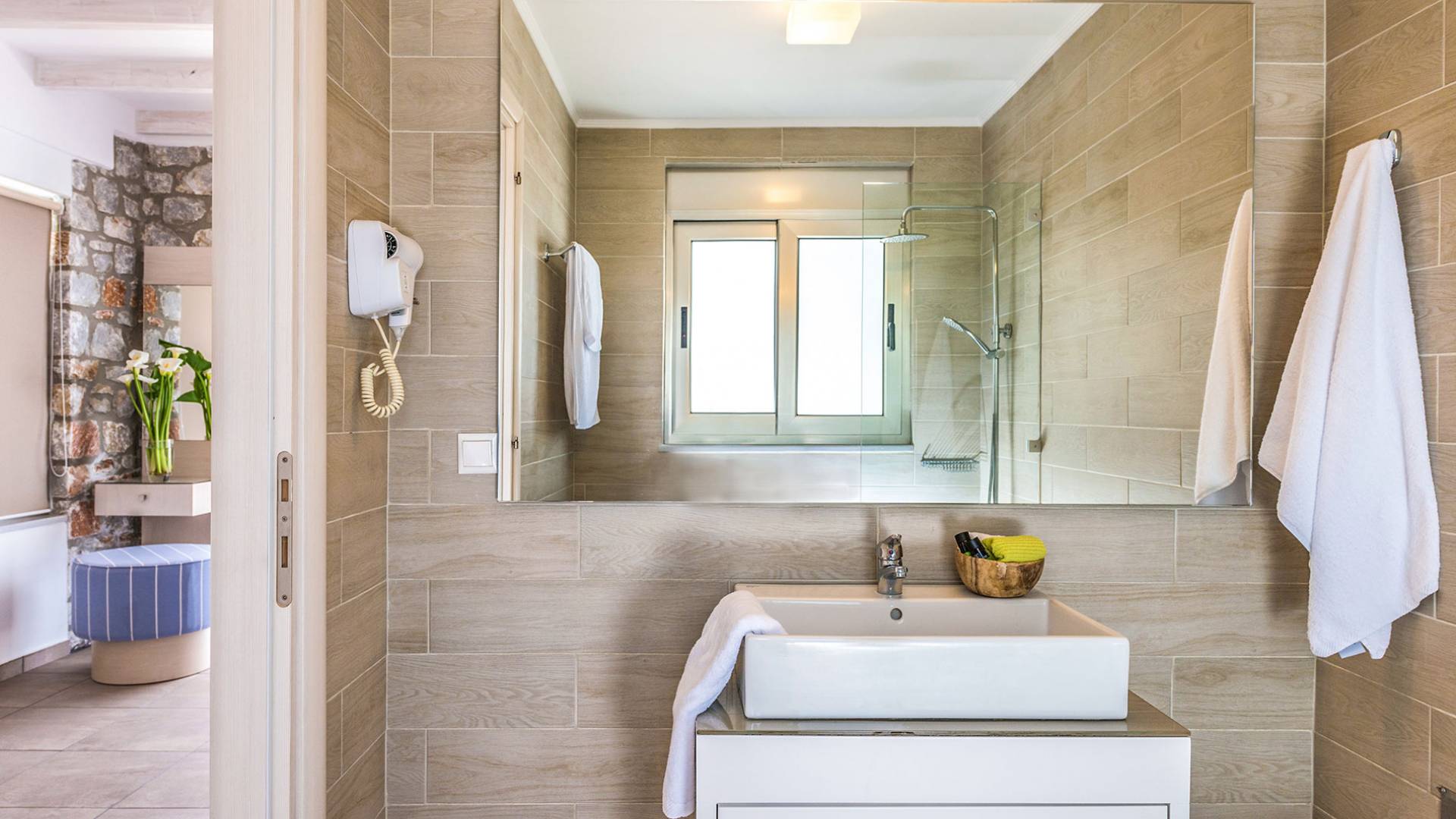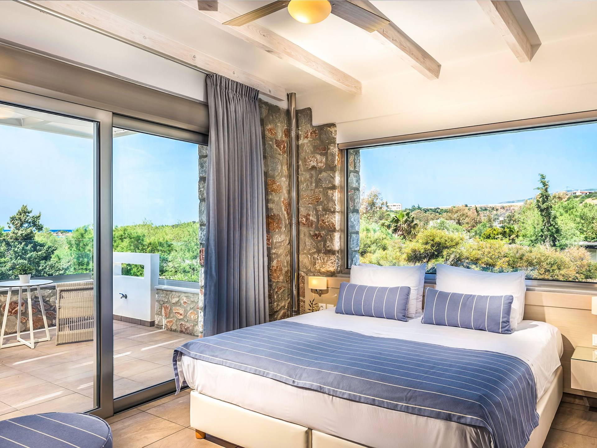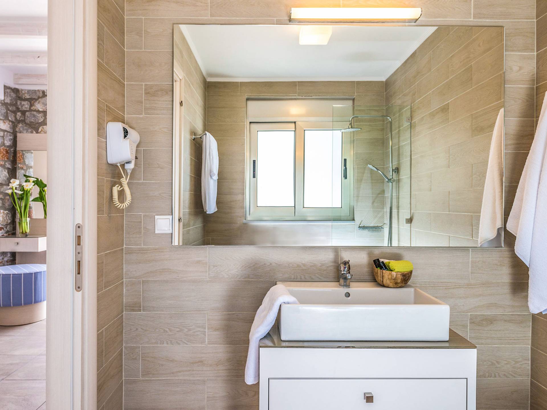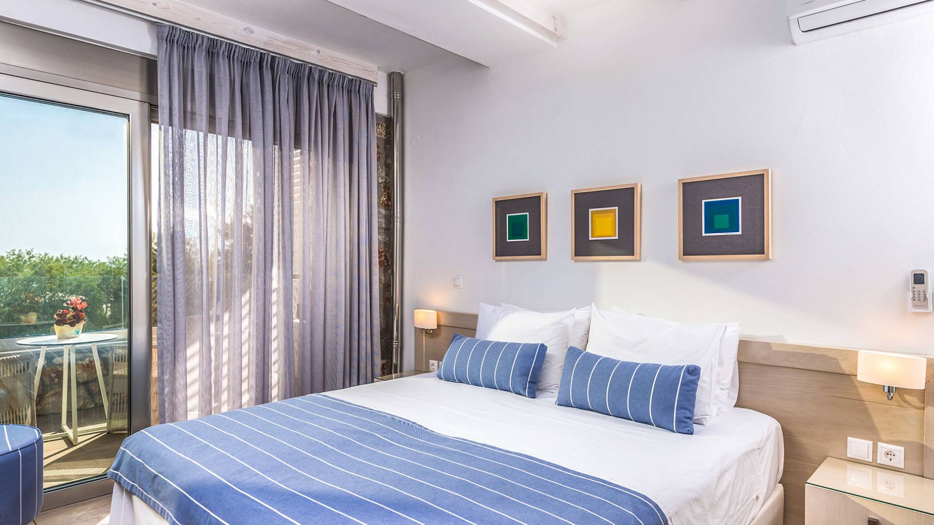 Pasando al piso superior, Kedros Villa Chania tiene una elegante habitación doble, decorada en tonos pastel azules con un amplio espacio de guardarropas. El dormitorio tiene un baño en suite, diseñado en líneas limpias con azulejos color arena, muebles contemporáneos y accesorios modernos. Por último, pero no menos importante, el dormitorio se beneficia de una terraza privada con majestuosas vistas a la playa donde podrá disfrutar de todos los cambios de color del horizonte, desde el atardecer hasta el amanecer. Kedros Villa Chania está equipada con un ventilador de techo en el dormitorio y dos unidades de aire acondicionado. Estos se pueden utilizar tanto para refrigeración como para calefacción. Durante el invierno, los huéspedes también pueden utilizar la estufa de pellets en el salón principal que calienta tanto el dormitorio como la planta baja.