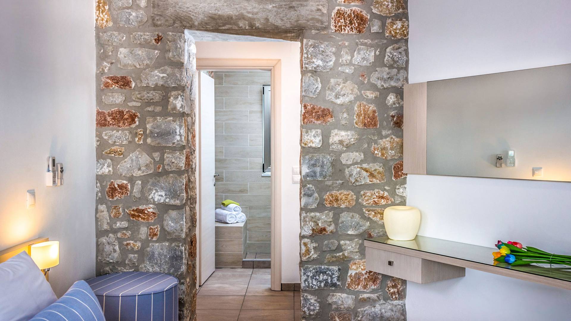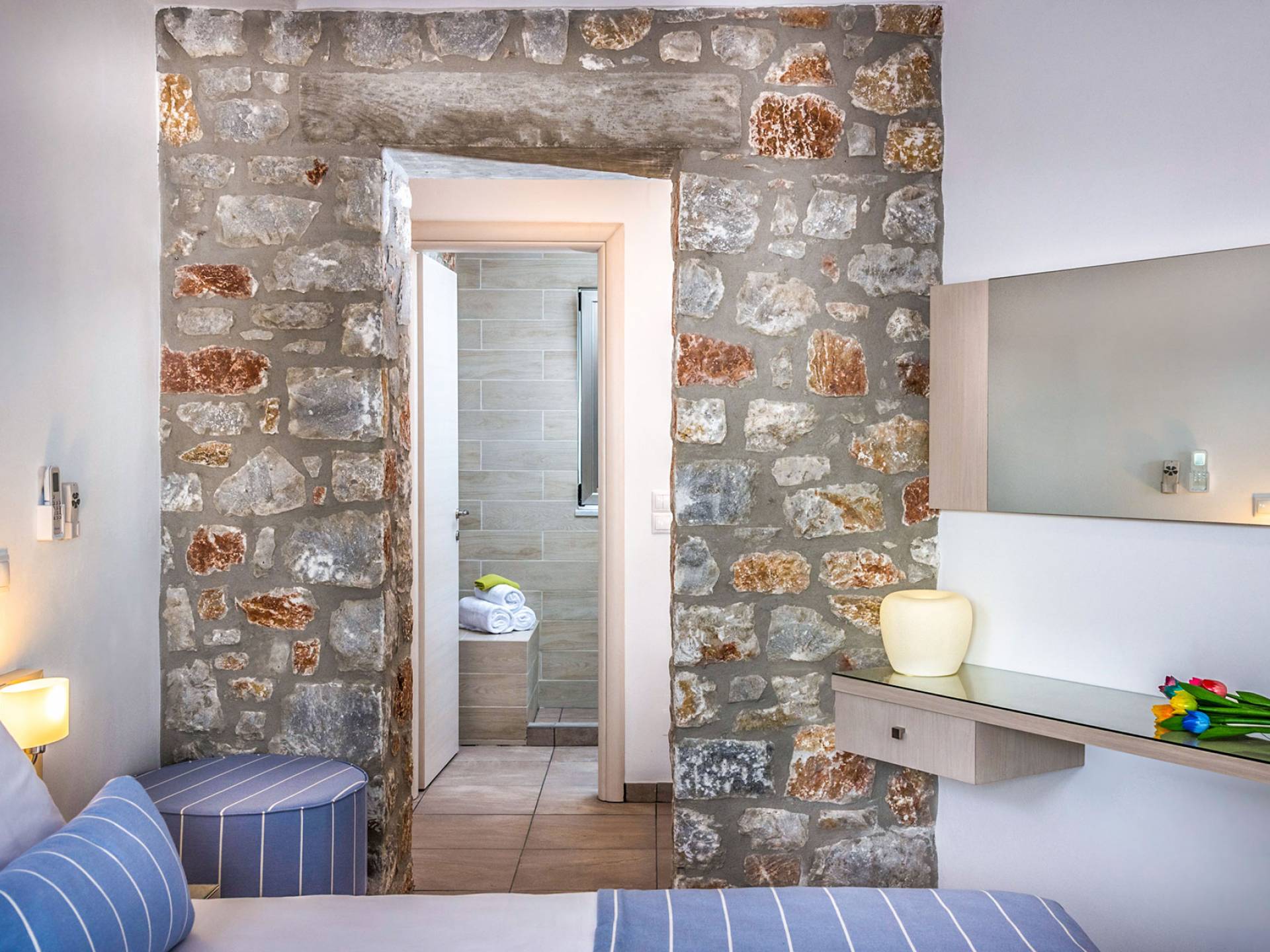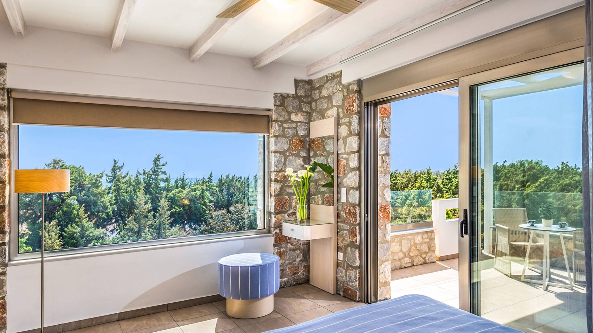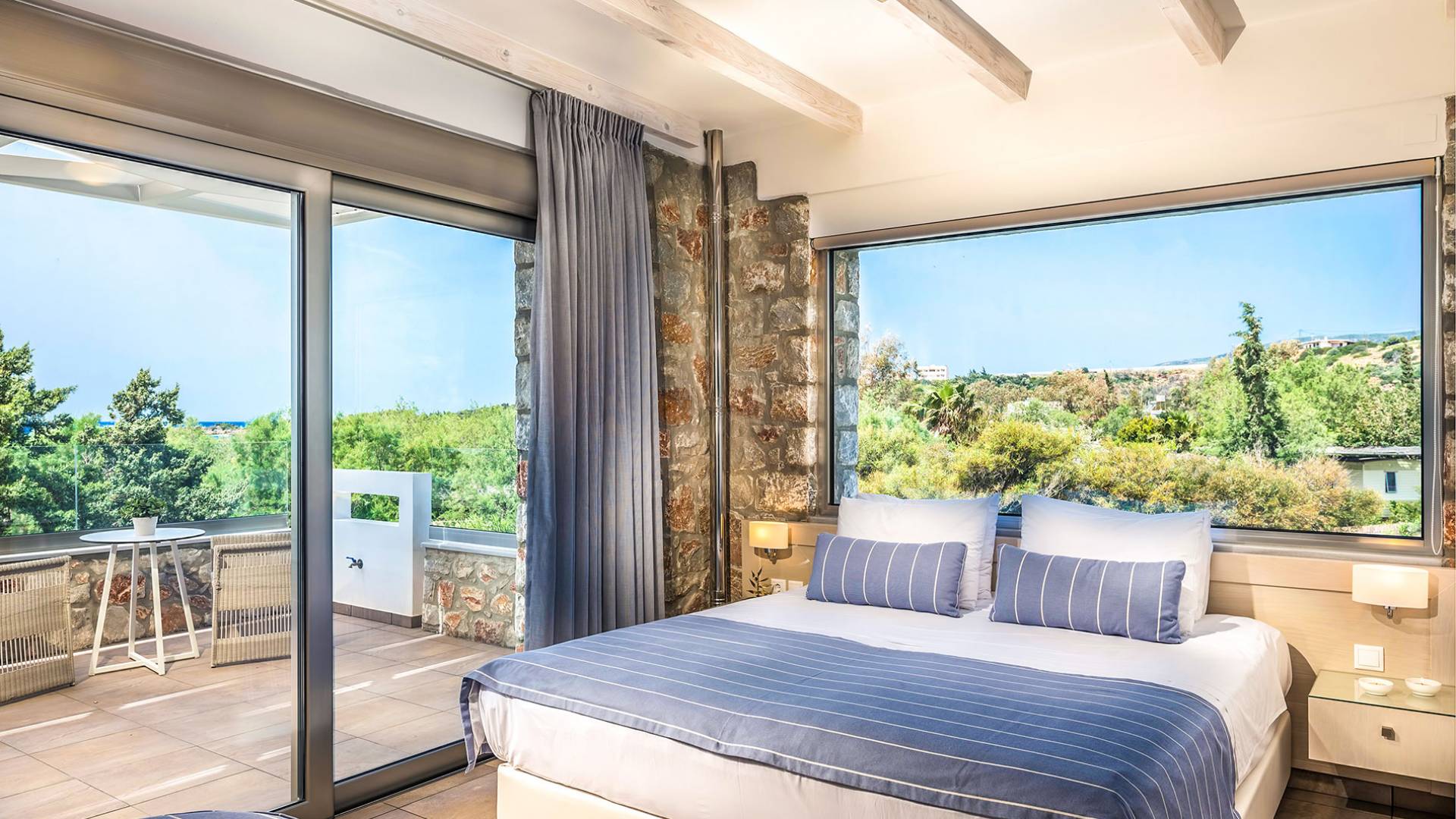 Pasando al piso superior, Kedros Villa Chania tiene una elegante habitación doble, decorada en tonos pastel azules con un amplio espacio de guardarropas. El dormitorio tiene un baño en suite, diseñado en líneas limpias con azulejos color arena, muebles contemporáneos y accesorios modernos. Por último, pero no menos importante, el dormitorio se beneficia de una terraza privada con majestuosas vistas a la playa donde podrá disfrutar de todos los cambios de color del horizonte, desde el atardecer hasta el amanecer. Kedros Villa Chania está equipada con un ventilador de techo en el dormitorio y dos unidades de aire acondicionado. Estos se pueden utilizar tanto para refrigeración como para calefacción. Durante el invierno, los huéspedes también pueden utilizar la estufa de pellets en el salón principal que calienta tanto el dormitorio como la planta baja.