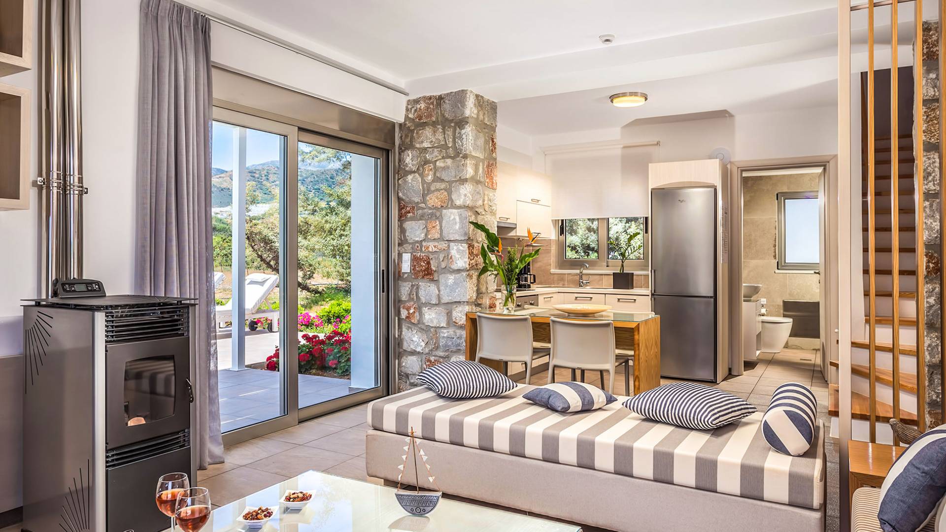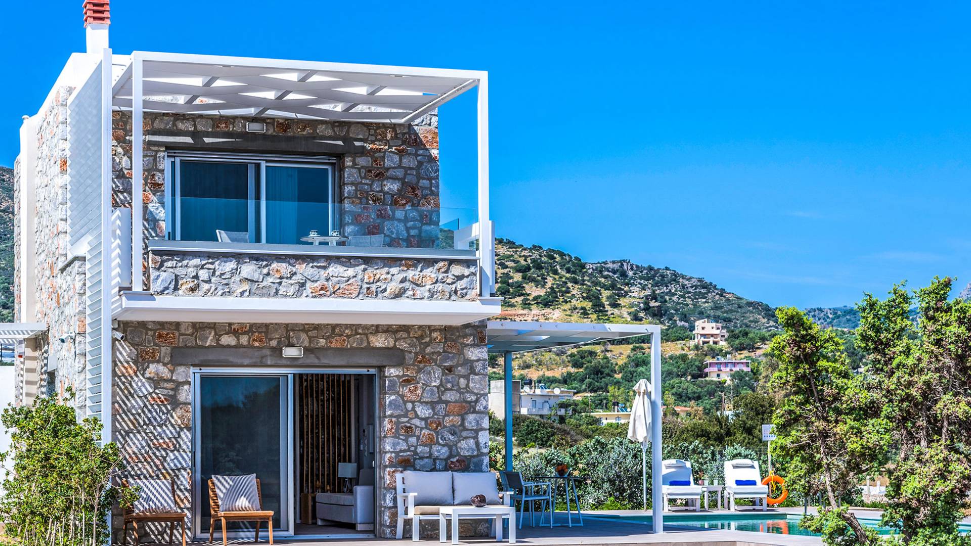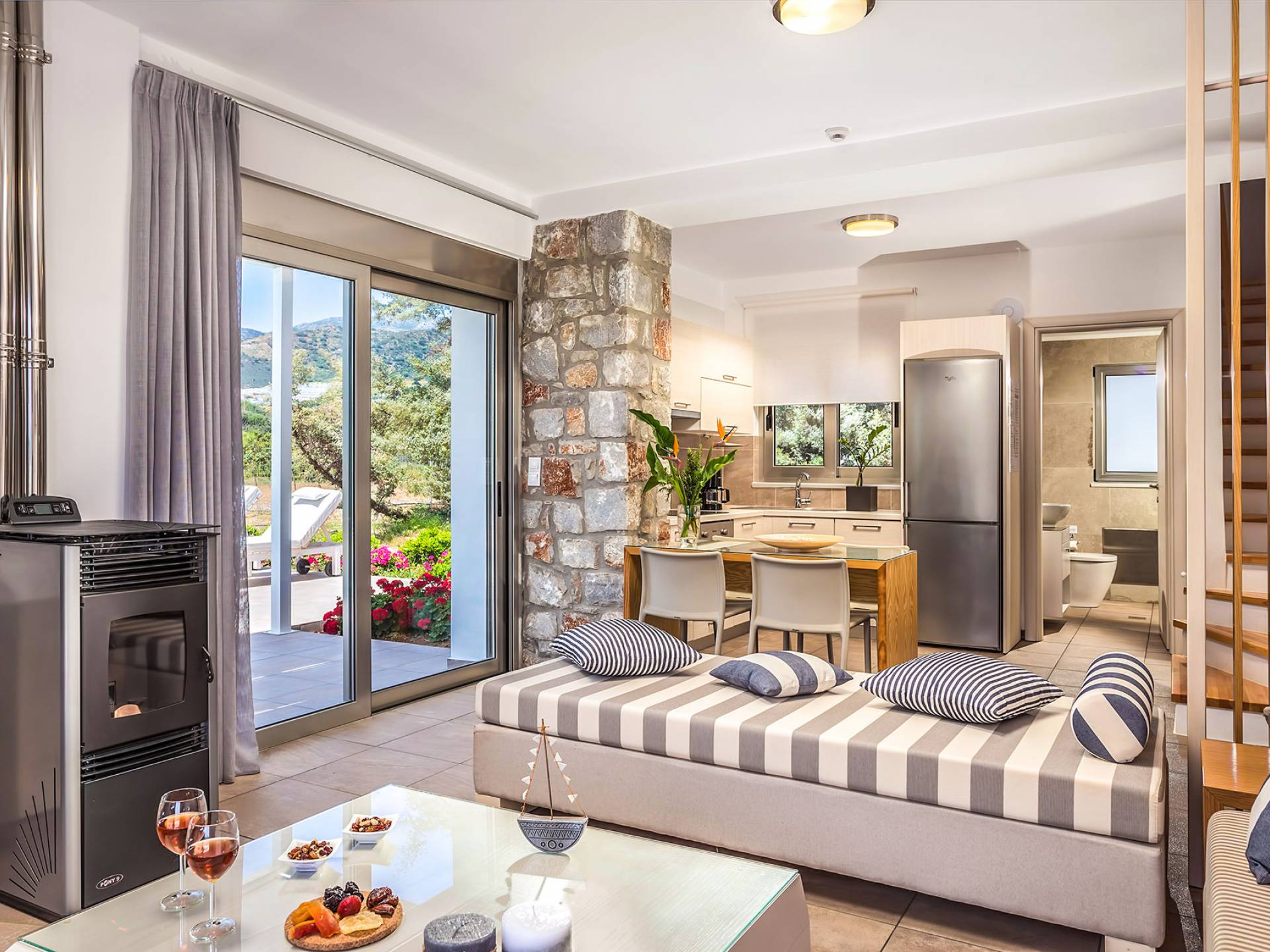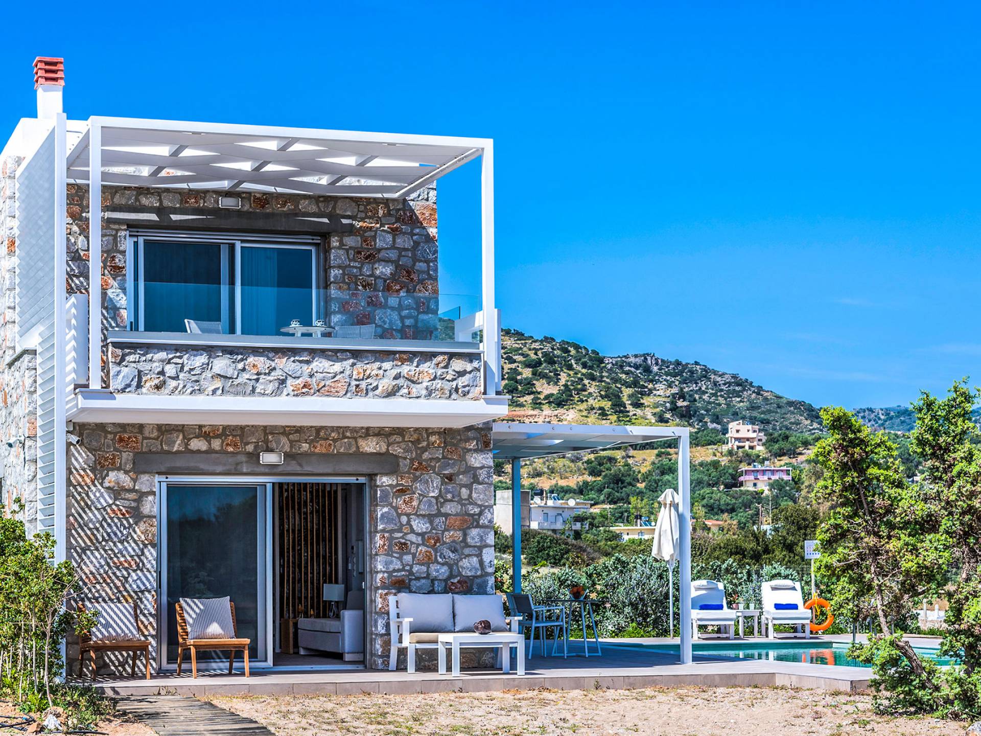 Cada propiedad es una villa independiente de dos plantas con piscina privada y tiene capacidad para 4 adultos. La primera impresión al entrar en la villa es la sutil atmósfera zen que emana. Las paredes encaladas contrastan con las paredes de piedra y enmarcan la sala de estar y el comedor que contienen todas las comodidades que encontraría en un resort de lujo. La cocina abierta está completamente equipada con todos los electrodomésticos necesarios para que pueda preparar fácilmente una comida casera. La planta baja también tiene un elegante baño.