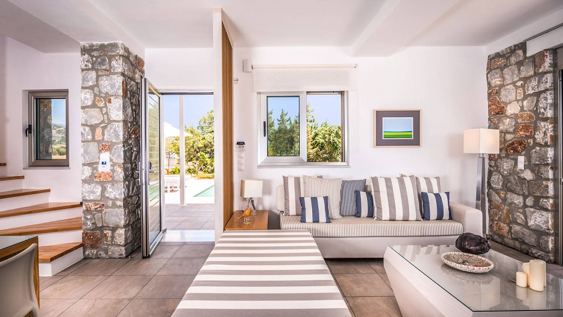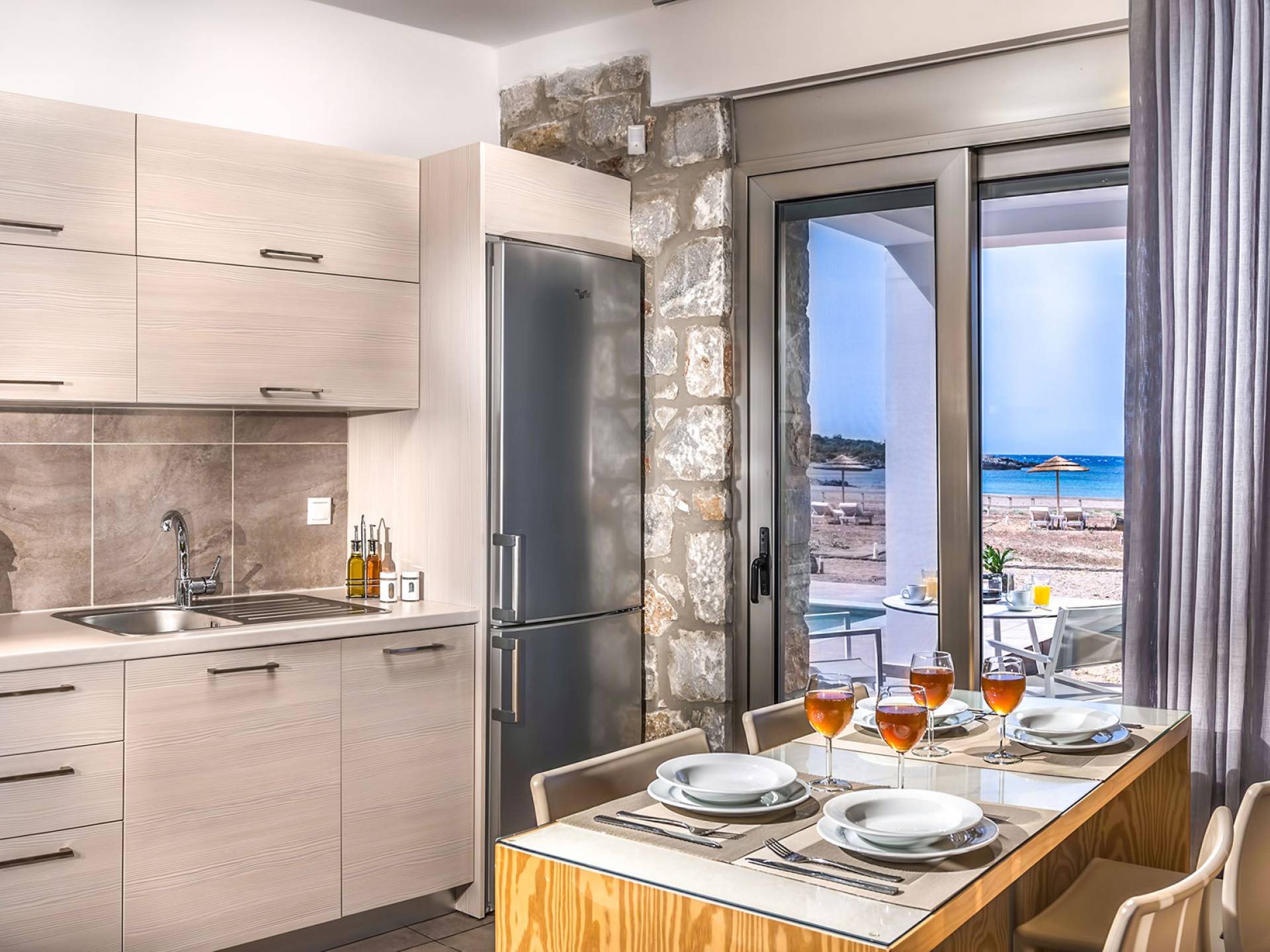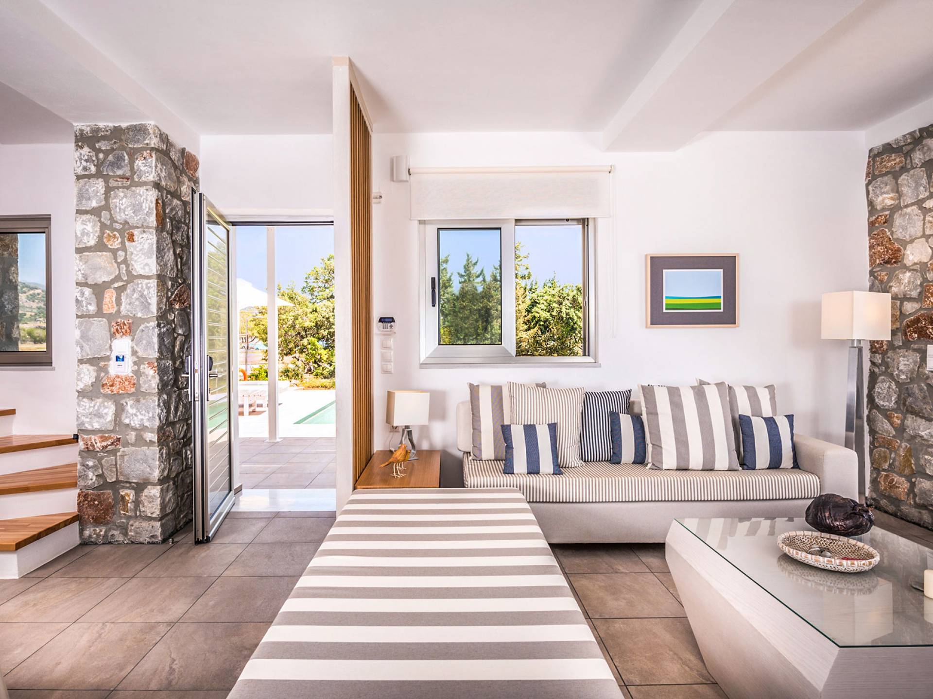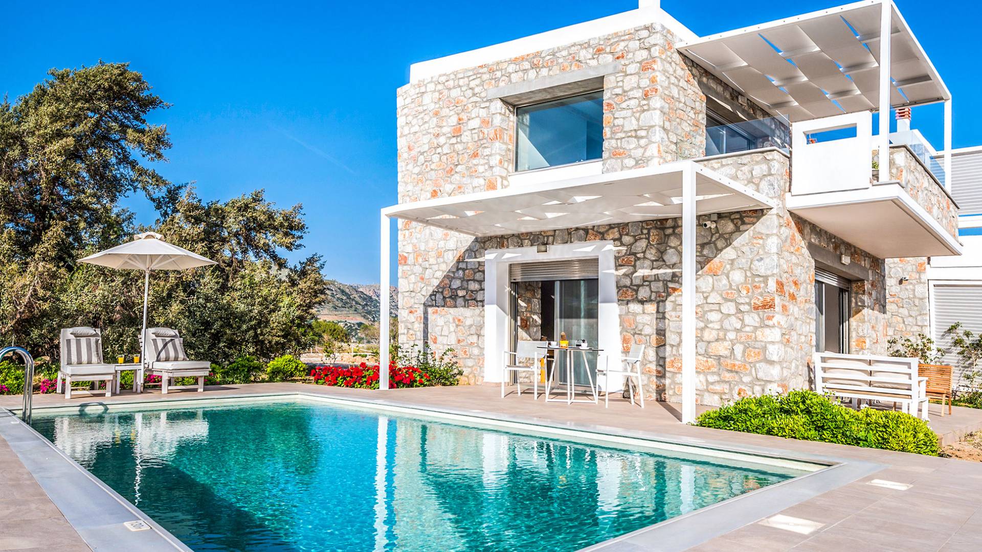 Cada propiedad es una villa independiente de dos plantas con piscina privada y tiene capacidad para 4 adultos. La primera impresión al entrar en la villa es la sutil atmósfera zen que emana. Las paredes encaladas contrastan con las paredes de piedra y enmarcan la sala de estar y el comedor que contienen todas las comodidades que encontraría en un resort de lujo. La cocina abierta está completamente equipada con todos los electrodomésticos necesarios para que pueda preparar fácilmente una comida casera. La planta baja también tiene un elegante baño.