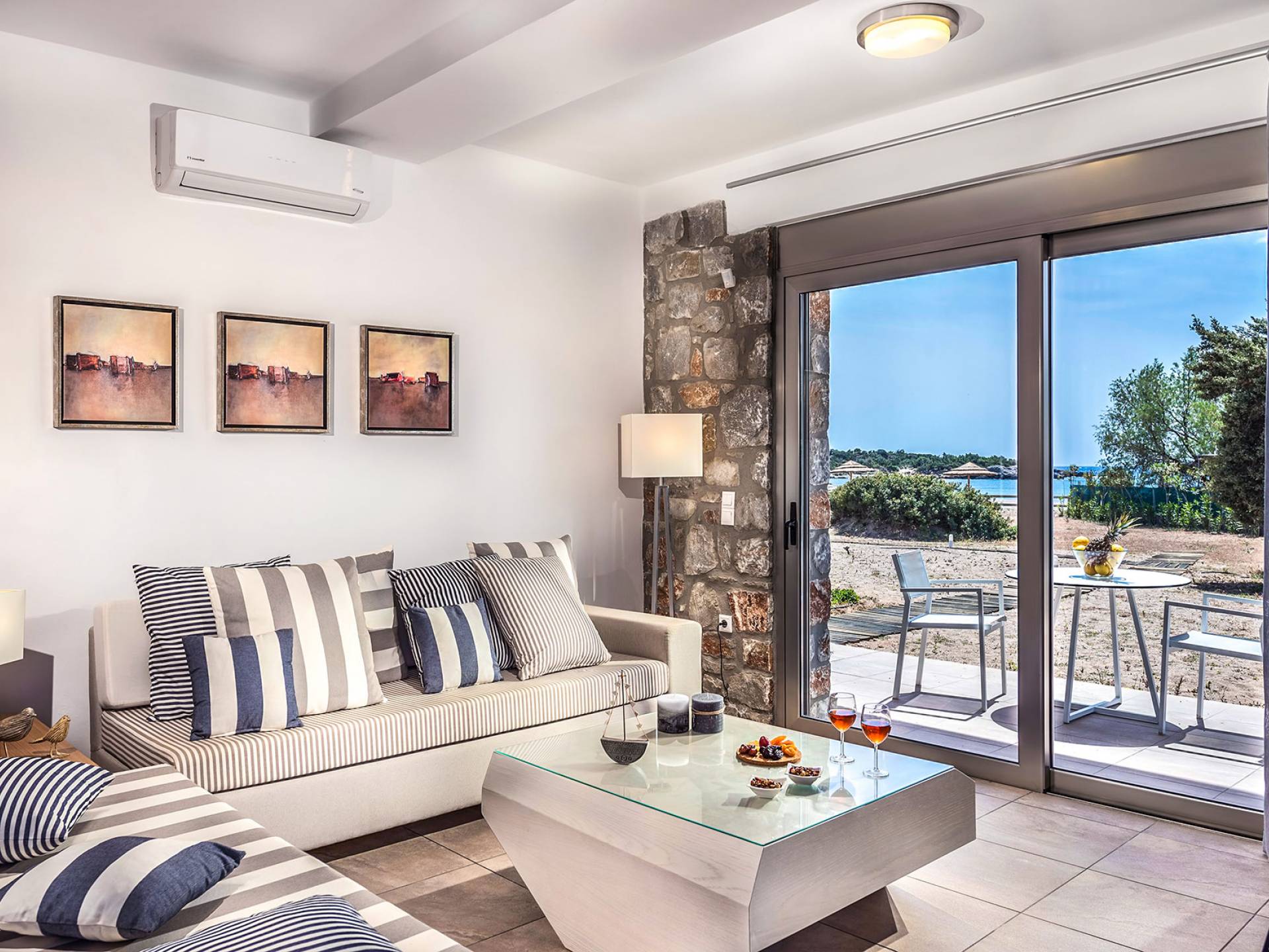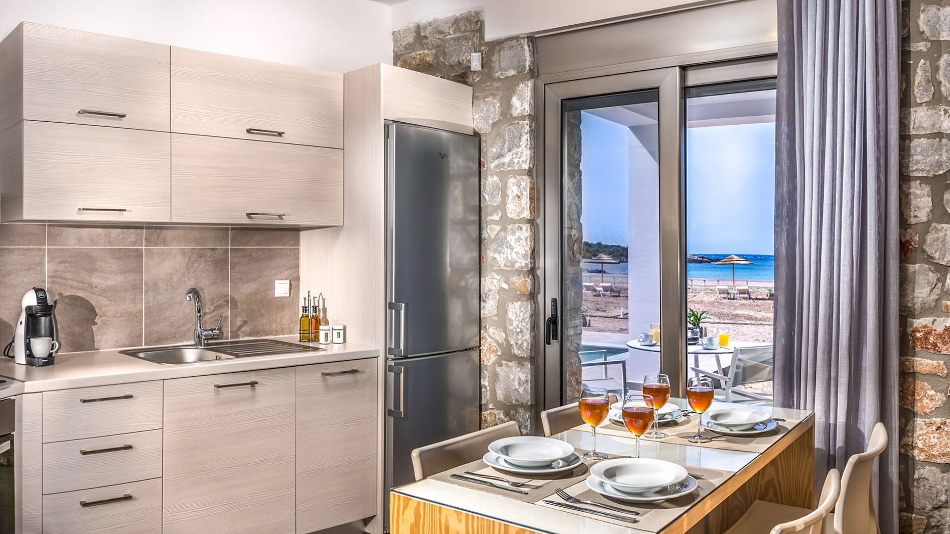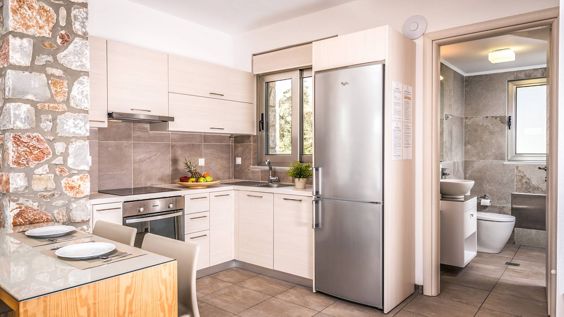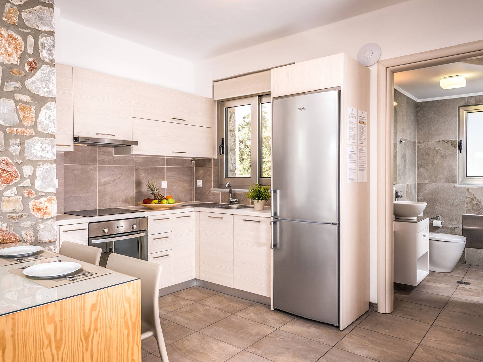 Cada propiedad es una villa independiente de dos plantas con piscina privada y tiene capacidad para 4 adultos. La primera impresión al entrar en la villa es la sutil atmósfera zen que emana. Las paredes encaladas contrastan con las paredes de piedra y enmarcan la sala de estar y el comedor que contienen todas las comodidades que encontraría en un resort de lujo. La cocina abierta está completamente equipada con todos los electrodomésticos necesarios para que pueda preparar fácilmente una comida casera. La planta baja también tiene un elegante baño.