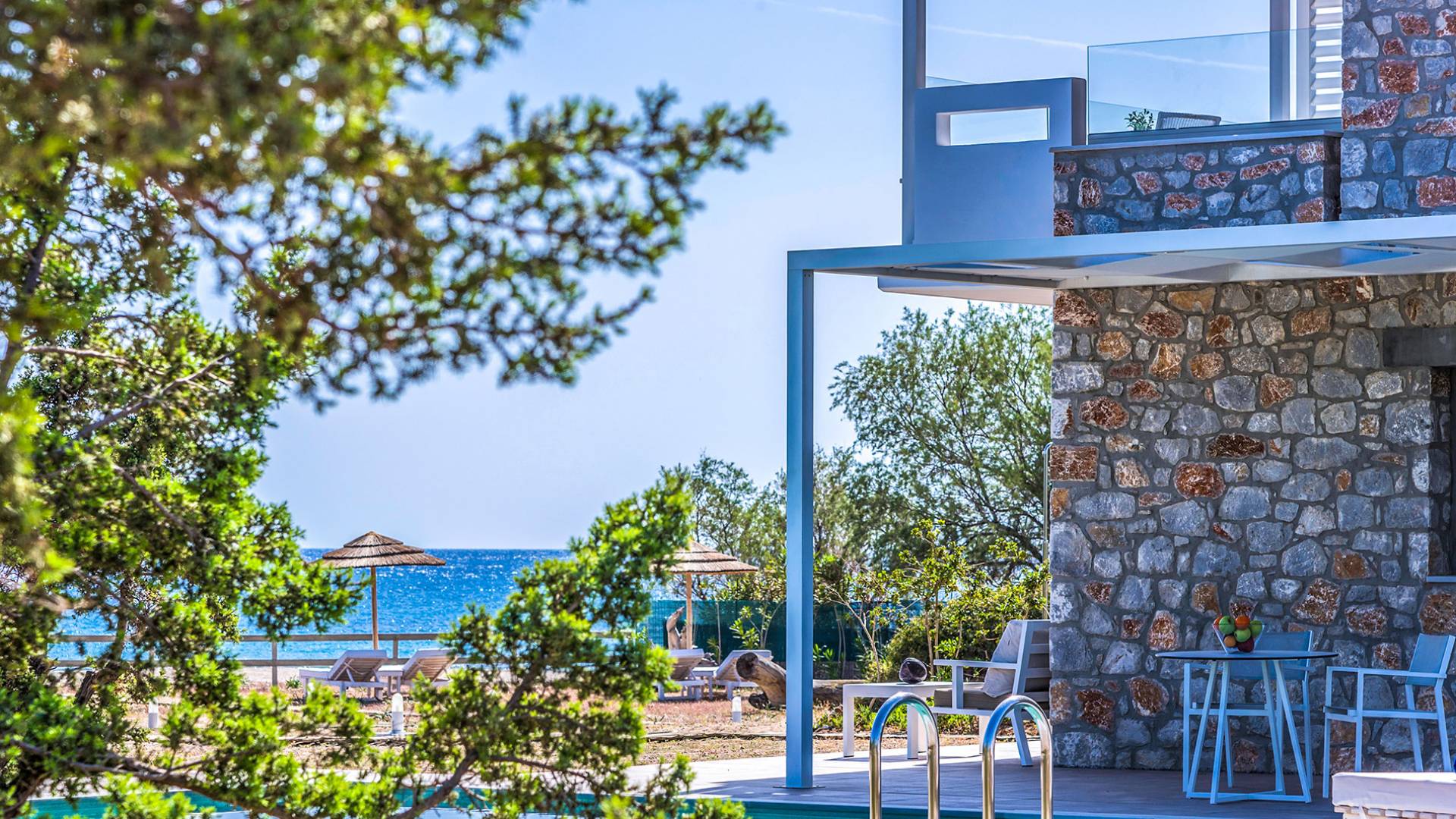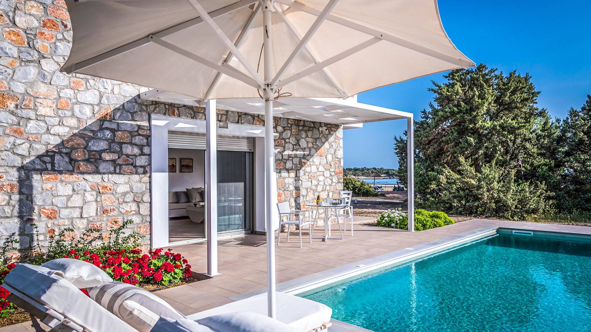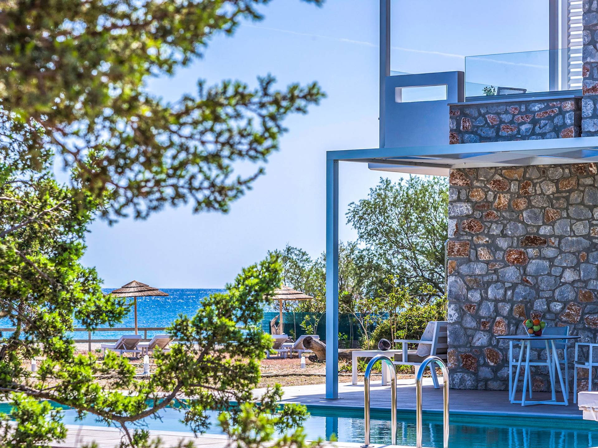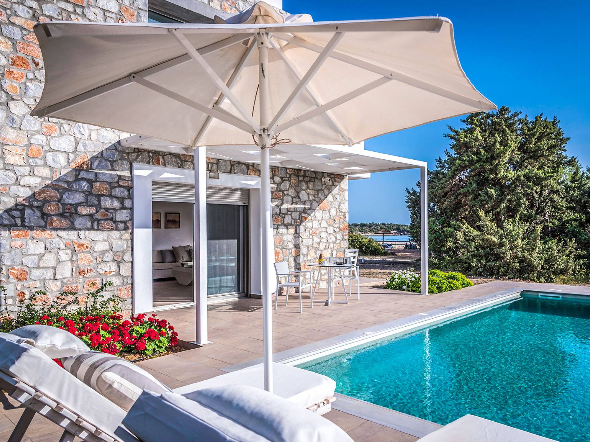 Moviéndose al aire libre, puede hacer un gran esfuerzo para elegir entre su piscina privada de 32 m2 y las dos playas, todo a poca distancia. Su sala de estar personal bajo la sombra de la pérgola o sus tumbonas de madera personales junto a la piscina o junto al mar, le ofrecerán una opción para relajarse. Además podrá disfrutar de deliciosos snacks y refrescos del chiringuito (solo en temporada de verano).