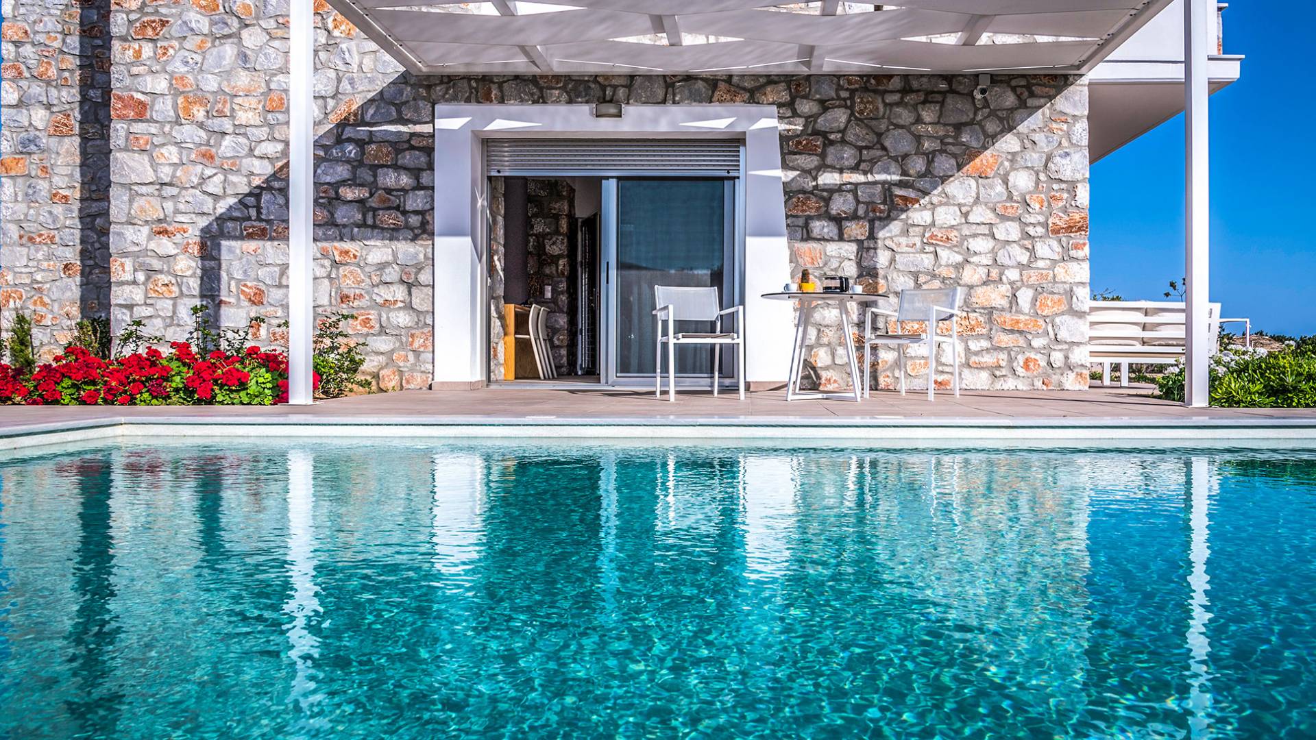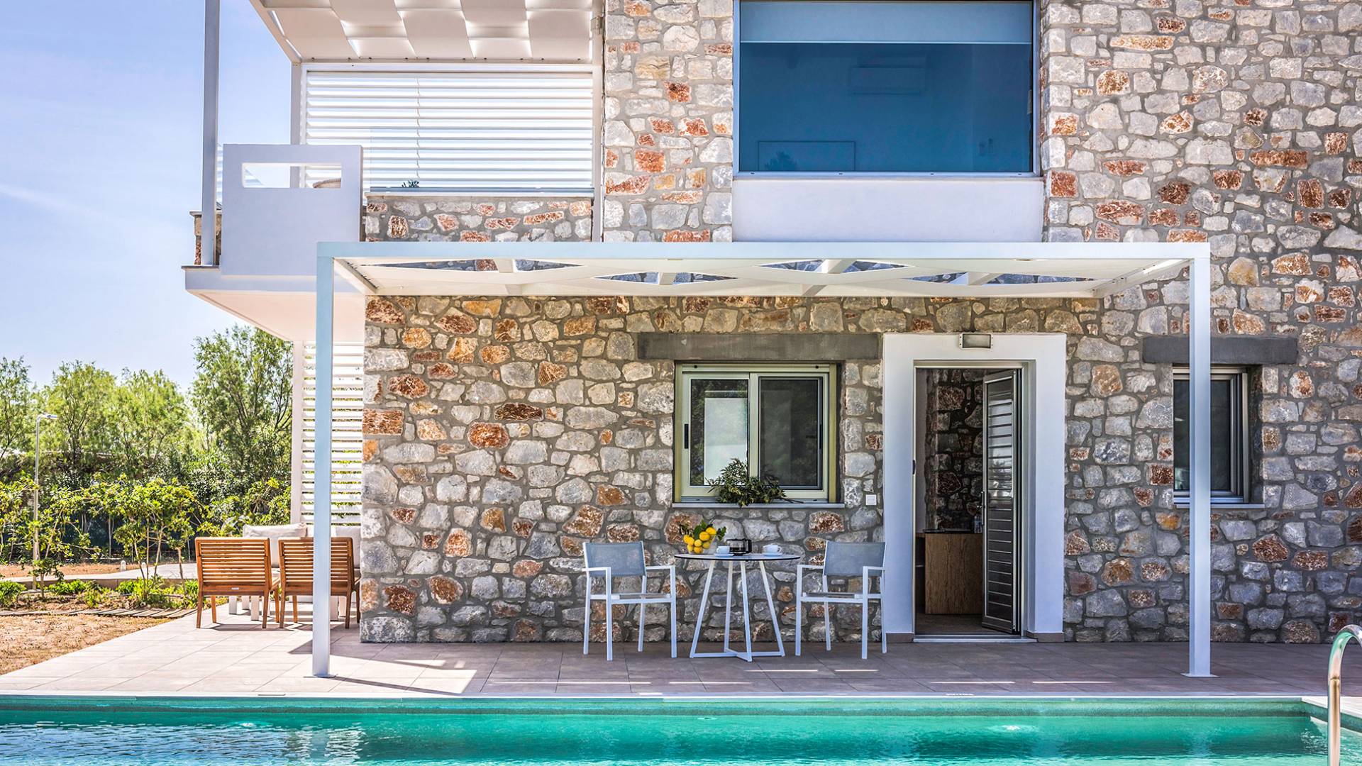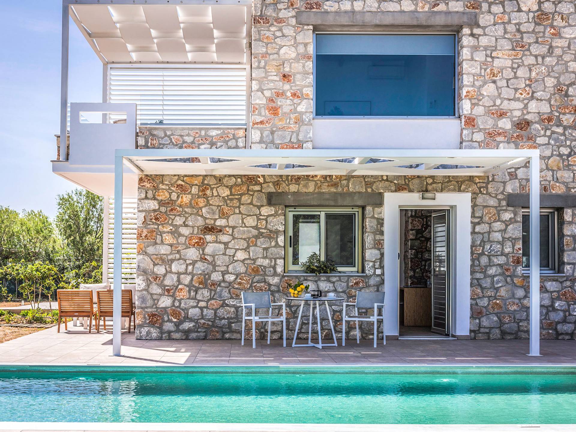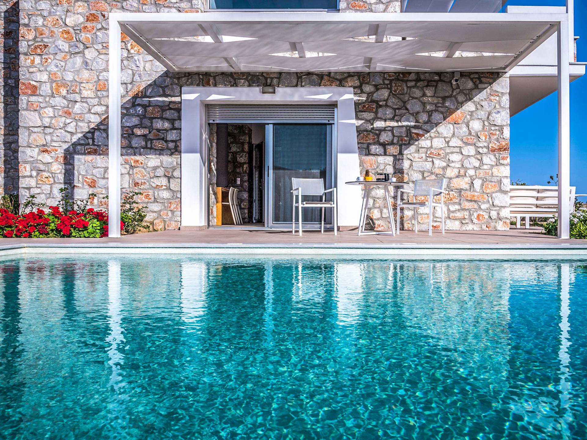 Moviéndose al aire libre, puede hacer un gran esfuerzo para elegir entre su piscina privada de 32 m2 y las dos playas, todo a poca distancia. Su sala de estar personal bajo la sombra de la pérgola o sus tumbonas de madera personales junto a la piscina o junto al mar, le ofrecerán una opción para relajarse. Además podrá disfrutar de deliciosos snacks y refrescos del chiringuito (solo en temporada de verano).