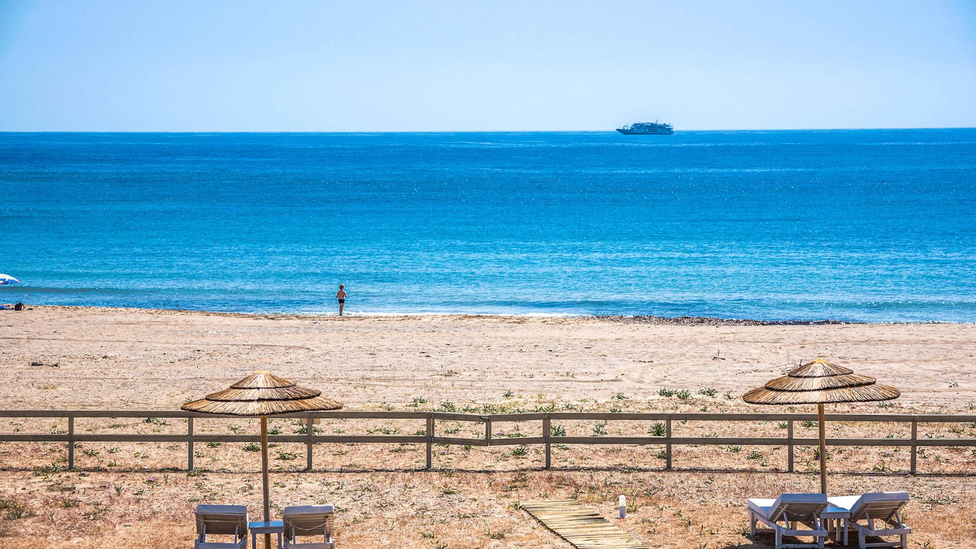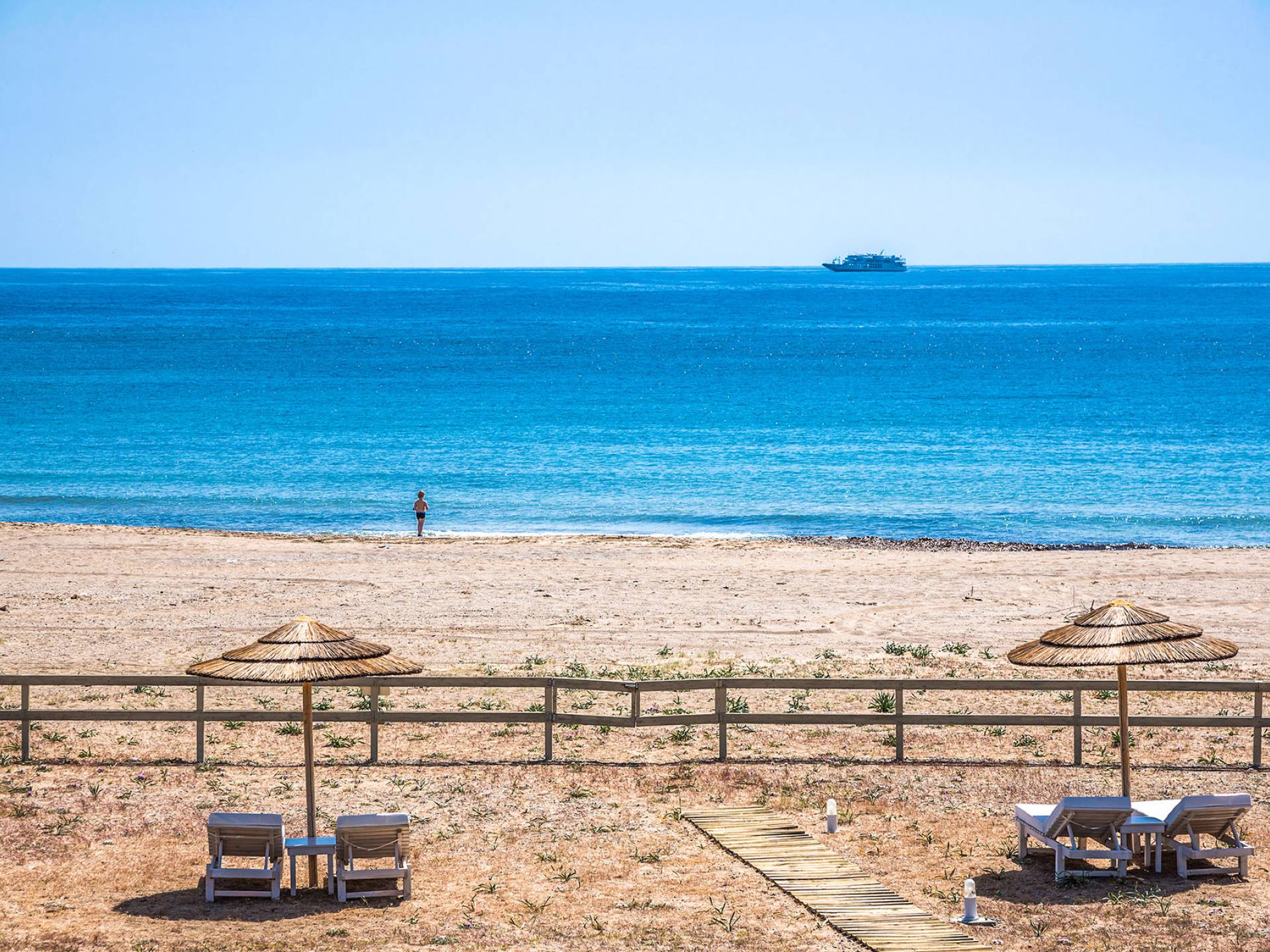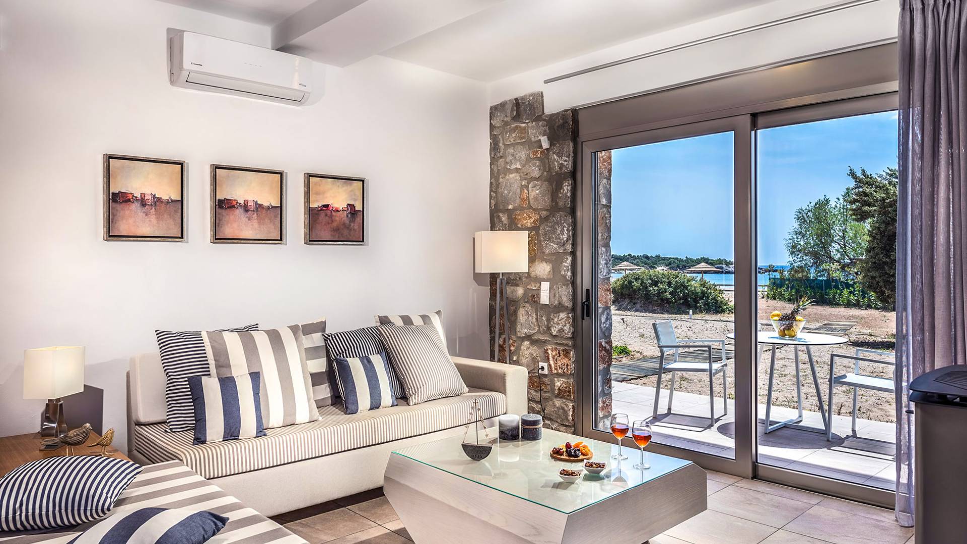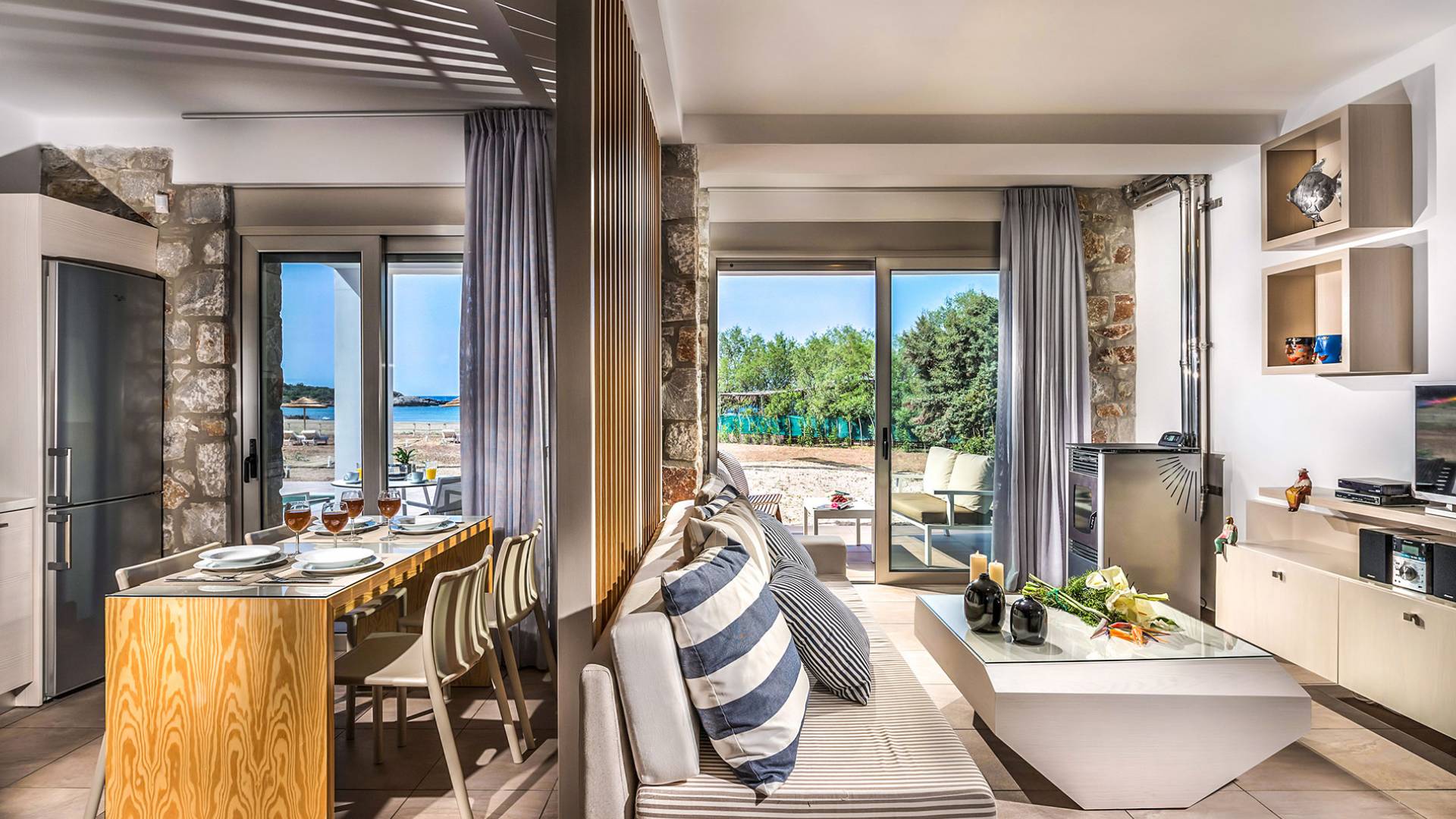 Moviéndose al aire libre, puede hacer un gran esfuerzo para elegir entre su piscina privada de 32 m2 y las dos playas, todo a poca distancia. Su sala de estar personal bajo la sombra de la pérgola o sus tumbonas de madera personales junto a la piscina o junto al mar, le ofrecerán una opción para relajarse. Además podrá disfrutar de deliciosos snacks y refrescos del chiringuito (solo en temporada de verano).