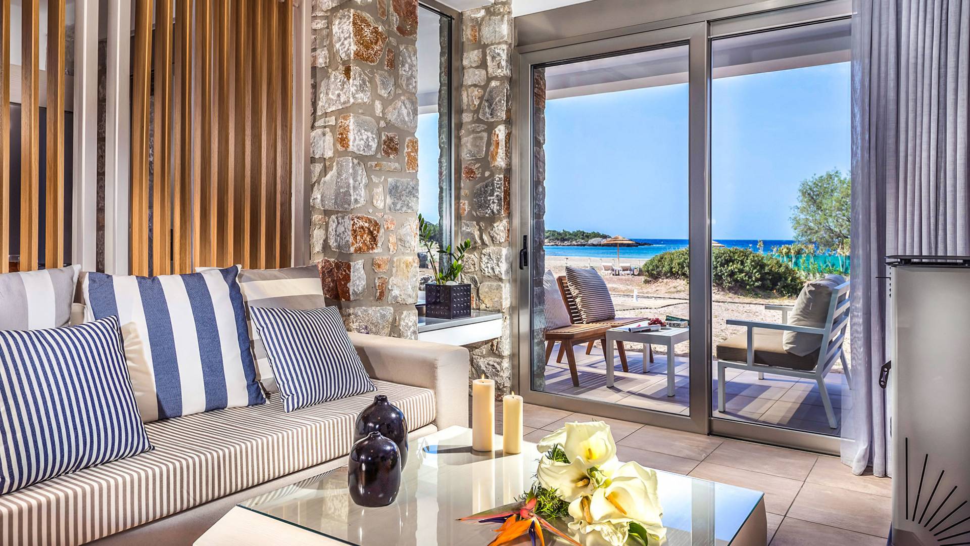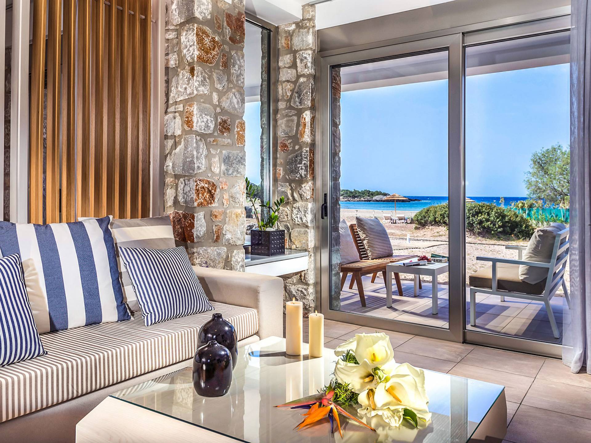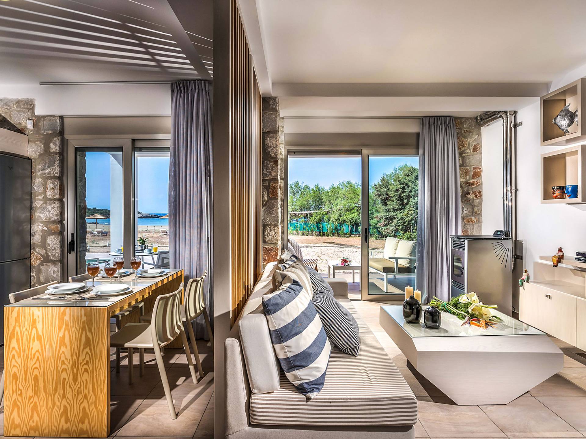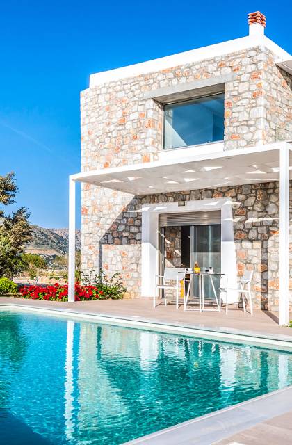 Cedar Bay Villas Crete consta de tres villas frente al mar con un diseño excepcional, cada una con una gran piscina privada y construidas tan cerca del mar como uno podría desear. Los huéspedes pueden acceder instantáneamente a dos playas, de diferente textura pero igualmente hermosas, con solo abrir la puerta principal. Delante de las villas, se tiene vista a la playa de Grammeno, una playa de bandera azul y arena fina y dorada, y al otro lado de la península, la playa de Votsalo, una playa de guijarros, larga y tranquila.
