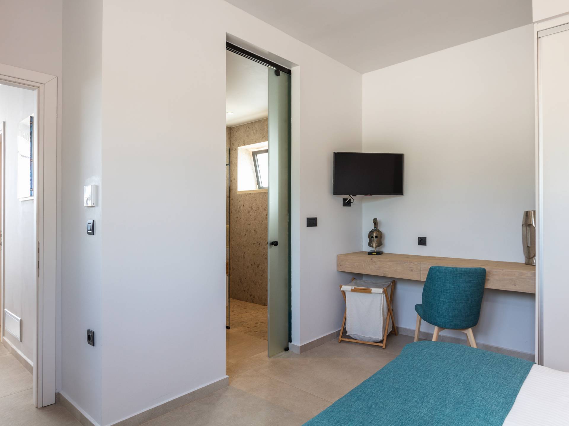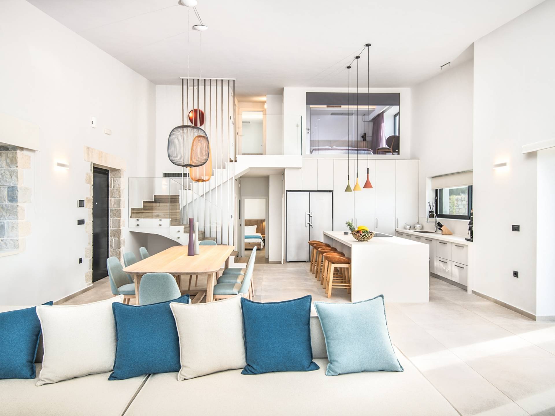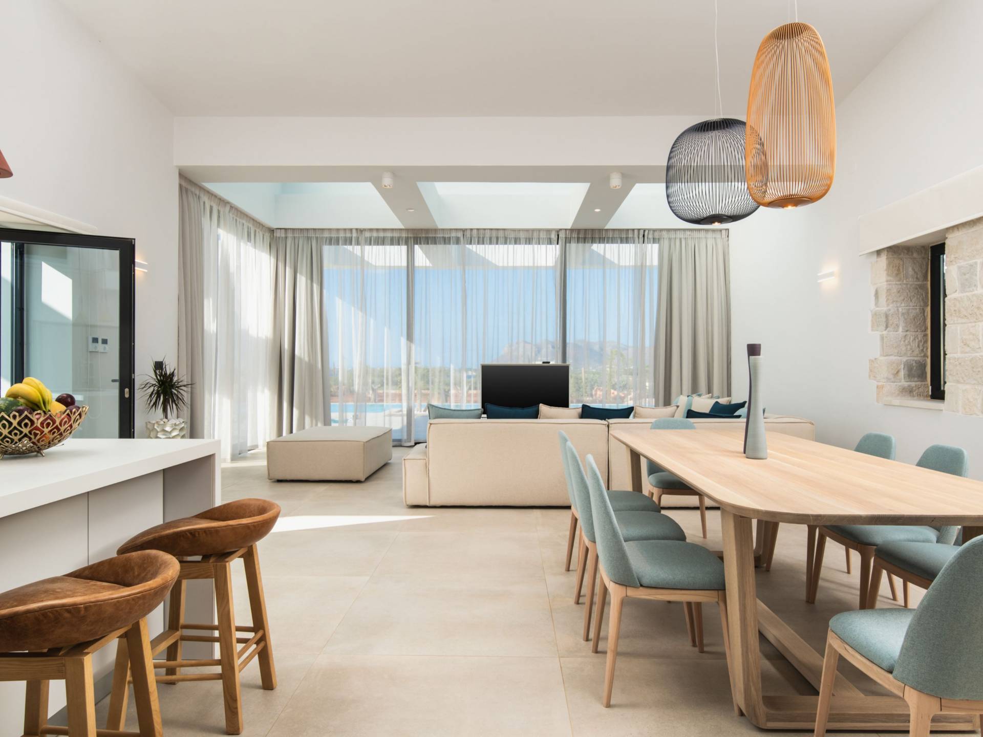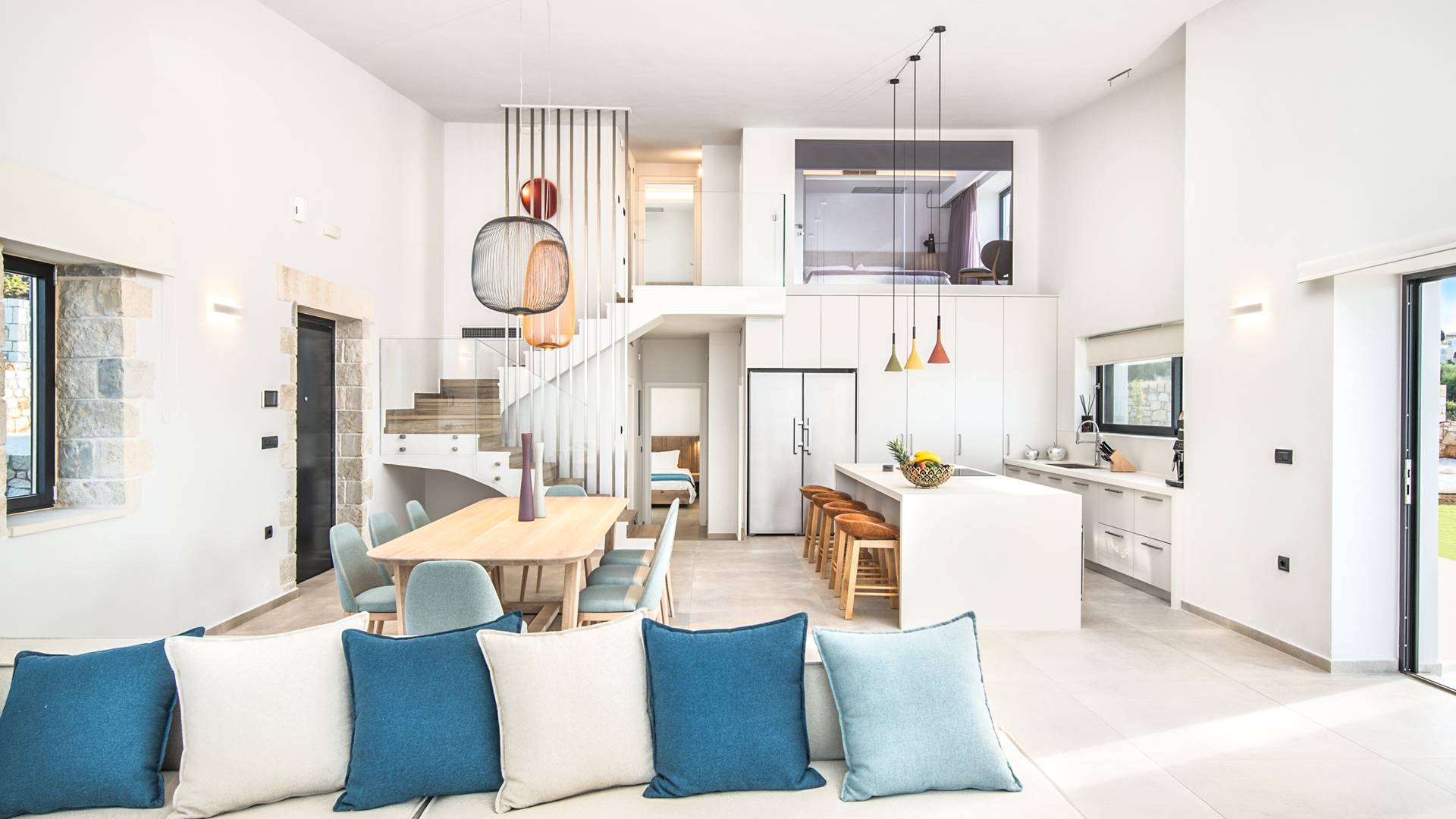 El cómodo sofá de la esquina, colocado en la parte delantera de la sala de estar, frente a la pared de la ventana realmente enorme, ofrece vistas increíblemente hermosas de los jardines, la piscina, el mar y una puesta de sol realmente hermosa. El sistema de audio de última tecnología, TV LED de pantalla plana vía satélite, reproductor de DVD, computadora portátil e impresora completan el equipamiento de la sala en términos de instalaciones y comodidades. Uno de los dos dormitorios principales, ubicado en la planta baja, tiene una cómoda cama de matrimonio de 1,60 x 2,00, mientras que en el segundo la cama con unas dimensiones iniciales de 1,80 x 2,00 se puede convertir en dos camas individuales de 0,90 x 2,00. Todos los productos para dormir provienen de la galardonada empresa COCO-MAT, ofreciendo así un sueño saludable y de calidad a quienes confiarán en nosotros para sus vacaciones.