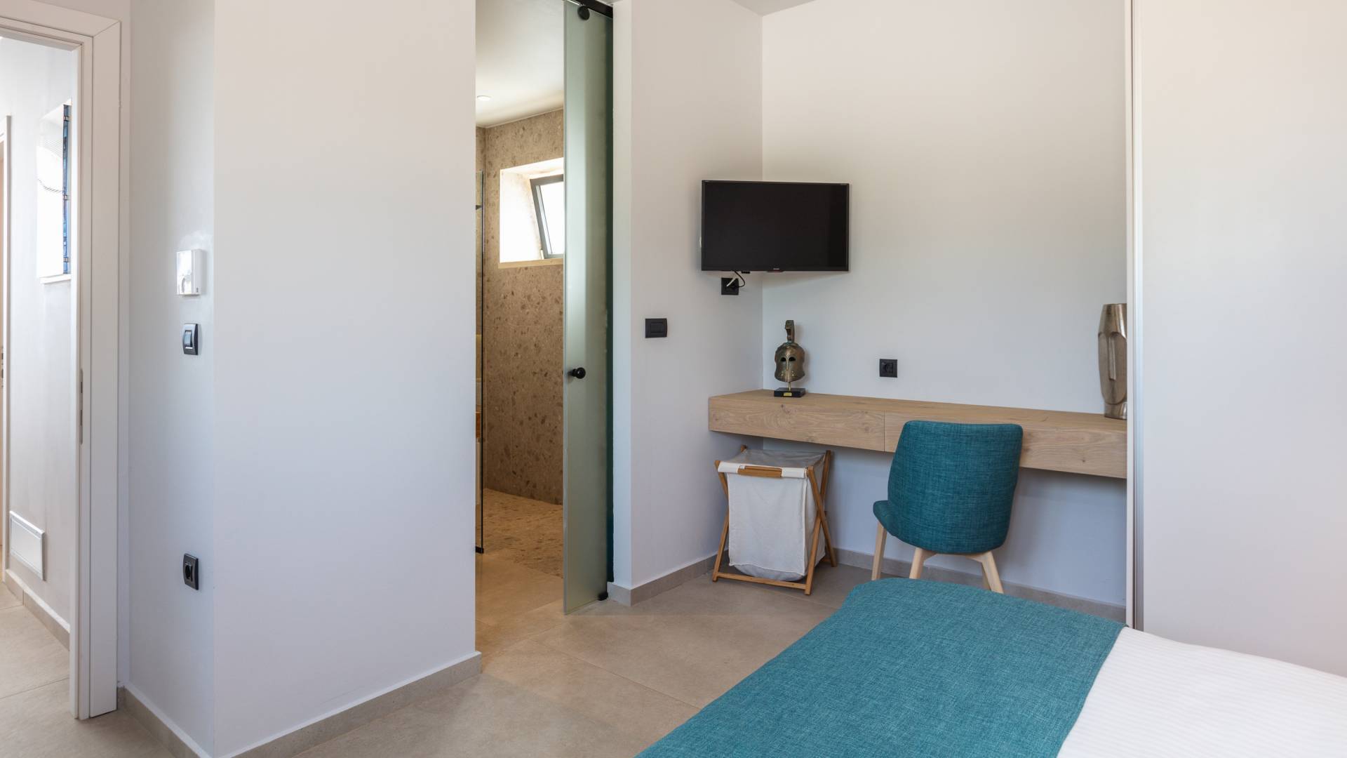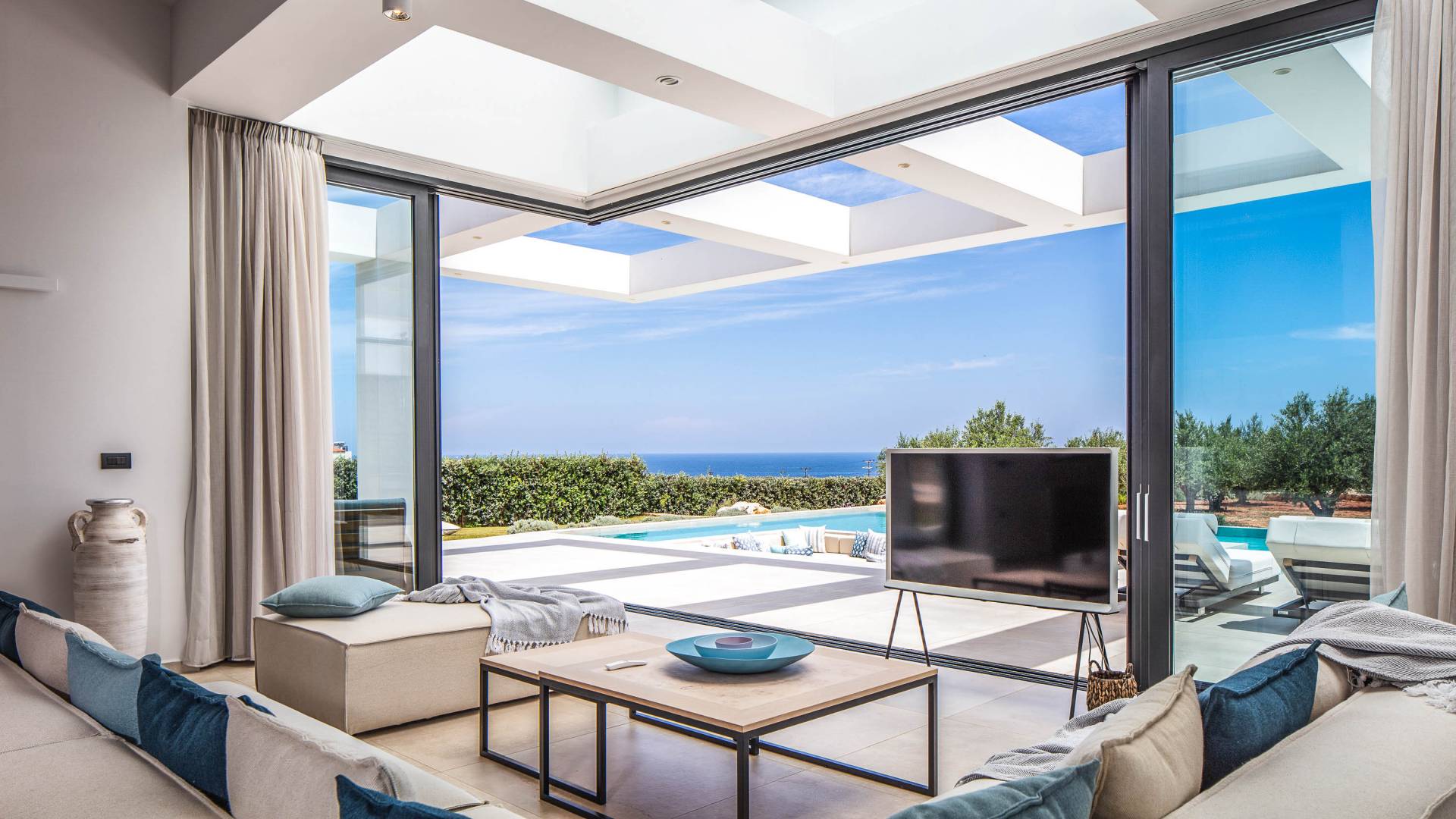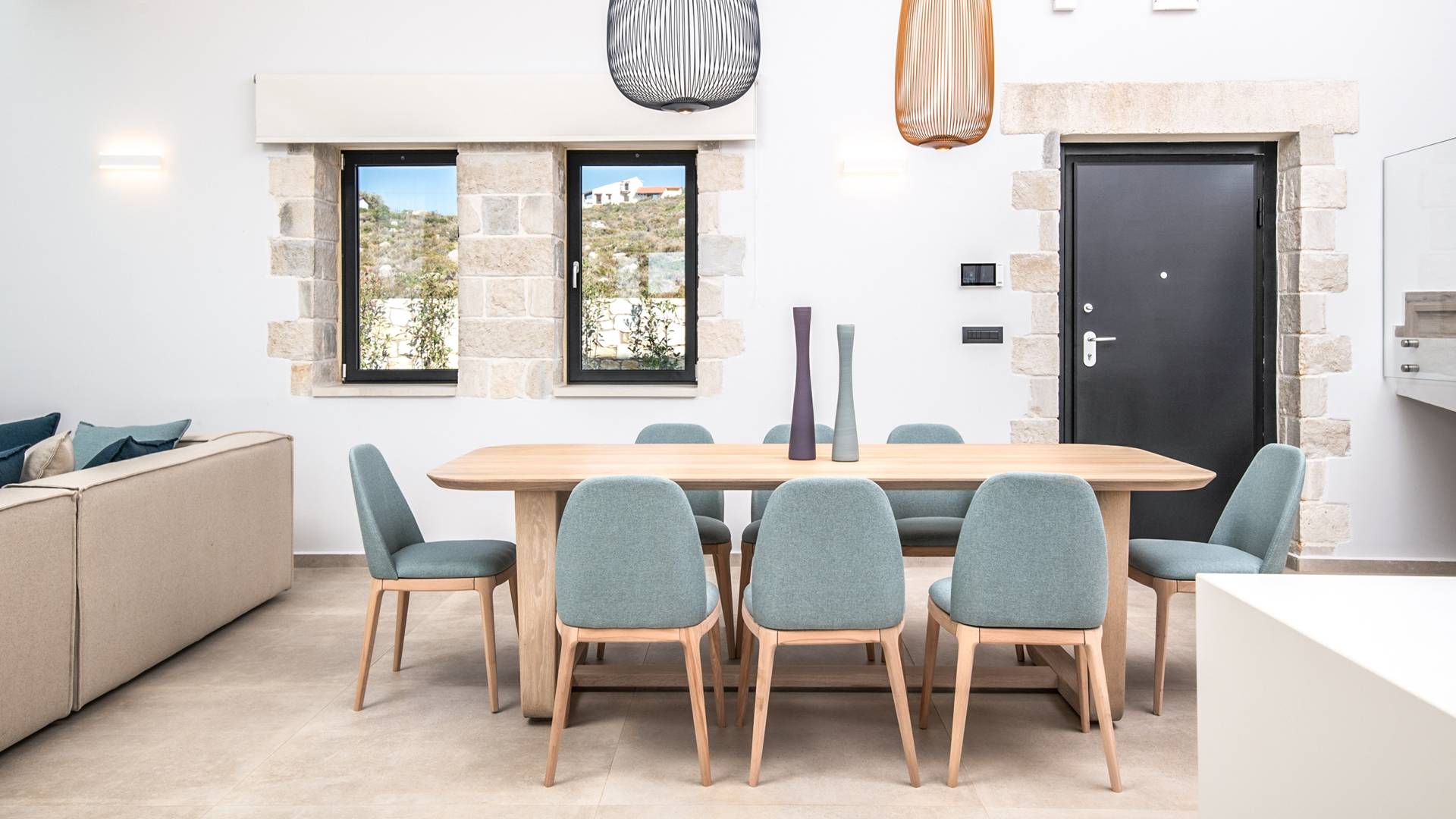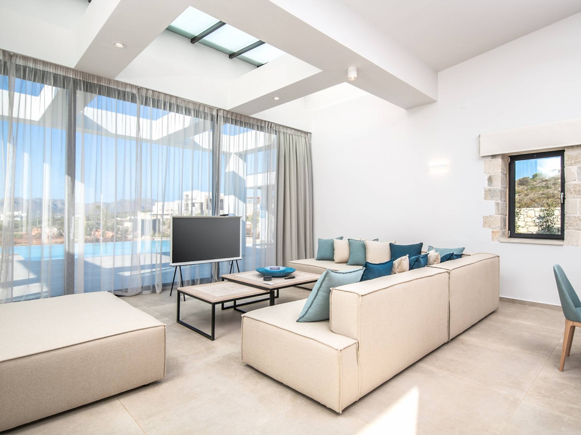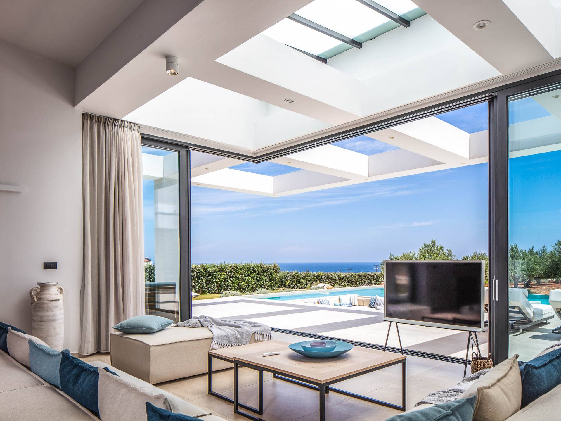 El cómodo sofá de la esquina, colocado en la parte delantera de la sala de estar, frente a la pared de la ventana realmente enorme, ofrece vistas increíblemente hermosas de los jardines, la piscina, el mar y una puesta de sol realmente hermosa. El sistema de audio de última tecnología, TV LED de pantalla plana vía satélite, reproductor de DVD, computadora portátil e impresora completan el equipamiento de la sala en términos de instalaciones y comodidades. Uno de los dos dormitorios principales, ubicado en la planta baja, tiene una cómoda cama de matrimonio de 1,60 x 2,00, mientras que en el segundo la cama con unas dimensiones iniciales de 1,80 x 2,00 se puede convertir en dos camas individuales de 0,90 x 2,00. Todos los productos para dormir provienen de la galardonada empresa COCO-MAT, ofreciendo así un sueño saludable y de calidad a quienes confiarán en nosotros para sus vacaciones.