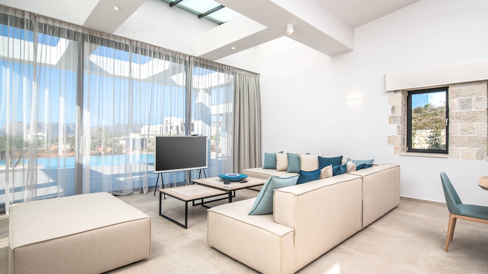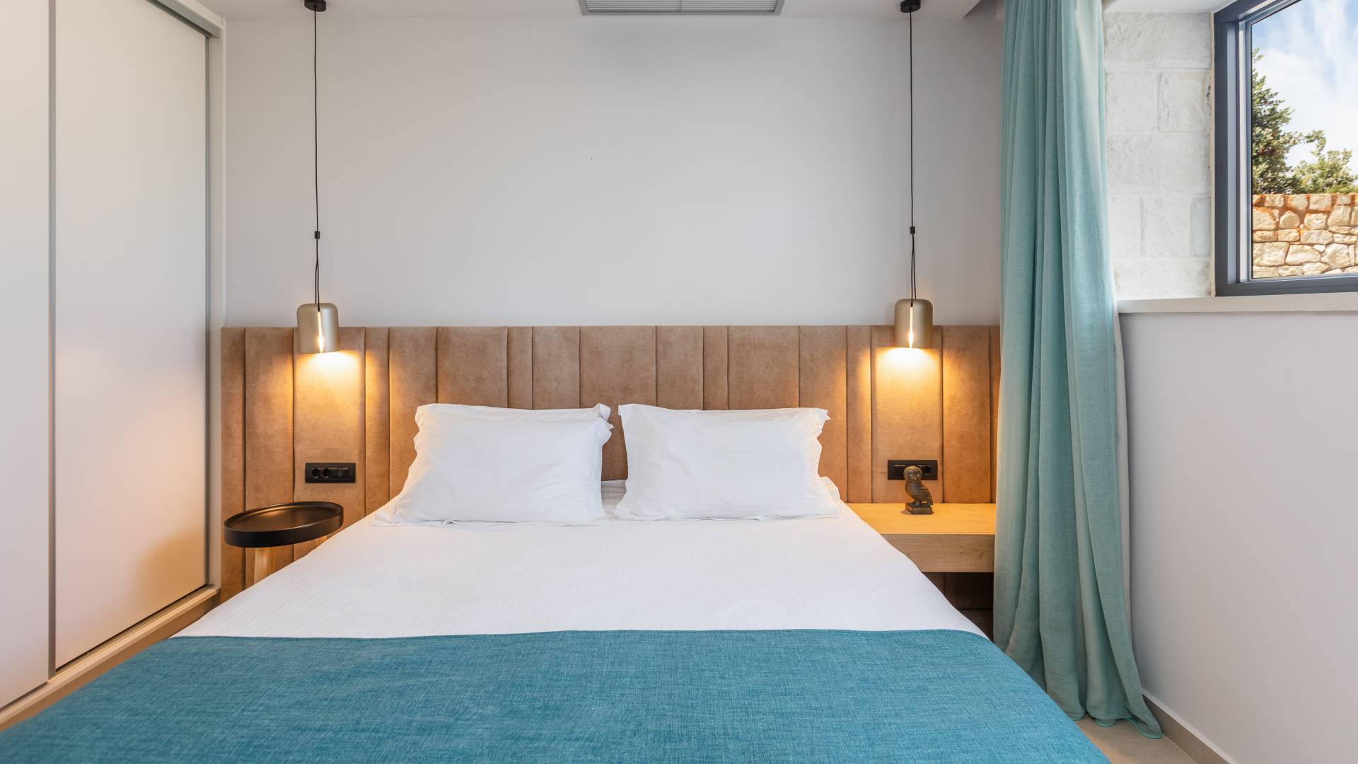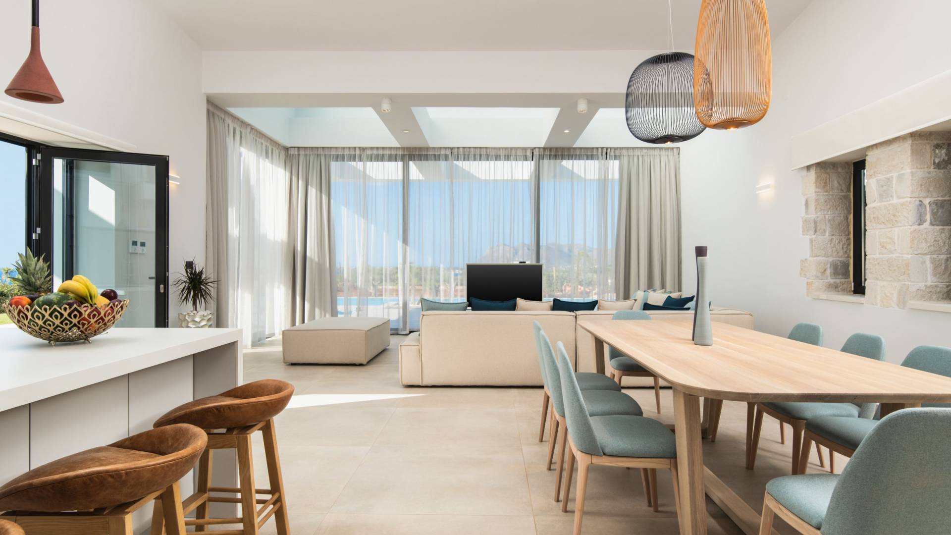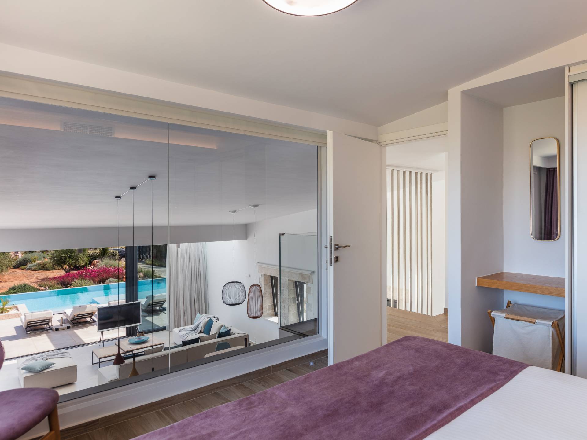 El cómodo sofá de la esquina, colocado en la parte delantera de la sala de estar, frente a la pared de la ventana realmente enorme, ofrece vistas increíblemente hermosas de los jardines, la piscina, el mar y una puesta de sol realmente hermosa. El sistema de audio de última tecnología, TV LED de pantalla plana vía satélite, reproductor de DVD, computadora portátil e impresora completan el equipamiento de la sala en términos de instalaciones y comodidades. Uno de los dos dormitorios principales, ubicado en la planta baja, tiene una cómoda cama de matrimonio de 1,60 x 2,00, mientras que en el segundo la cama con unas dimensiones iniciales de 1,80 x 2,00 se puede convertir en dos camas individuales de 0,90 x 2,00. Todos los productos para dormir provienen de la galardonada empresa COCO-MAT, ofreciendo así un sueño saludable y de calidad a quienes confiarán en nosotros para sus vacaciones.